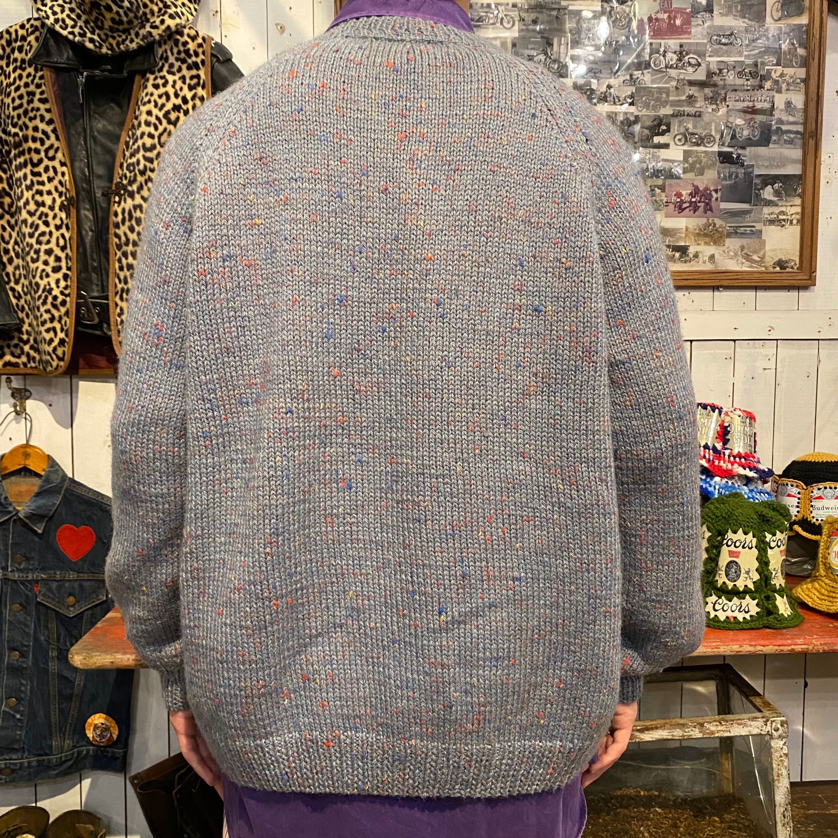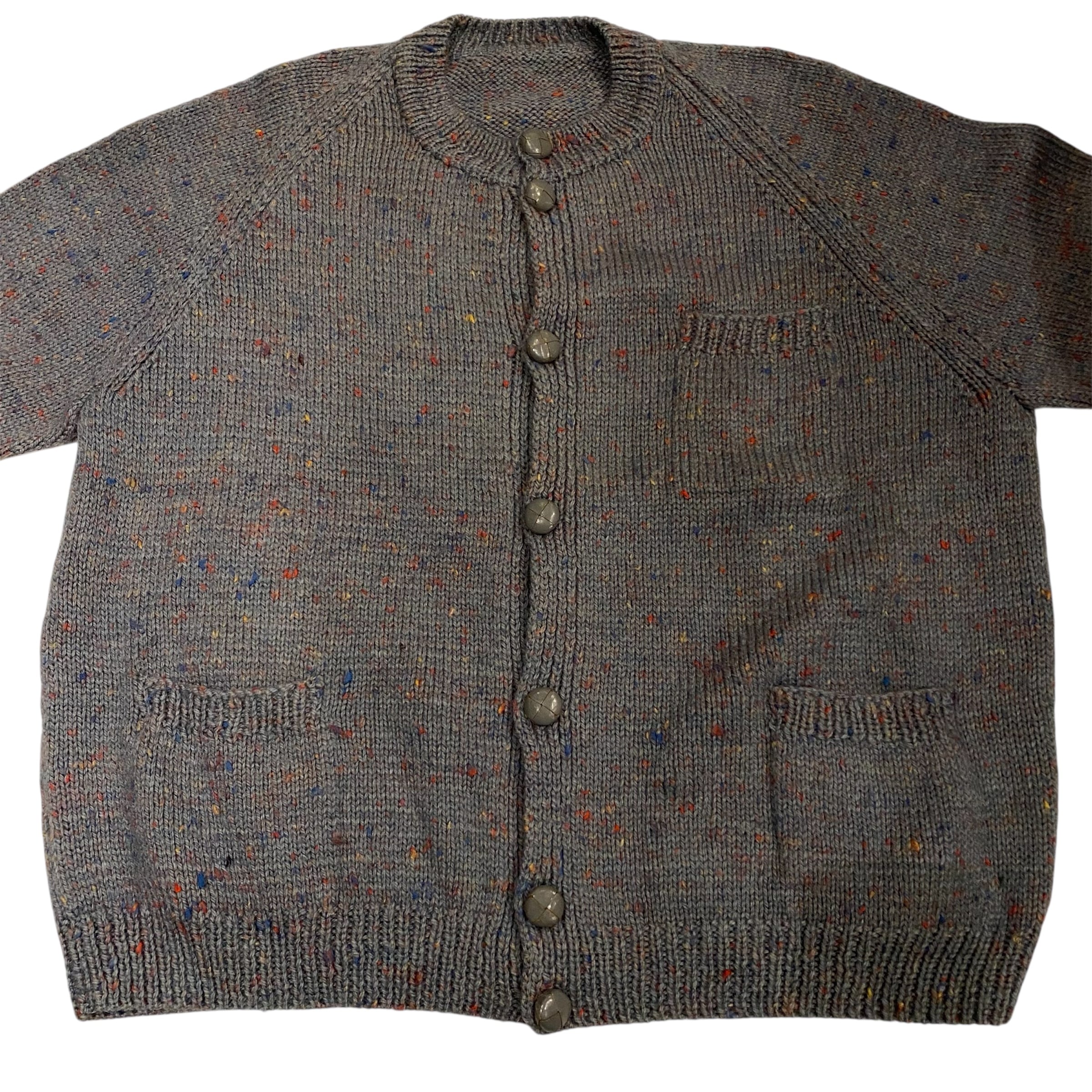 ブルーグレーにカラフルなネップがミックスされたやわらかいニットカーディガンになります。ラグランスリーブでクルーネック仕様です。3つポケットでフロントはグレーのくるみボタンが使われていたり、シルエットもアウターっぽく着れるのでこれからの時期羽織りとしても重宝してくれそうです。インナーに襟付きのシャツを合わせる着こなしもおすすめしています。