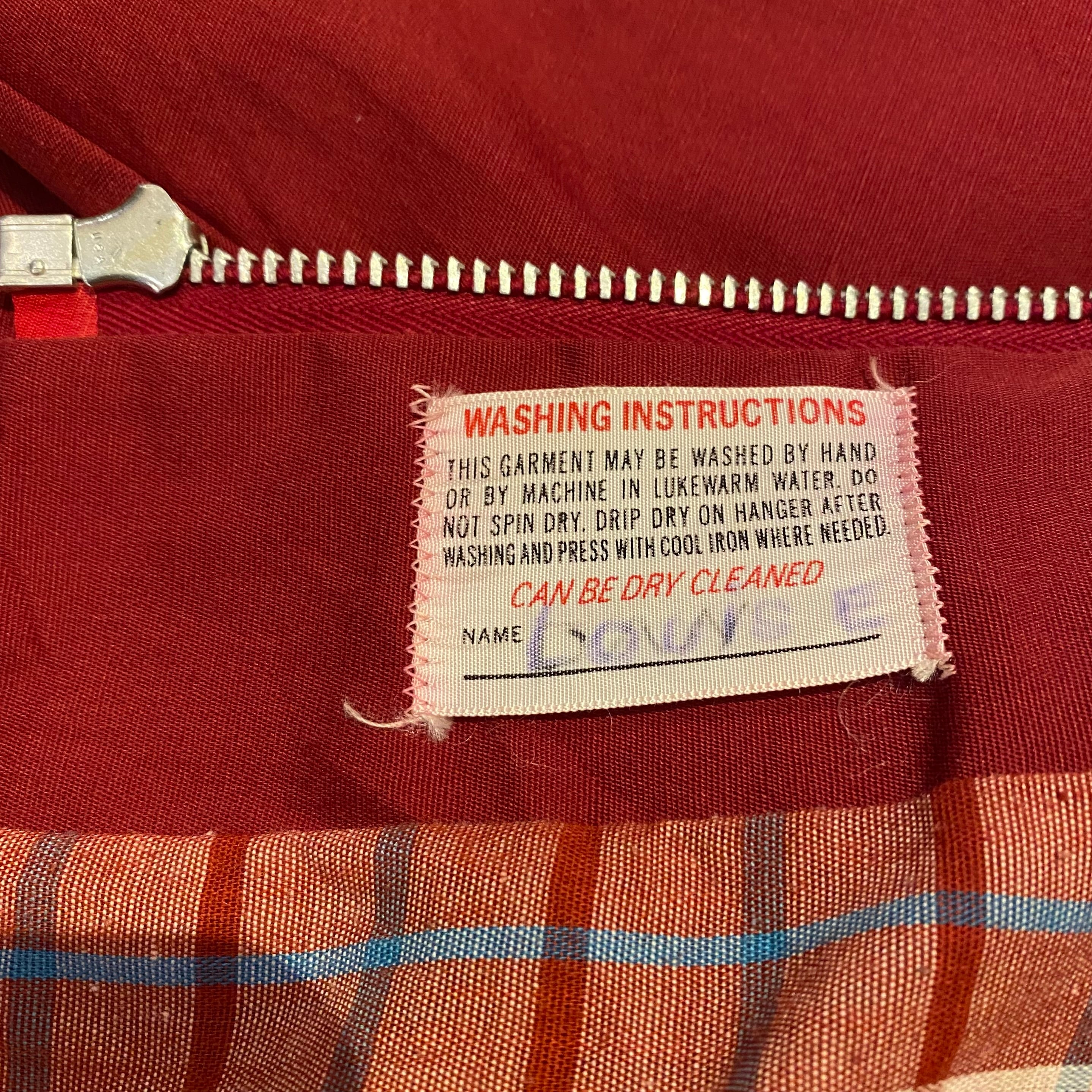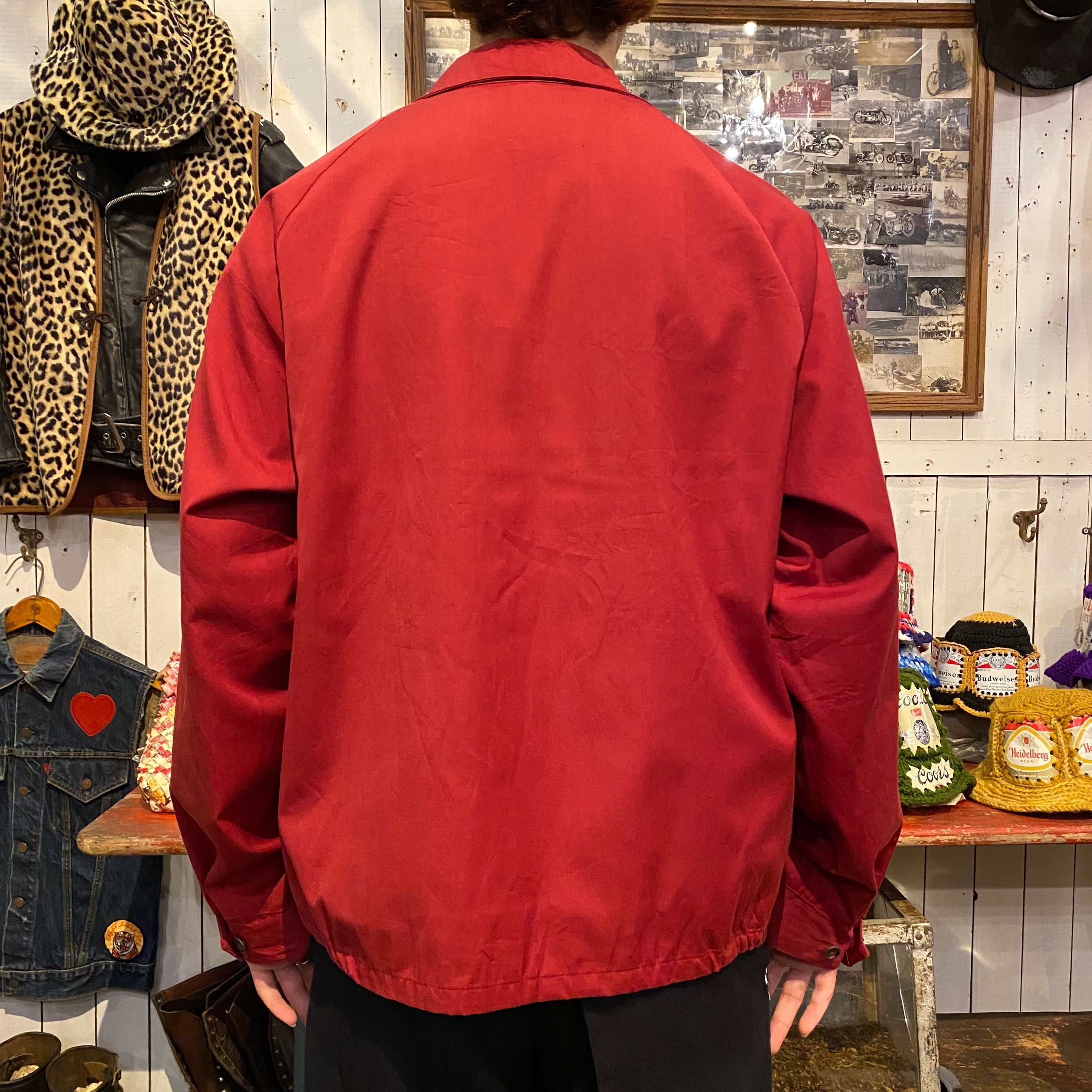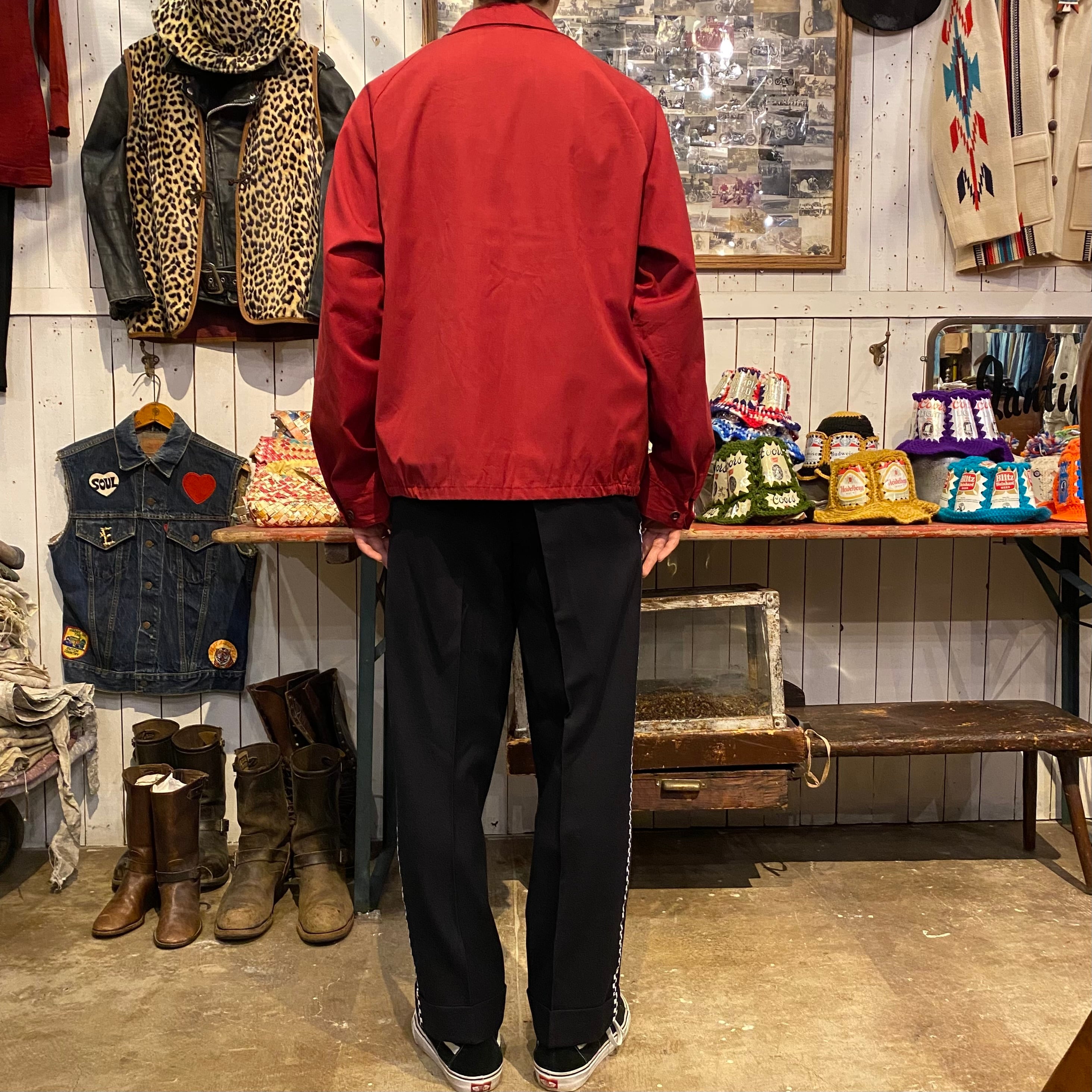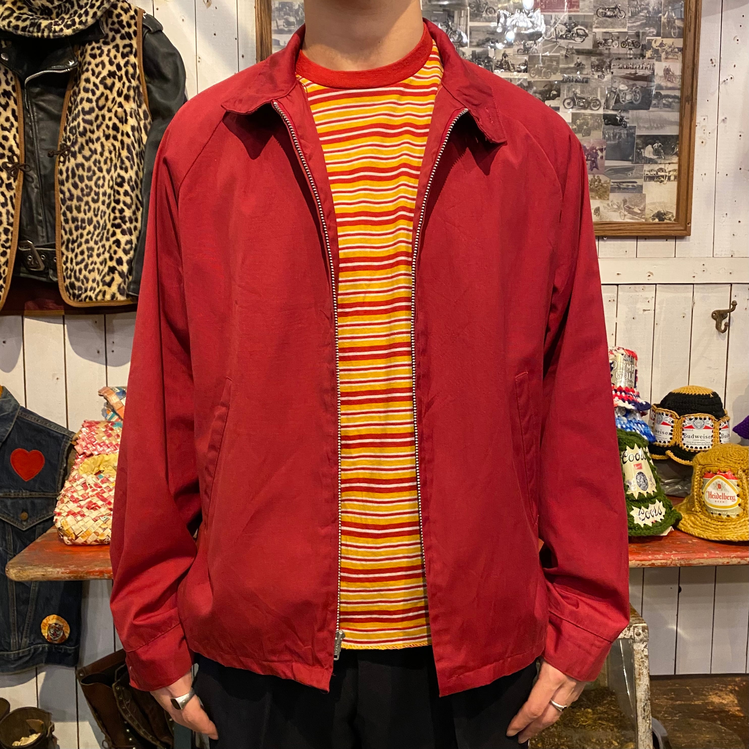 1970年代のスタンドカラーのスウィングトップになります。TALONのアルミジッパー仕様です。バーガンディの色味も派手すぎず落ち着いたカラーで良いと思います。裏地にはチェック柄が使われています。ラグランスリーブ仕様で身幅はしっかりあってショート丈のバランスは合わせやすいですしやっぱり使えると思います。インナーにマルチボーダーTシャツ、下はチェッカーフラッグのラインスラックスにバンズ、を合わせ横ノリを意識したカジュアルスタイルに落とし込みました。