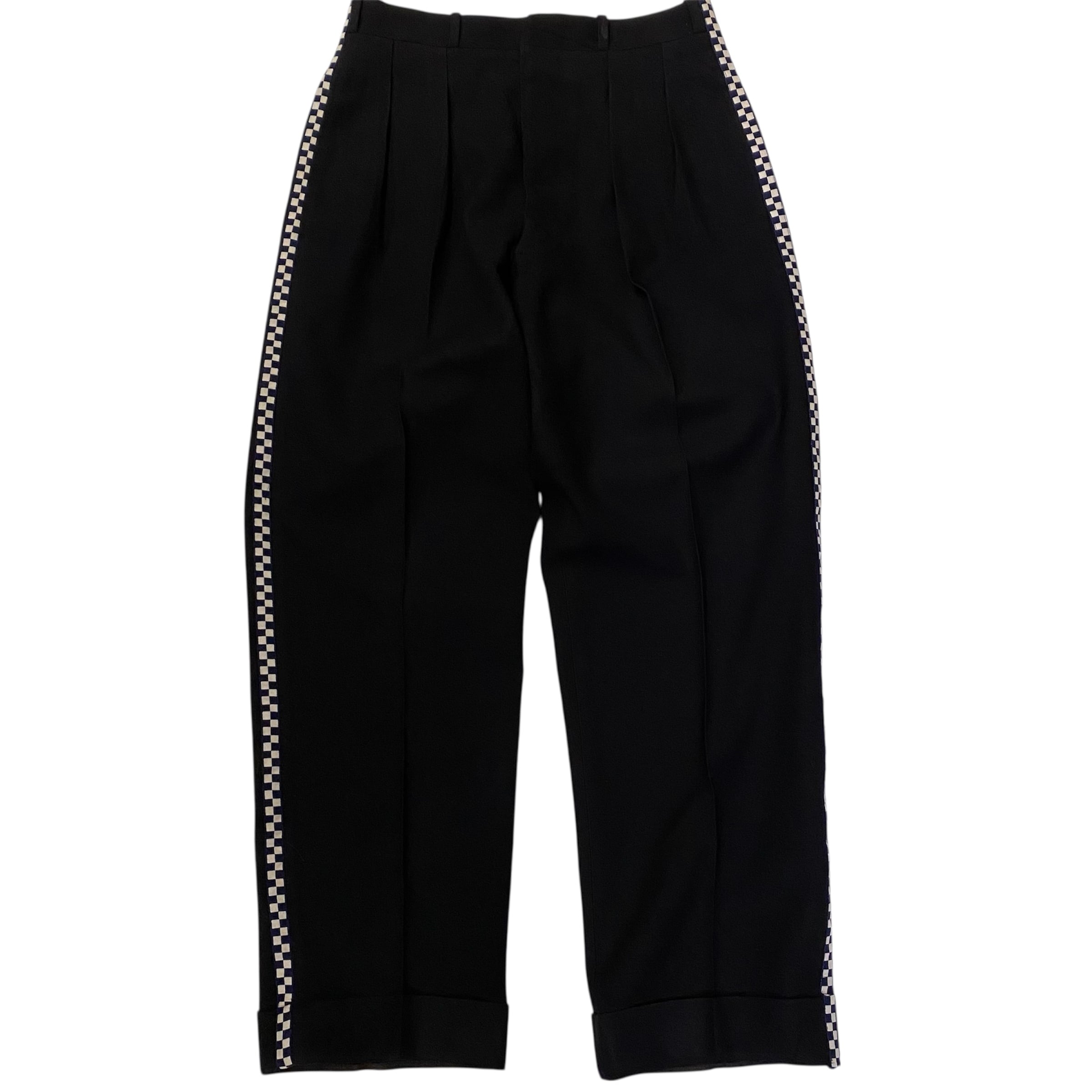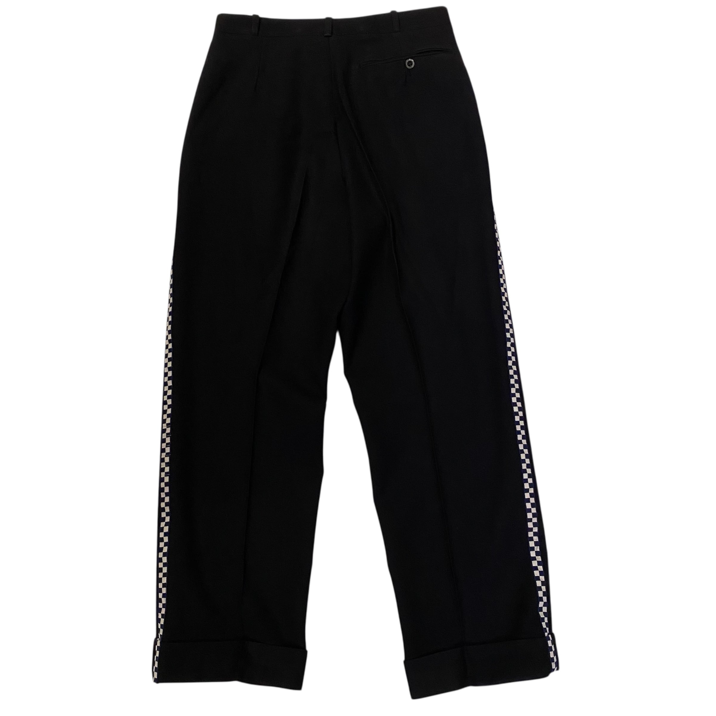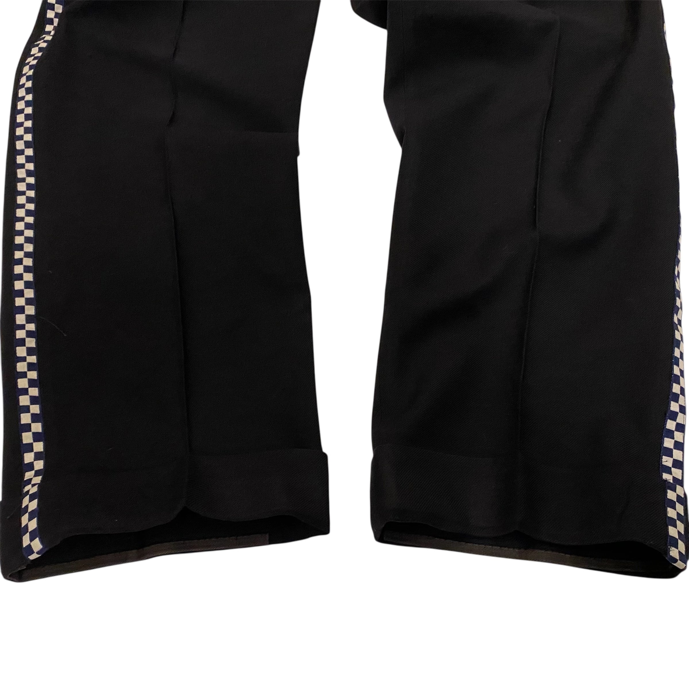 チェッカーフラッグ柄のテープをサイドに縫い付け当店でリメイクしました、スラックスパンツになります。ベースはドイツのビンテージスラックスになります。カラーはブラック、きめ細かくなめらかなウール生地です。ウエスト2タックでゆったりめのストレート〜少しテーパードしたシルエットで裾はダブル仕様になります。ウエスト実寸29インチのショートレングスなので女性が穿いてもかわいいと思います。