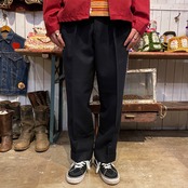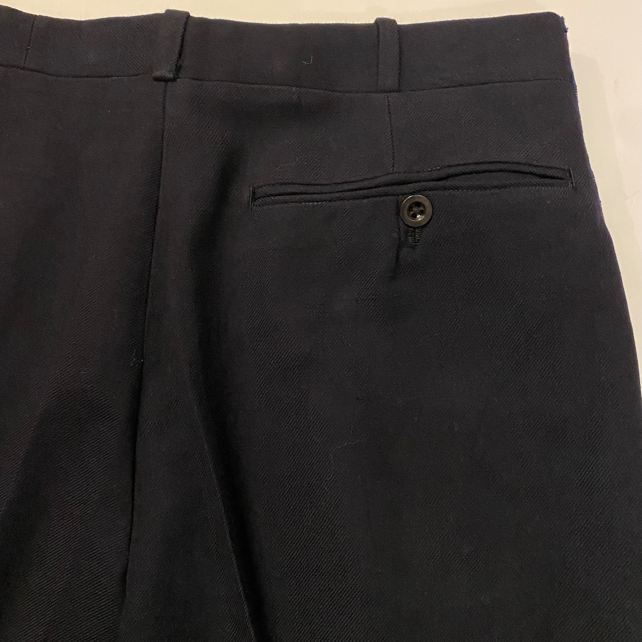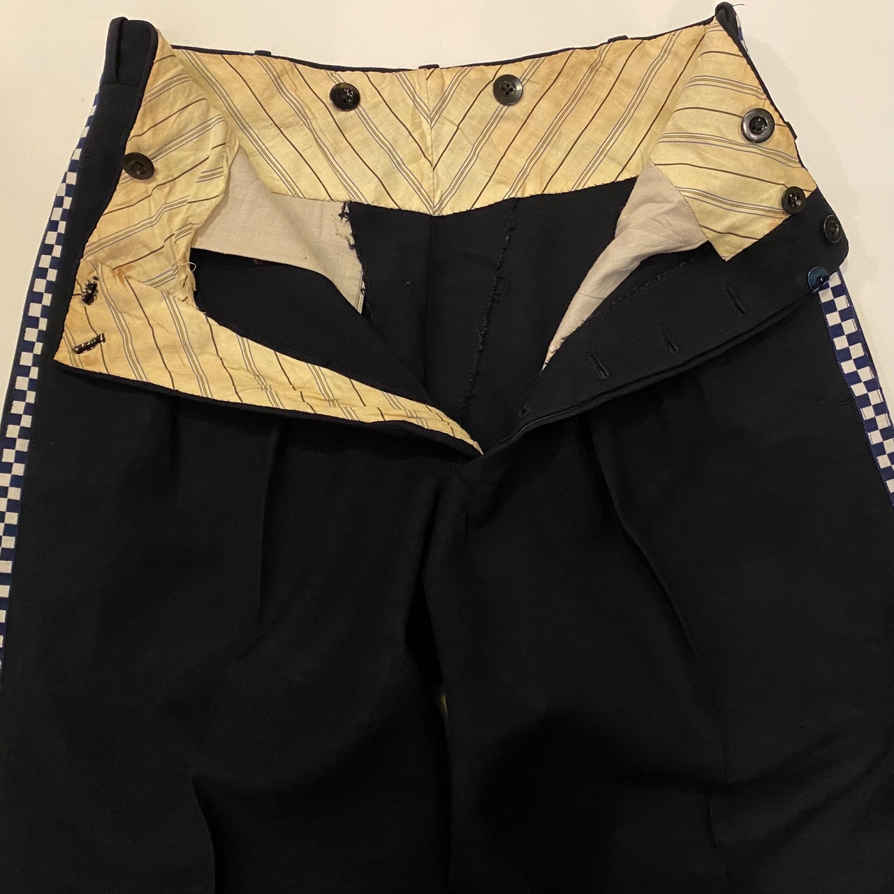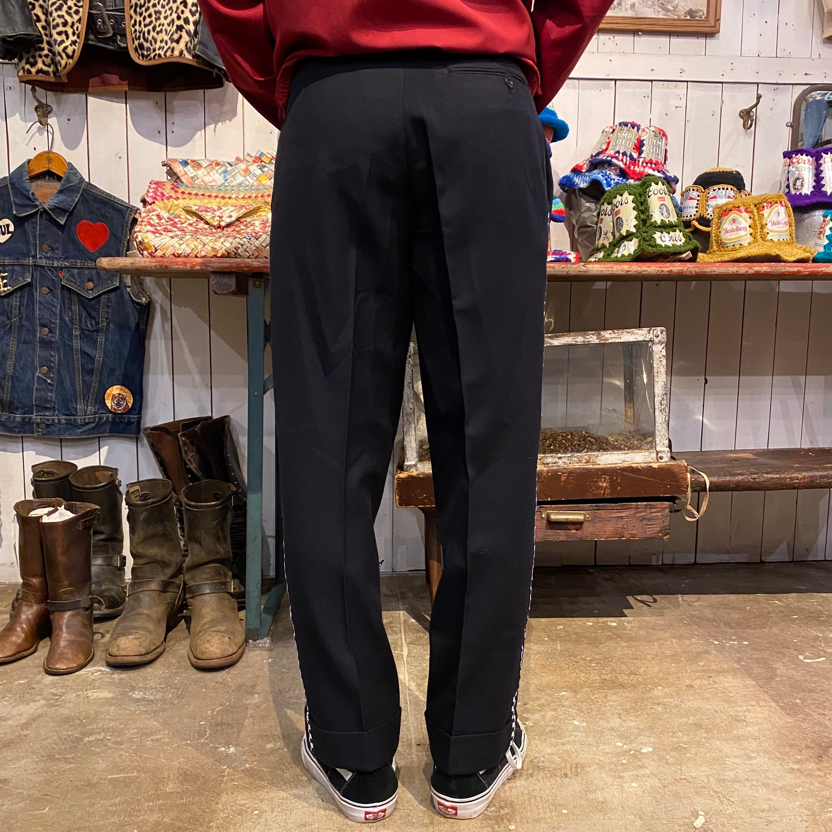 チェッカーフラッグ柄のテープをサイドに縫い付け当店でリメイクしました、スラックスパンツになります。ベースはドイツのビンテージスラックスになります。カラーはブラック、きめ細かくなめらかなウール生地です。ウエスト2タックでゆったりめのストレート〜少しテーパードしたシルエットで裾はダブル仕様になります。ウエスト実寸29インチのショートレングスなので女性が穿いてもかわいいと思います。