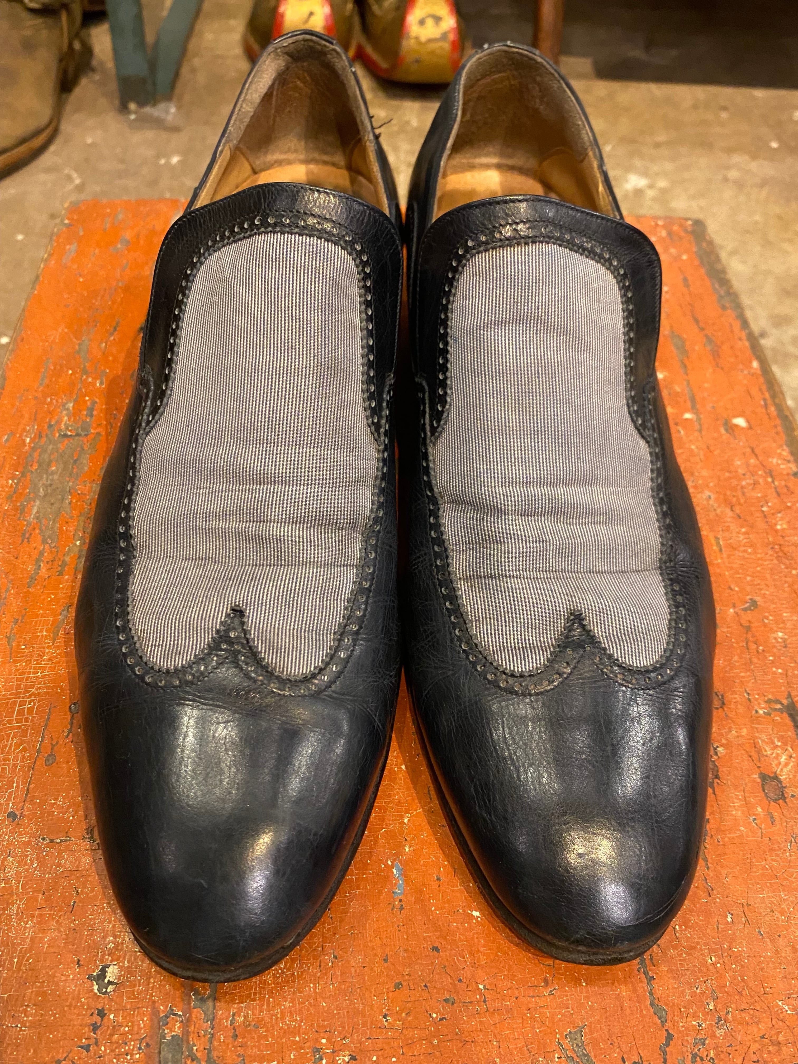 ベースの色はネイビーで、足の甲の箇所は細いストライプの生地になってます。生地の箇所も革の上に貼ってあるようなので、ストライプの裏はレザーになっていますので、履き心地は問題ありません。