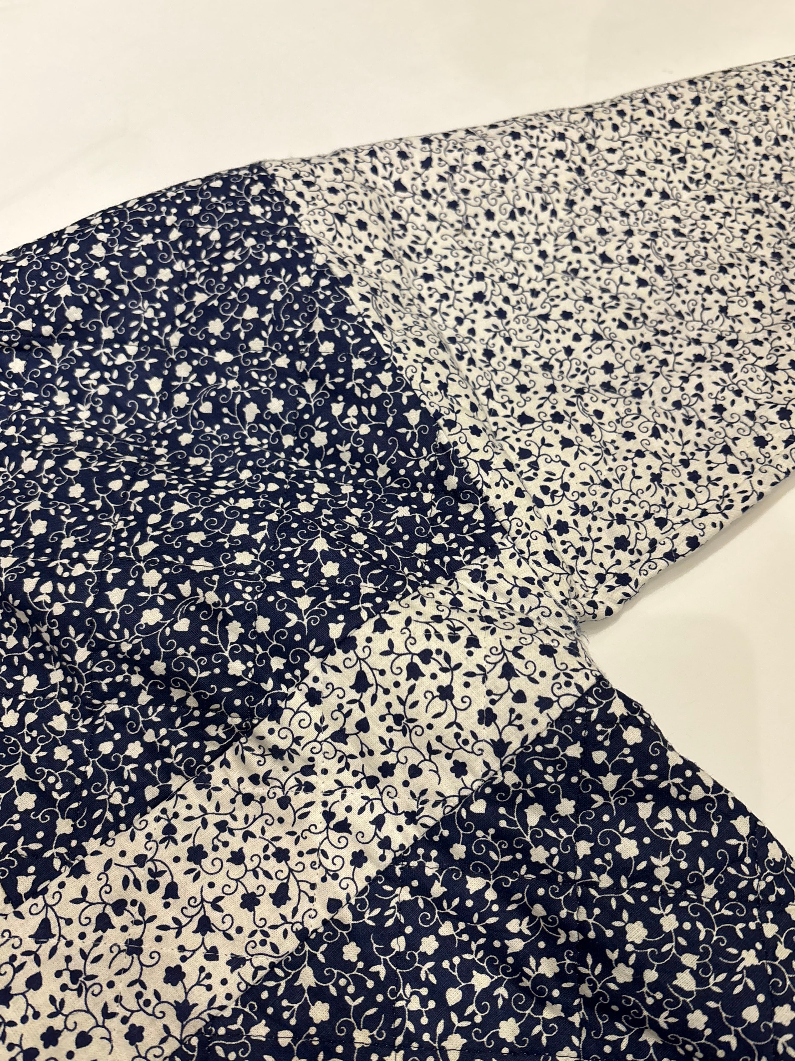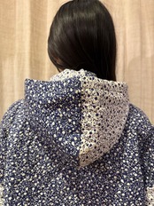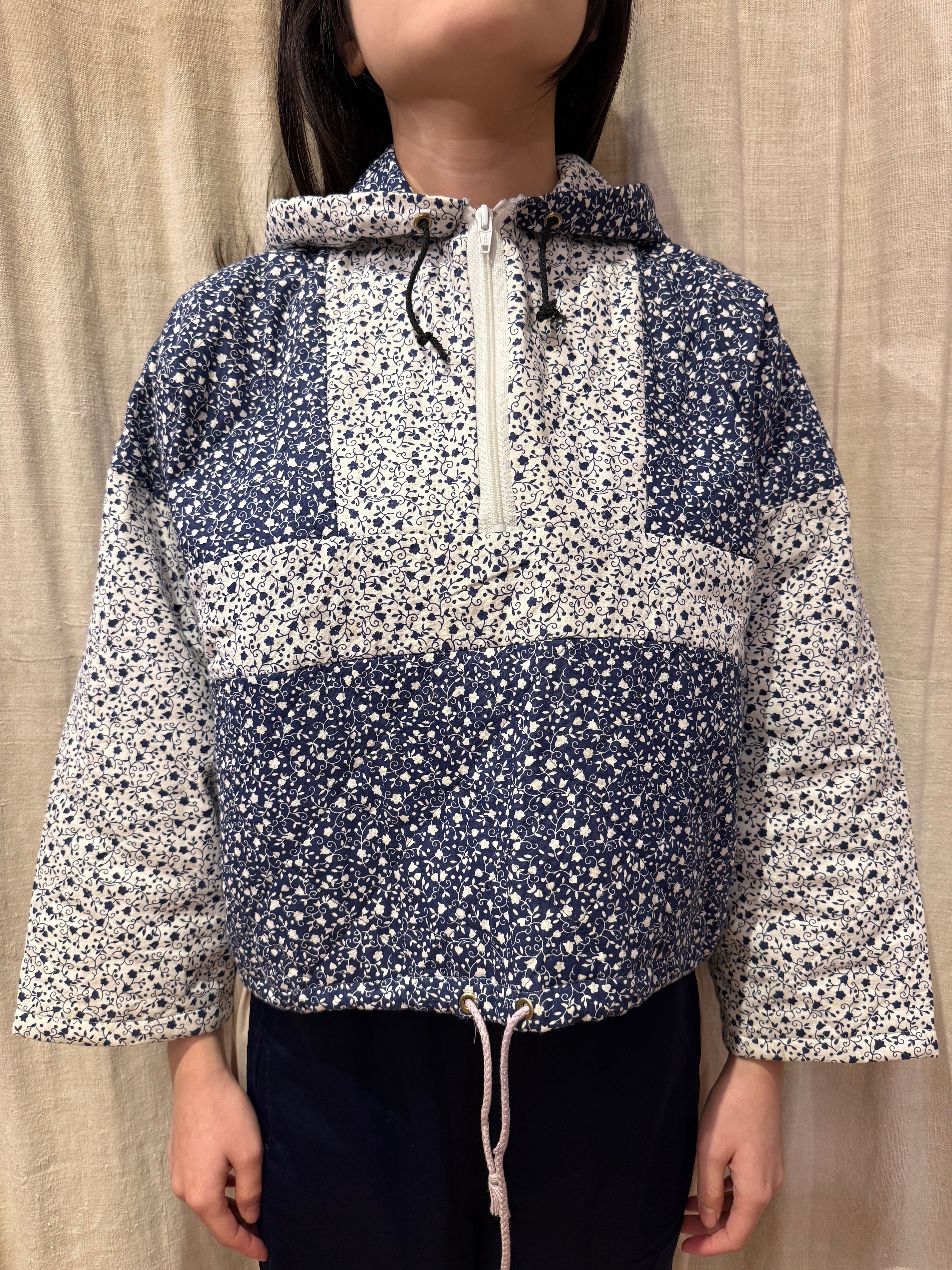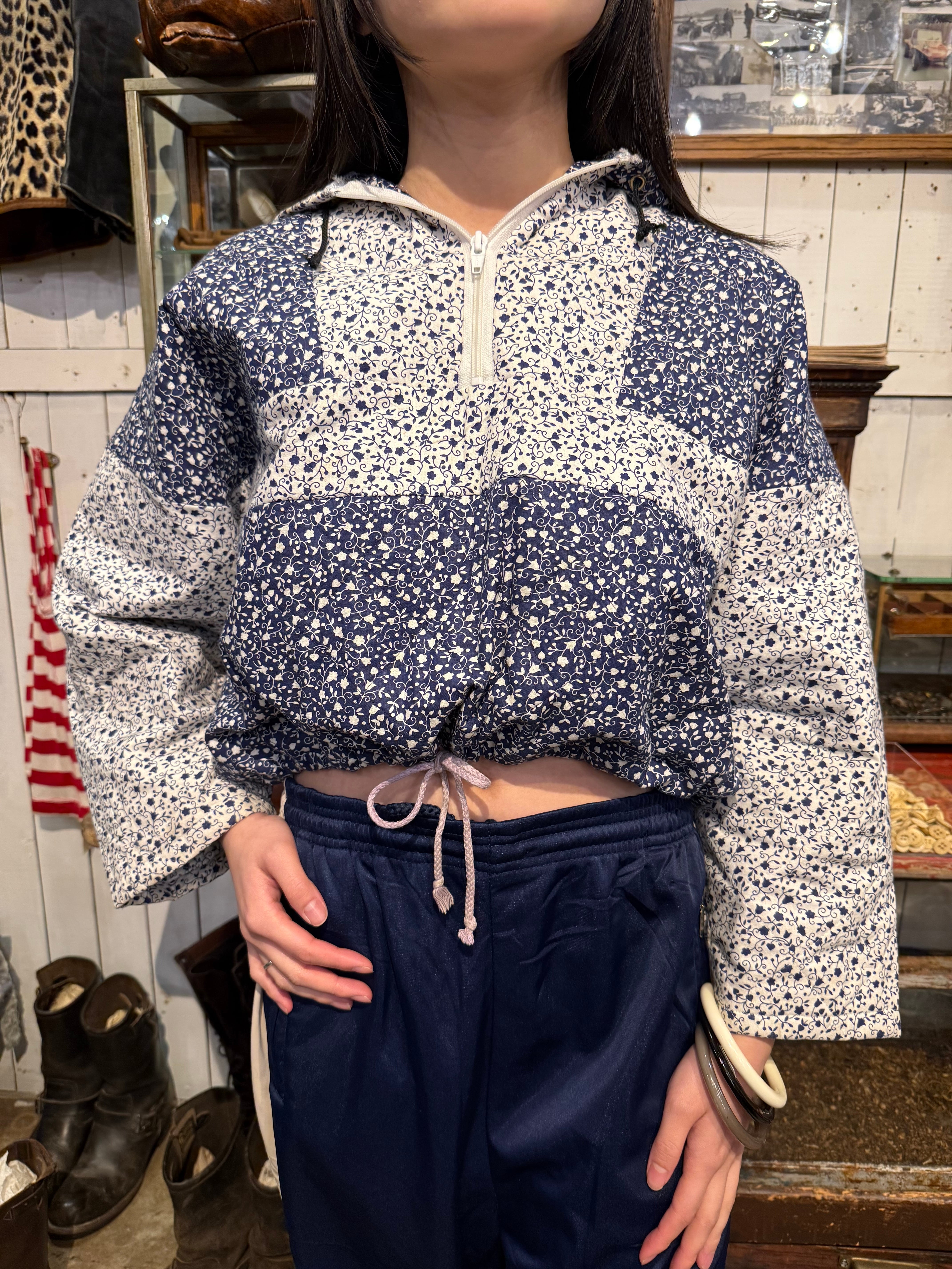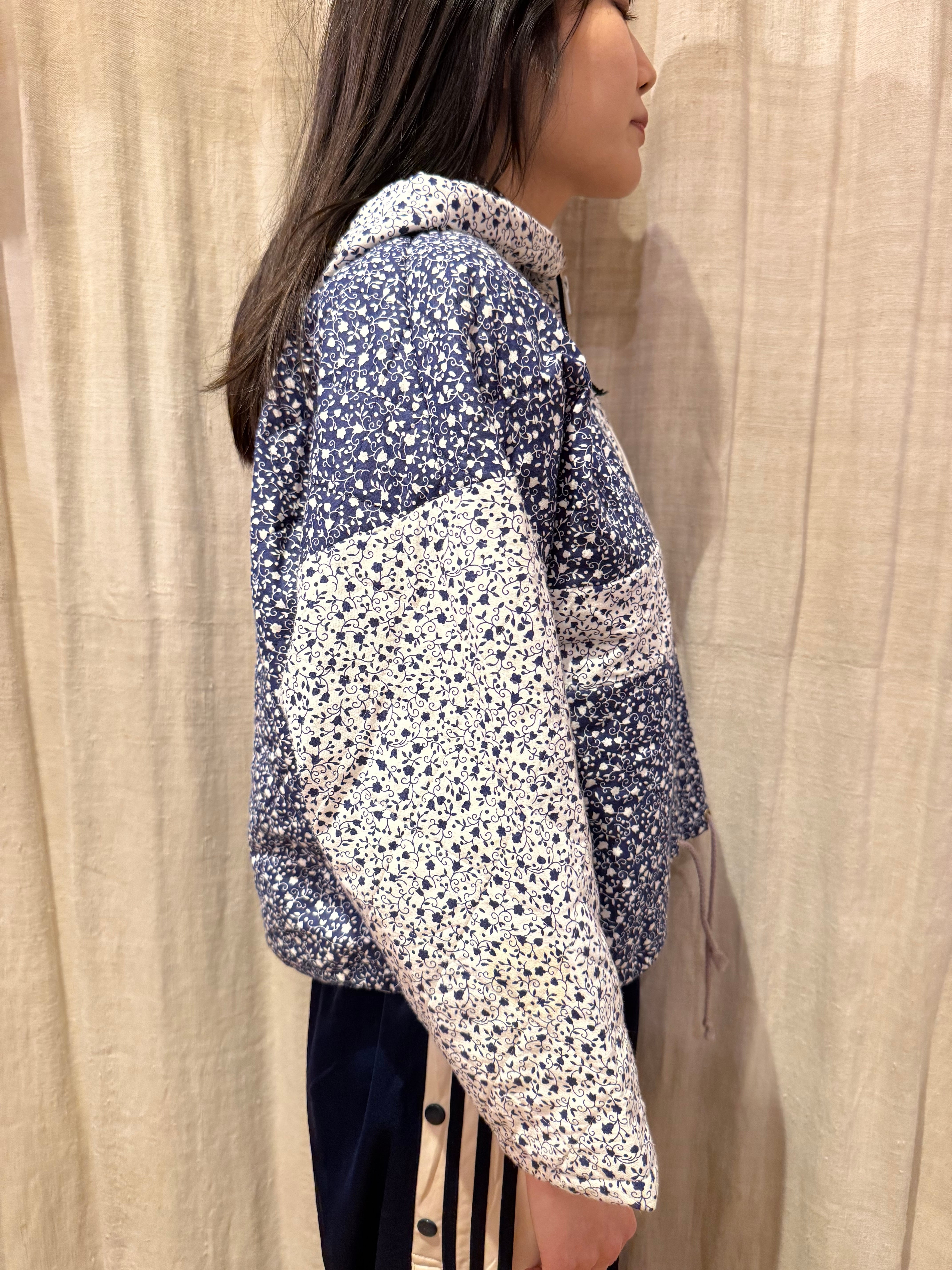キルティング素材で中綿は薄めの軽やかな着心地。ネイビーと白の小花柄が可愛らしいです。短丈でボックスシルエットなので使いやすく、裾にはドローカードが付いているのでシルエットを変える事も可能です。