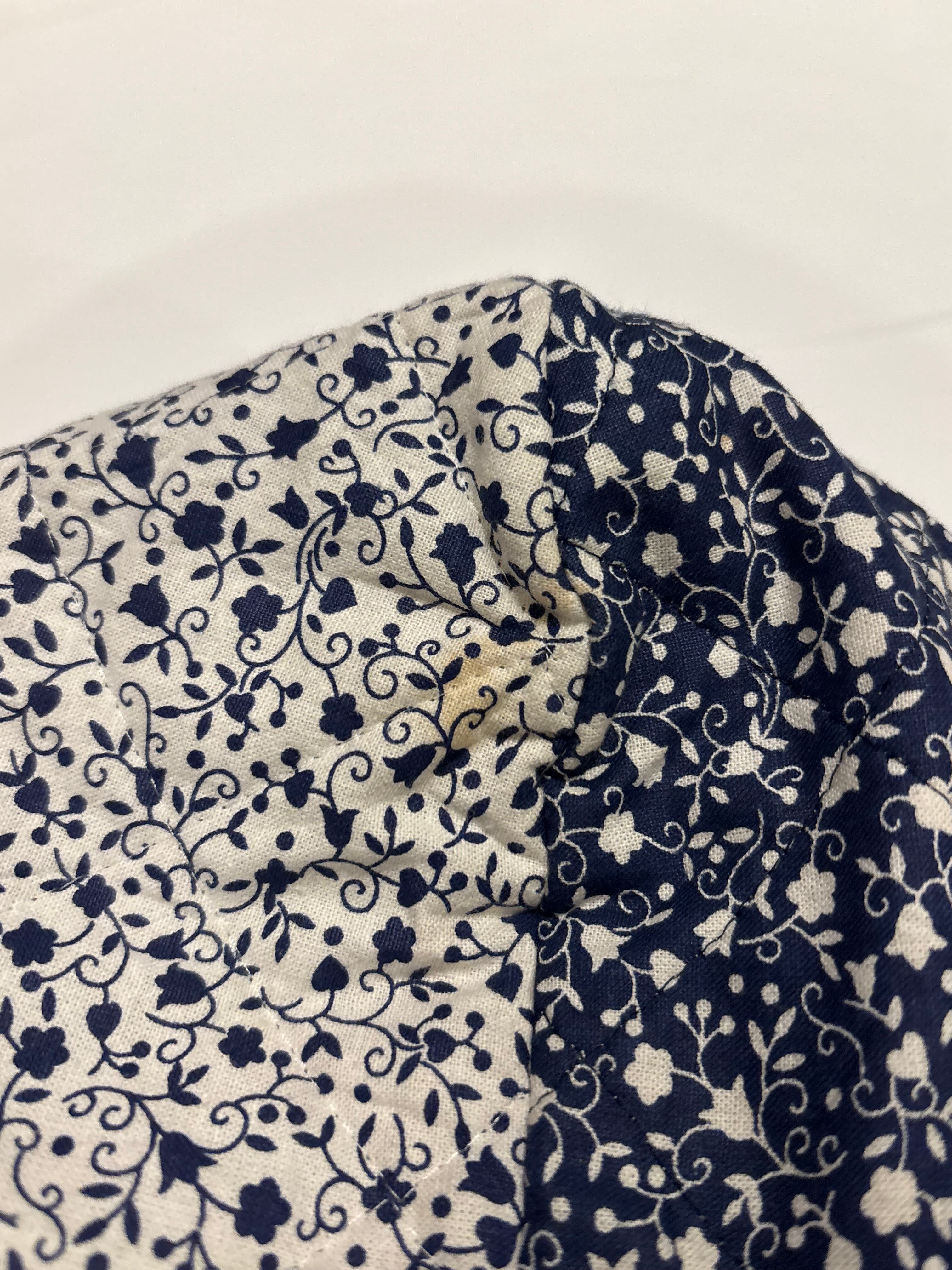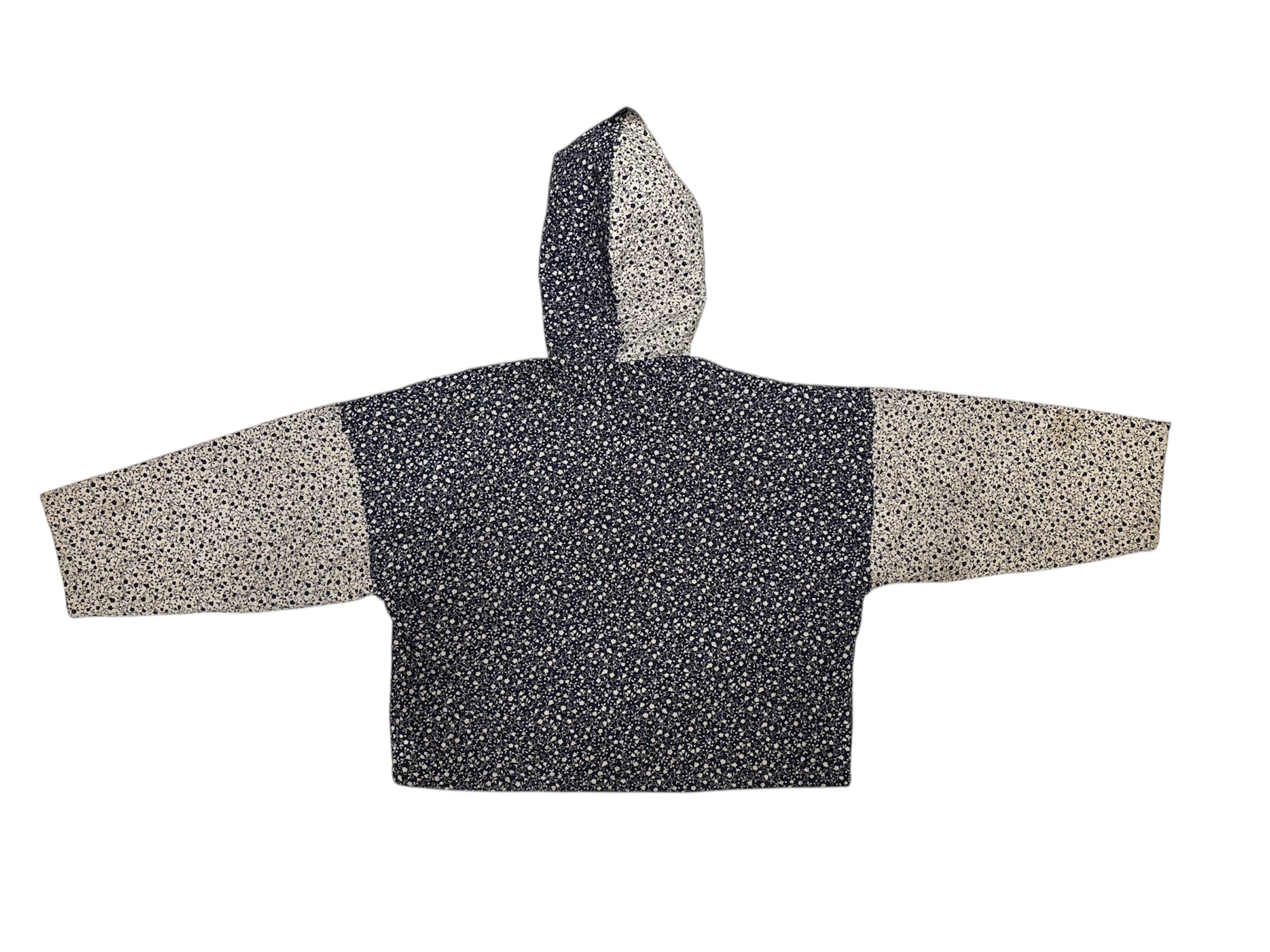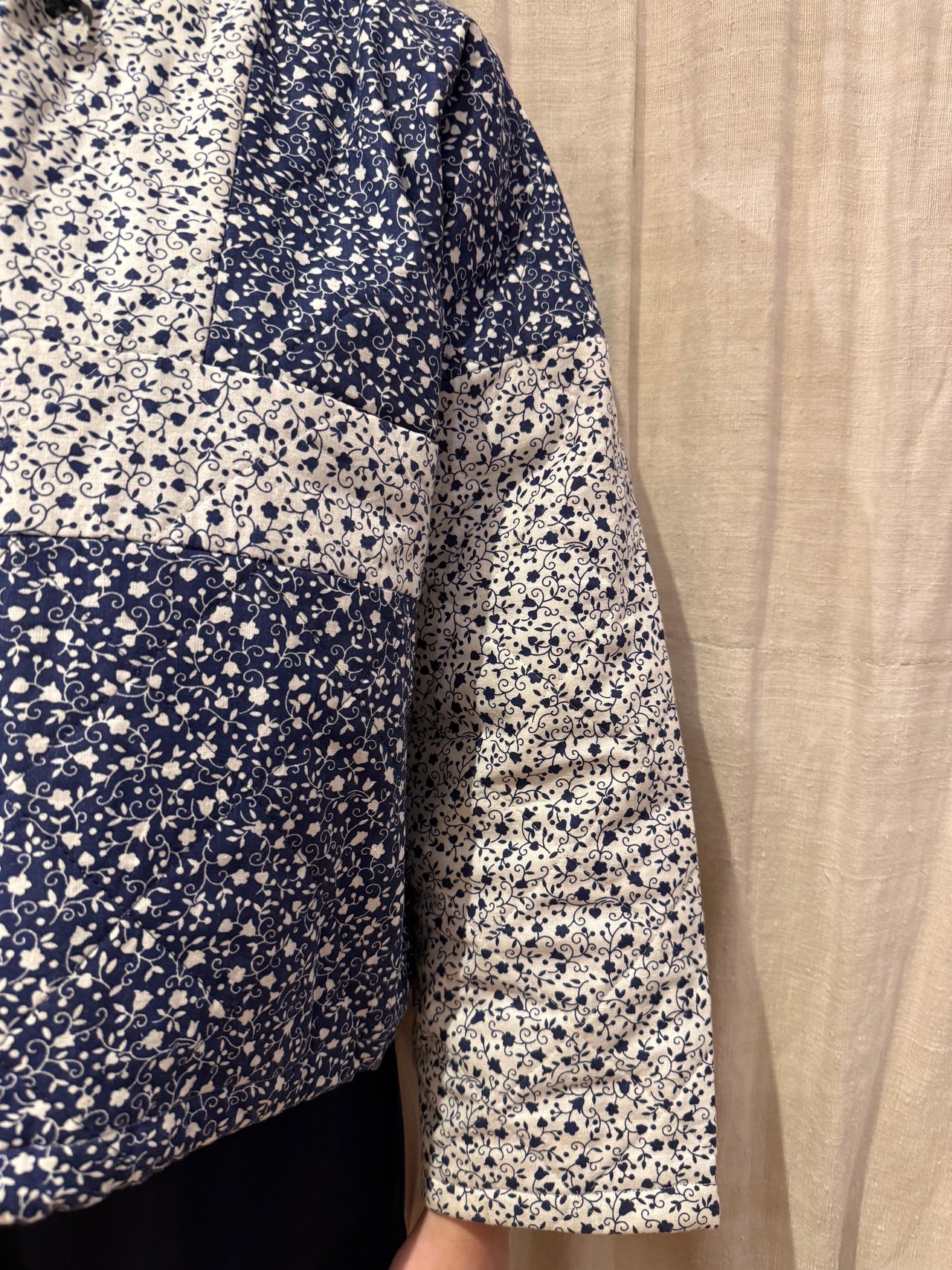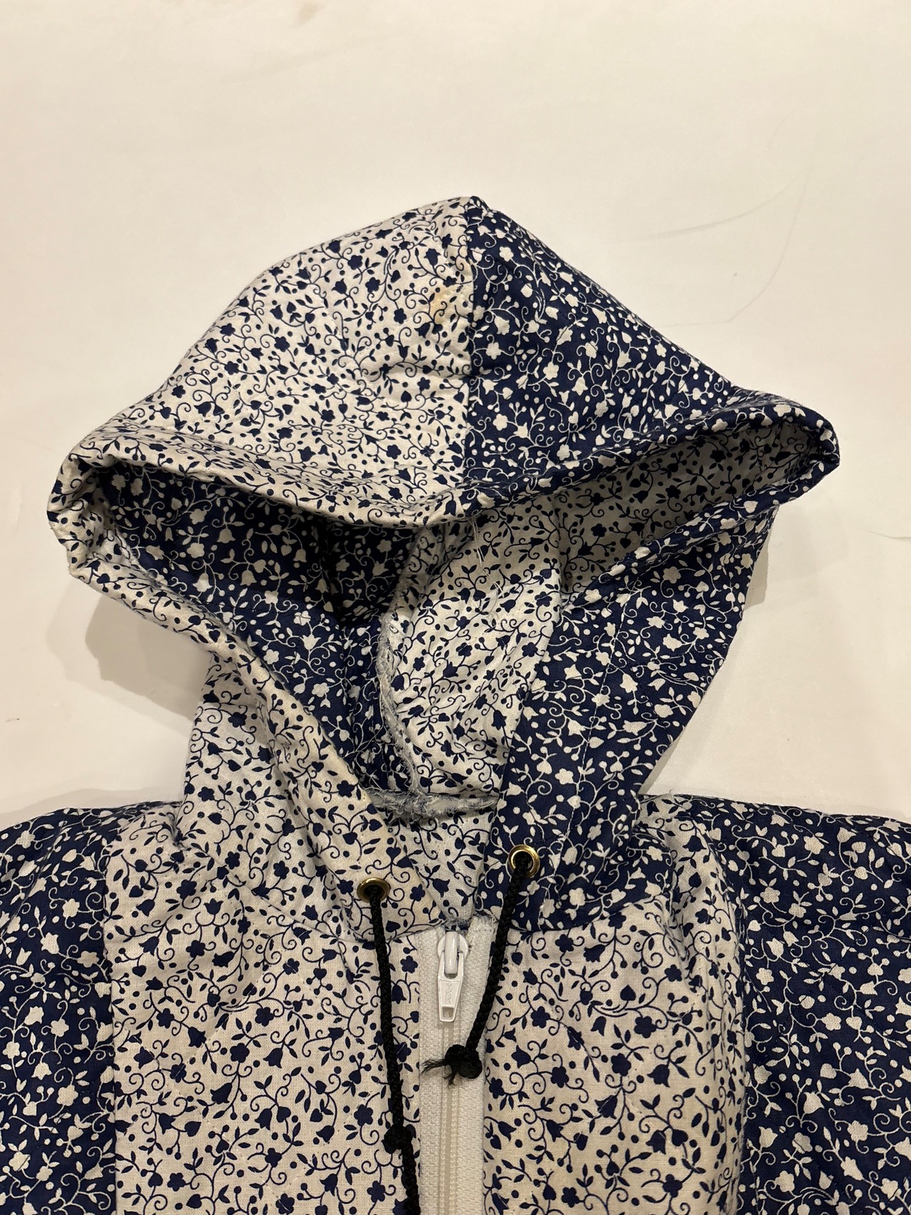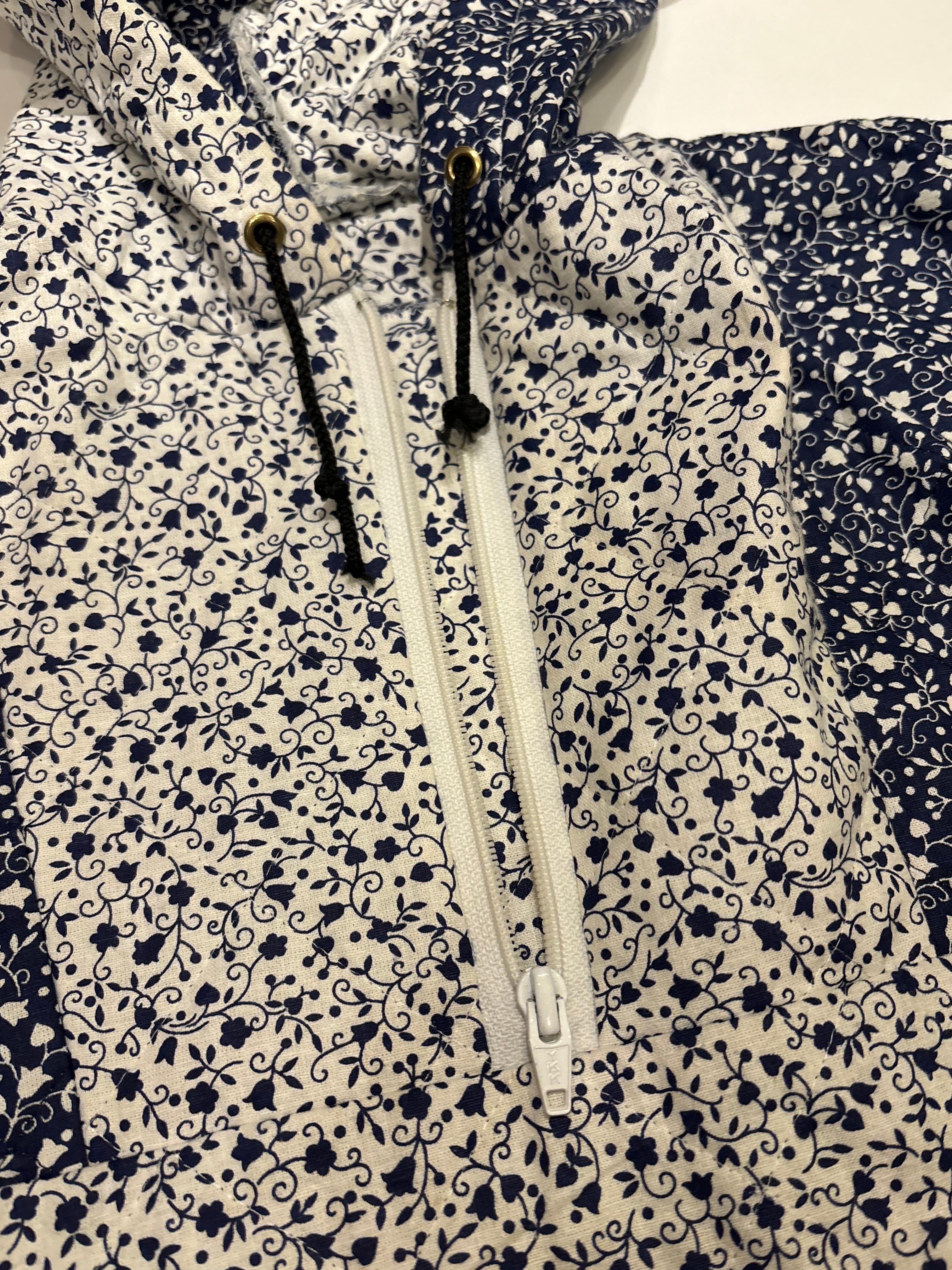 キルティング素材で中綿は薄めの軽やかな着心地。ネイビーと白の小花柄が可愛らしいです。短丈でボックスシルエットなので使いやすく、裾にはドローカードが付いているのでシルエットを変える事も可能です。