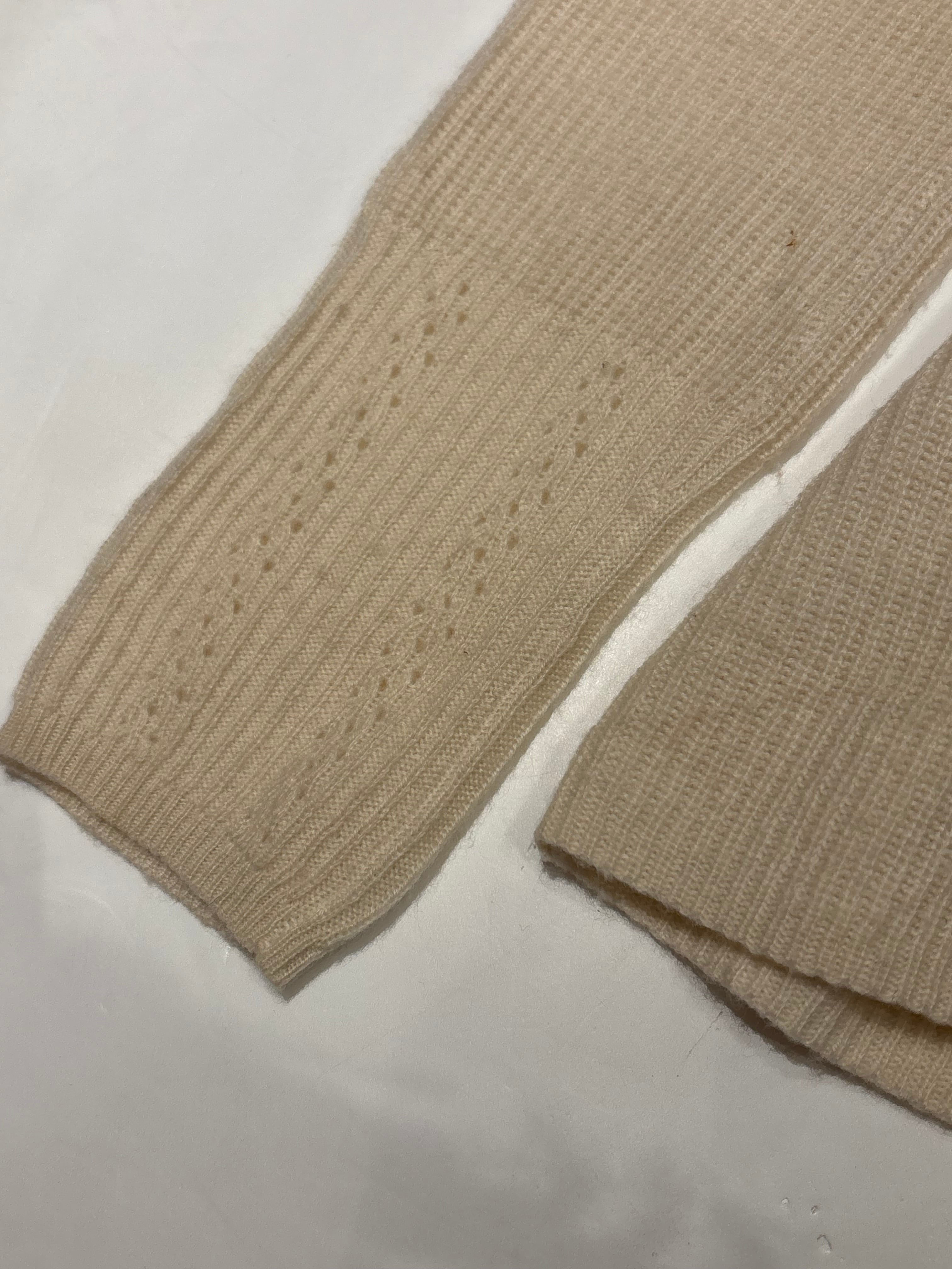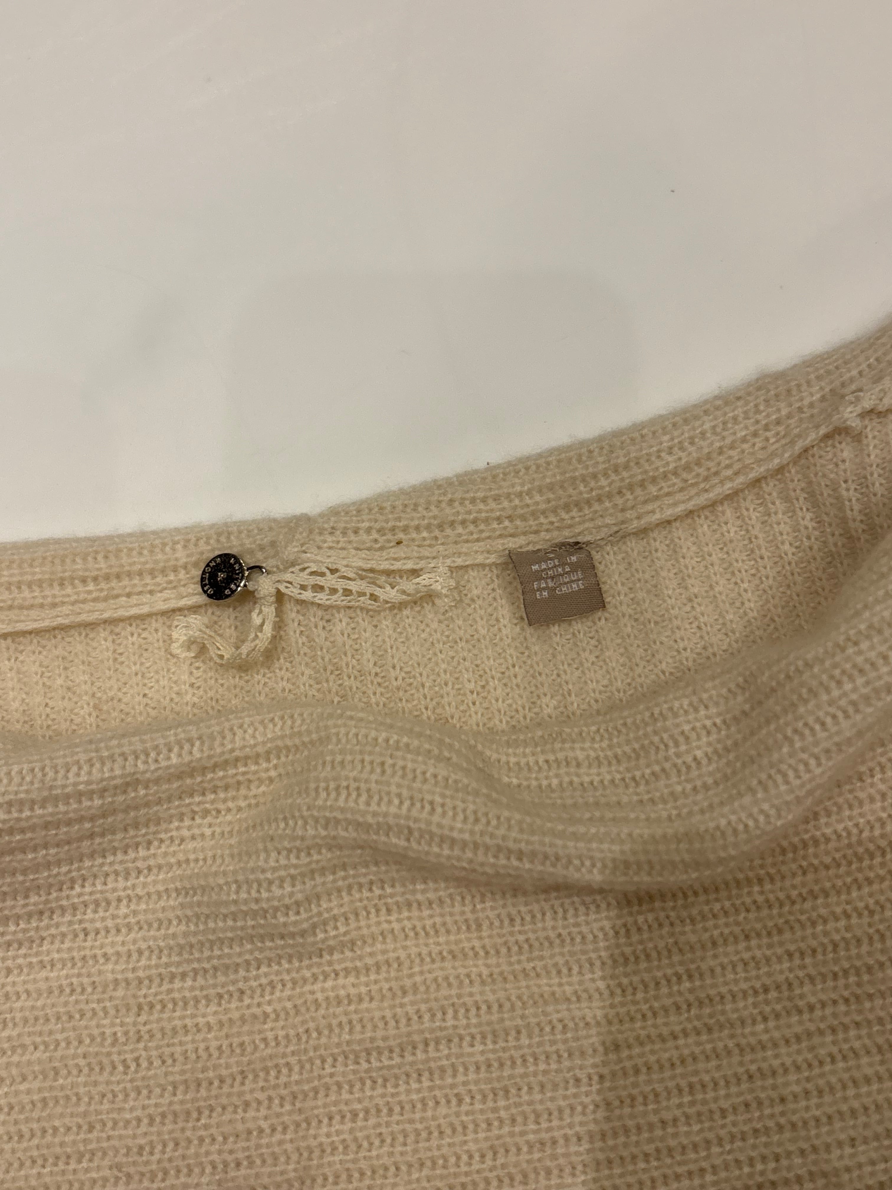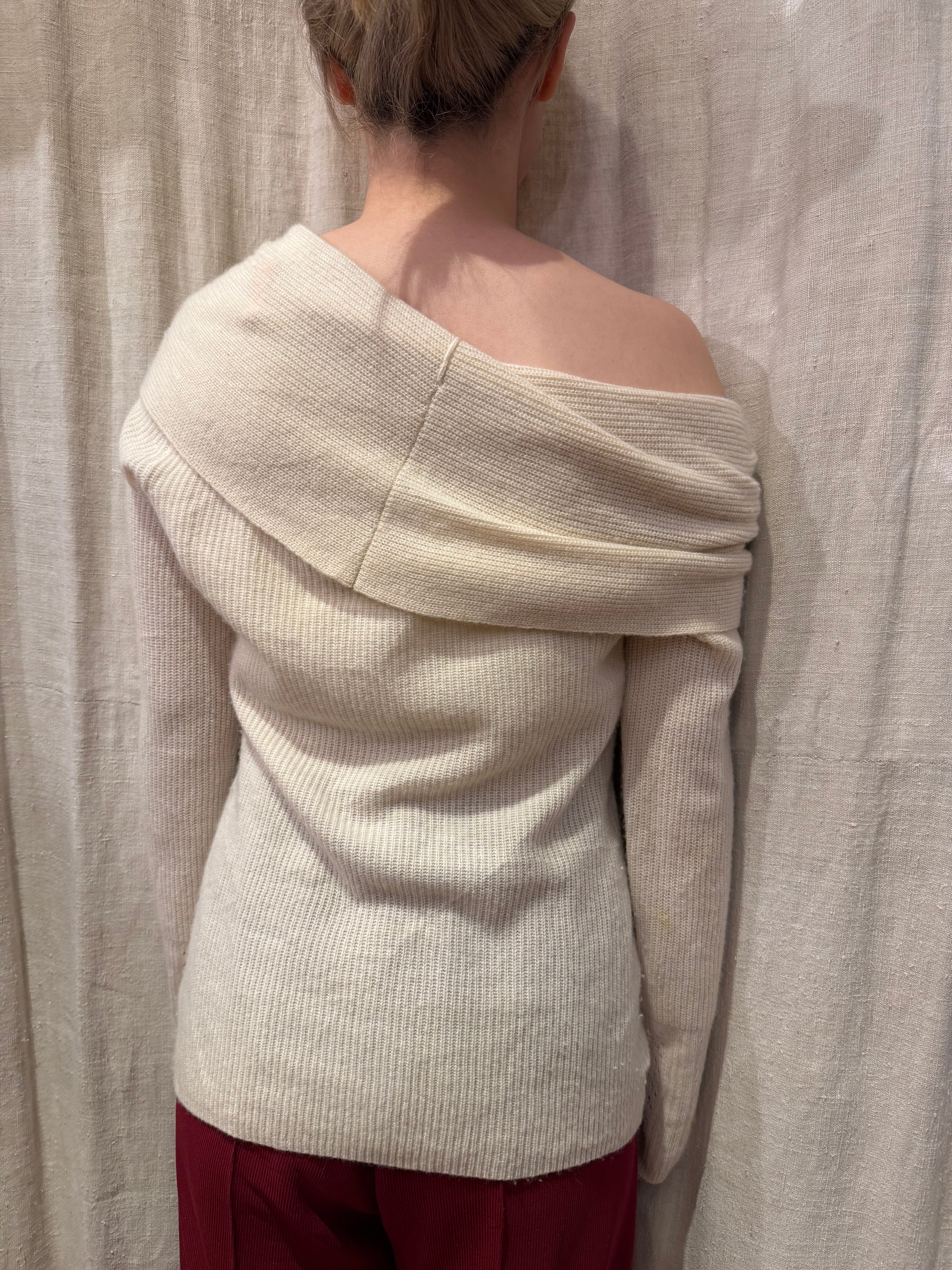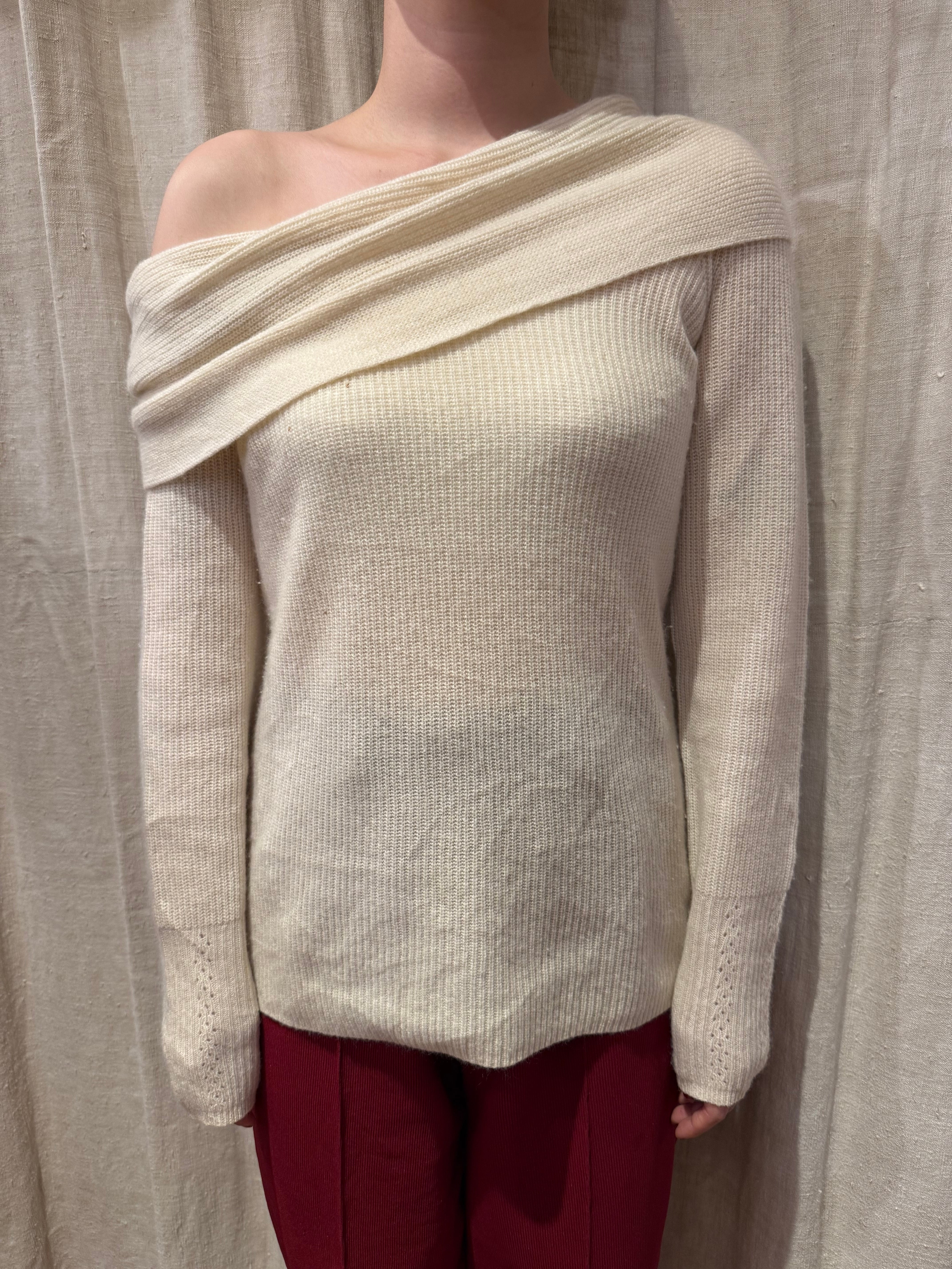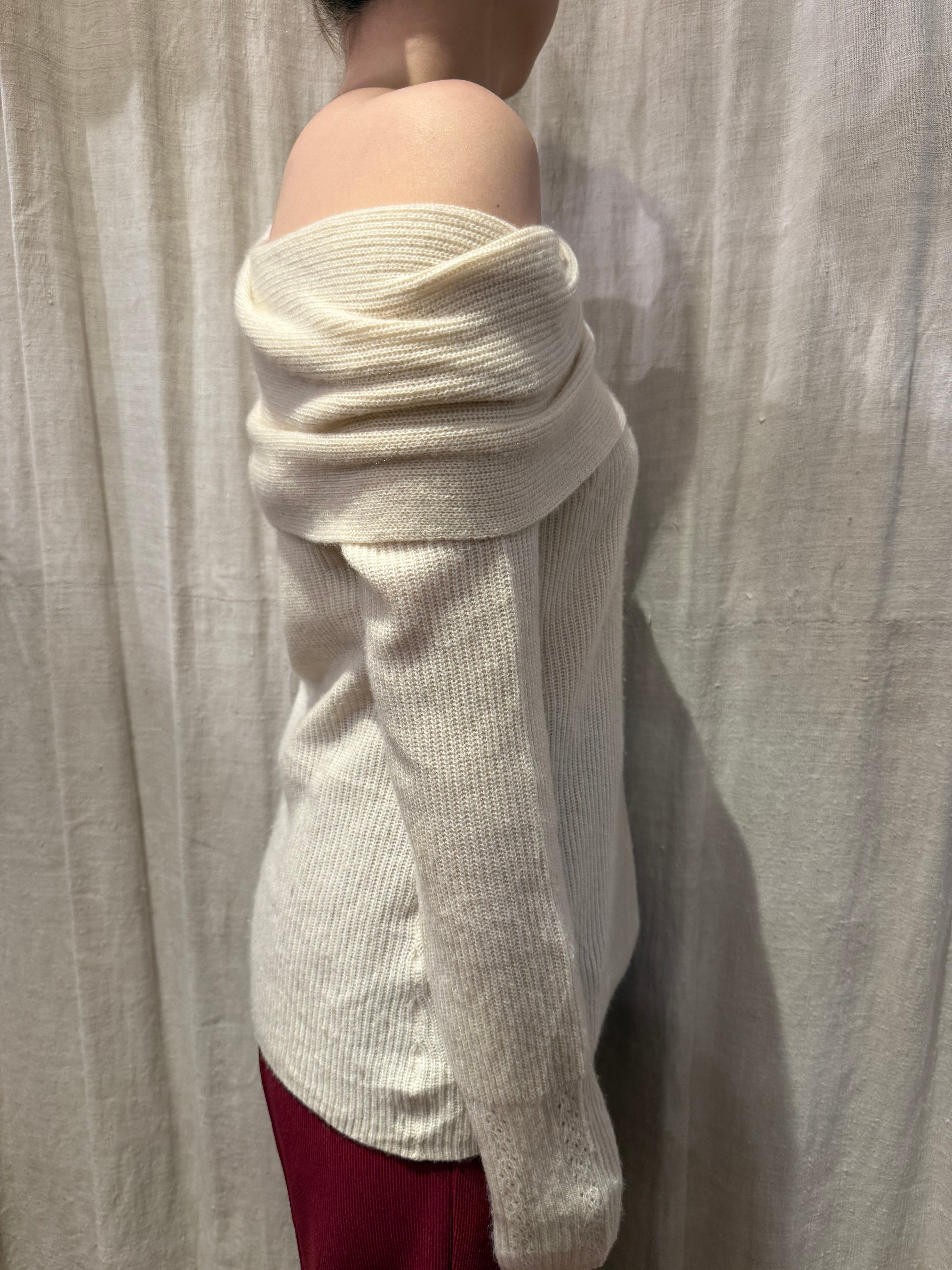 オフショルダーのニットトップスです。肩にクシュクシュと溜まるシルエットがとても可愛いです。チクチクしない優しい肌感触で、優しく体にフィットし、オフホワイトのカラーが柔らかな雰囲気を演出します。