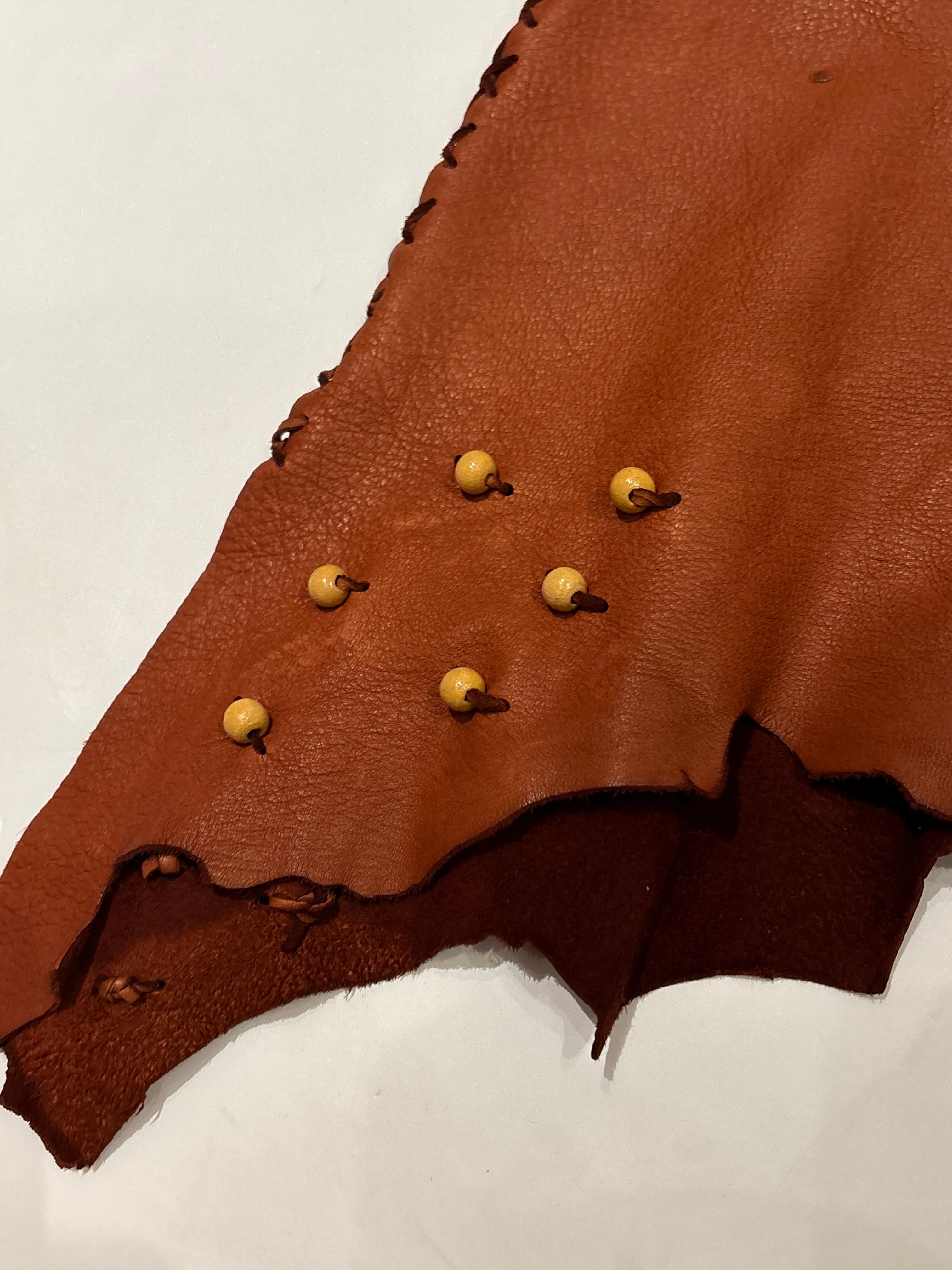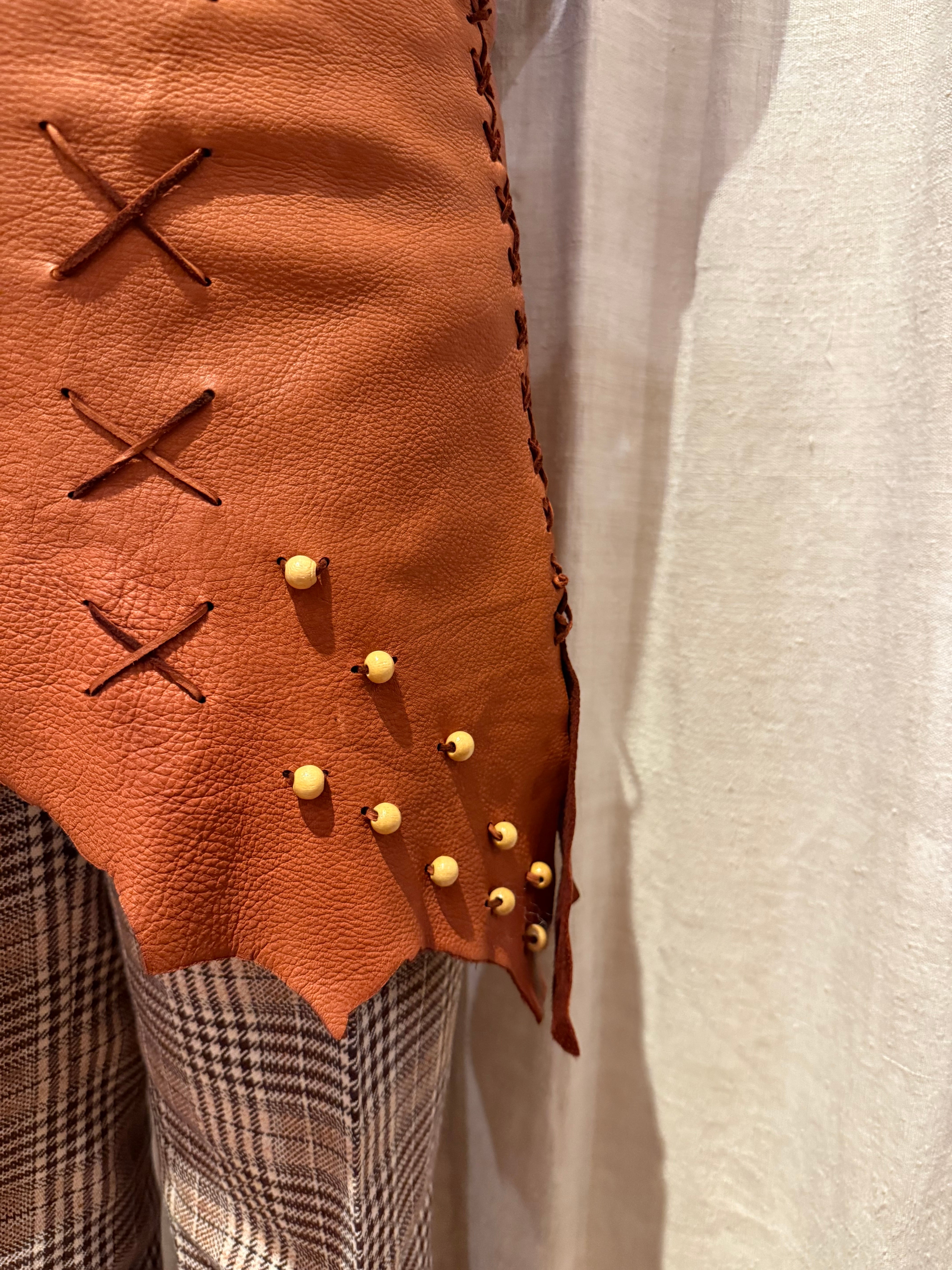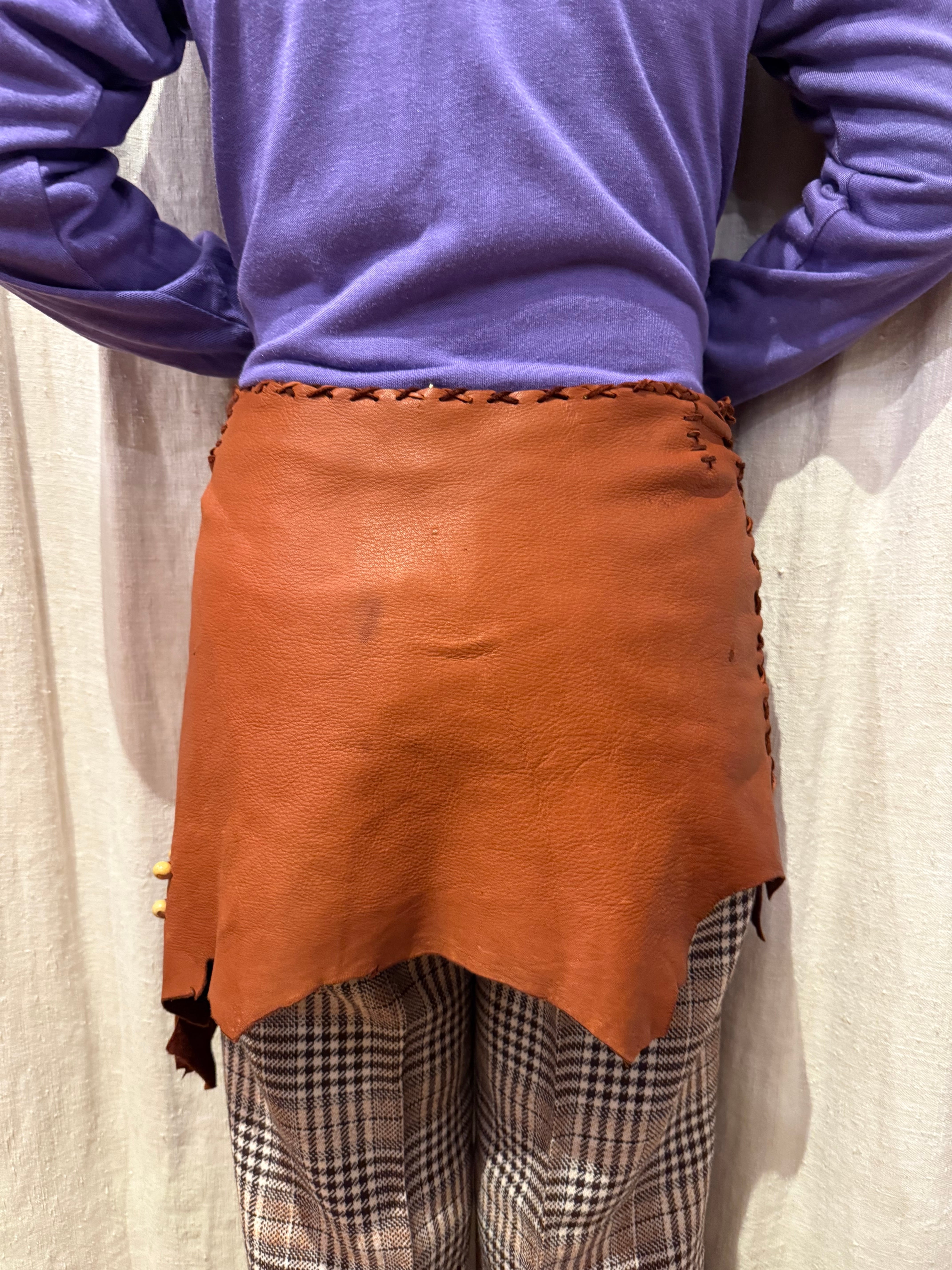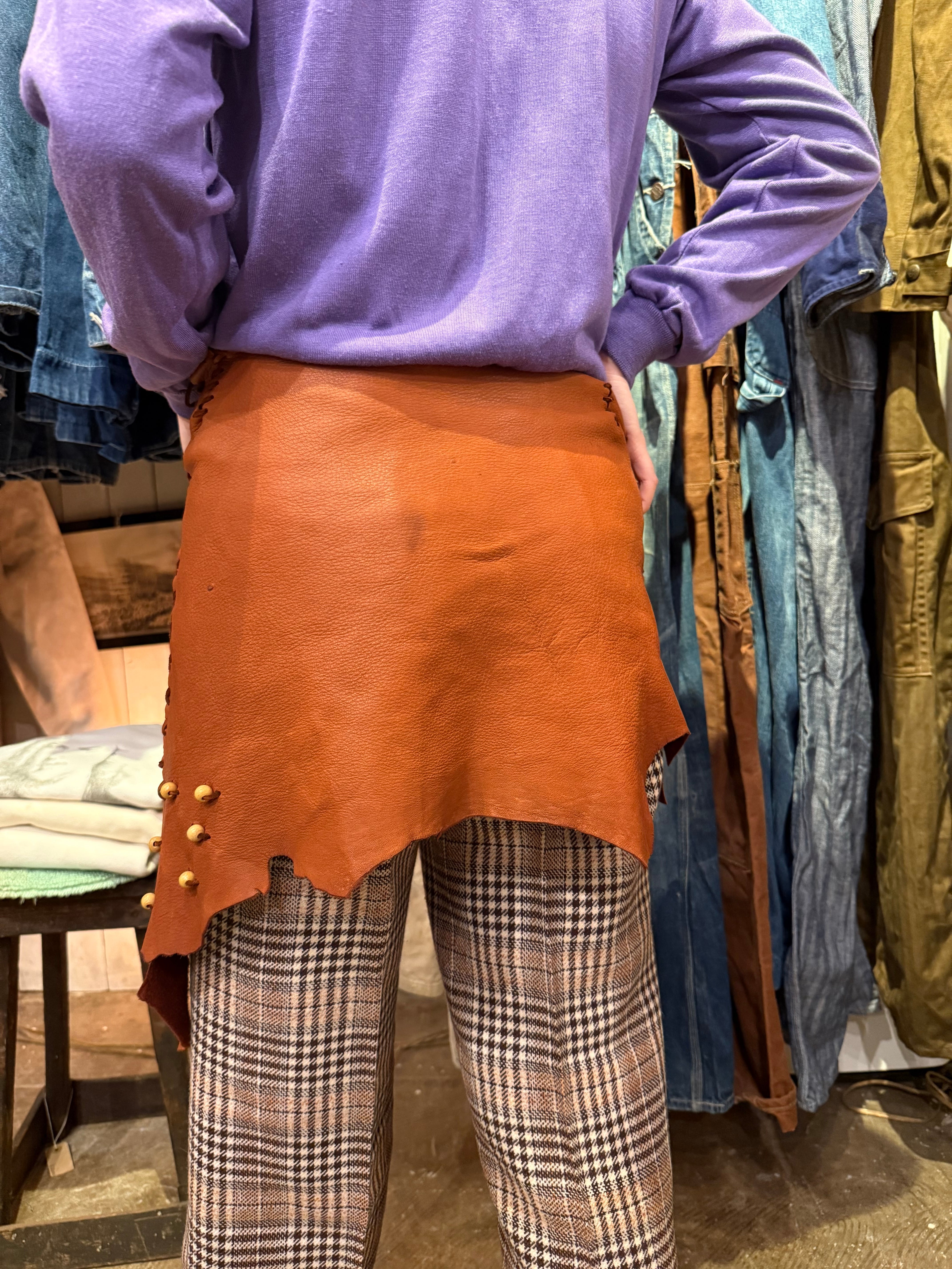レザーのスカートです。両サイドがレースアップになっており、サイズ調整が可能です。裾やビーズの装飾など、アシンメトリーになっておりデザイン性があります。レイヤードアイテムとしてもオススメで、季節問わずに着用して頂けます。