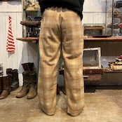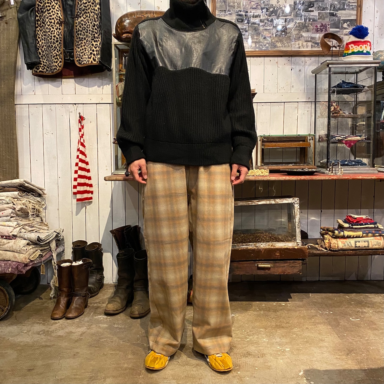 ビンテージファブリックで制作いたしました、ジャンティークオリジナルのシャドーチェックパンツになります。淡いベージュ系のシャドーチェックで素材はウールになります。フロントはボタンフライ仕様でウエストは紐で絞って穿いていただけます。左右両ポケットつきです。太めのストレートシルエットで裾上げしてもシルエットは変わらず誰でも格好良く穿いていただけると思います。ウール地なので水洗いしますと縮みがでる可能性があるのでドライクリーニングをおすすめ致します。※股付近にピンホール有り、うしろから生地をあてています。写真12、13枚目参照