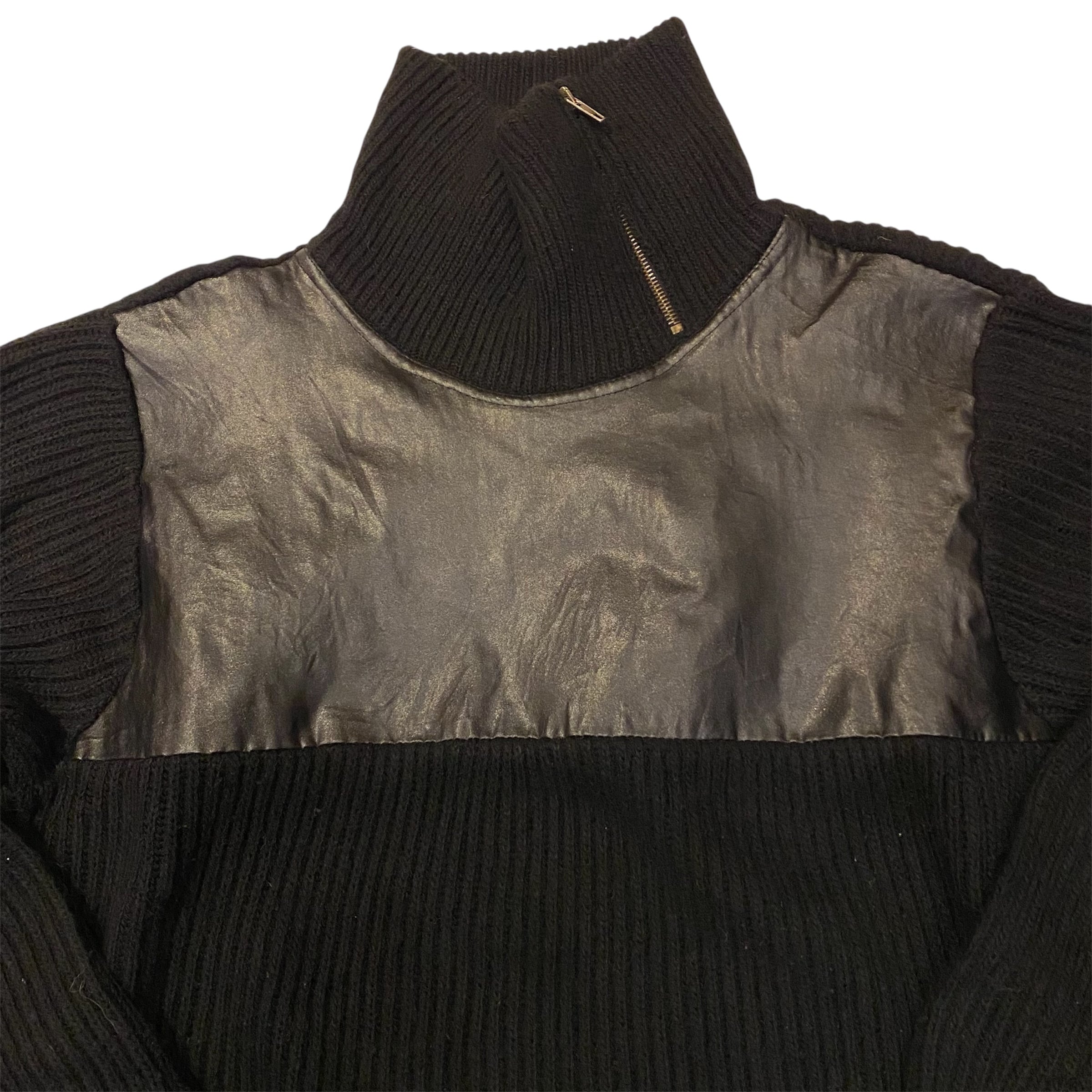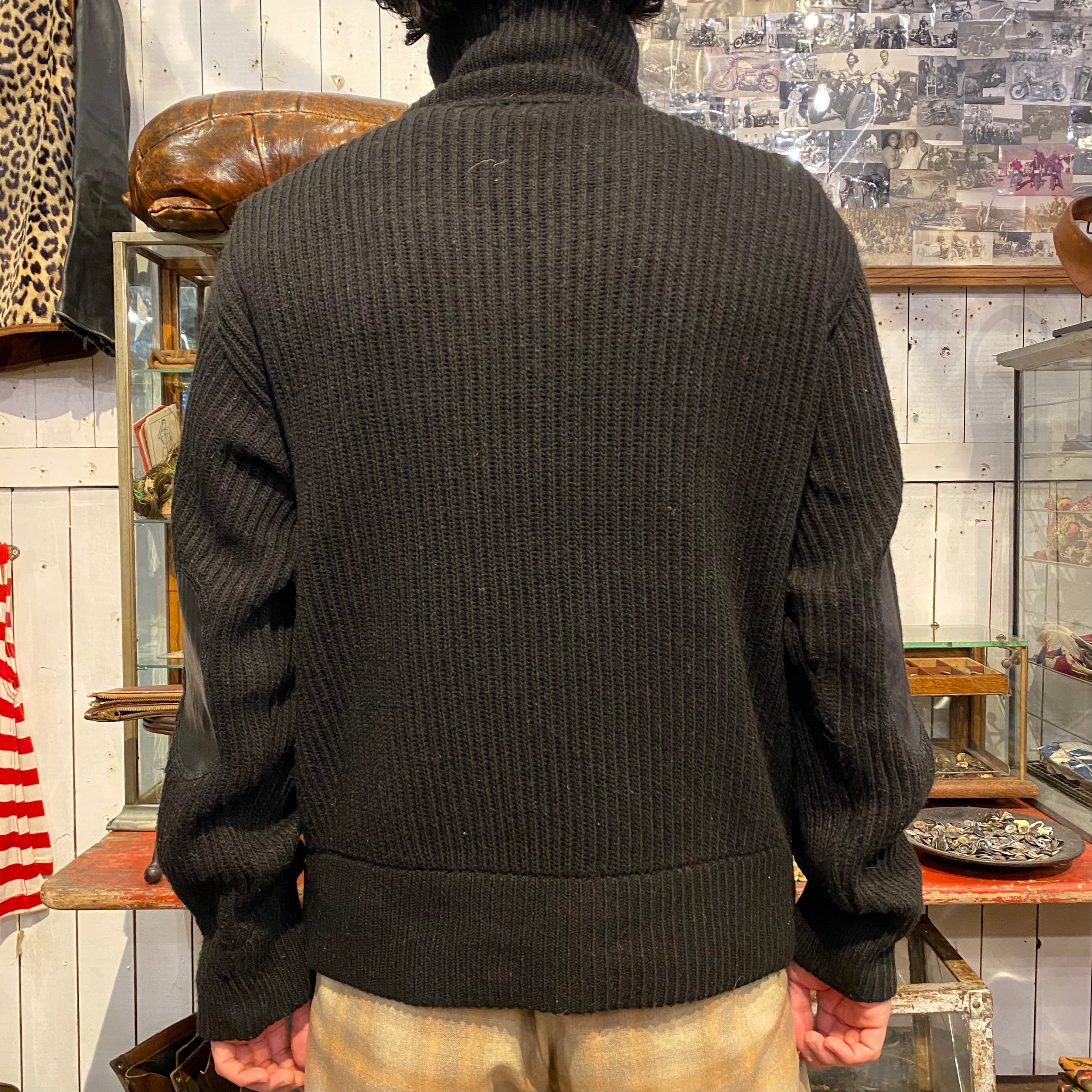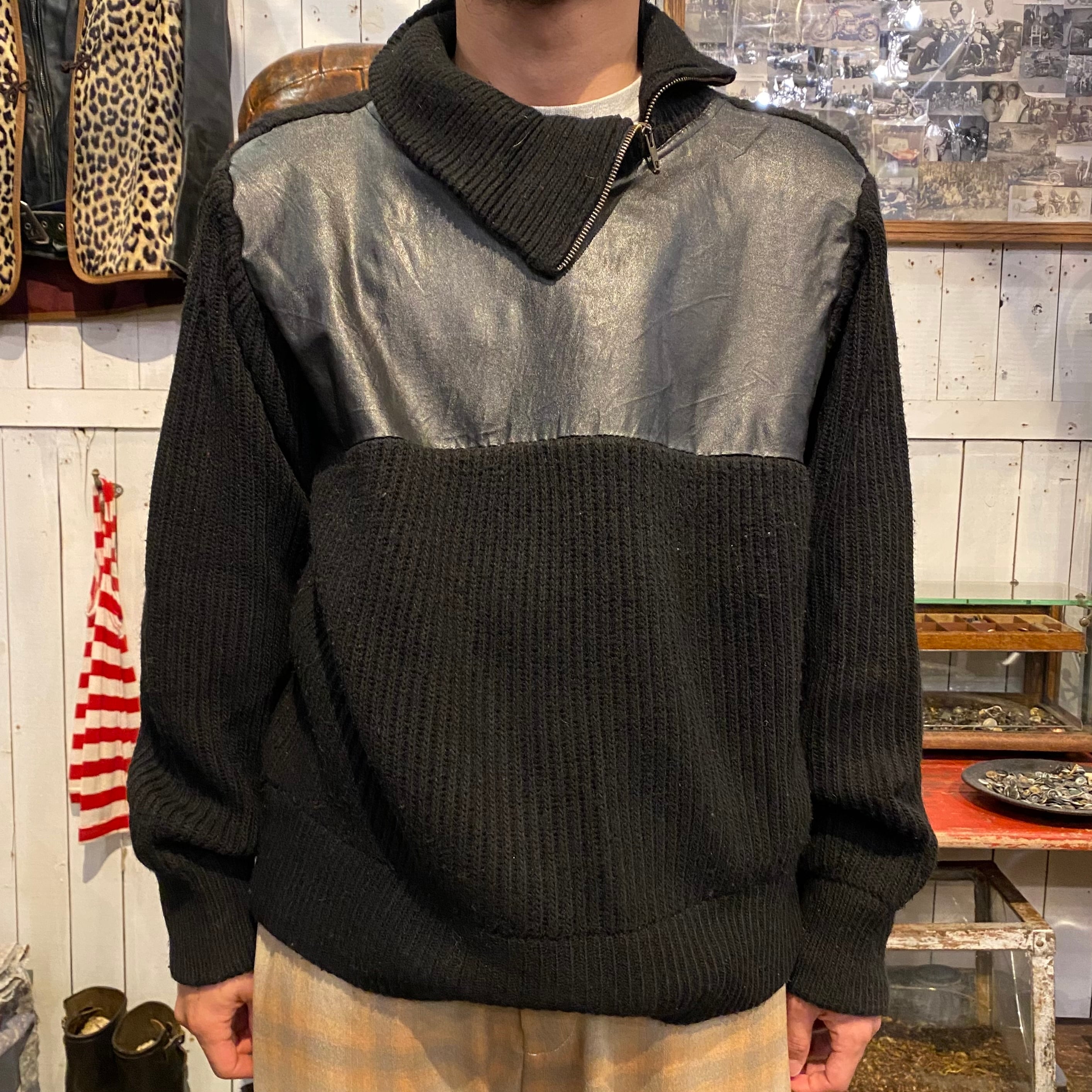 80年代のイタリアのデザインニットになります。カラーはブラックで、素材はウール×アクリルの柔らかいリブ編みニットです。首もとの斜めジッパーで開閉できるプルオーバーのデザインで、フロントとエルボーにはレザーが使われています。デザイン性、また着た時のシルエットも良く一枚でさまになるニットでございます。