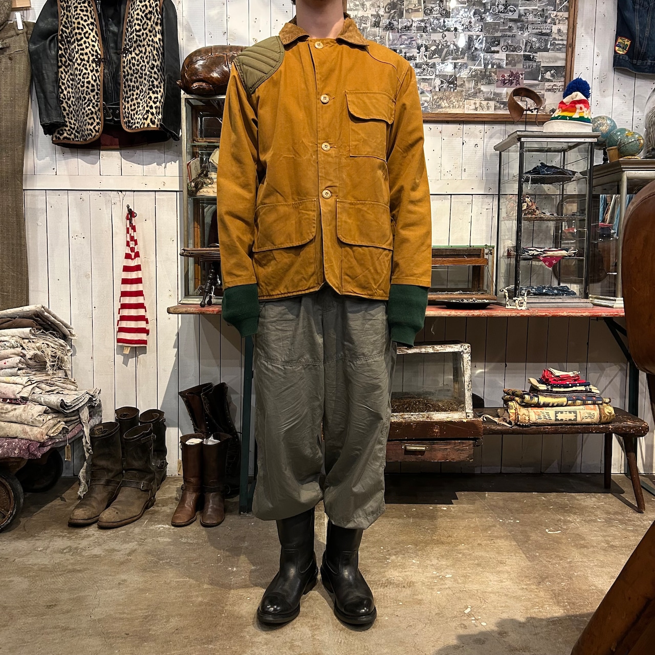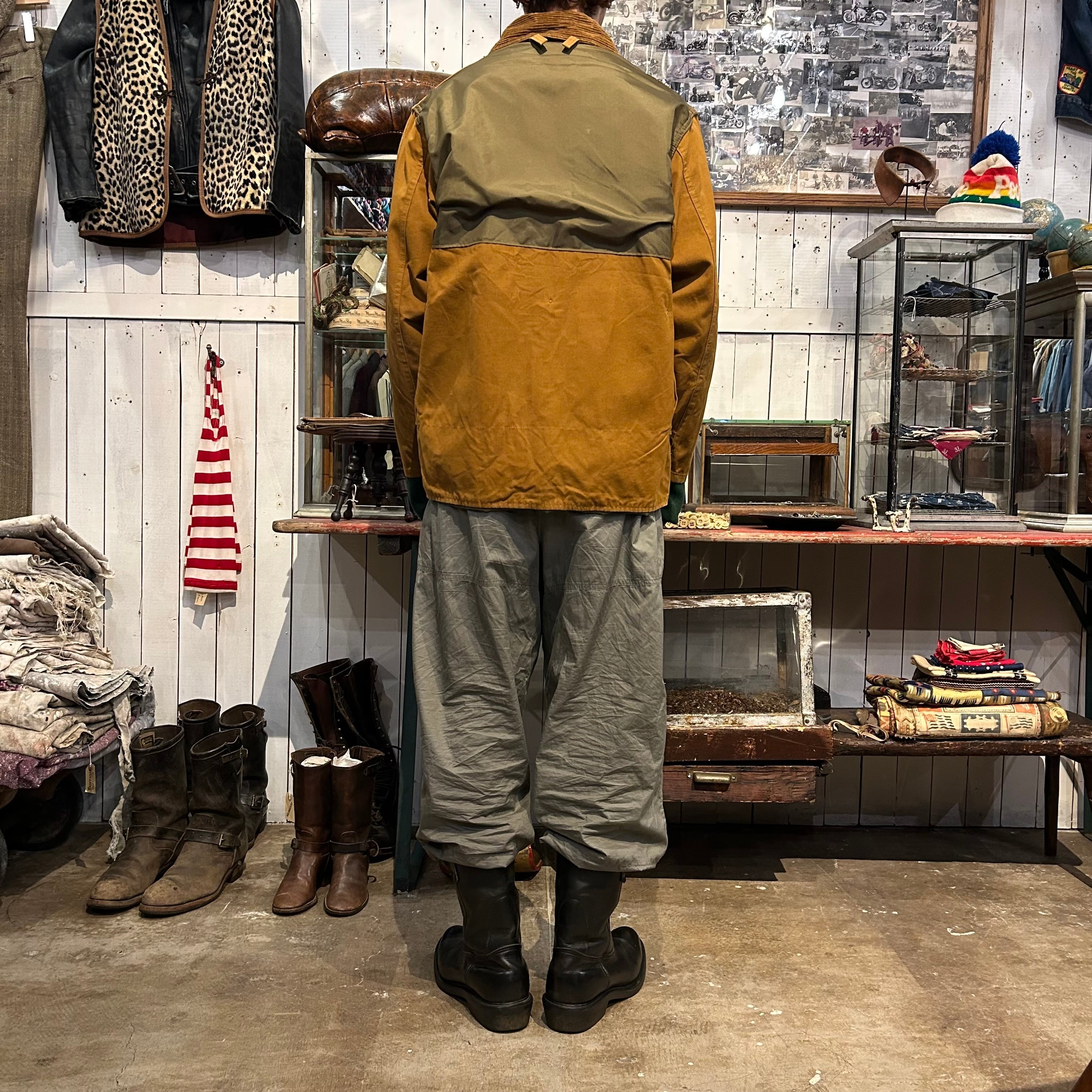 70年代頃のSAFTBAKのハンティングジャケットになります。ハンティングジャケットといえば、ダック地の印象ですが、古い個体に比べこの辺りは、薄い印象です。そのため、インナーを差し込んで、上手く現代っぽく着れるのも特徴でございます。また、ディテールとしては、ゲームポケットやガンパッチ、カートリッジホルダーなど基本的なハンティングジャケットかと。野暮ったい印象ではございますが、野暮ったく着ても良し、個人的にハンティングジャケットをファッショナブルにさらっと着こなす方はかっこいいなという印象です。