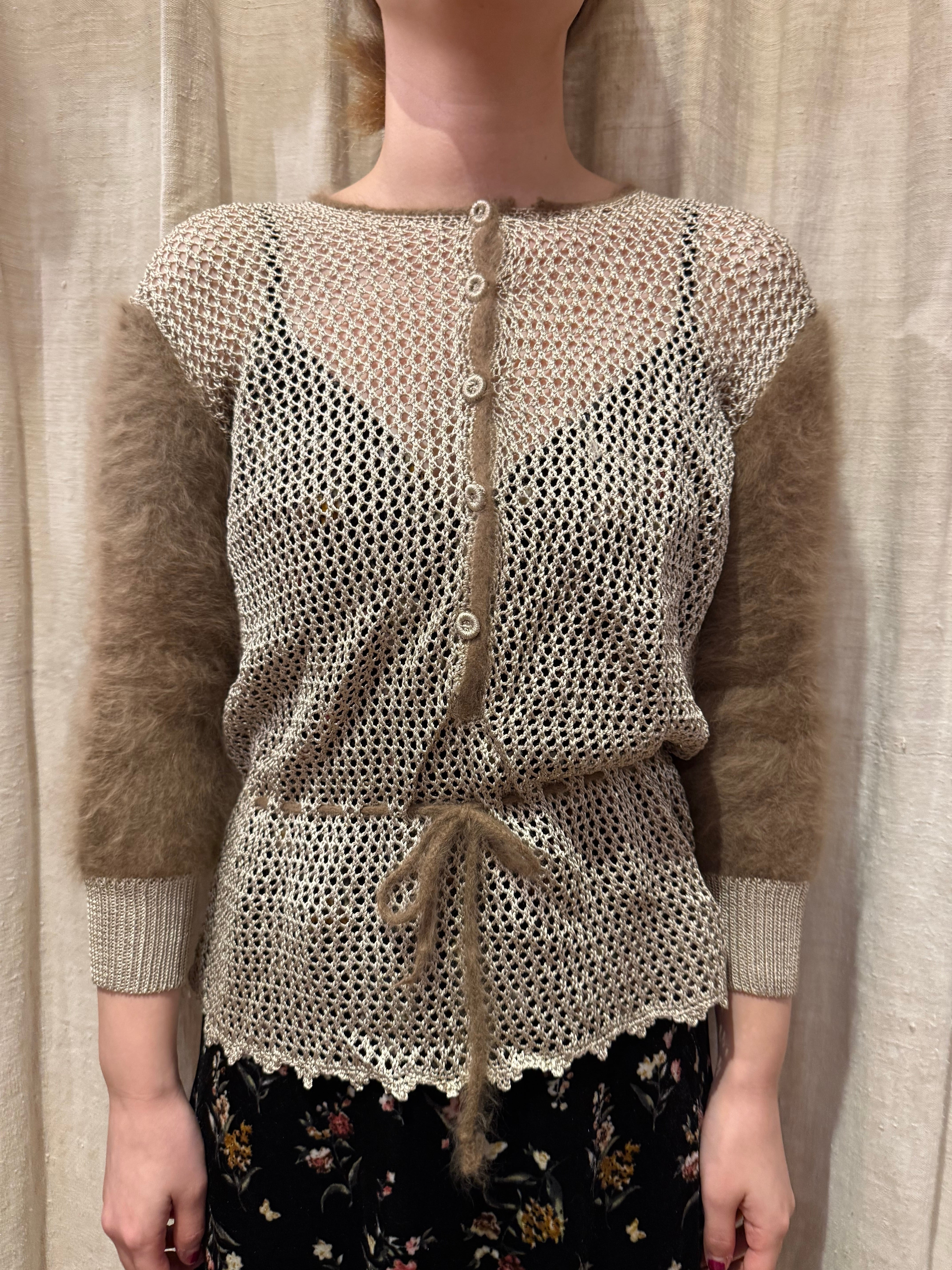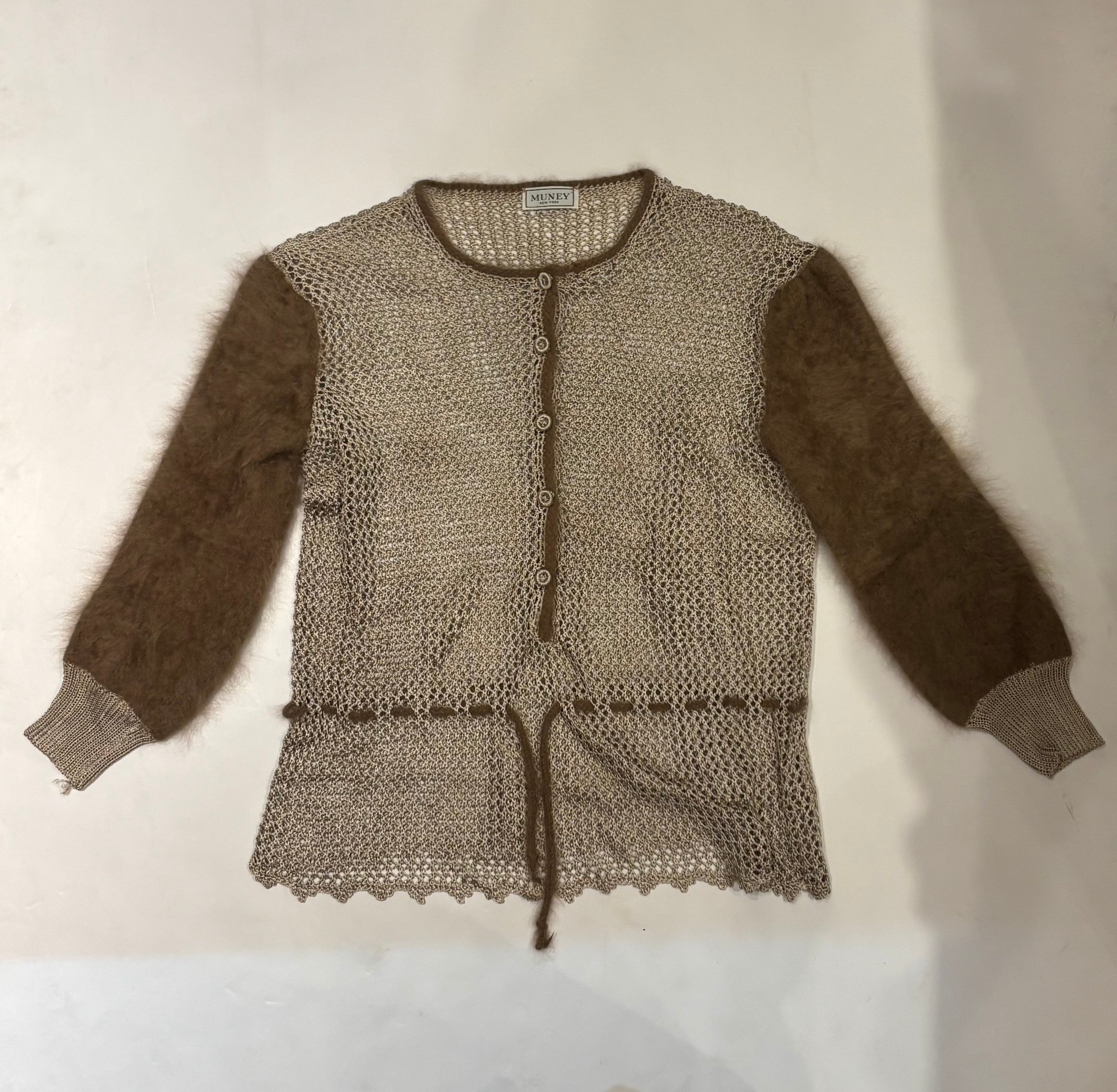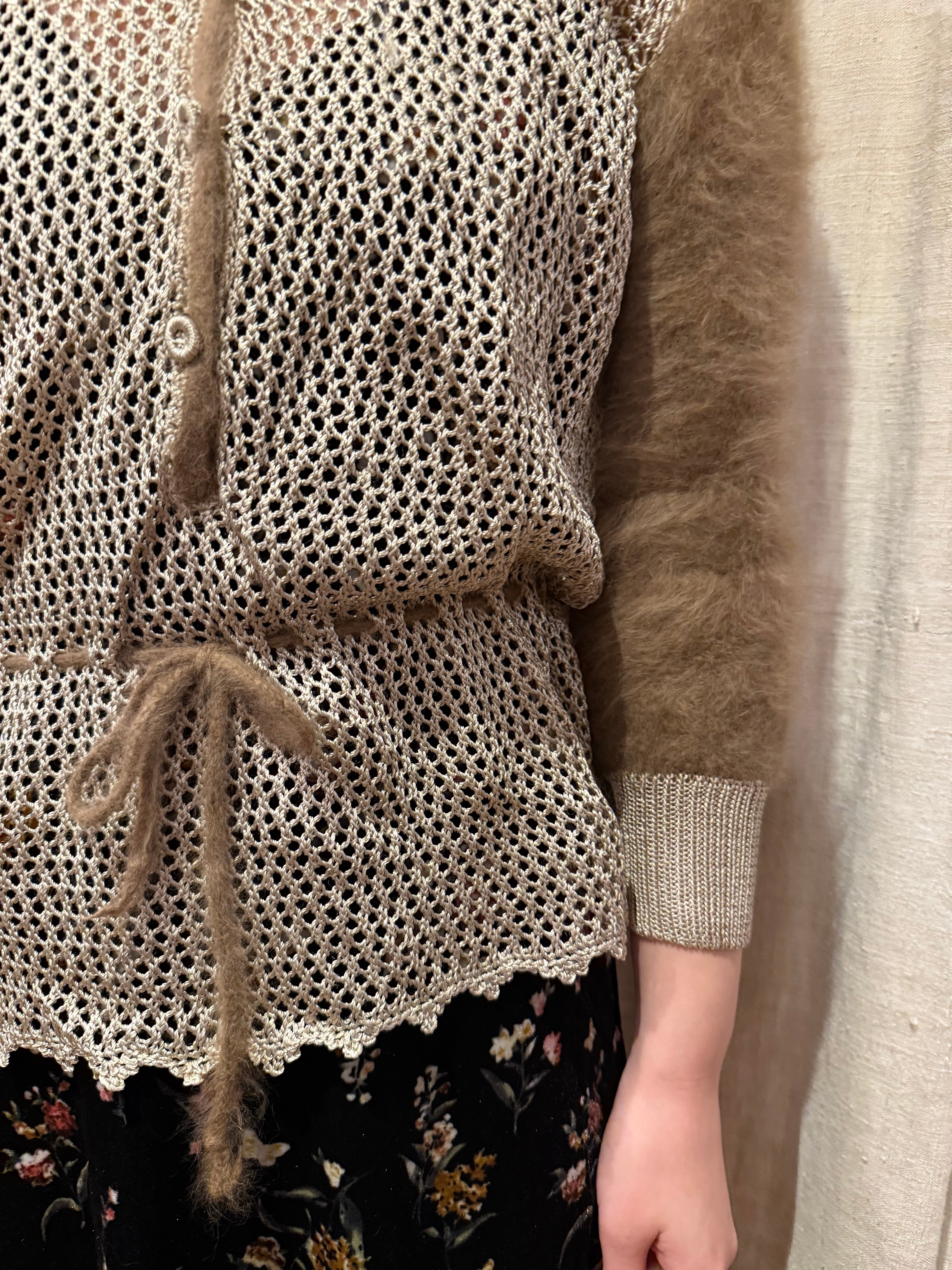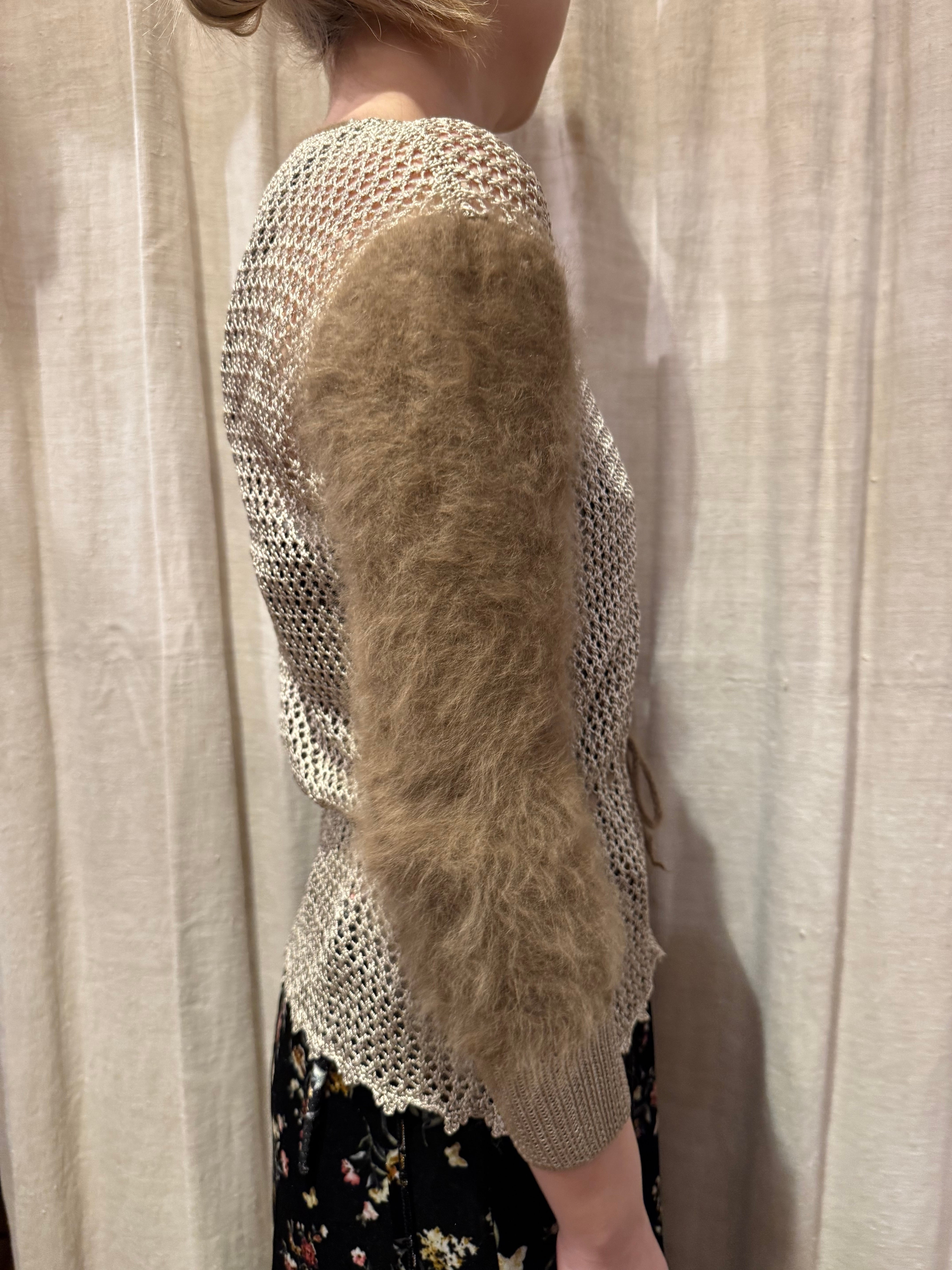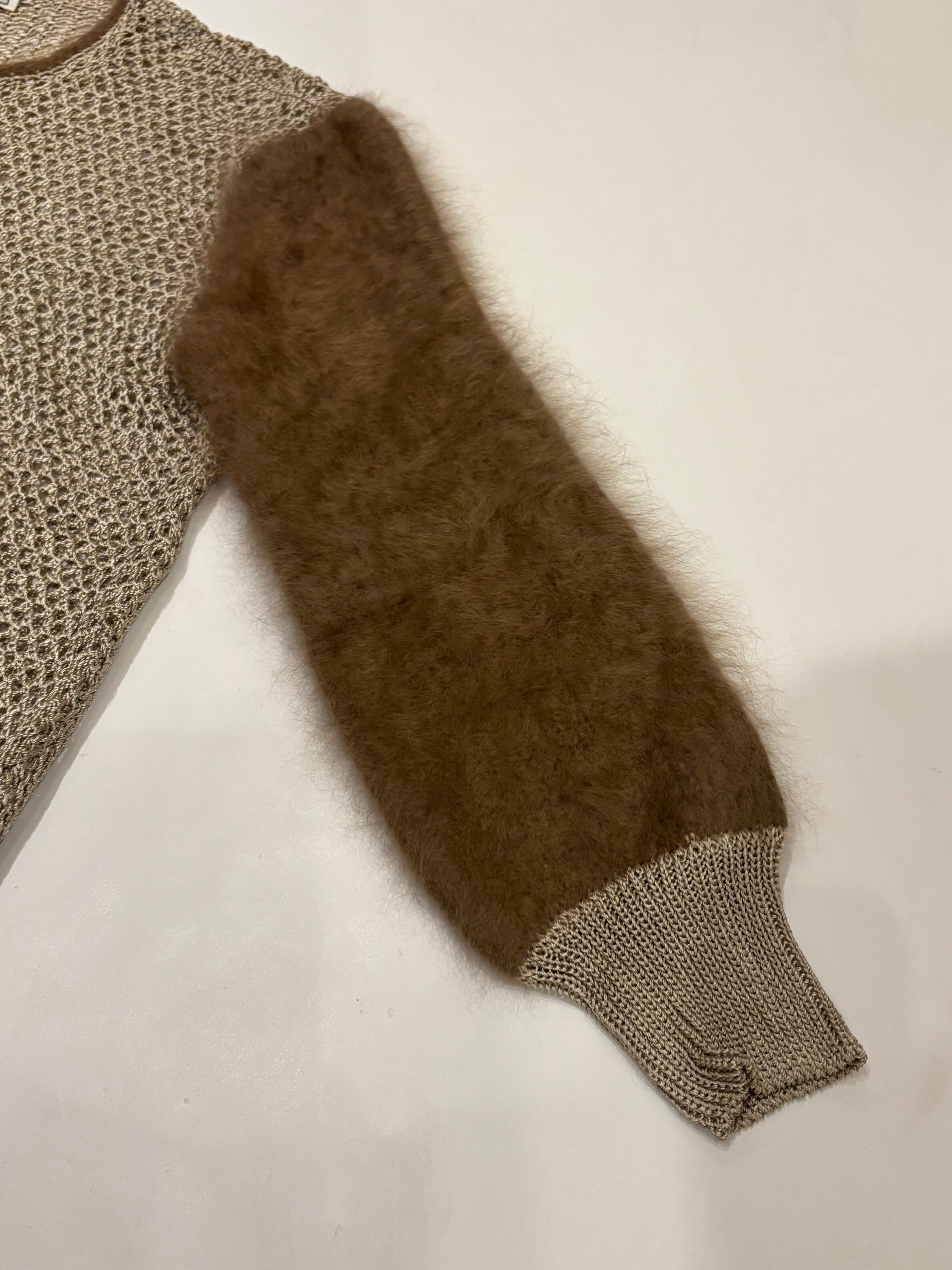 透け感のある緩く編まれたニット生地に、袖の部分は毛足の長い柔らかいニット生地に切り替わったデザインがポイントになります。