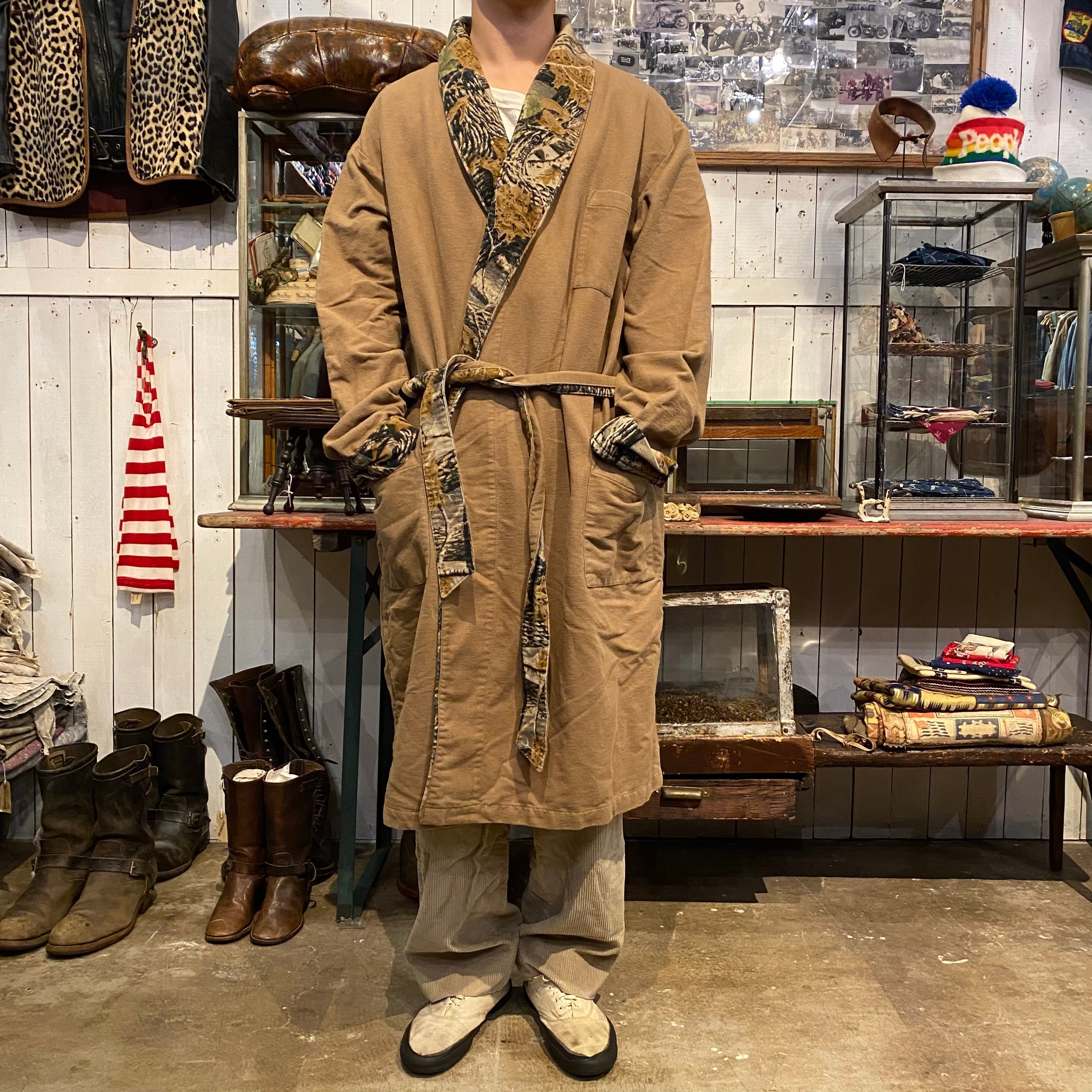 こちらCabela'sのガウンになります。表面はコヨーテカラー、裏面はリアルツリー柄、起毛がかったシャモアクロスファブリックが使われた珍しい逸品です。ウエストベルト付きです。着るとショールカラー部分、袖口、ベルト部分にリアルツリー柄が見えてファッション的にも面白いと思います。がばっとゆったり着れる良いサイズ感、コートっぽく見た目もあたたかい印象のガウンになります。