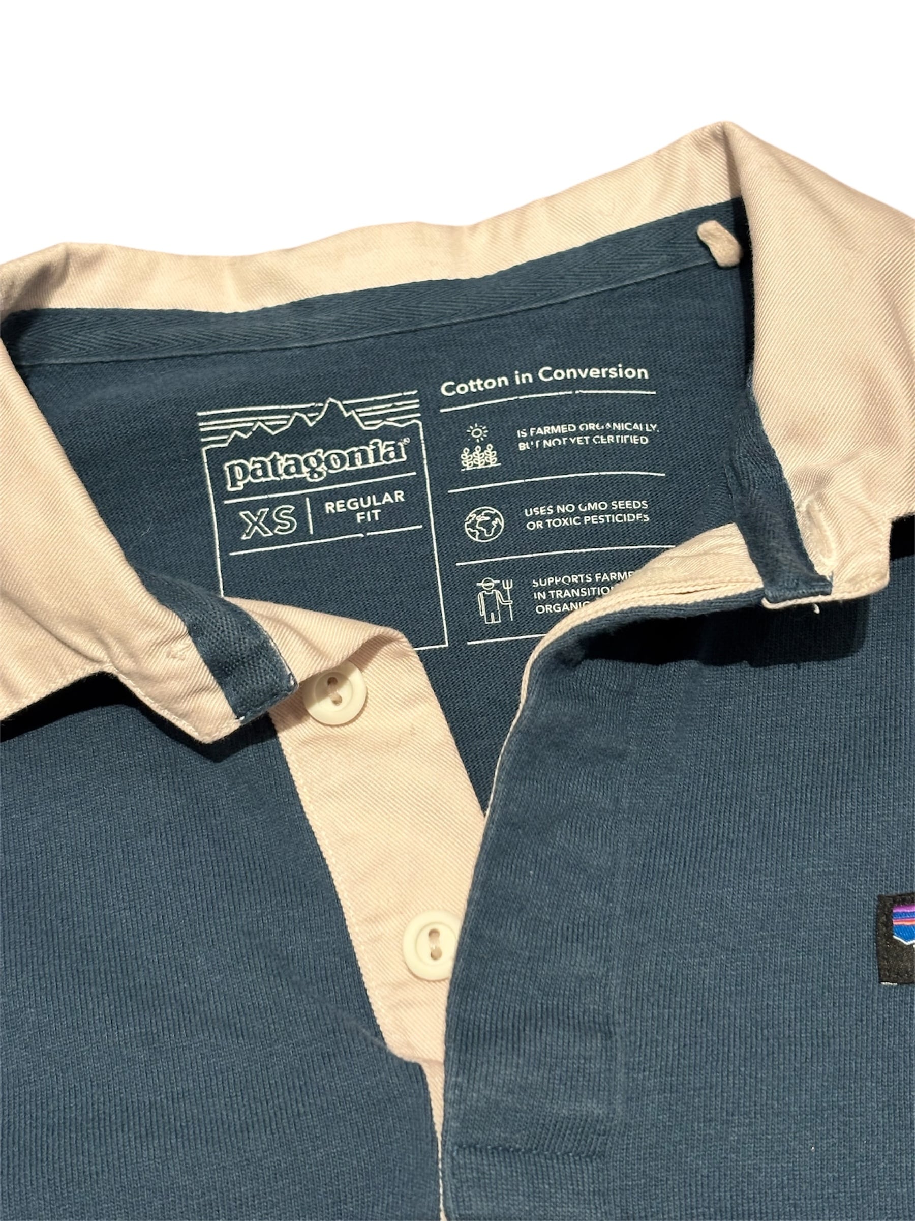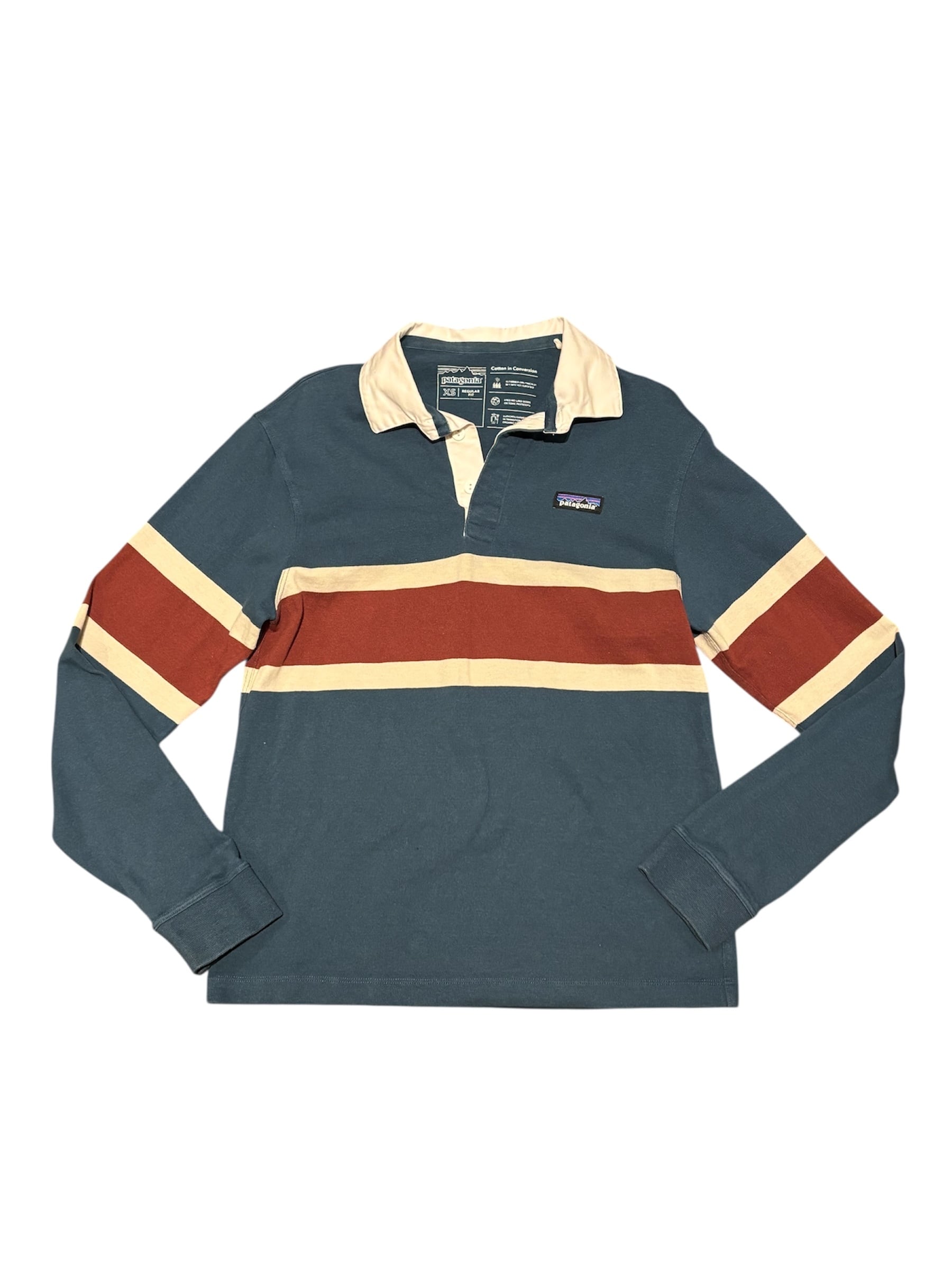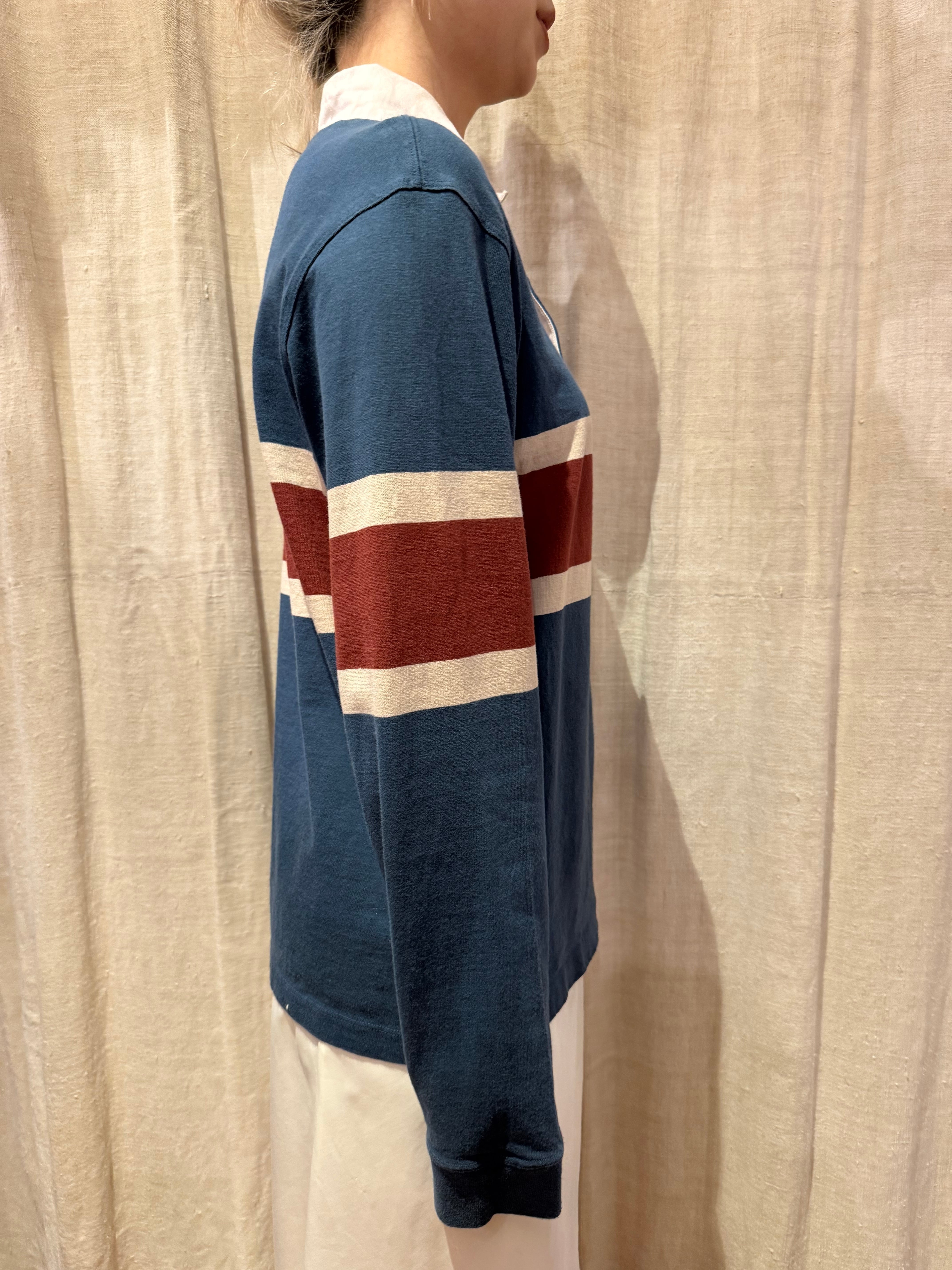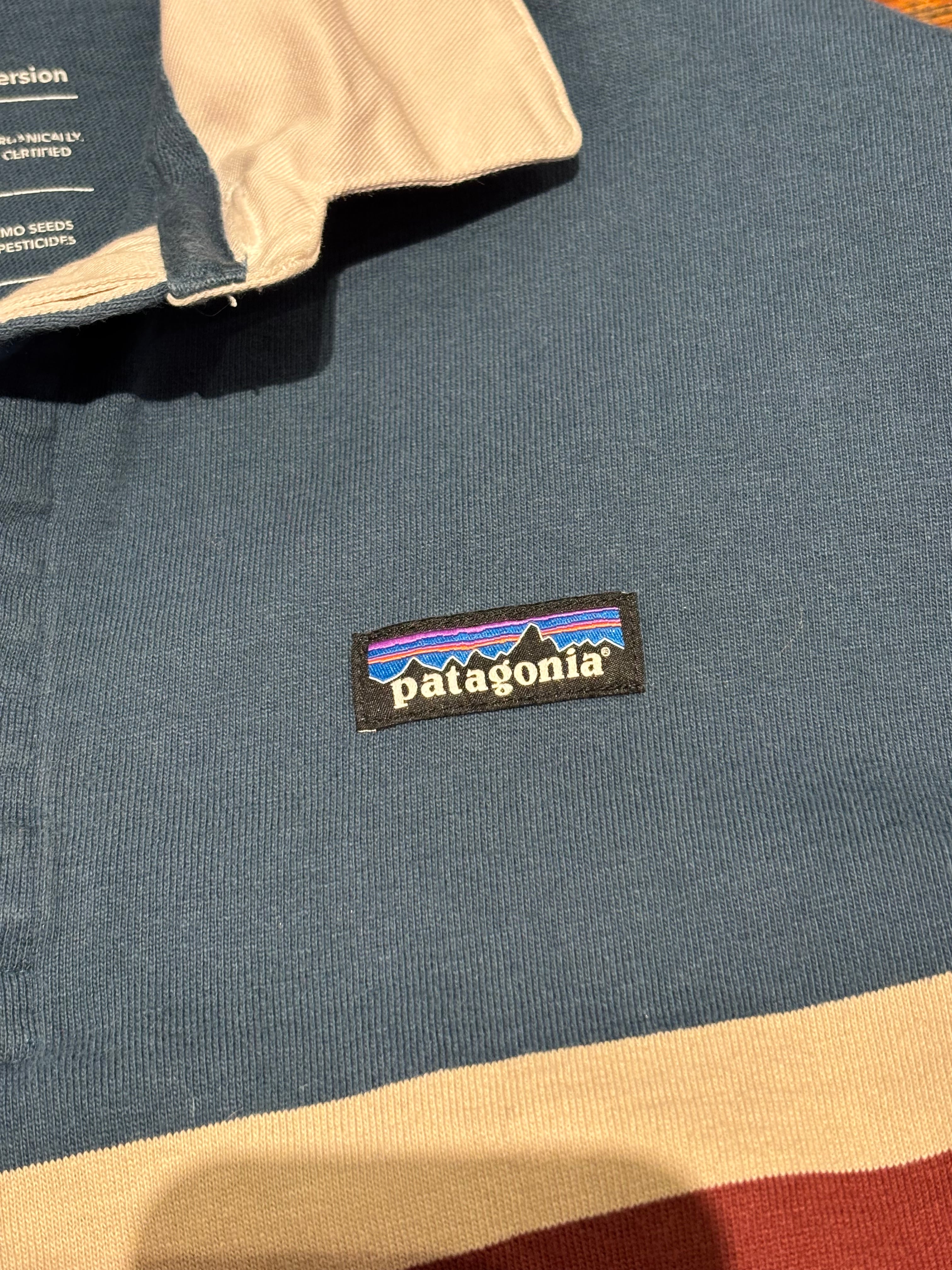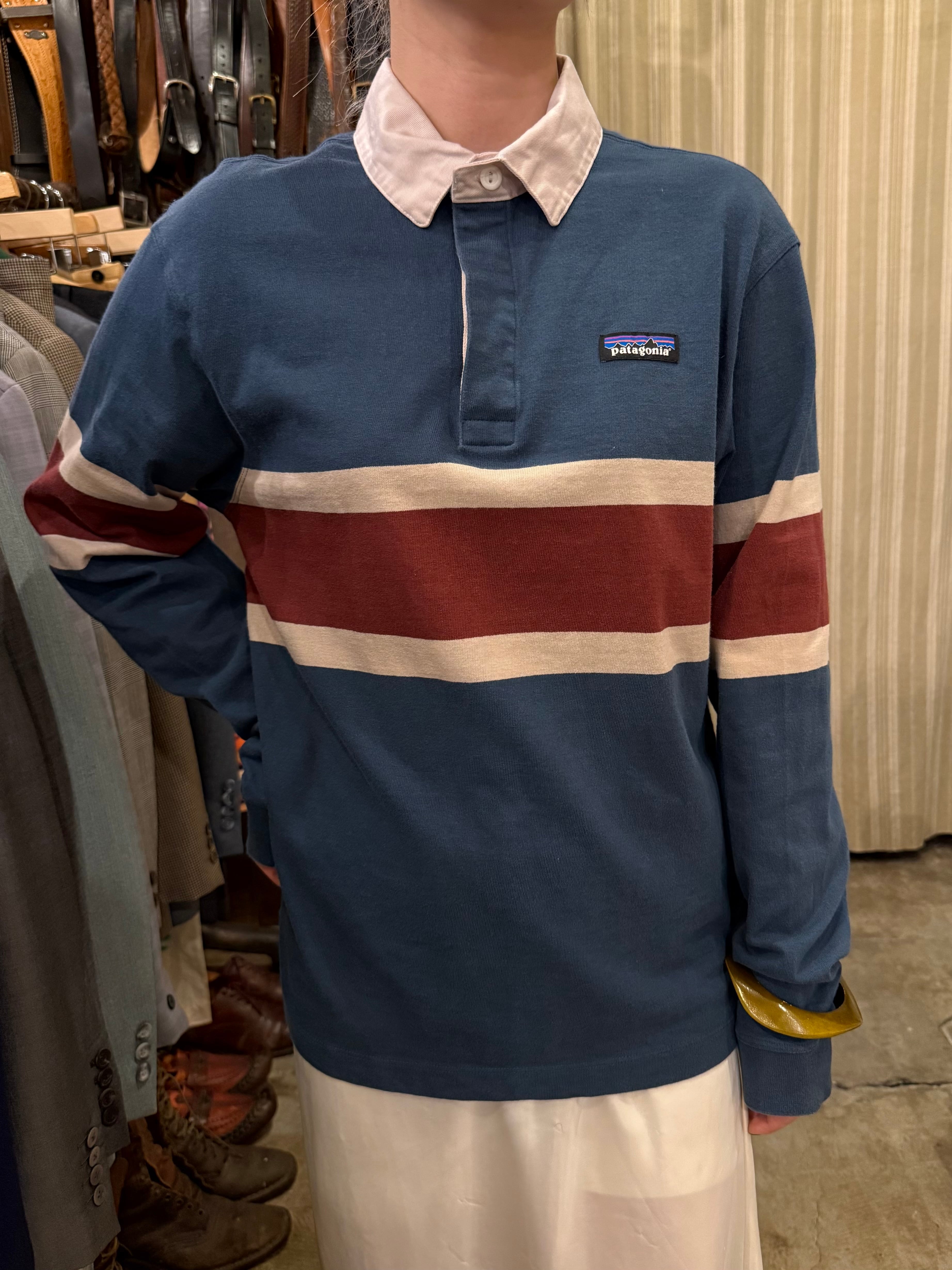 Patagoniaのラガーシャツ。くすみのあるブルーとエンジ色の配色が可愛らしく、コットンなので着心地も抜群です。ベージュやブラウンと赤カラーと合わせても可愛らしくウエストに巻いたりするだけでもさまになるアイテムです。
