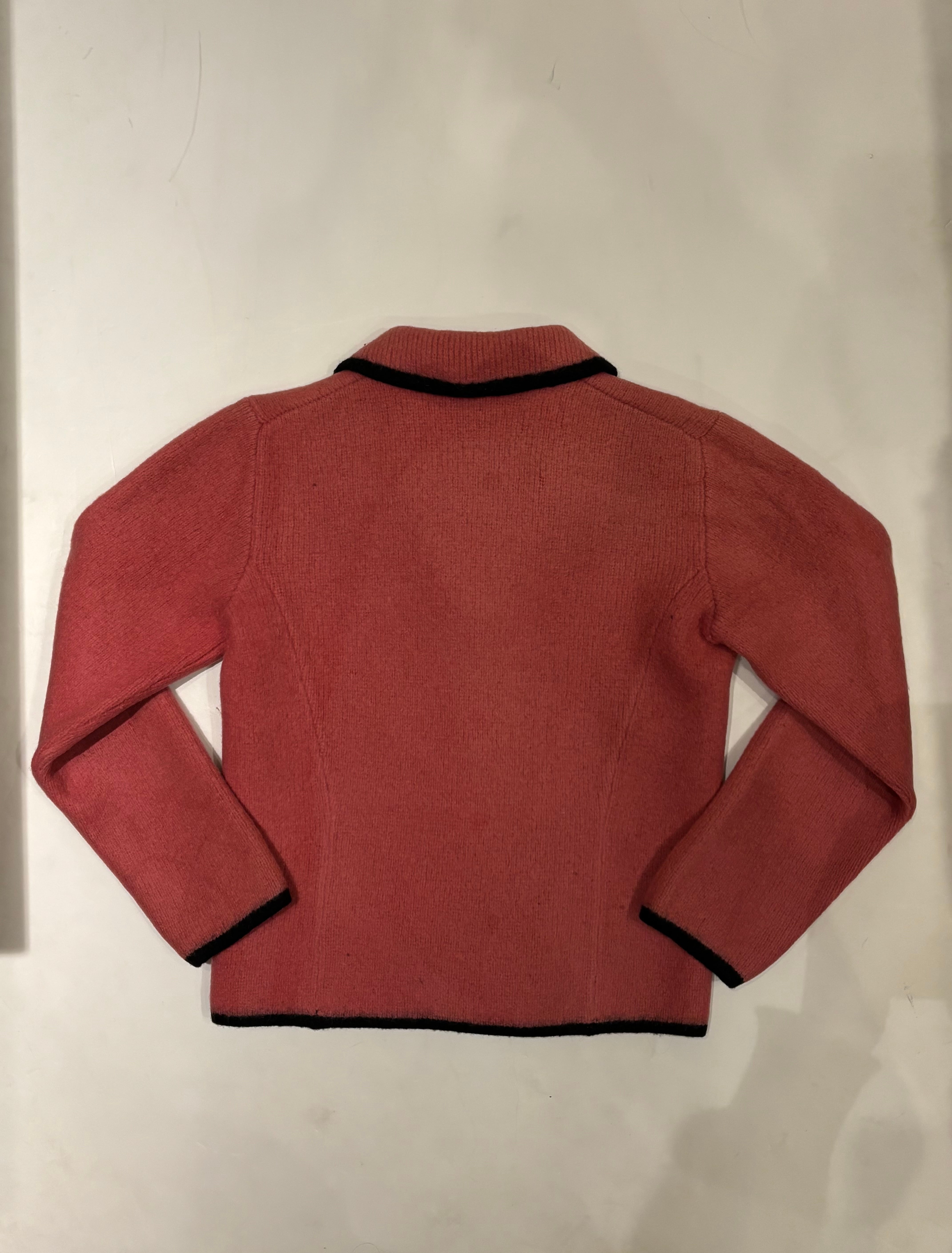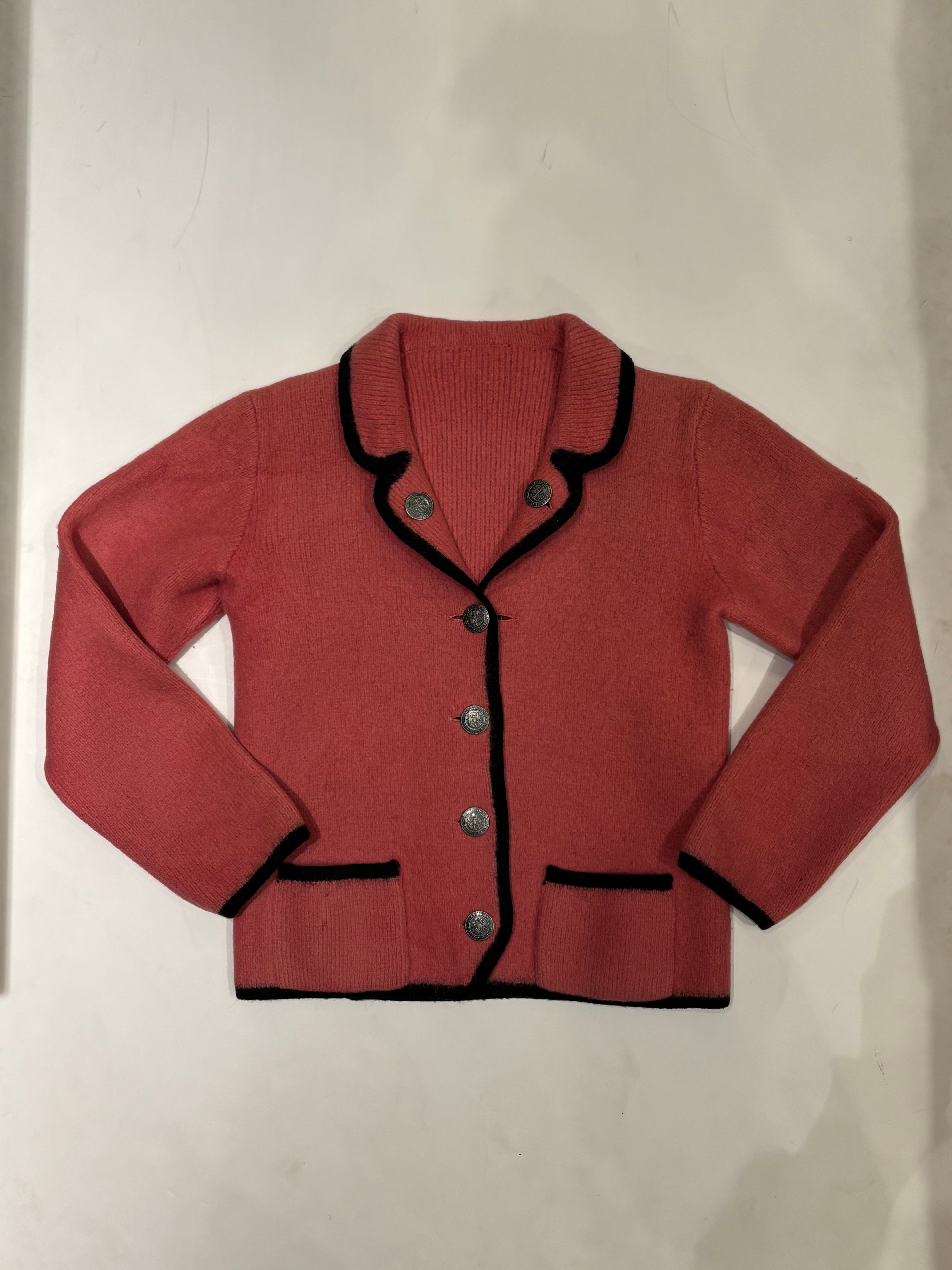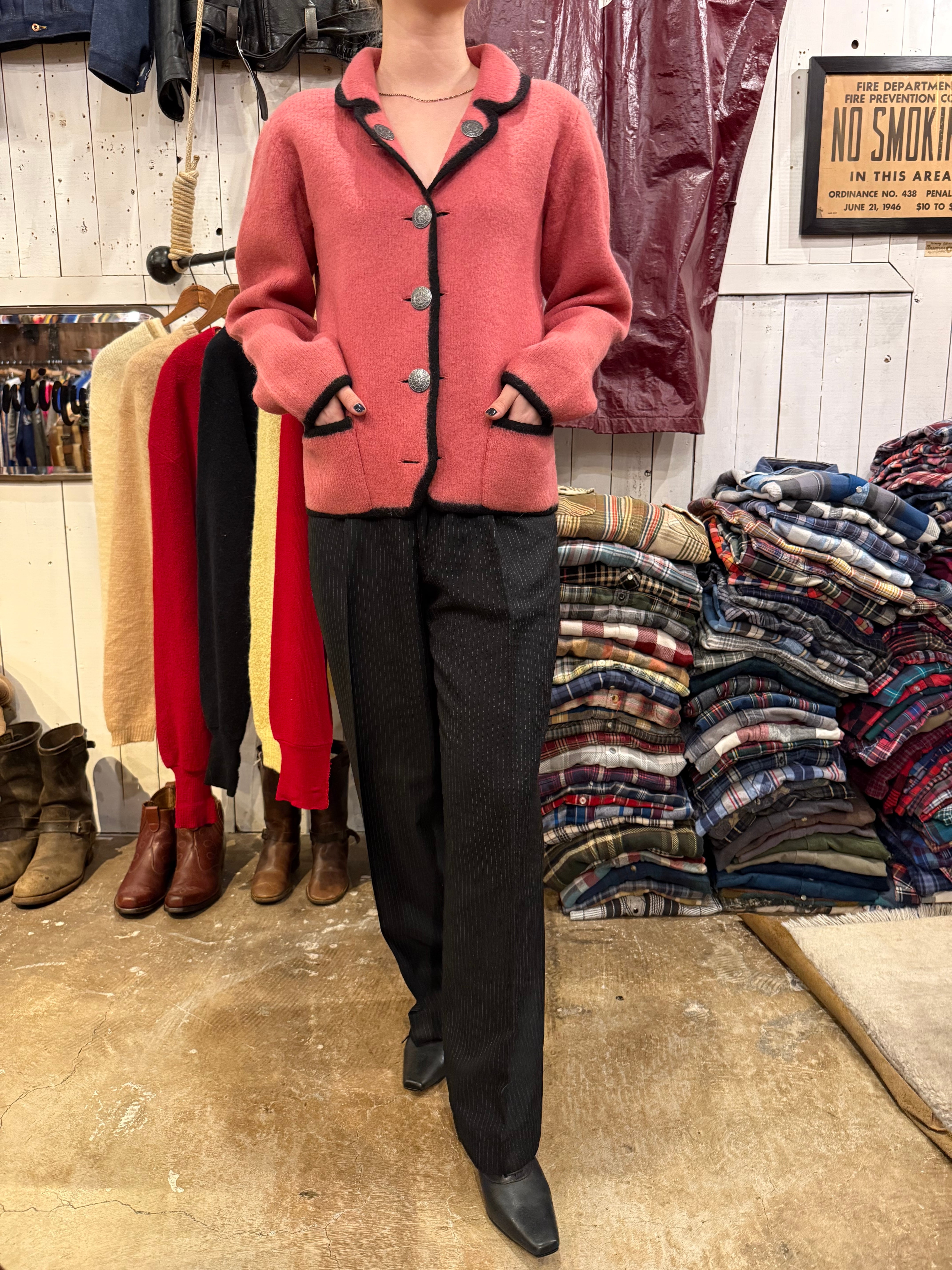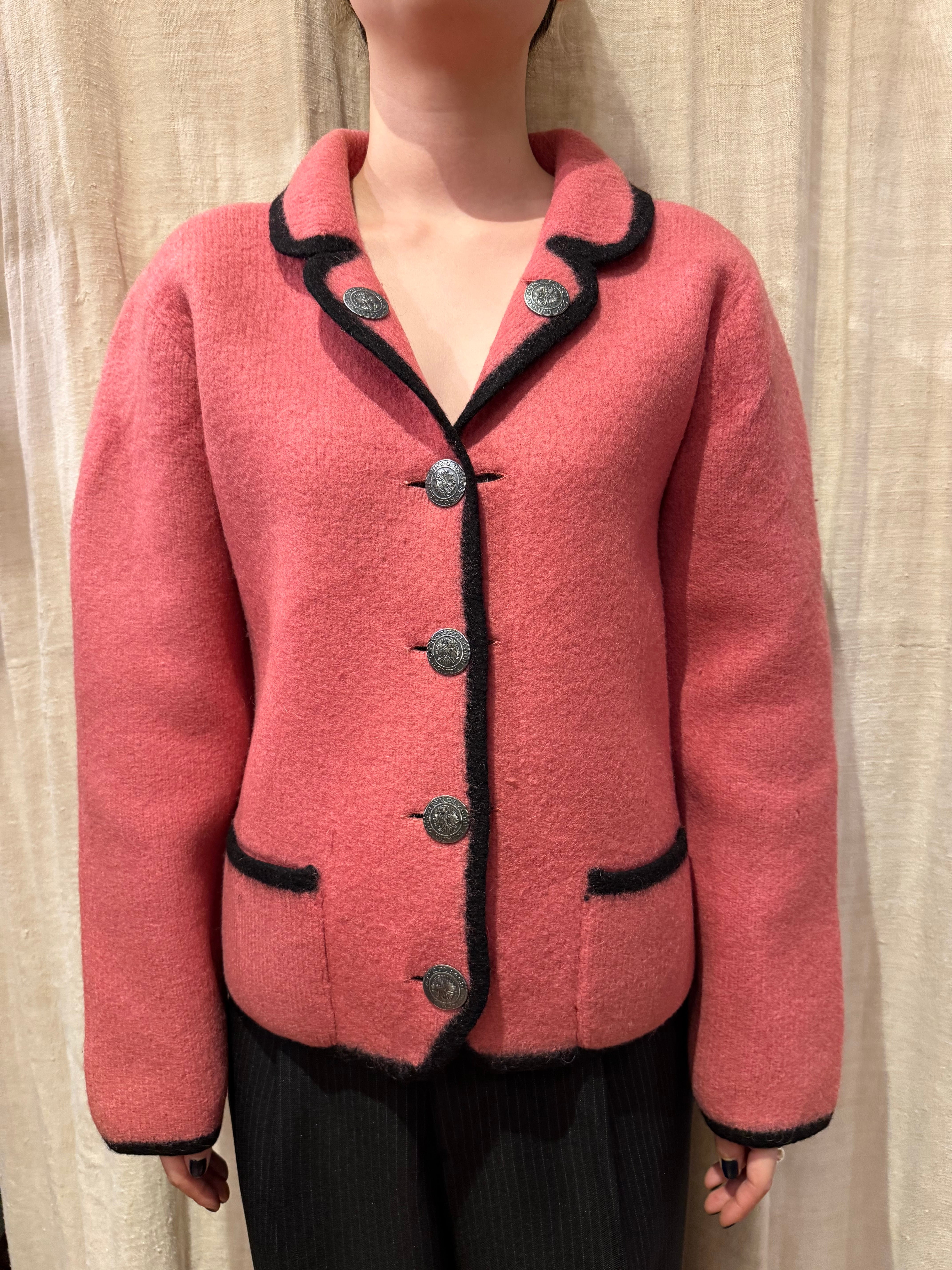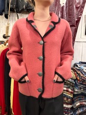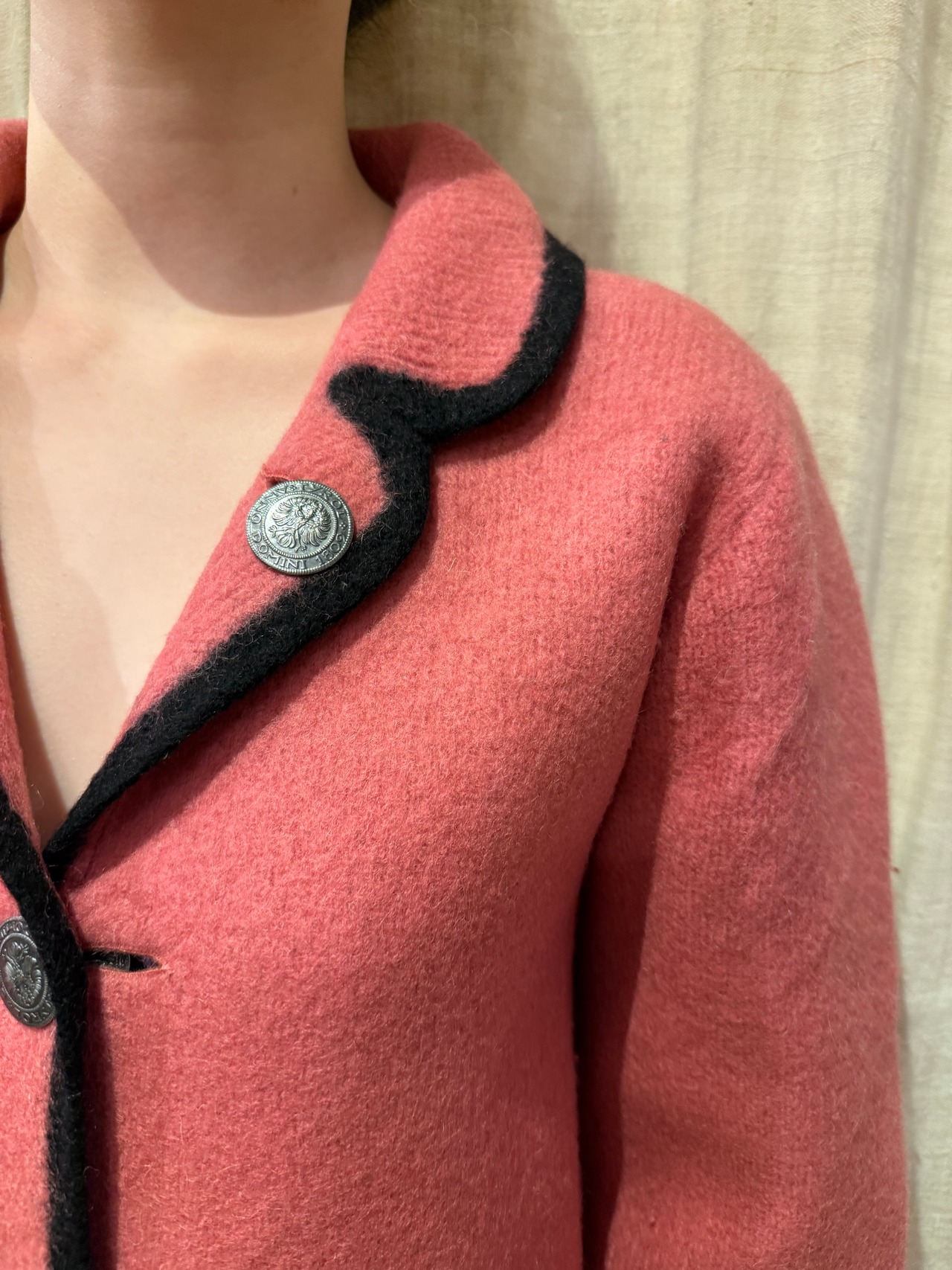 ウール素材でふわっとした質感。ビビットピンクでブラックのパイピングが入っているのが可愛らしいカラーです。ボタンはチロルボタンが使われていて、トップボタンは裏表についていてデザイン性も◎ボタンも厚めの生地なのでこれからの季節にアウターとしてぴったりです。