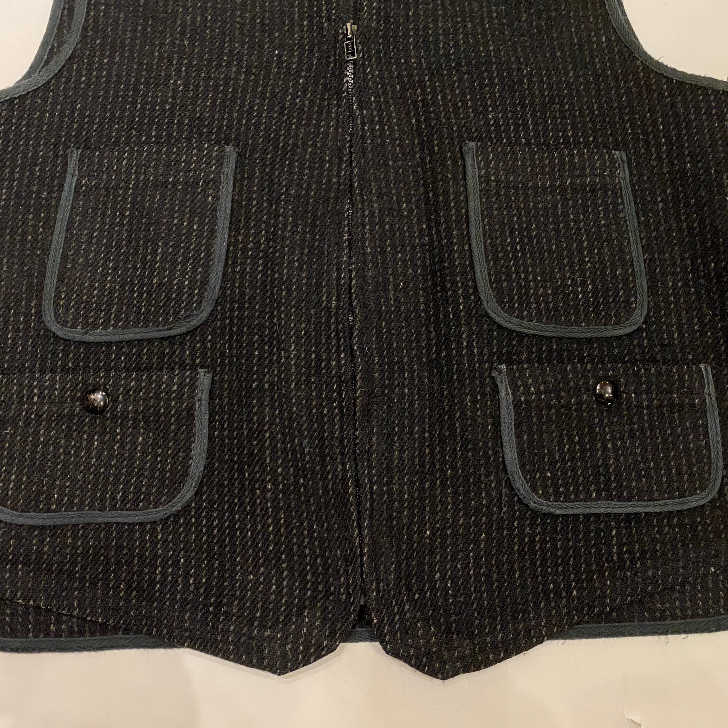 エディーバウアーのウールベストになります。ブラックにホワイトのドットストライプ柄です。フロントはYKKジッパーで4つポケット仕様、針刺しタイプのバックストラップが付く、クラシックなワークベストスタイルが格好良いです。是非お気に入りのカットソーやシャツと合わせてお楽しみください。ジャケットのインナー使いにも良いと思います。※両脇下パイピング部分に擦れ有り。写真12枚目参照