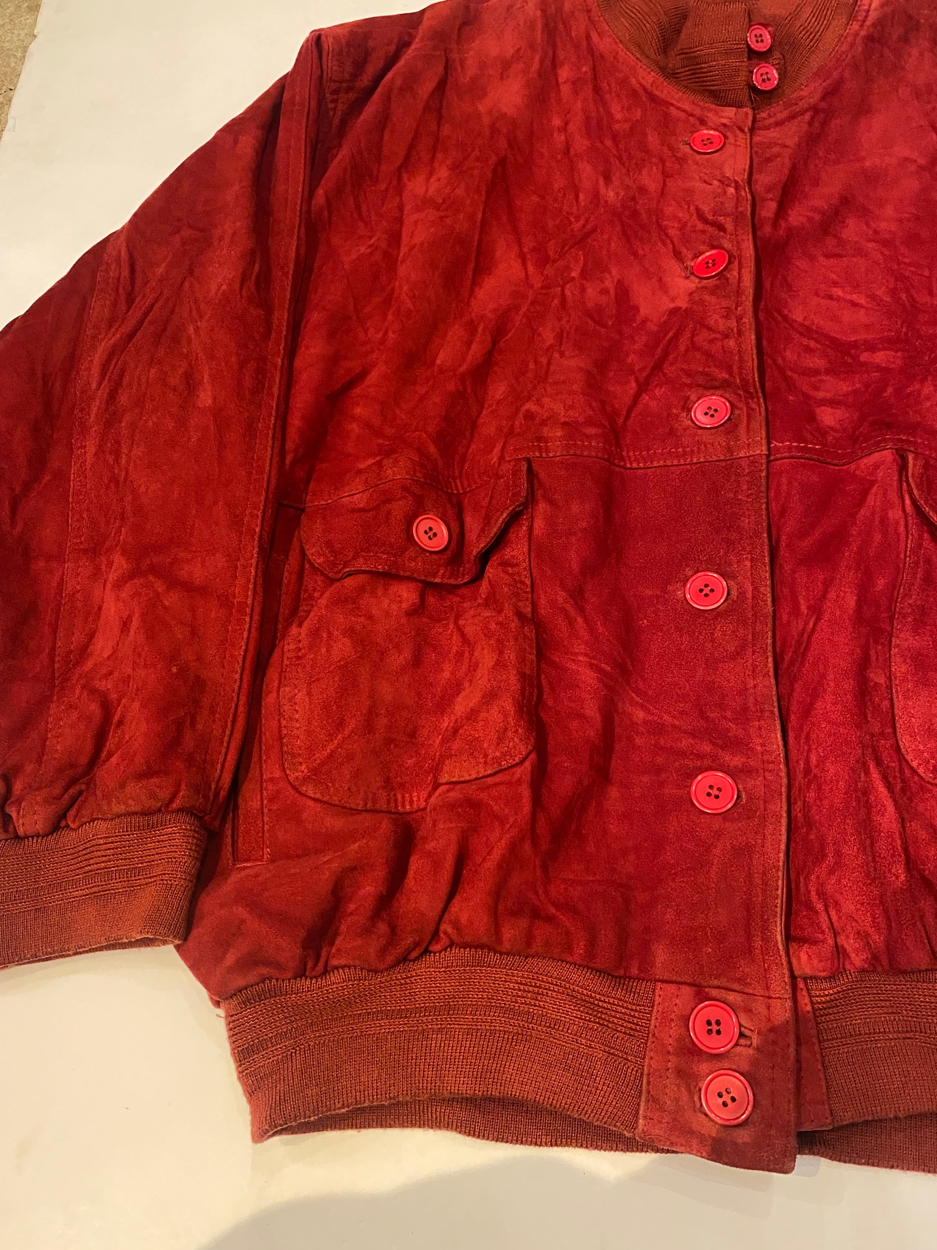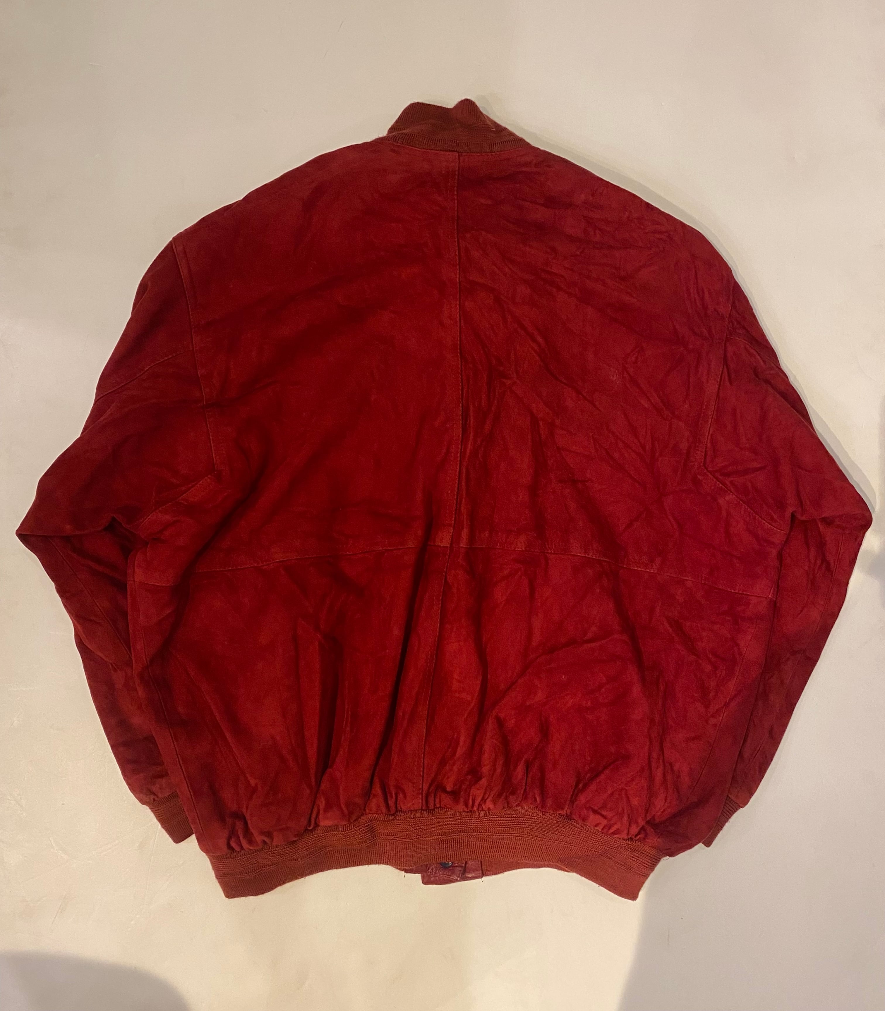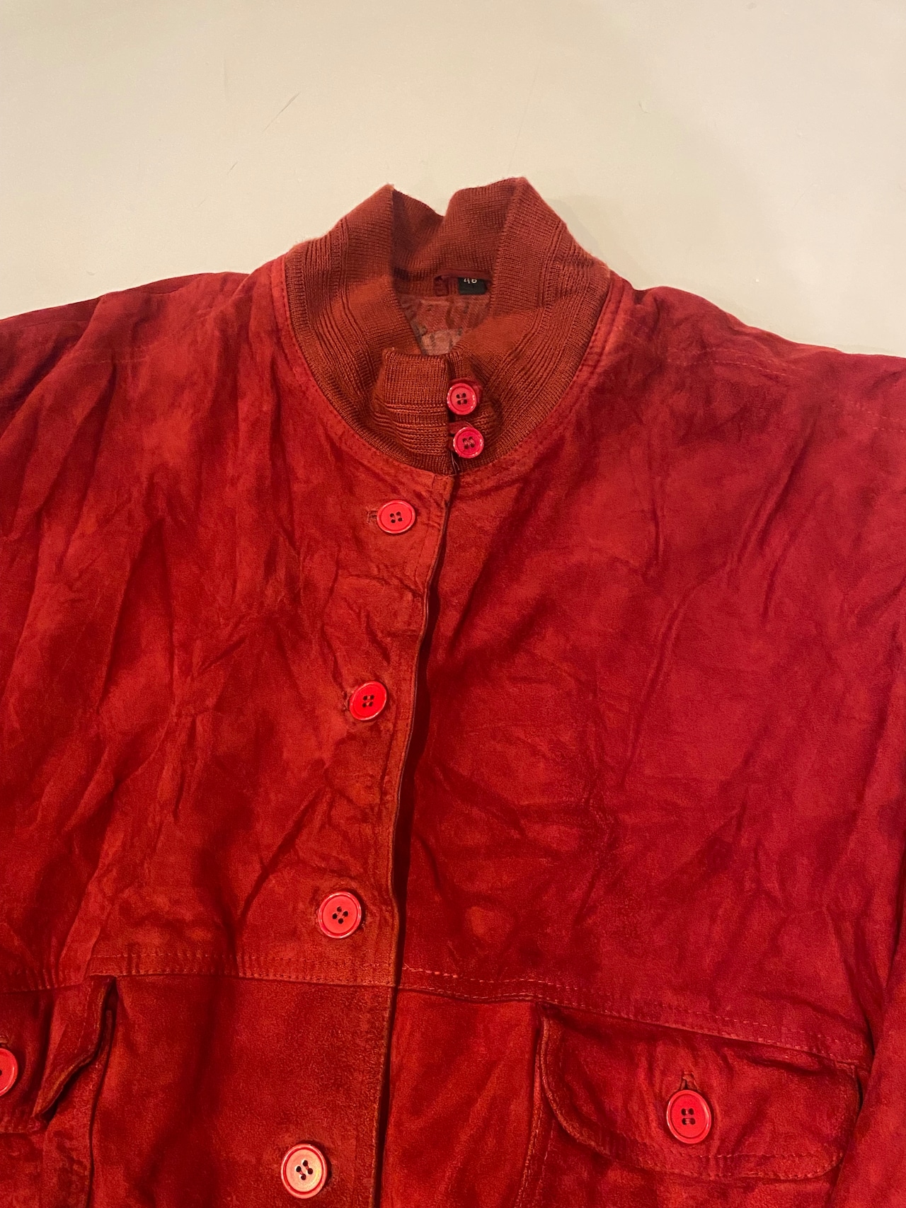 柔らかいヌバックレザーです。柔らかいですので、肩は大きいですが、綺麗に落ちるのでシルエットは綺麗です。