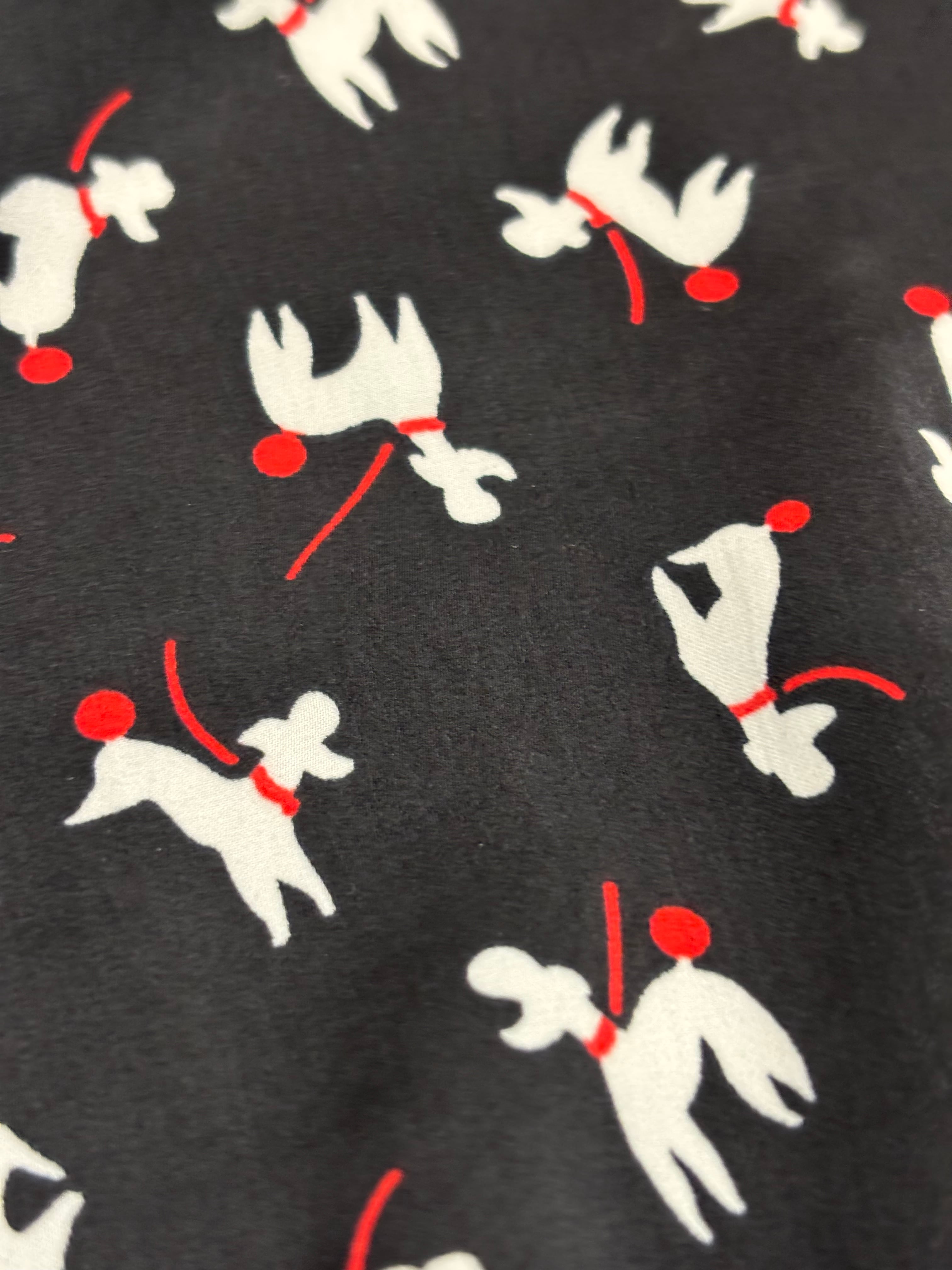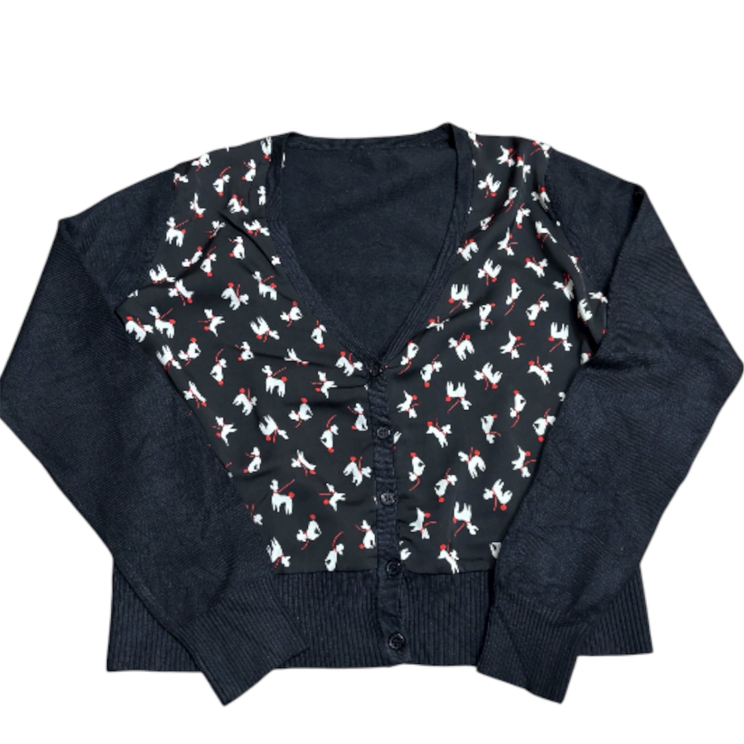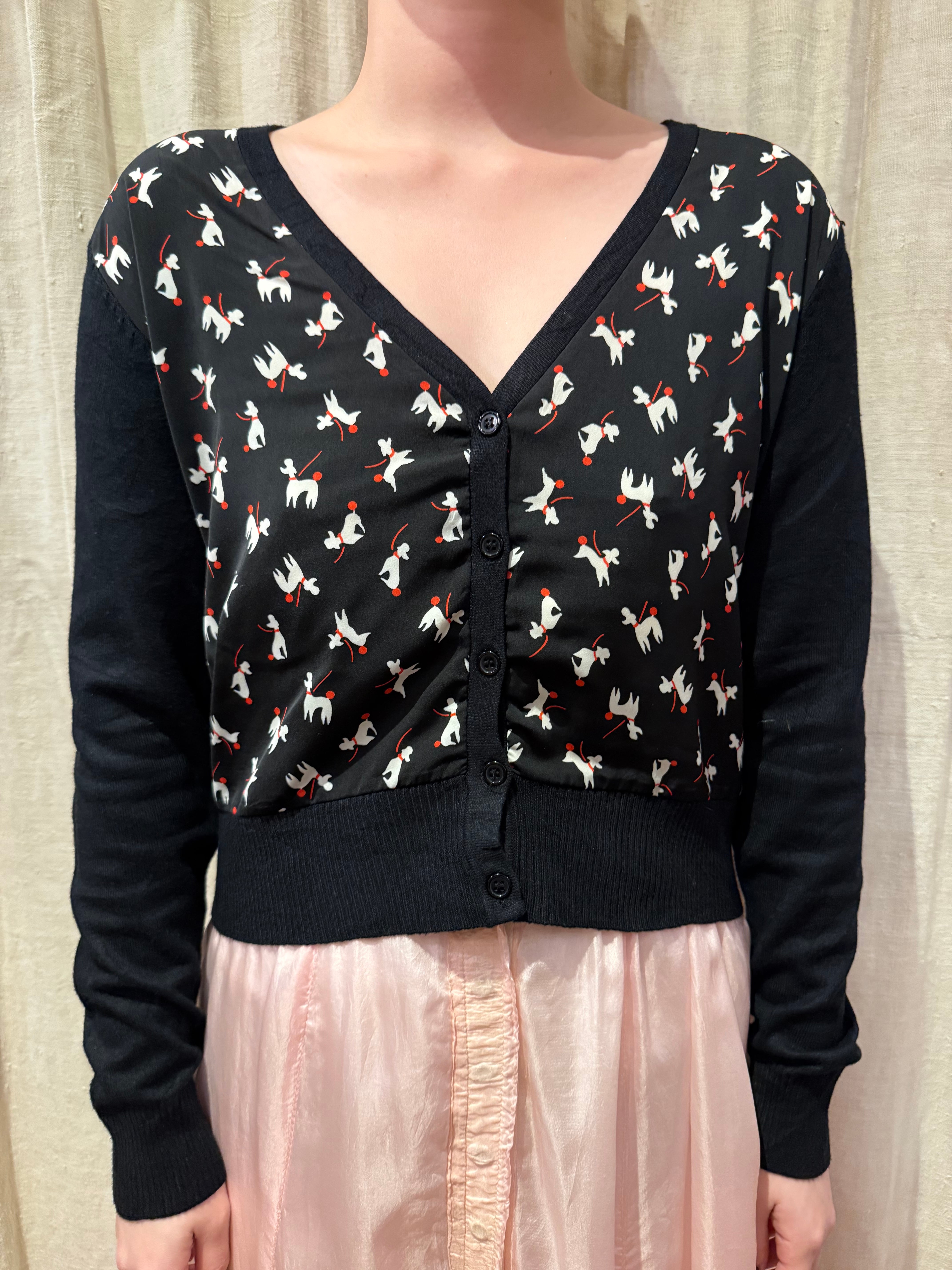 尻尾の赤い、オシャレな犬のプリントがされたカーディガンです。程よいサイズ感に短めの丈、大きくあいたVネックでスッキリと着用できます。ポップで個性的な柄ですが、ベースがブラックなので派手すぎない印象で、合わせやすいです。