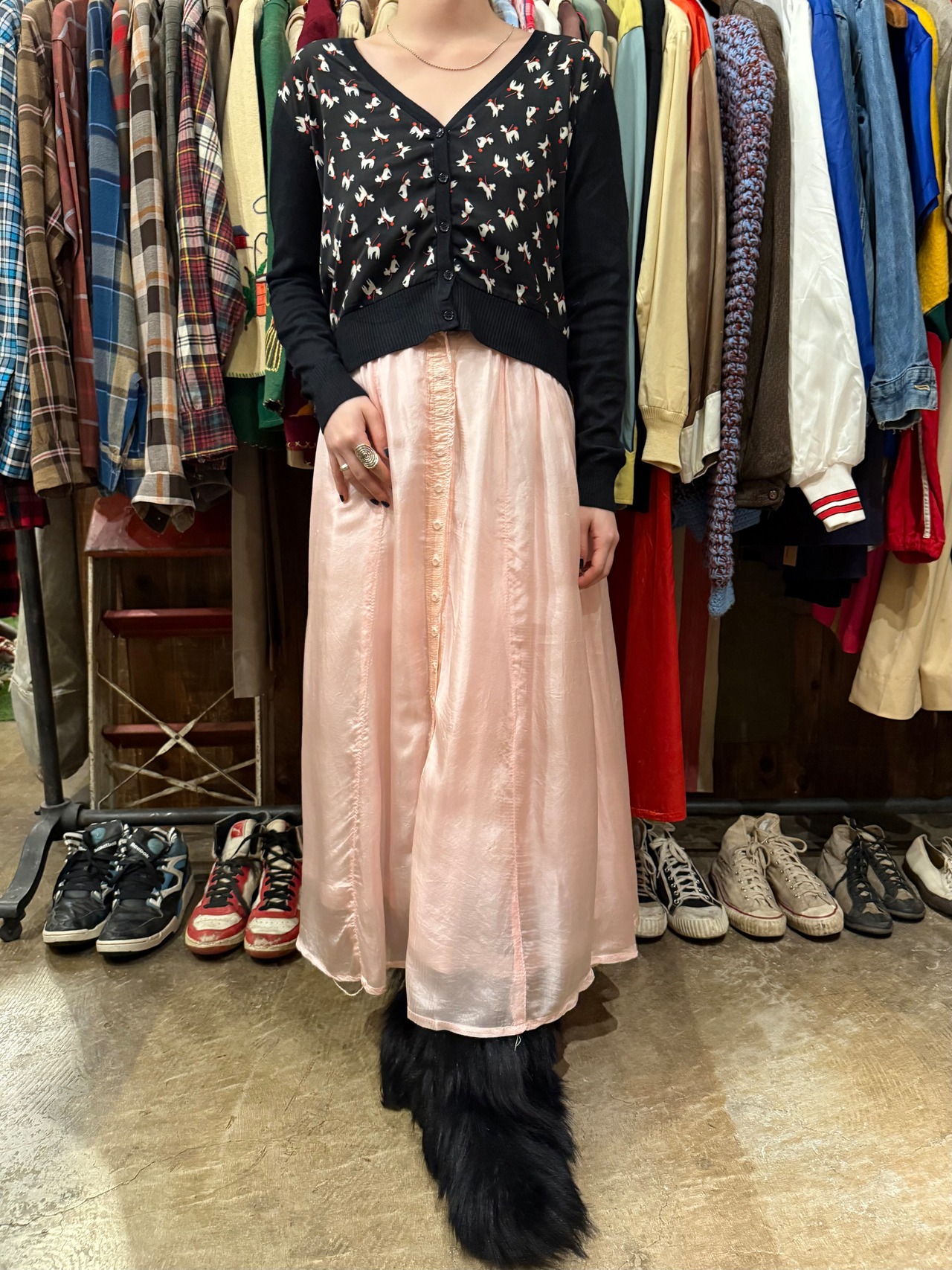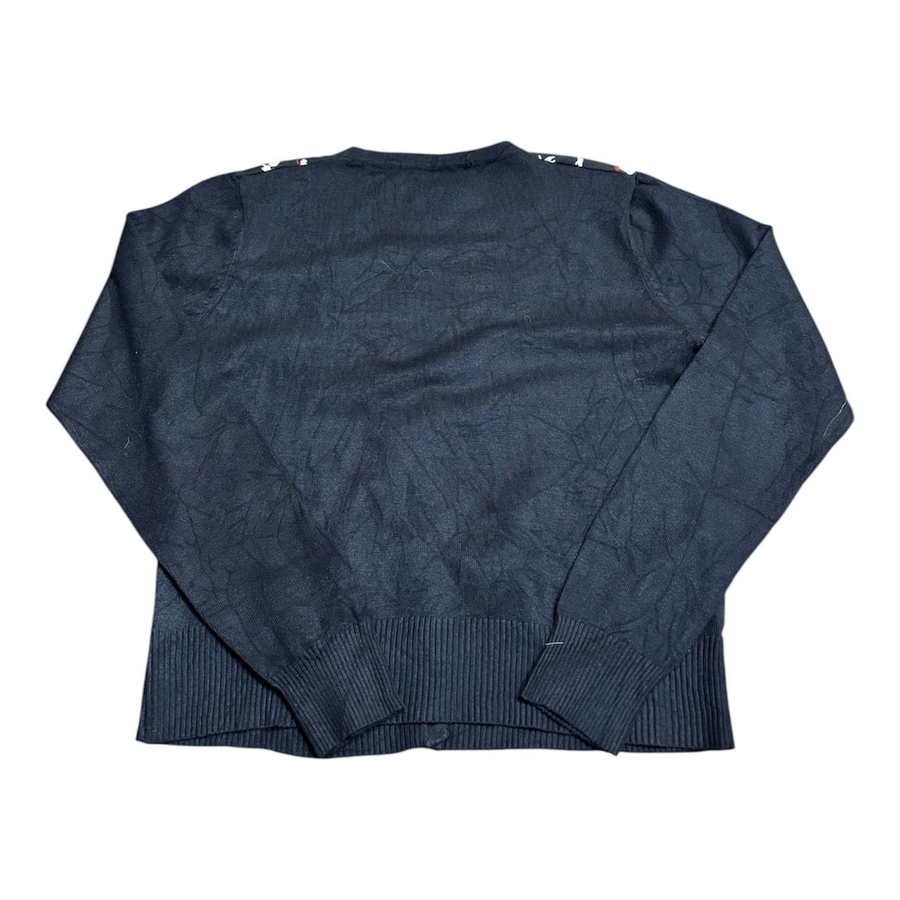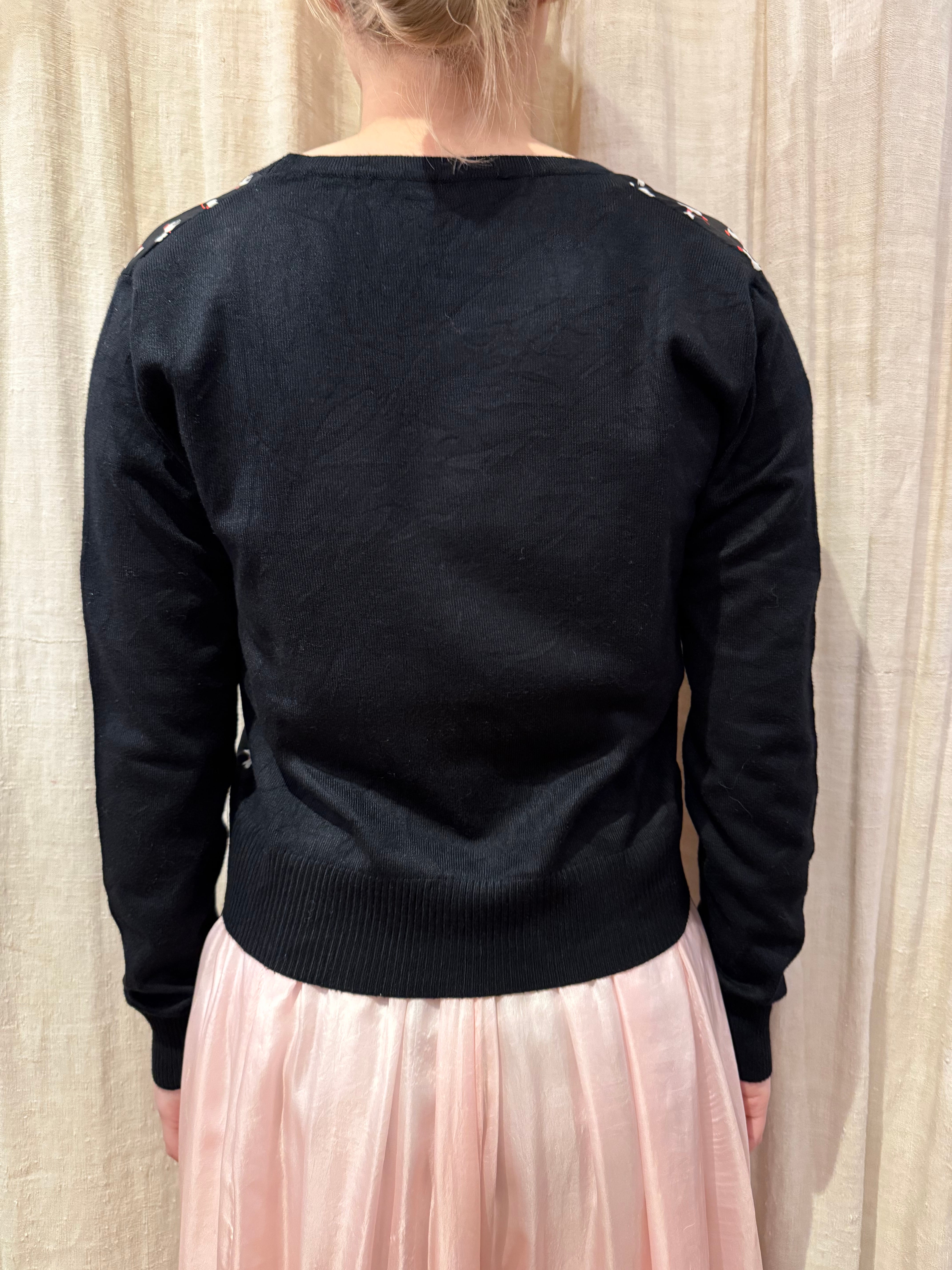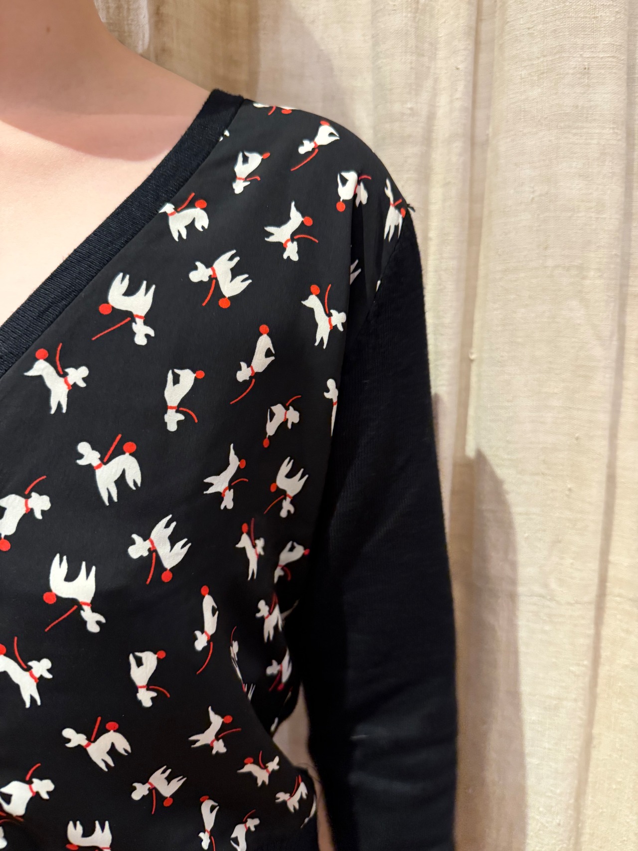 尻尾の赤い、オシャレな犬のプリントがされたカーディガンです。程よいサイズ感に短めの丈、大きくあいたVネックでスッキリと着用できます。ポップで個性的な柄ですが、ベースがブラックなので派手すぎない印象で、合わせやすいです。