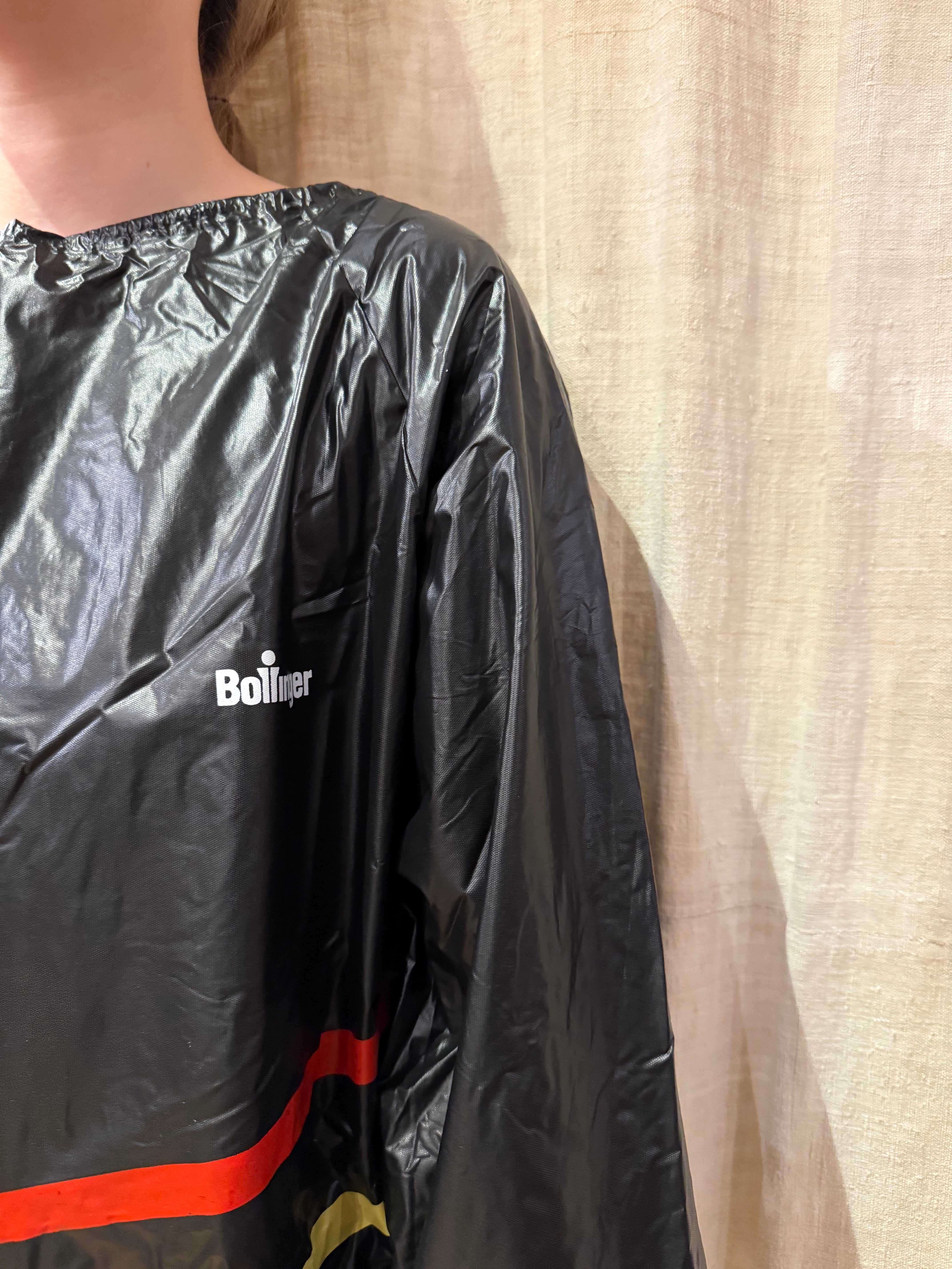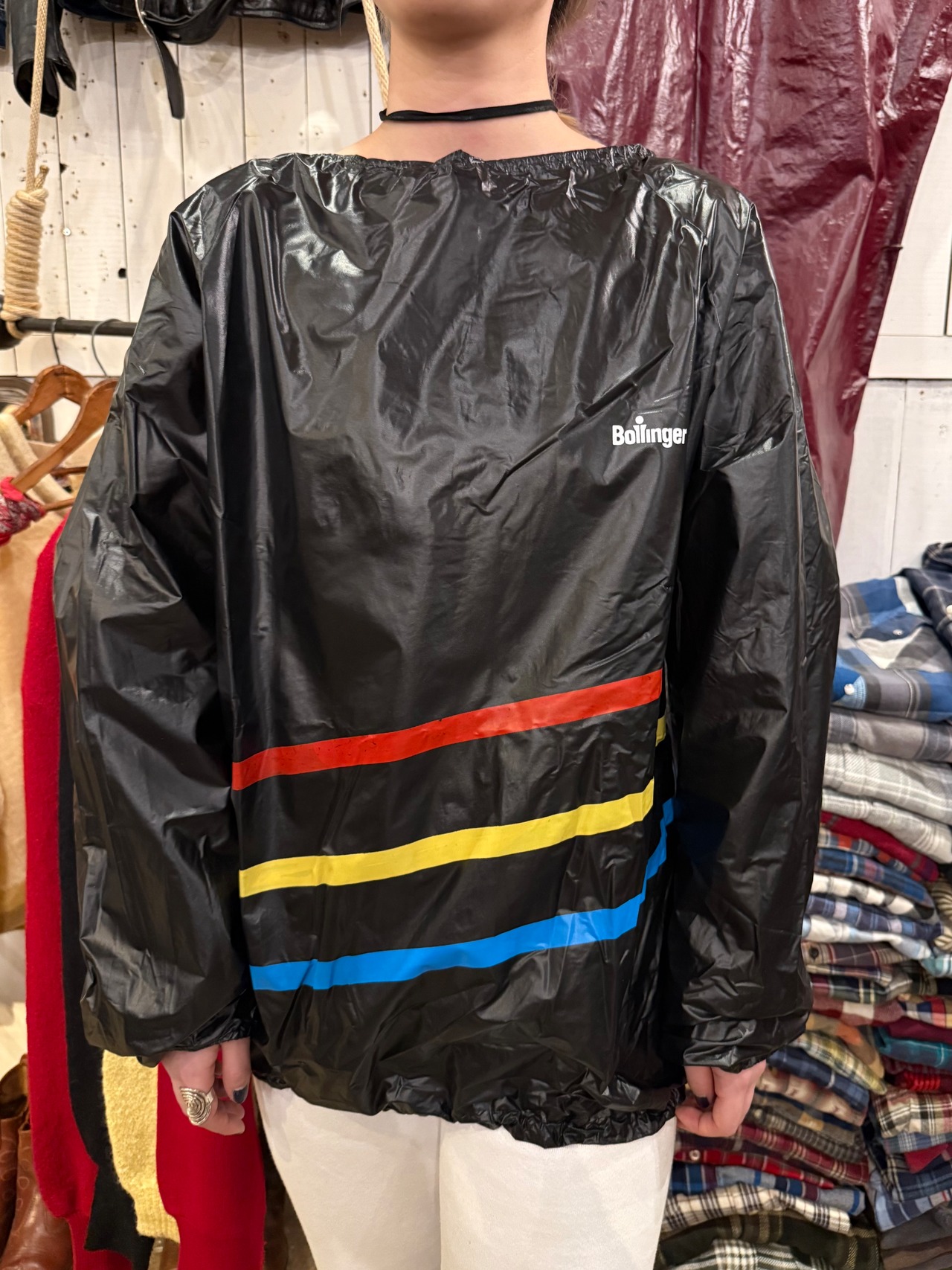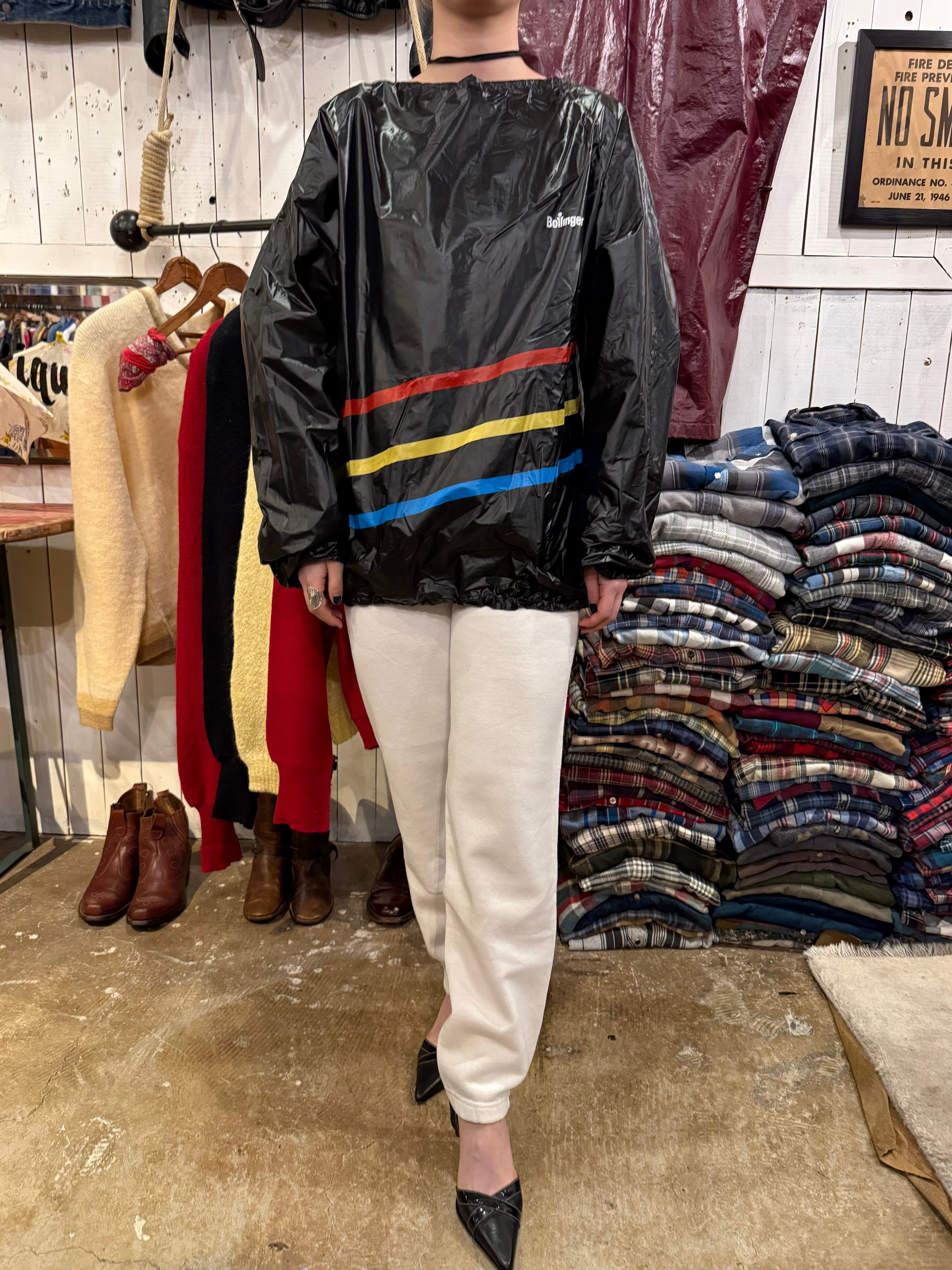 ビニール素材のプルオーバーで、存在感があります。前のウエストあたりに入っている赤・黄・青のラインが、他アイテムと合わせた時にビニールの異質感との調和を取ってくれる気がします。中もしっかり着込める大きめのサイズ感です。