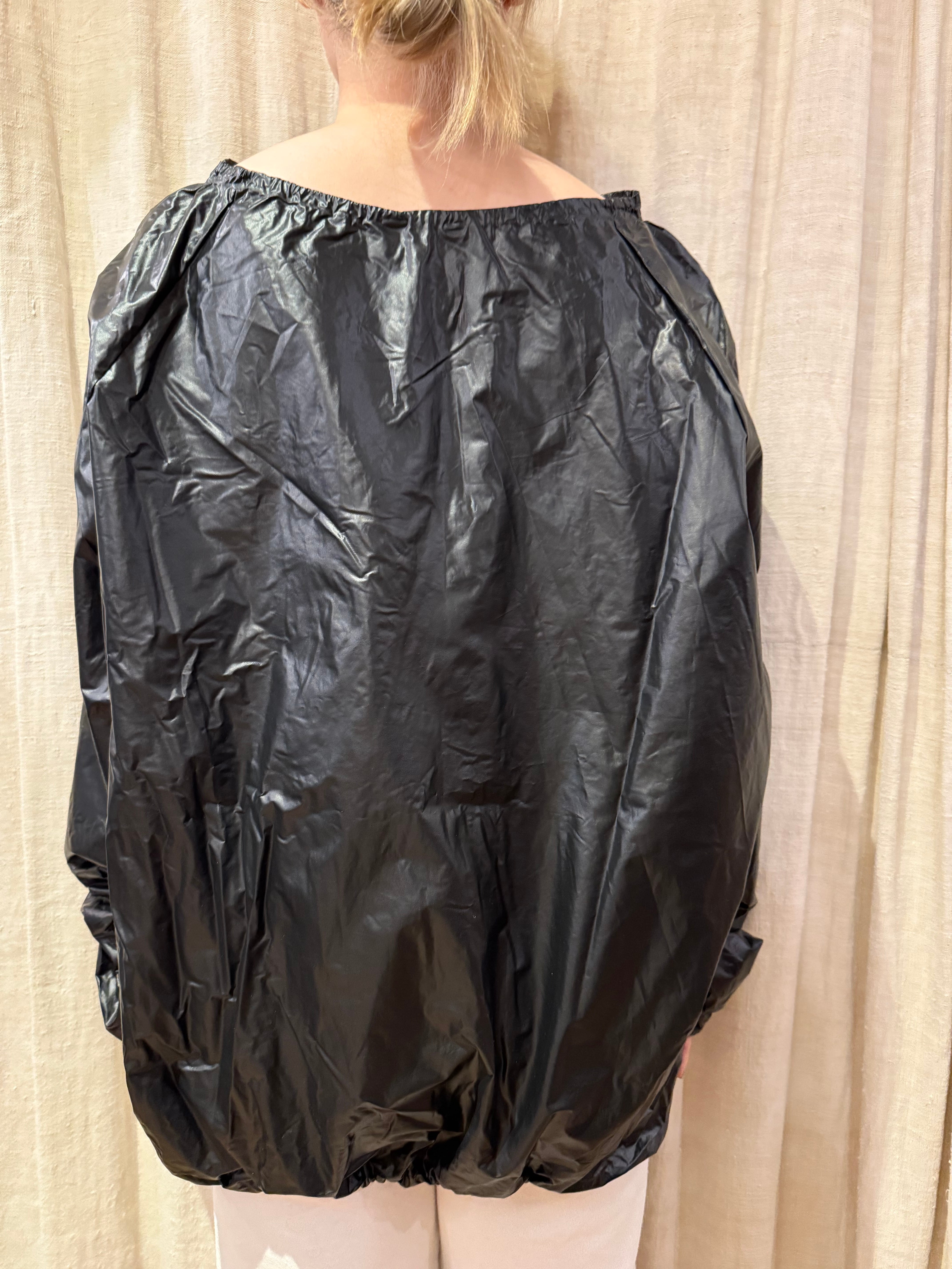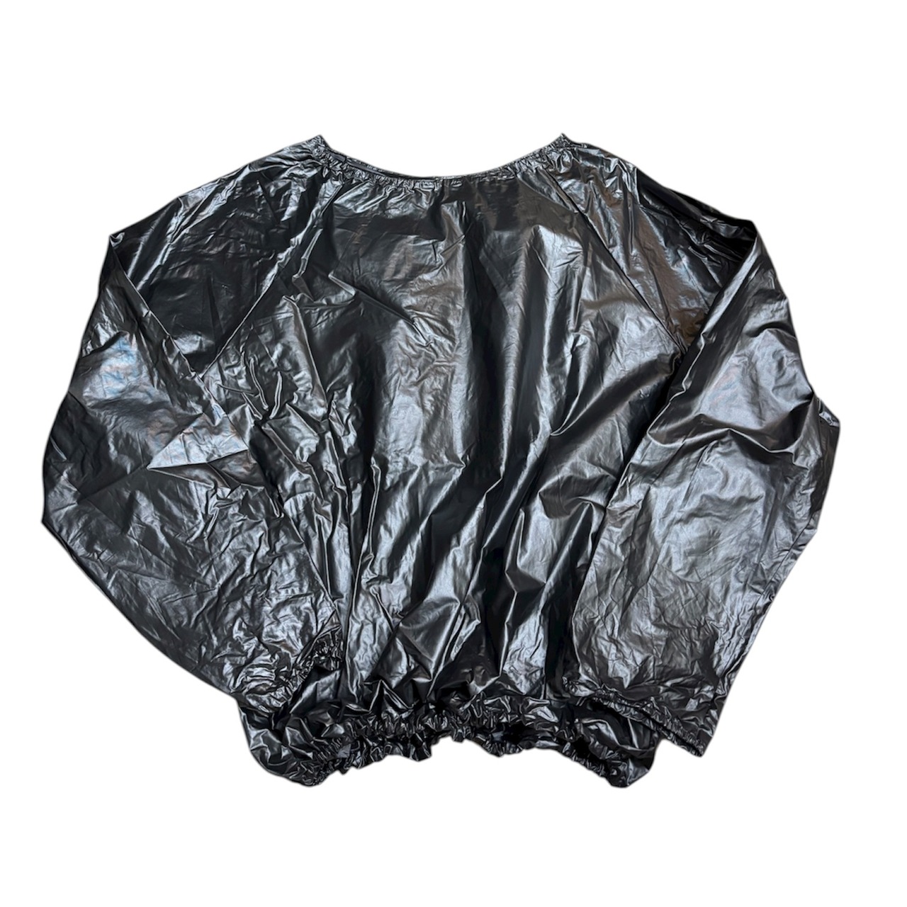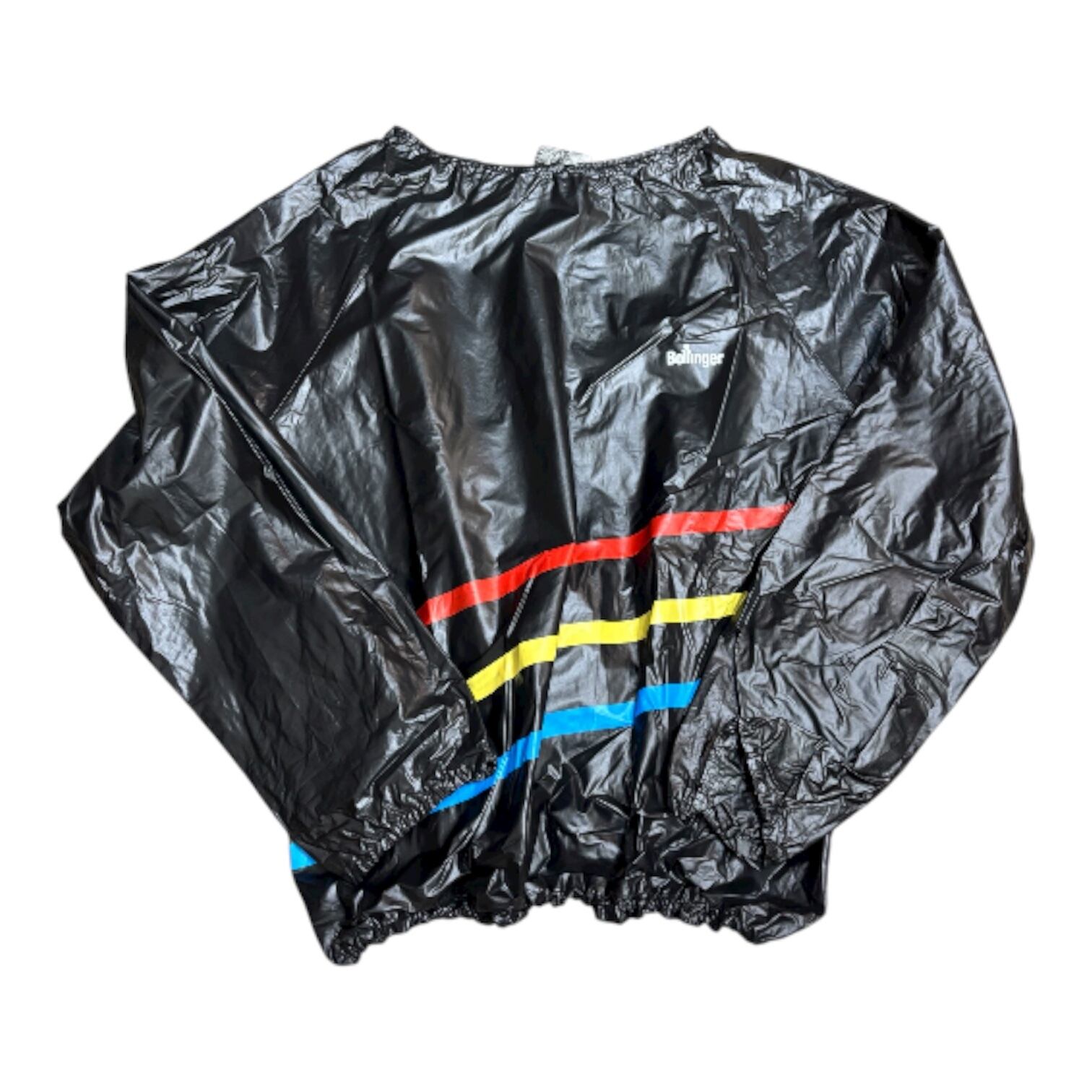 ビニール素材のプルオーバーで、存在感があります。前のウエストあたりに入っている赤・黄・青のラインが、他アイテムと合わせた時にビニールの異質感との調和を取ってくれる気がします。中もしっかり着込める大きめのサイズ感です。