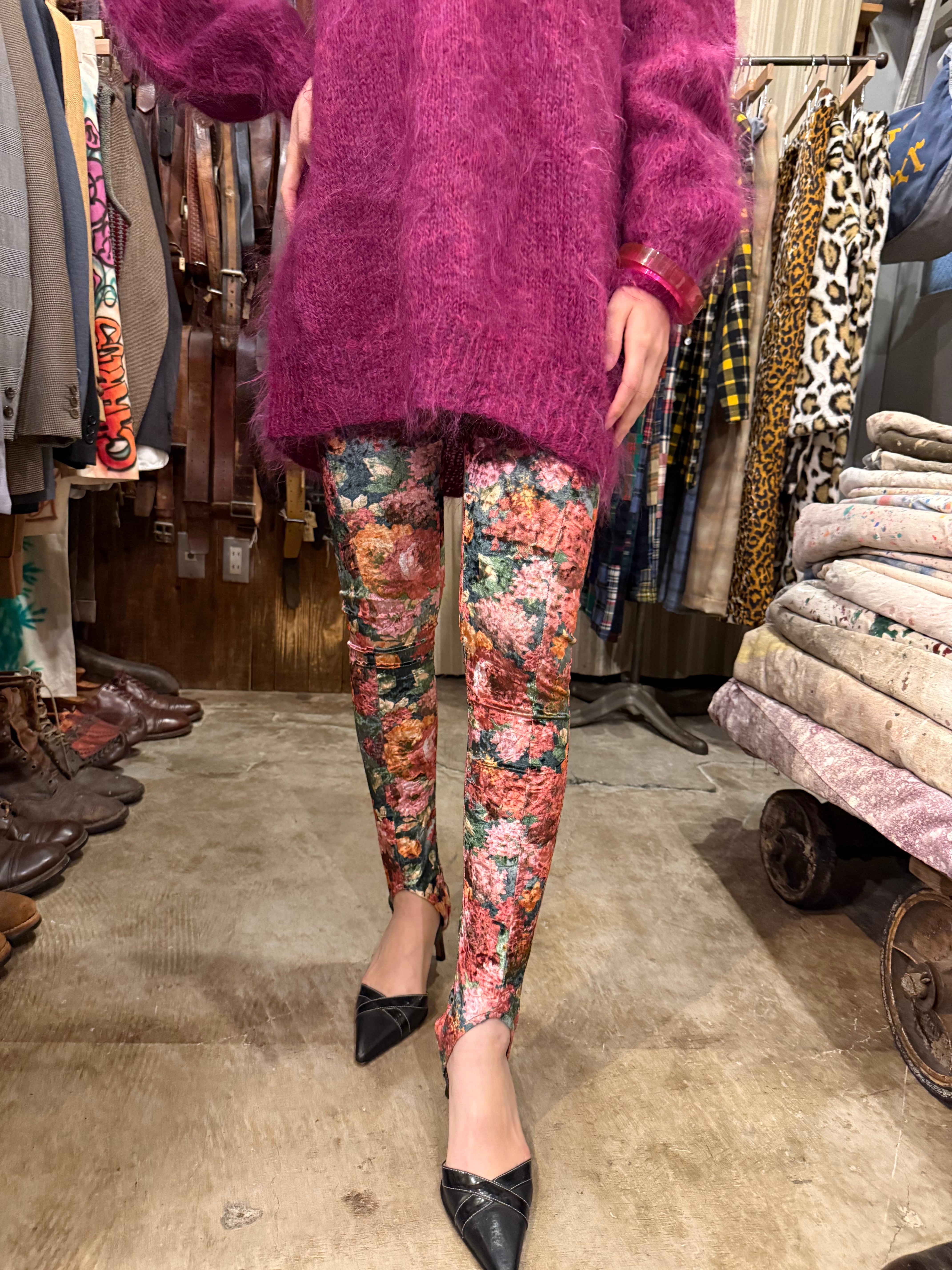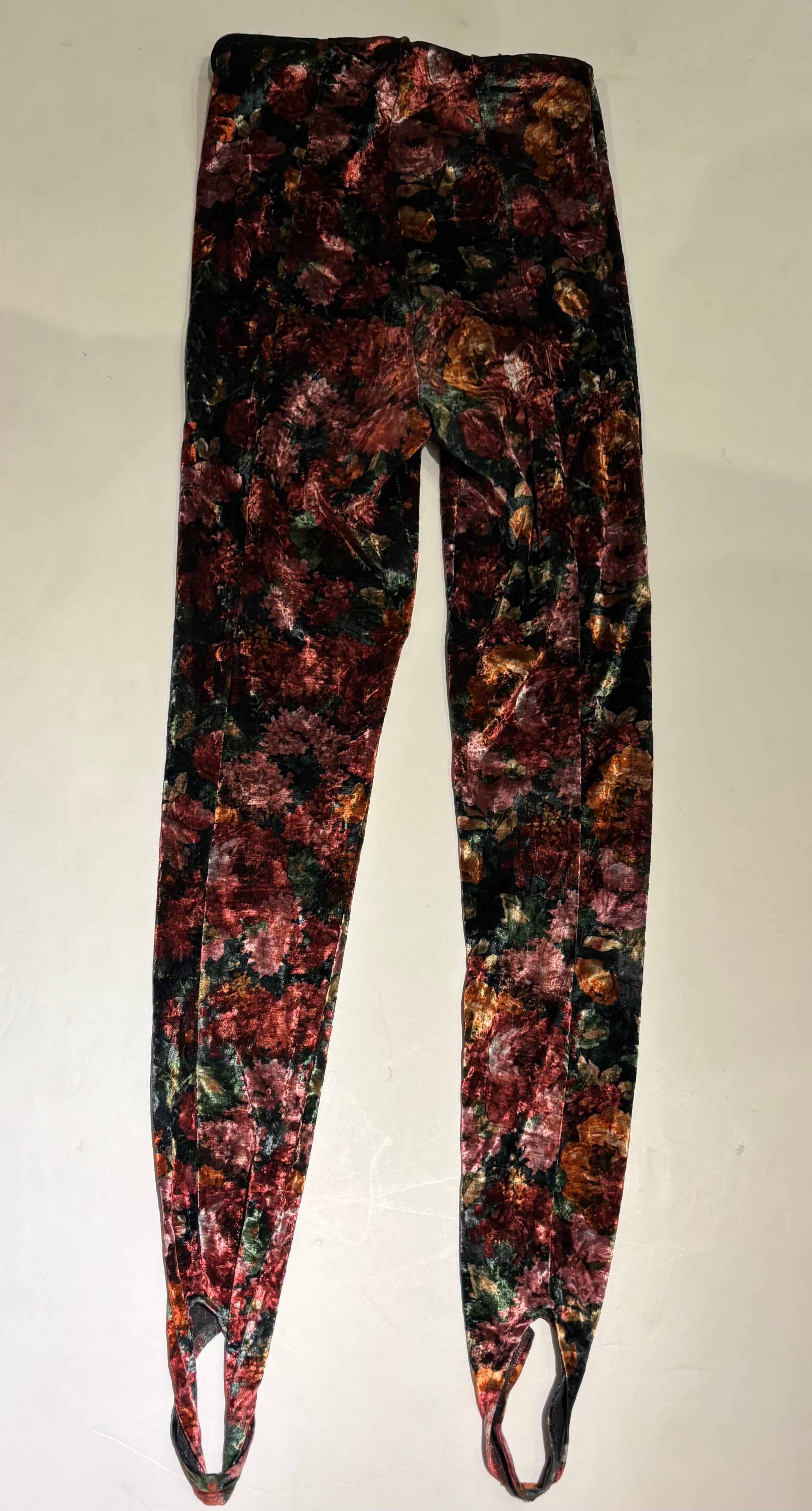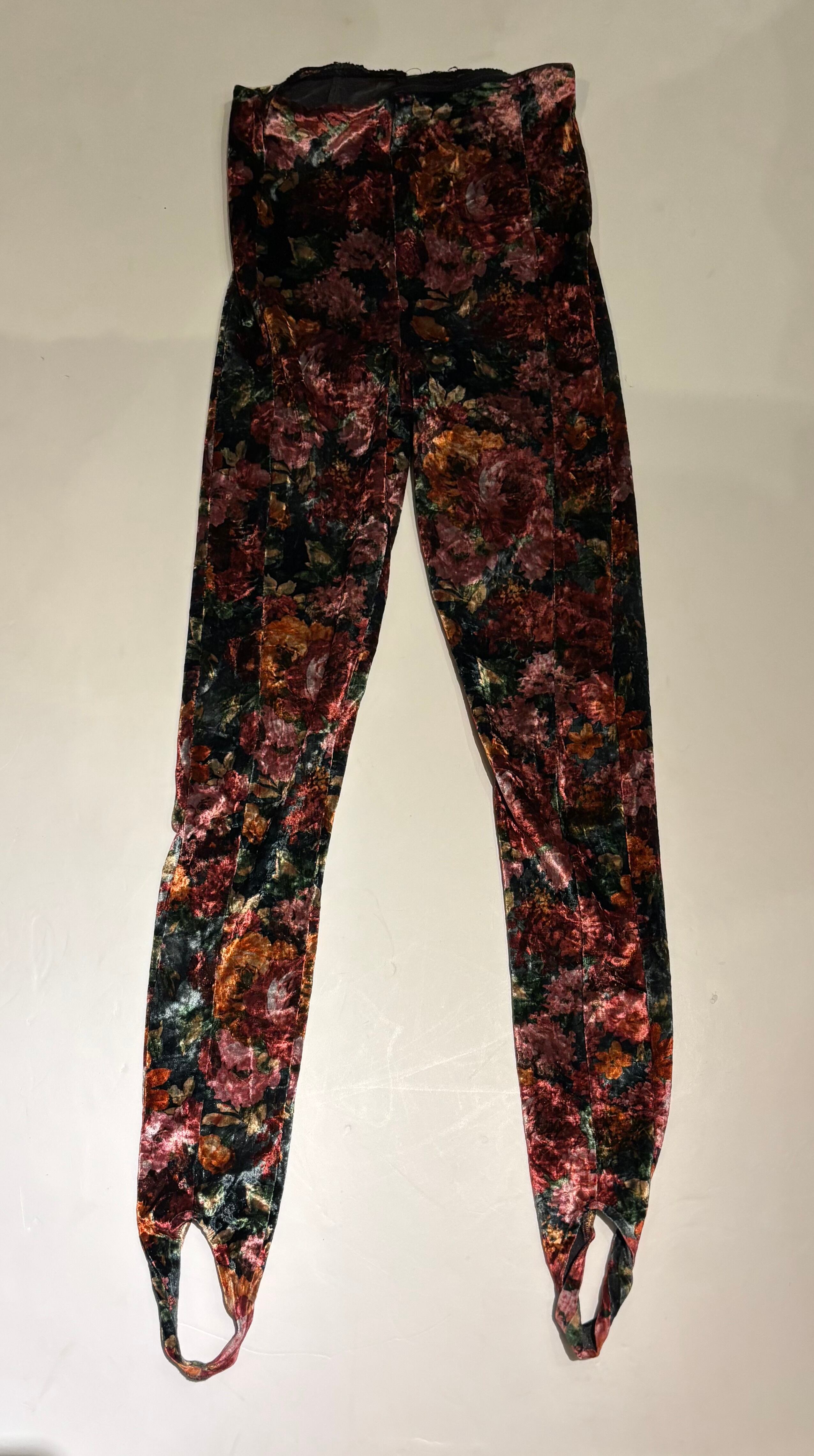ベロア素材のストラップ仕様のパンツです。花の総柄で派手さもありつつ、深めのトーンのピンクカラーベースなので合わせやすいです。レギンスのようにフィットし、肌触りの良い履き心地です。ストラップ仕様なので、着用画像のようにヒールと合わせるスタイルもオススメで、パンツなどの下に忍ばせて裾からヒールと共に少し見えるのもエッジが効いて可愛いです♩