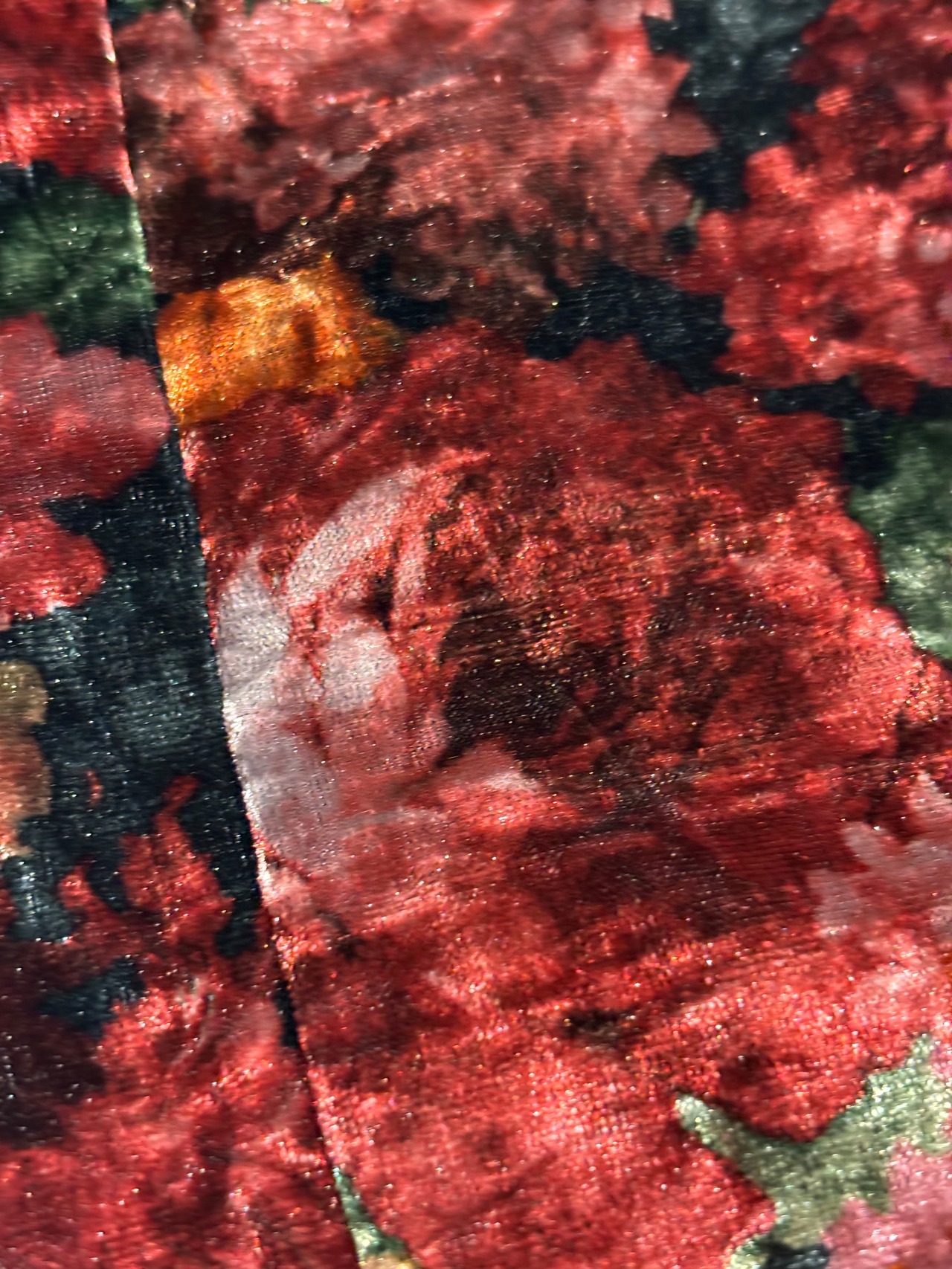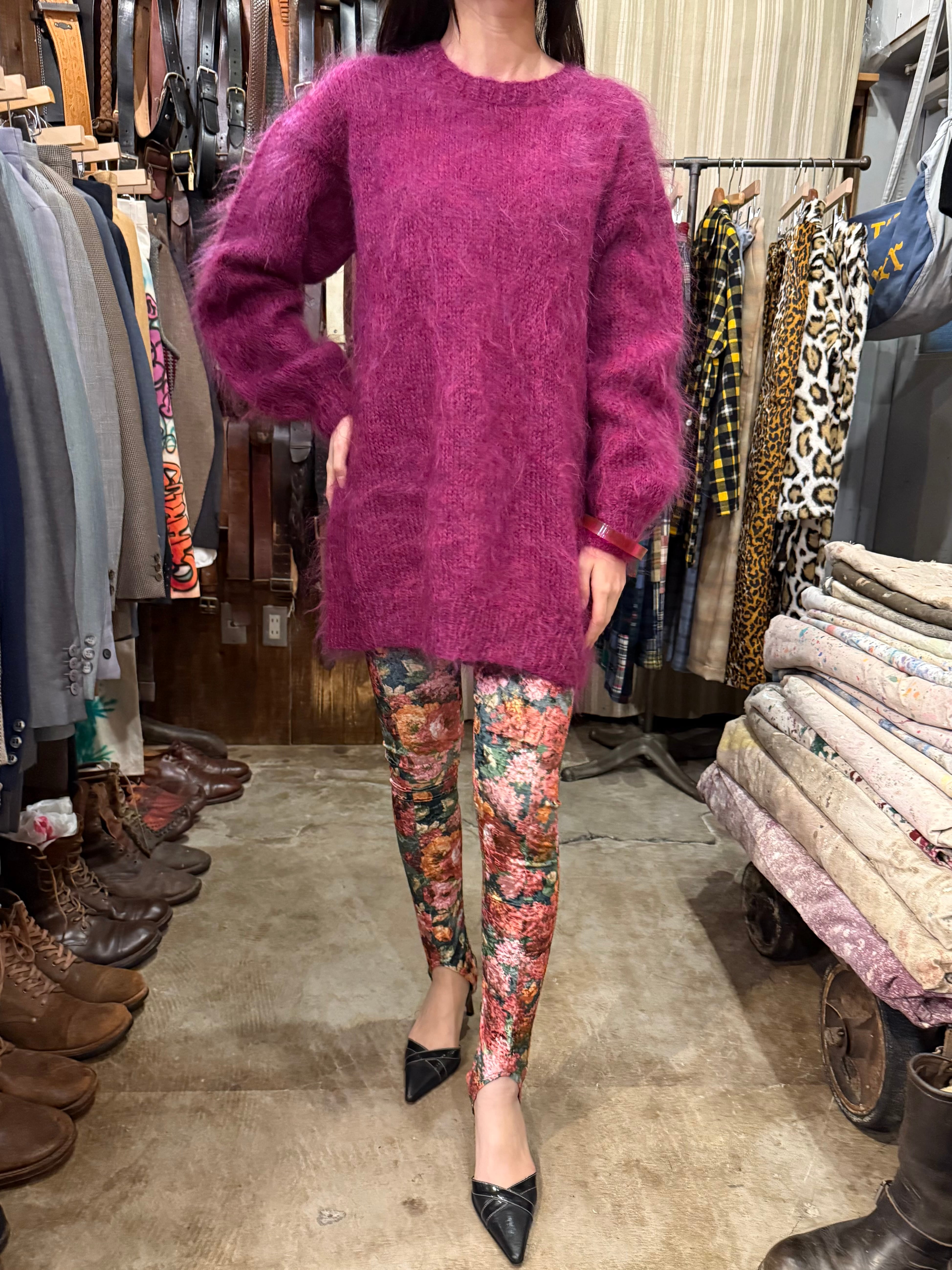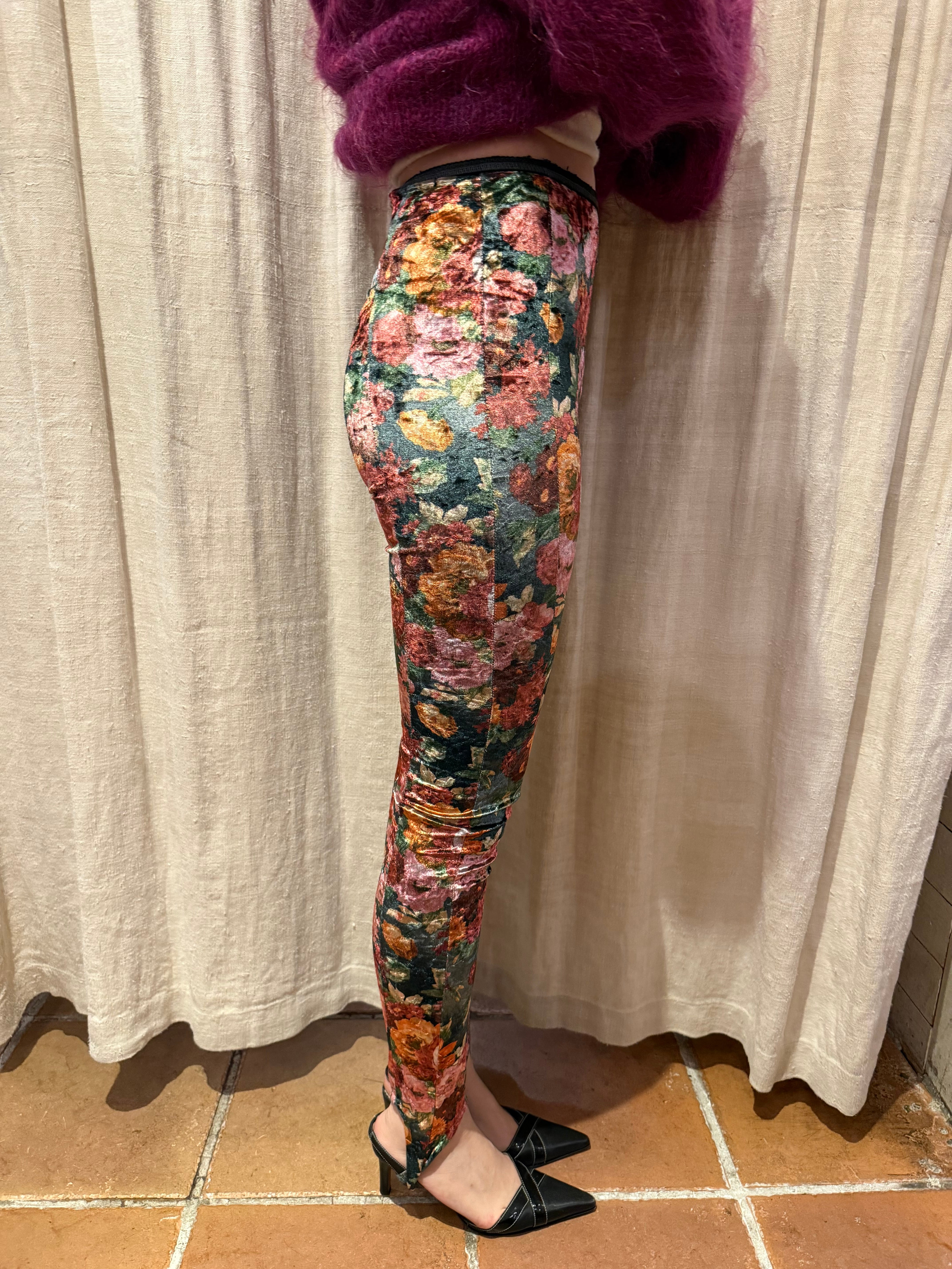 ベロア素材のストラップ仕様のパンツです。花の総柄で派手さもありつつ、深めのトーンのピンクカラーベースなので合わせやすいです。レギンスのようにフィットし、肌触りの良い履き心地です。ストラップ仕様なので、着用画像のようにヒールと合わせるスタイルもオススメで、パンツなどの下に忍ばせて裾からヒールと共に少し見えるのもエッジが効いて可愛いです♩