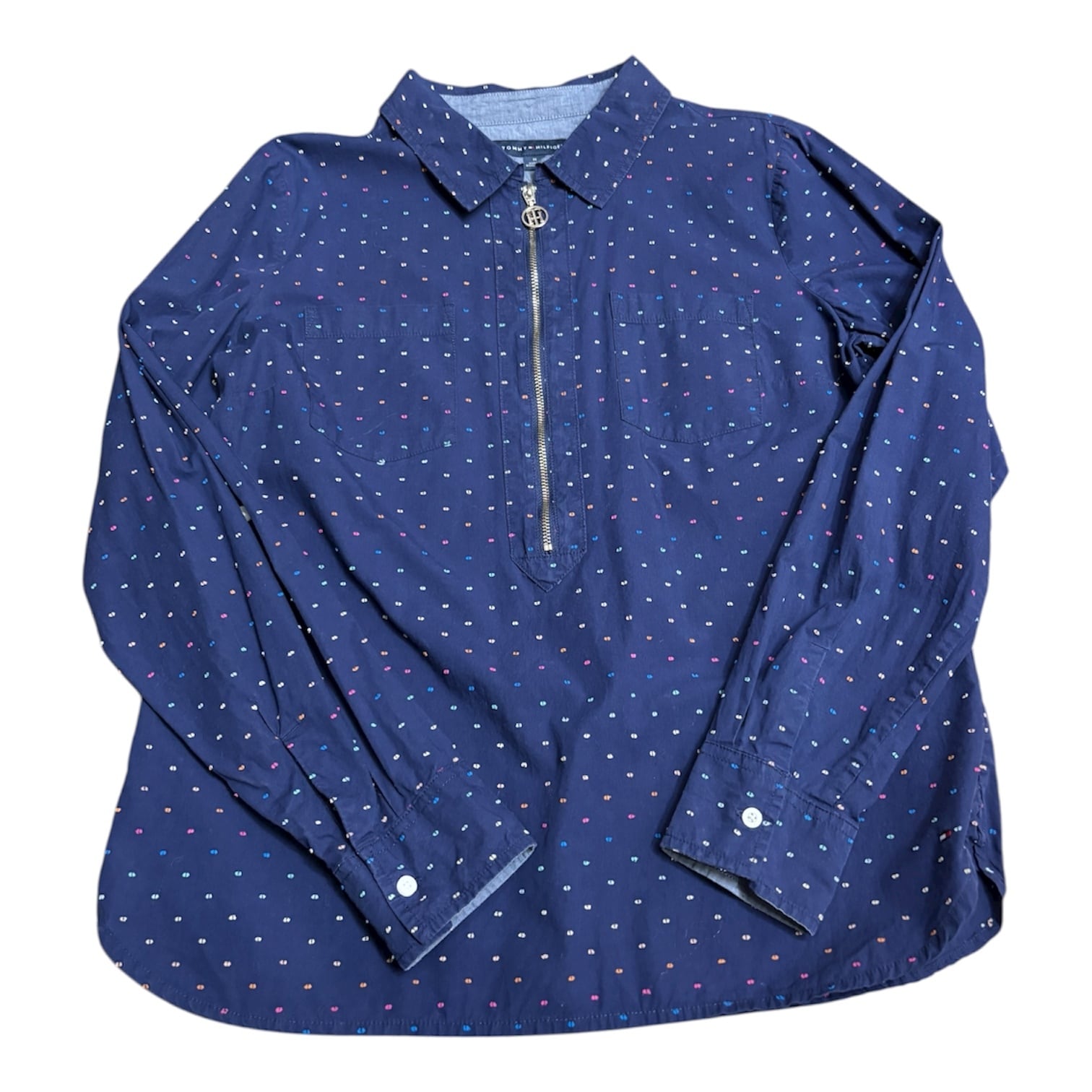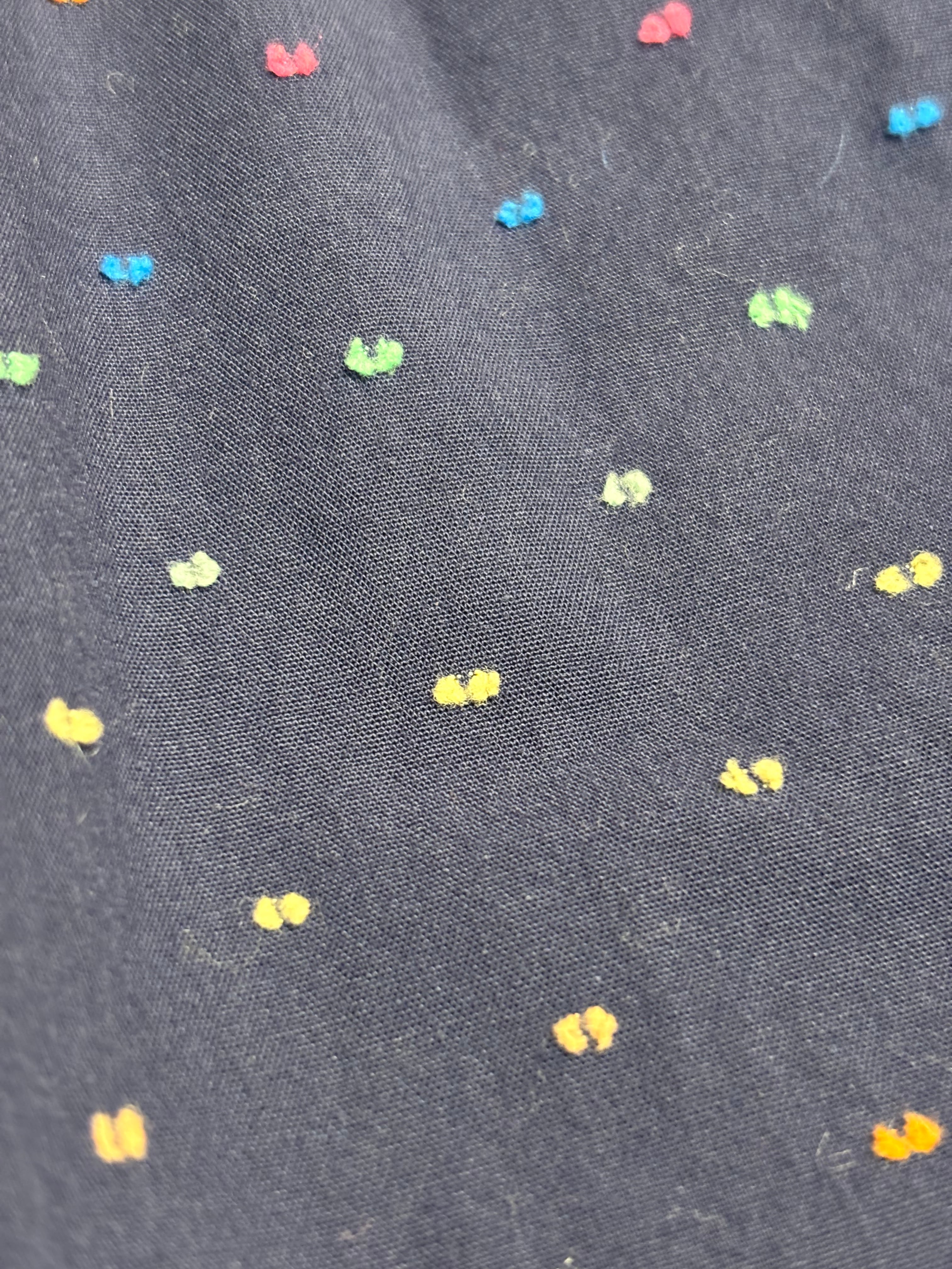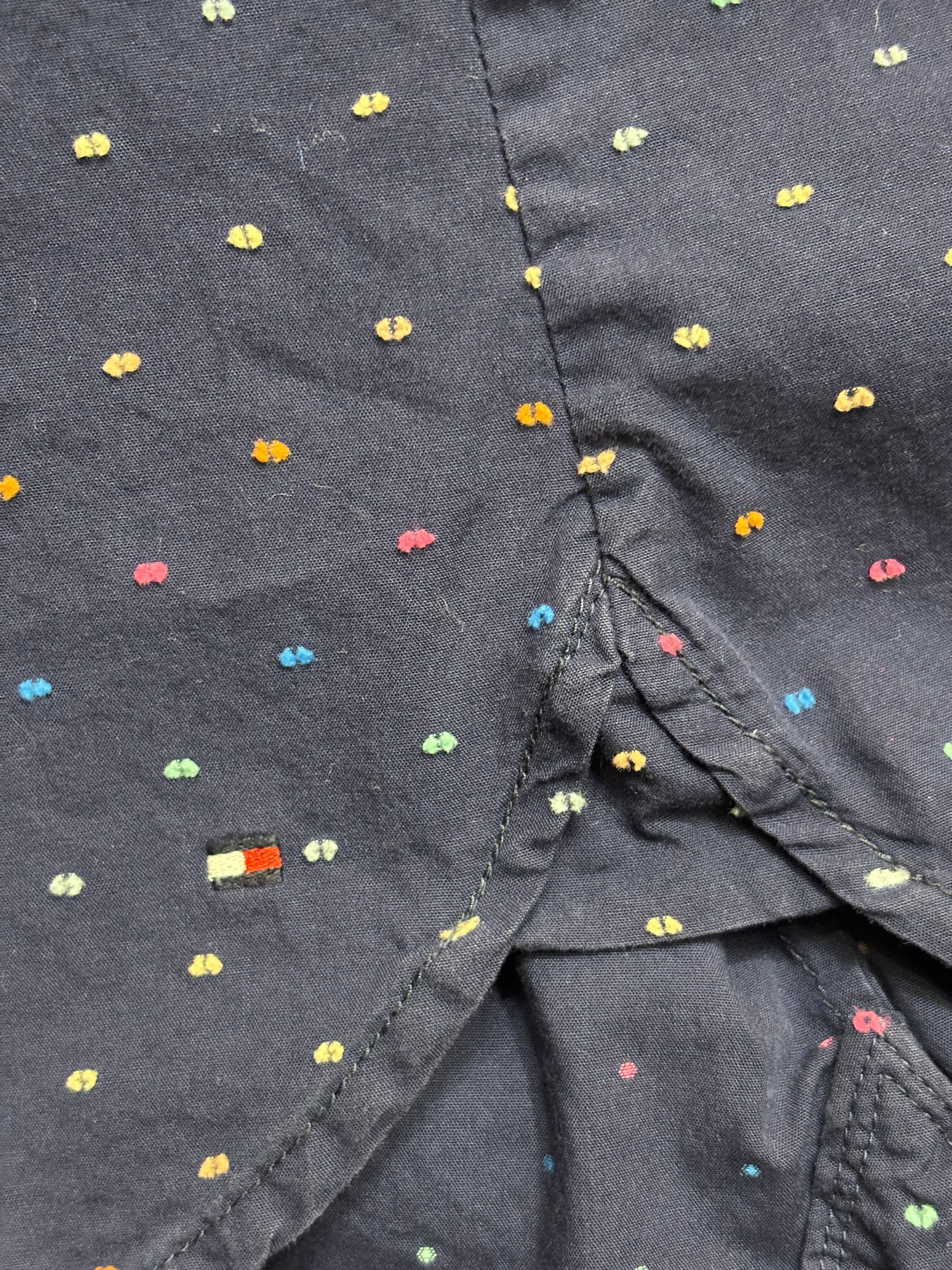 TOMMY HILFIGERのハーフジップ仕様のトップスです。カラフルなカットドビー生地で、小さいドット柄のようになっていて可愛いです。一枚はもちろん、着用画像のようにベストなどの下にインナーとして着用しても素敵です。
