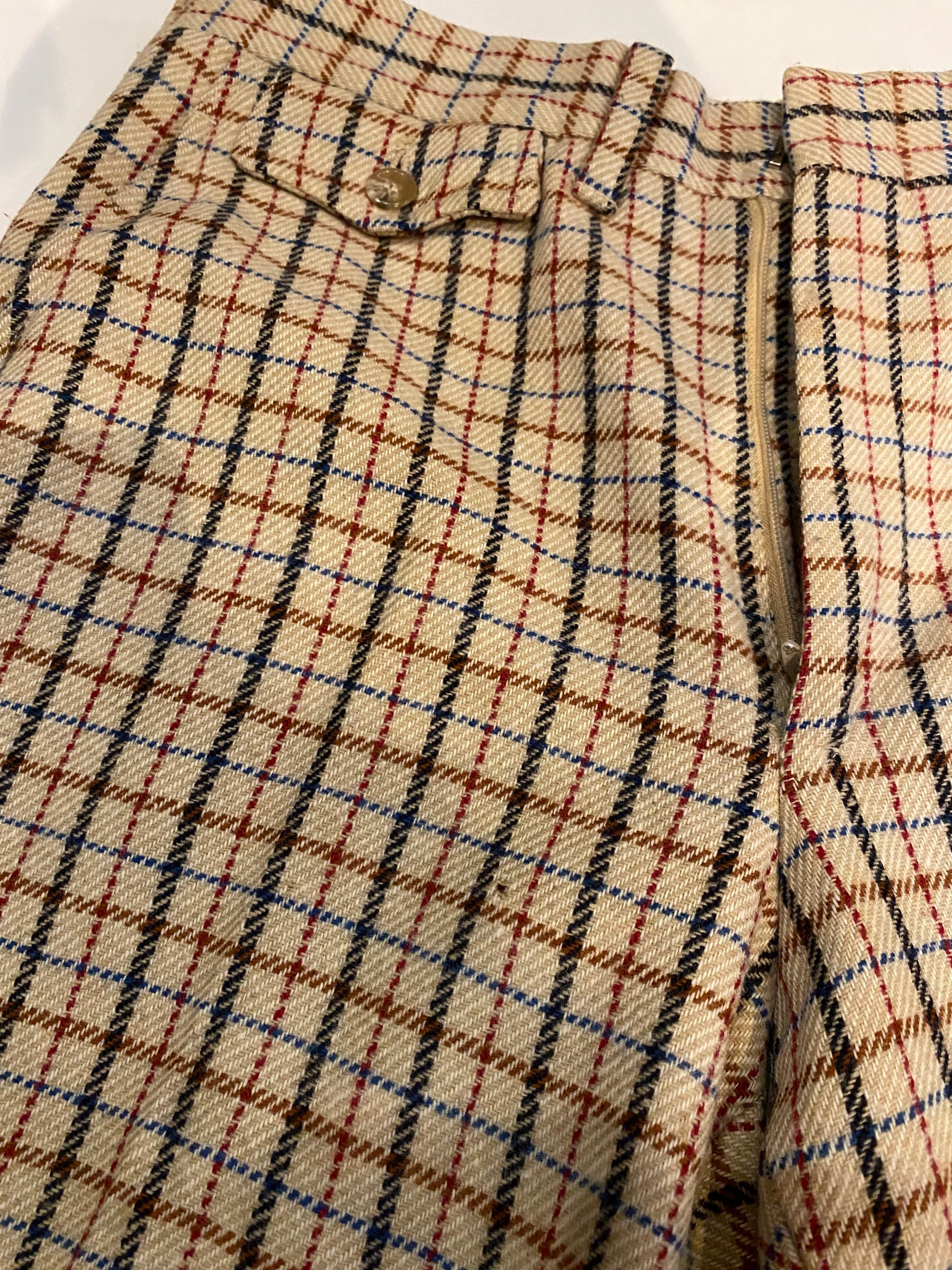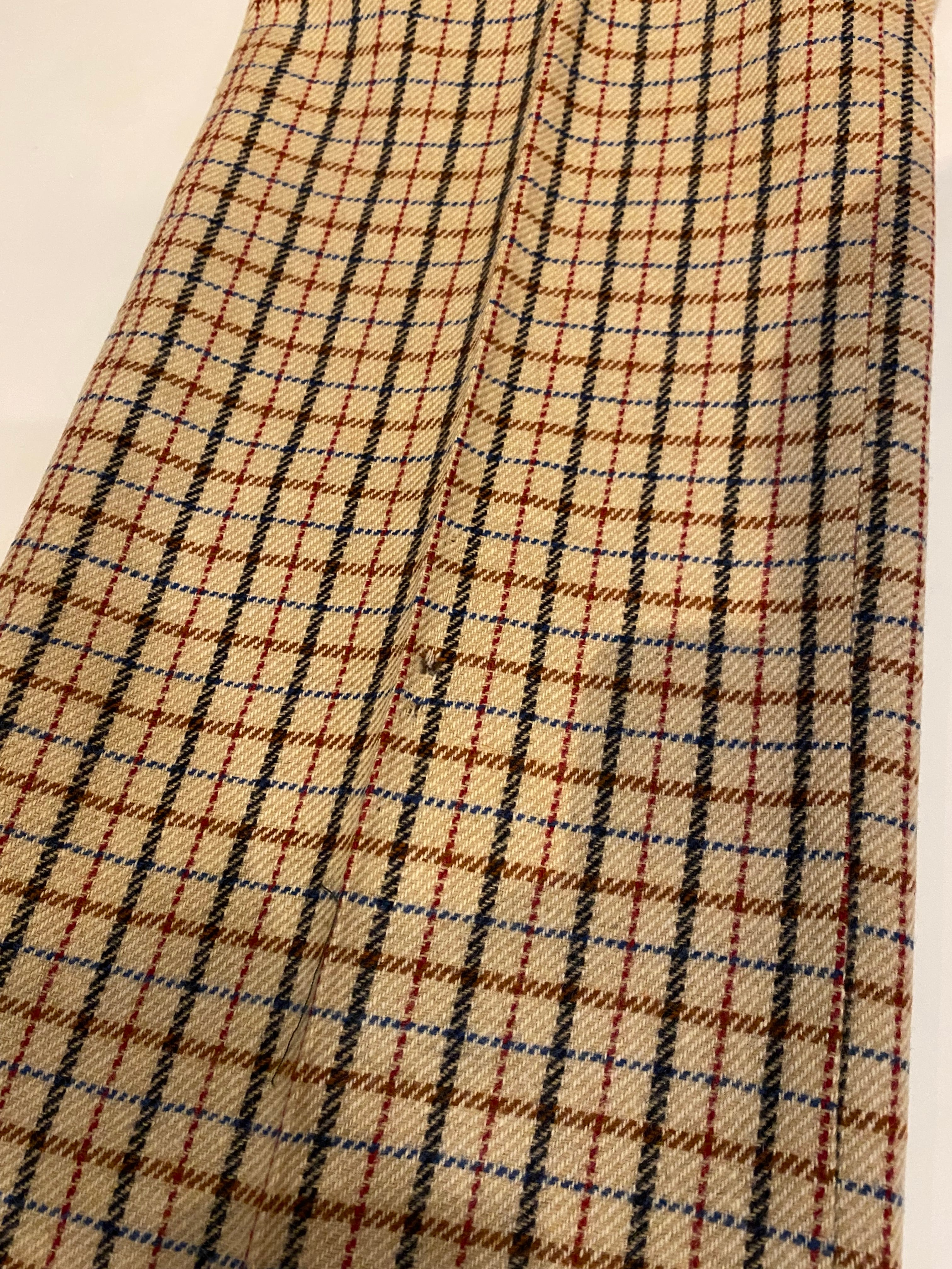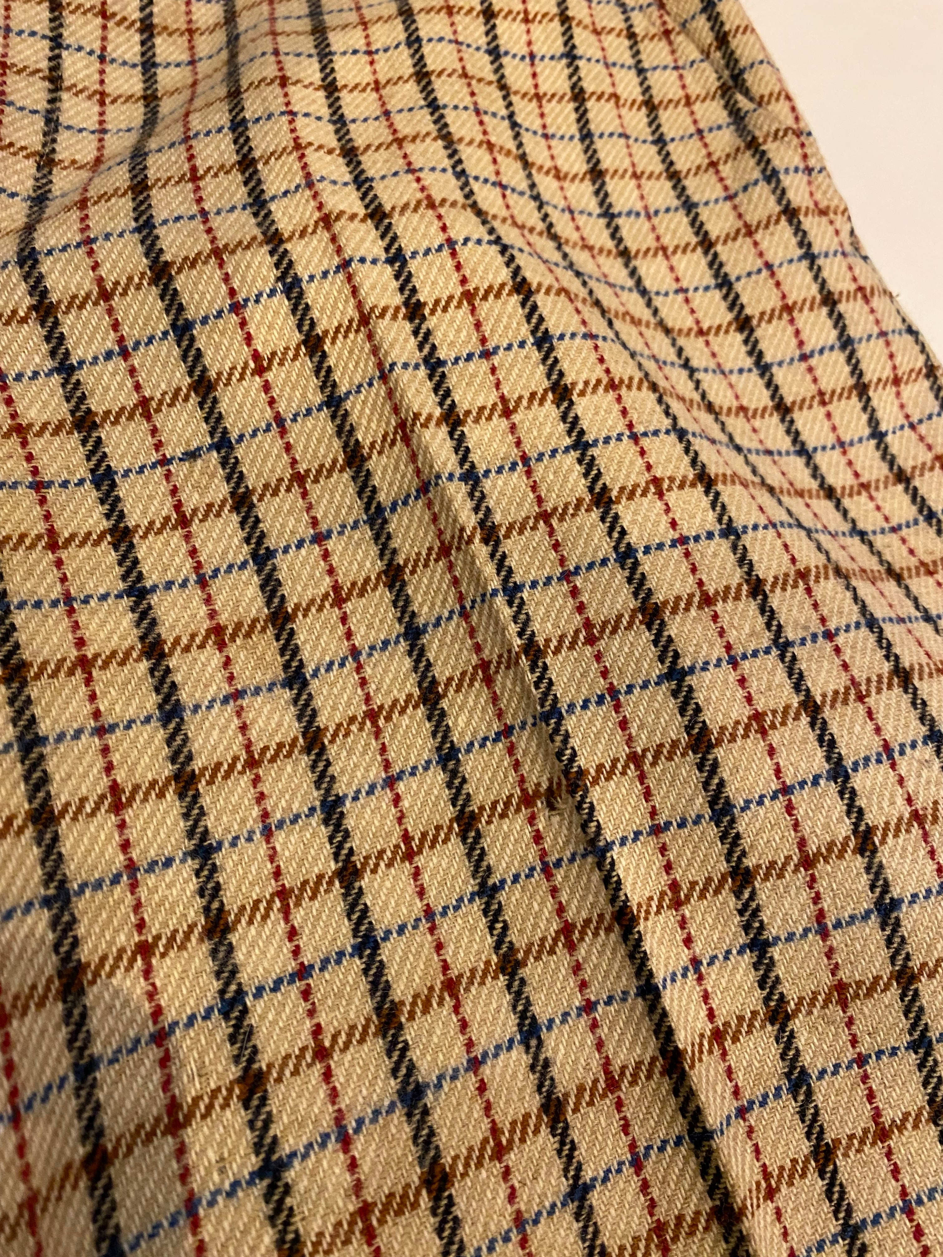 ベージュベースに赤、ブルー、黒、ブラウンのチェック柄になっております。上品な印象もあるチェックです。