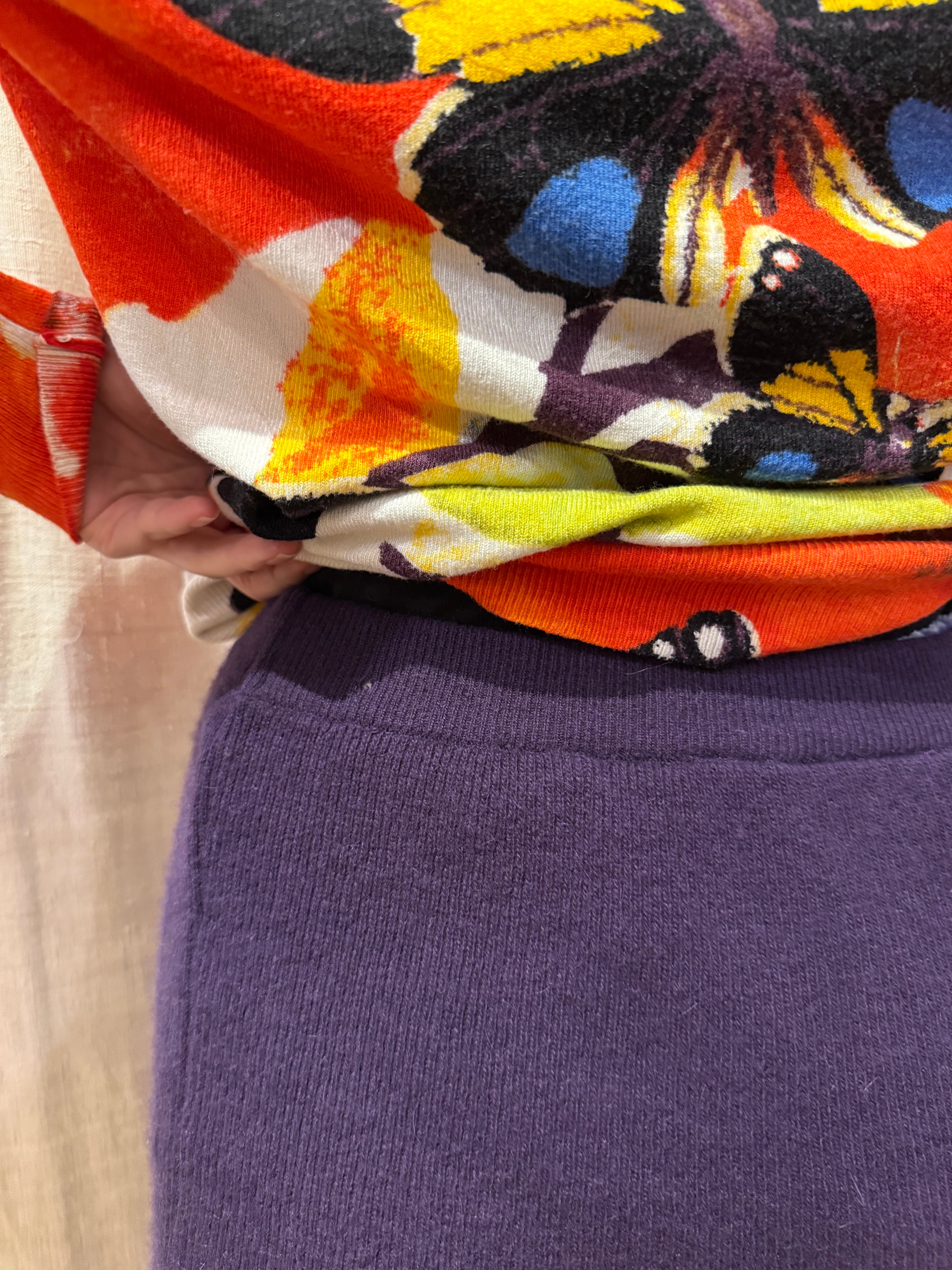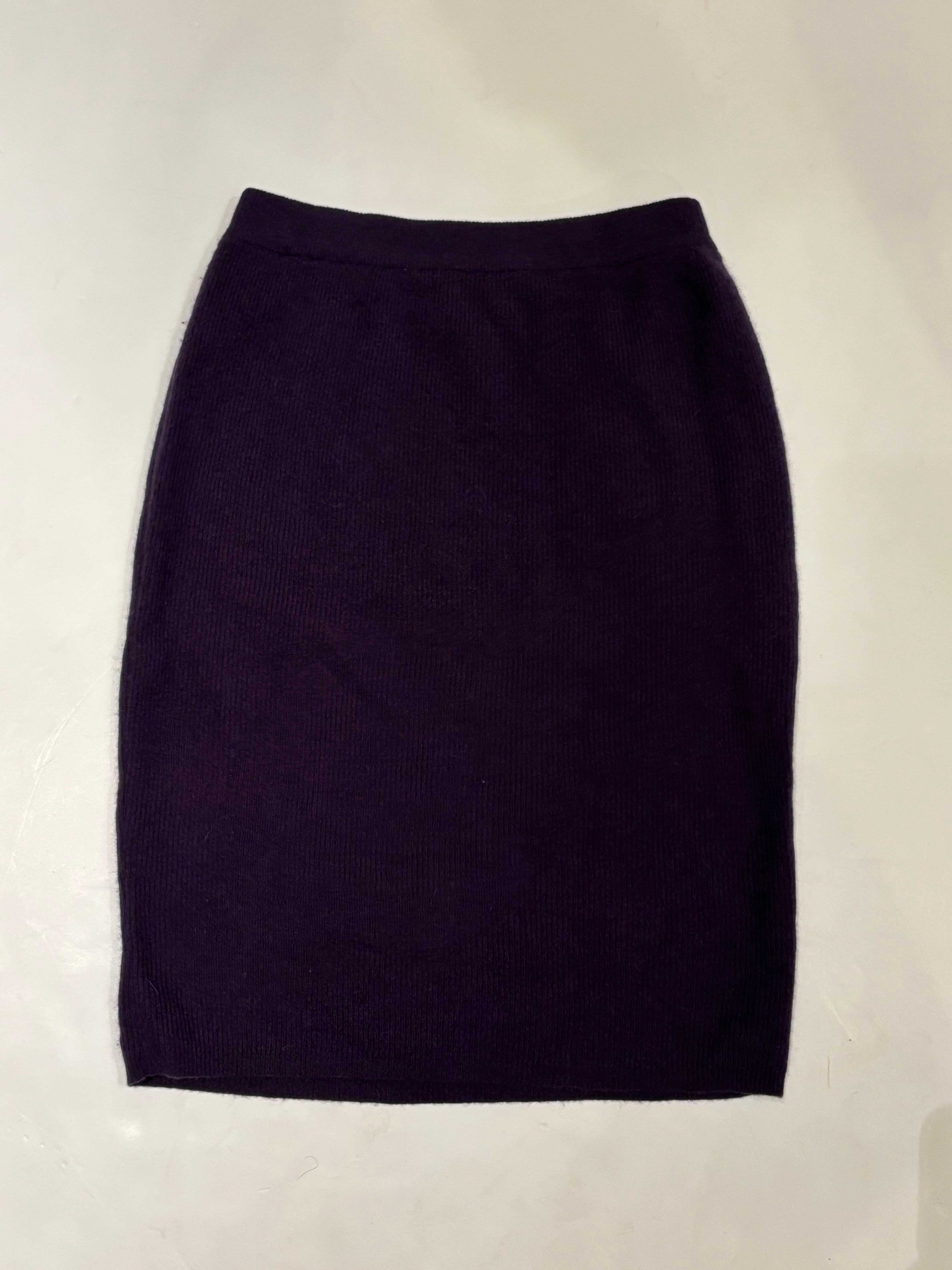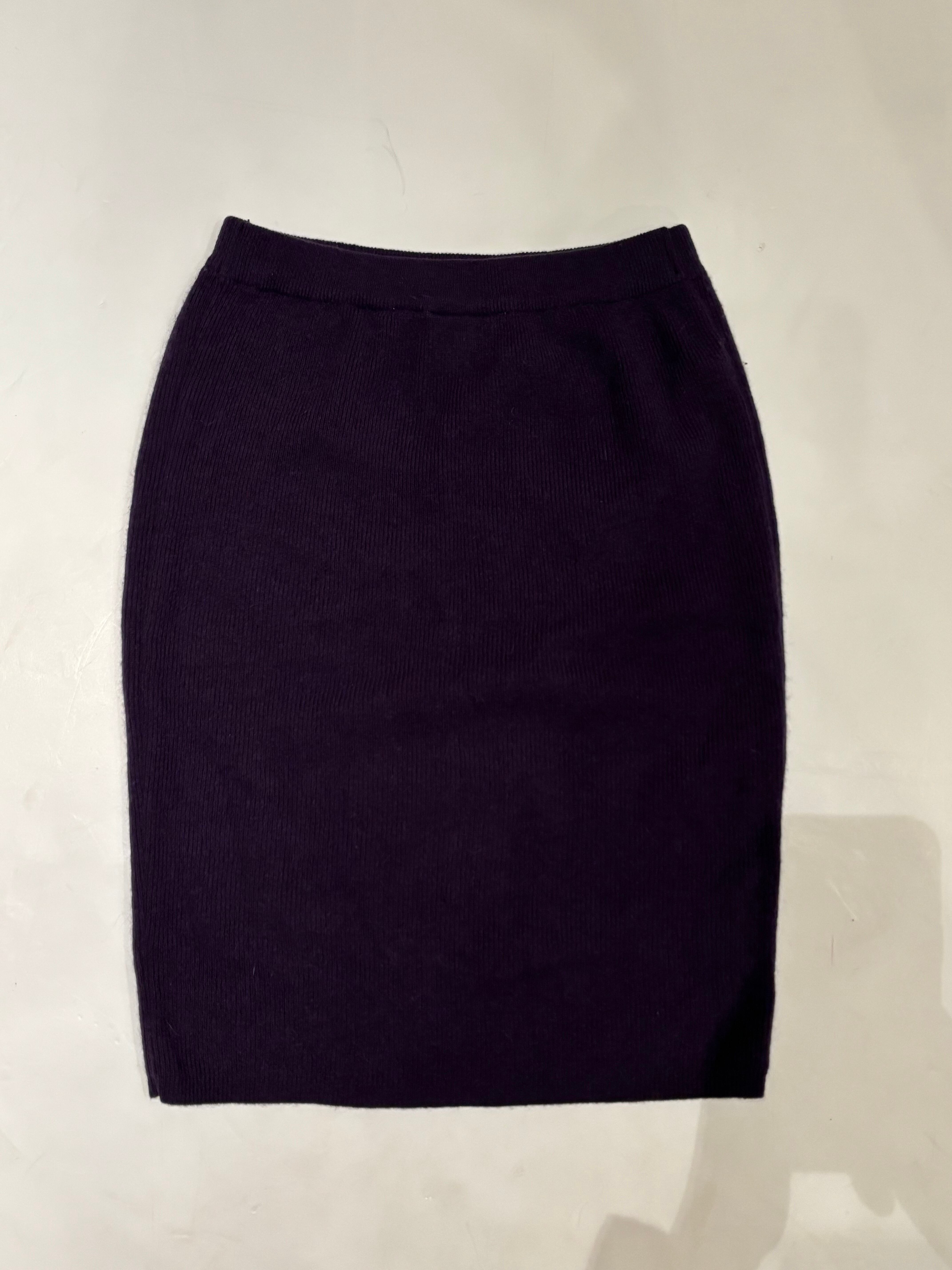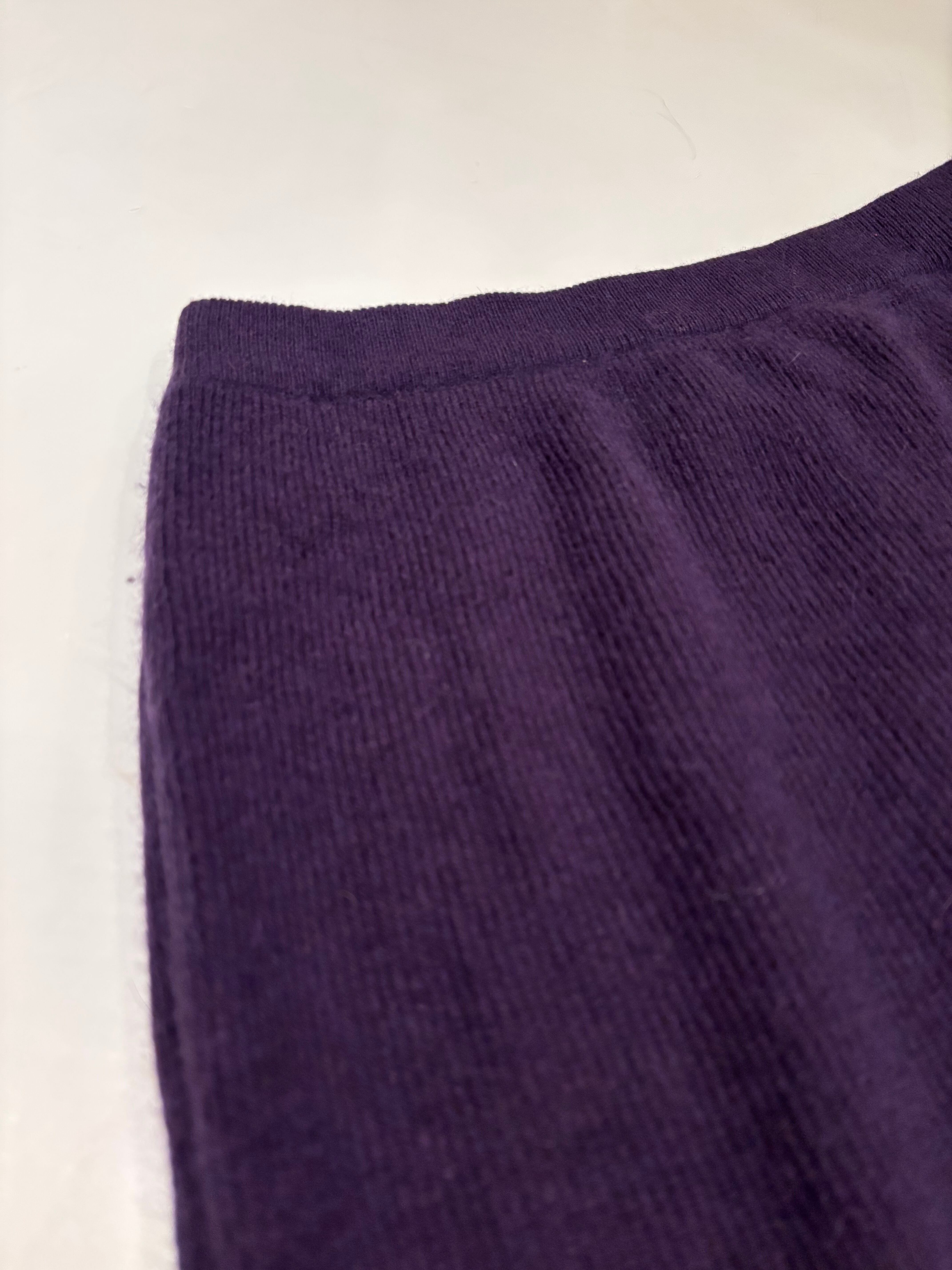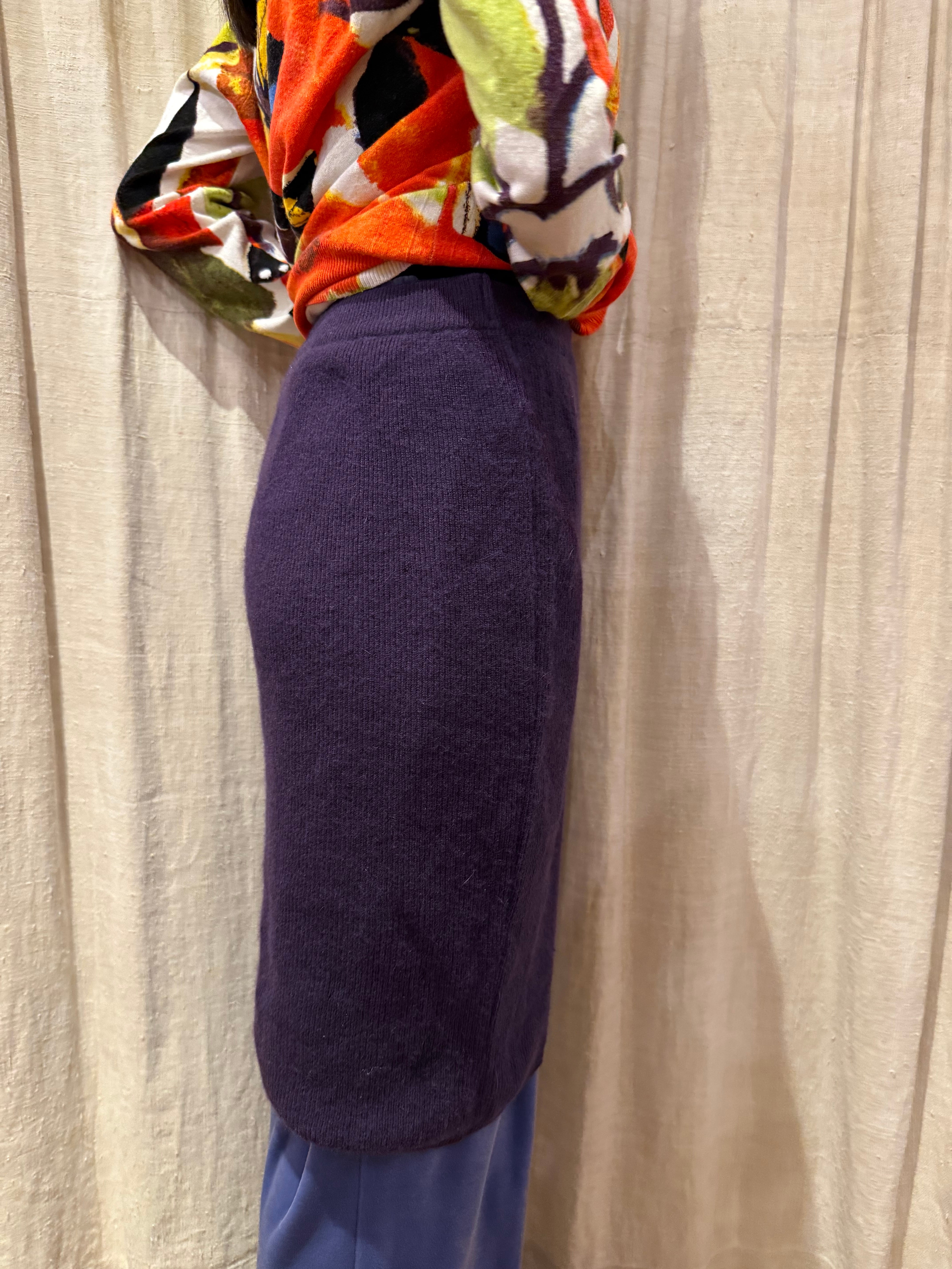 タイトなシルエットのスカート。ニット素材で伸縮性があり、アンゴラが入っているのでふわっとしていて暖かな着心地です。色も紫でとても可愛らしく、コーディネートのワンポイントや、レイヤードに是非いかがでしょうか。
