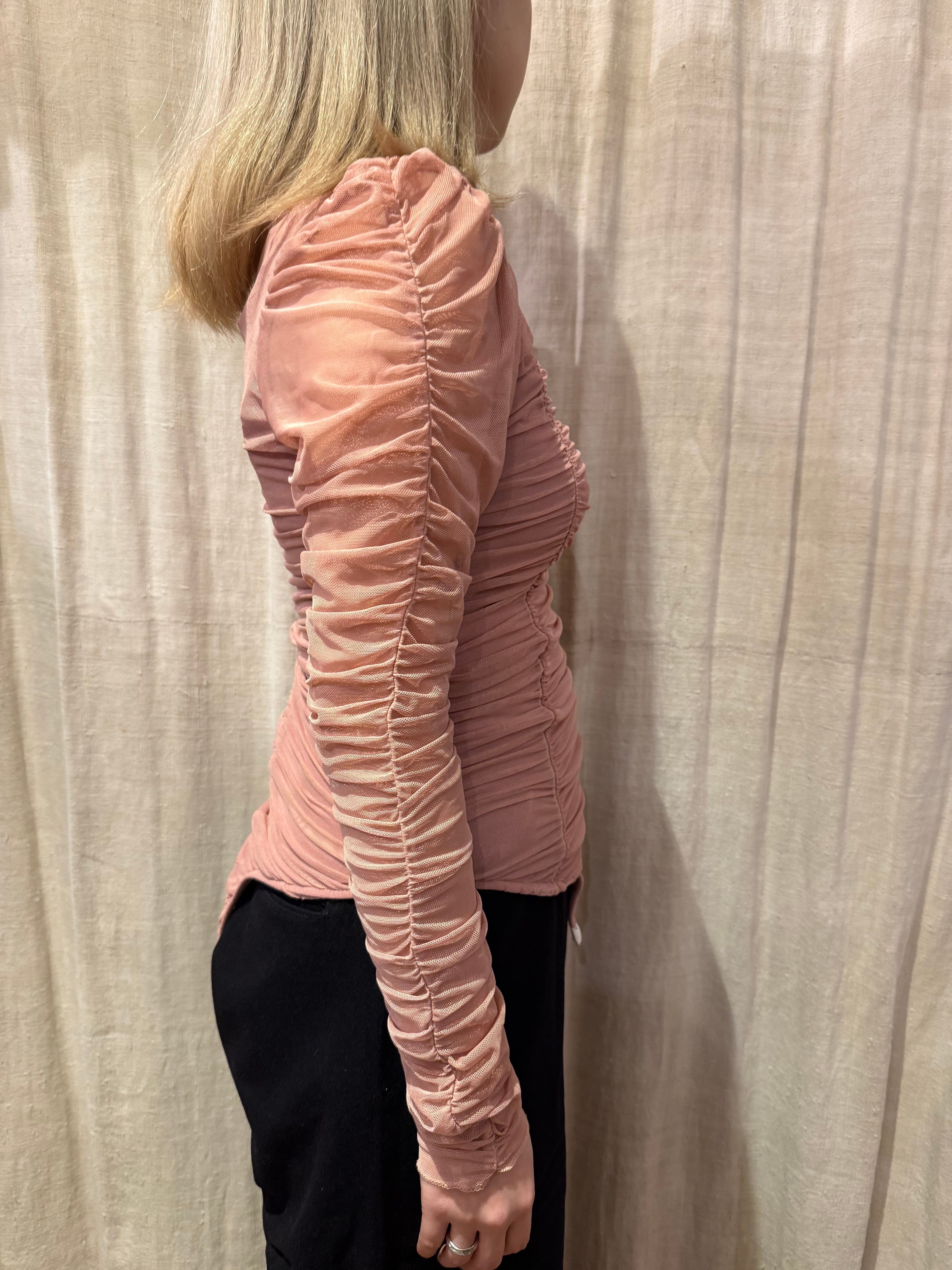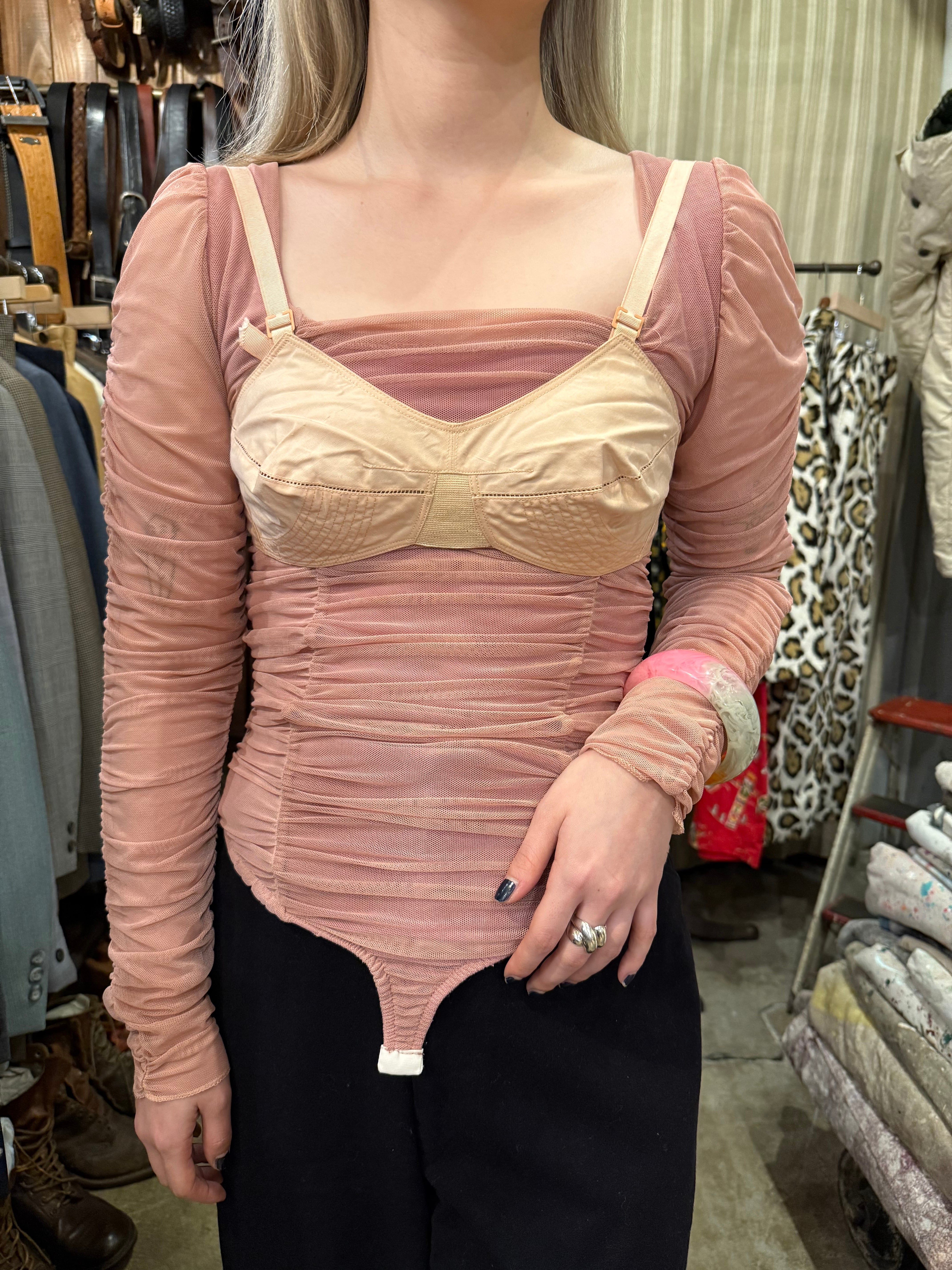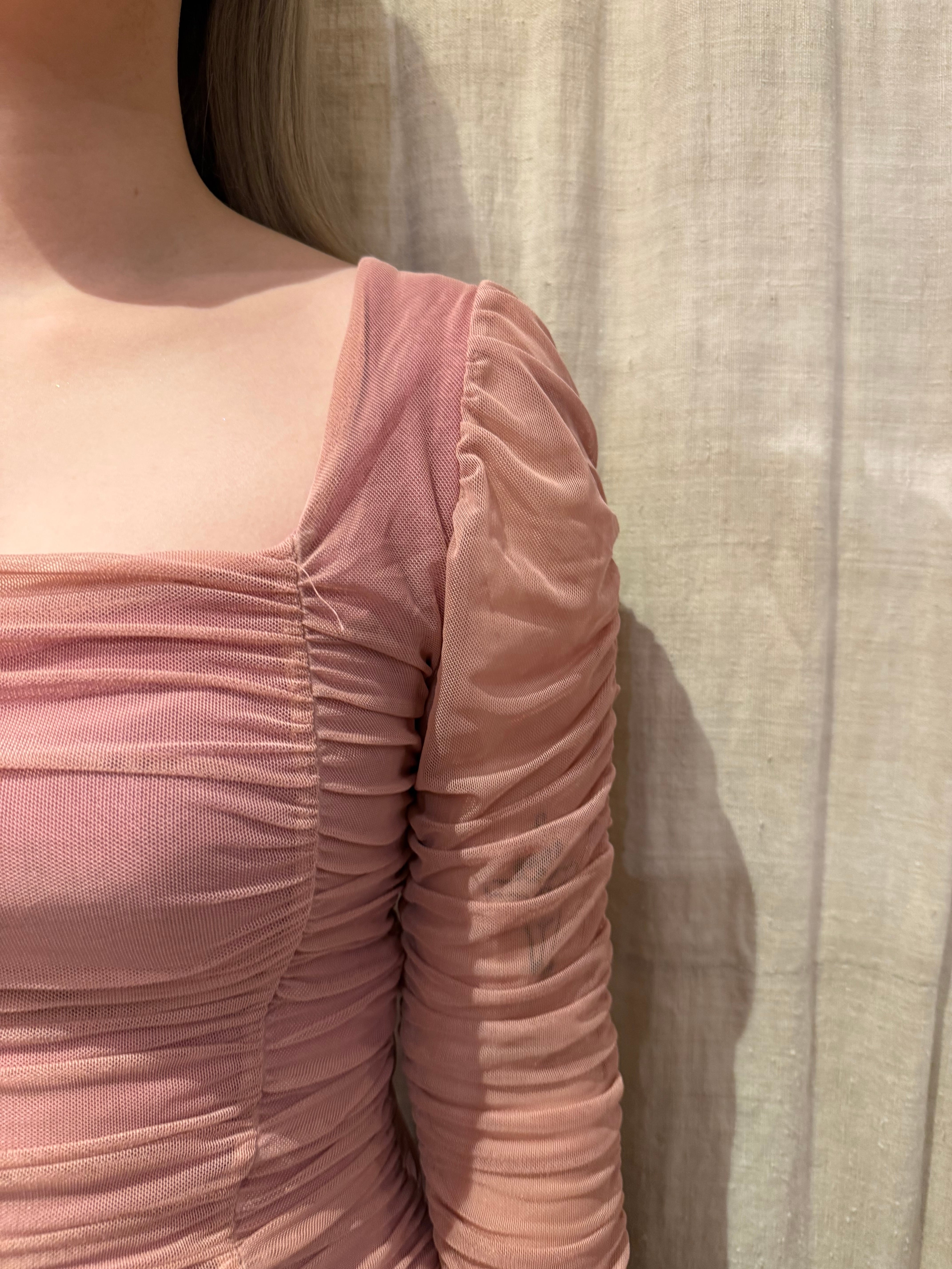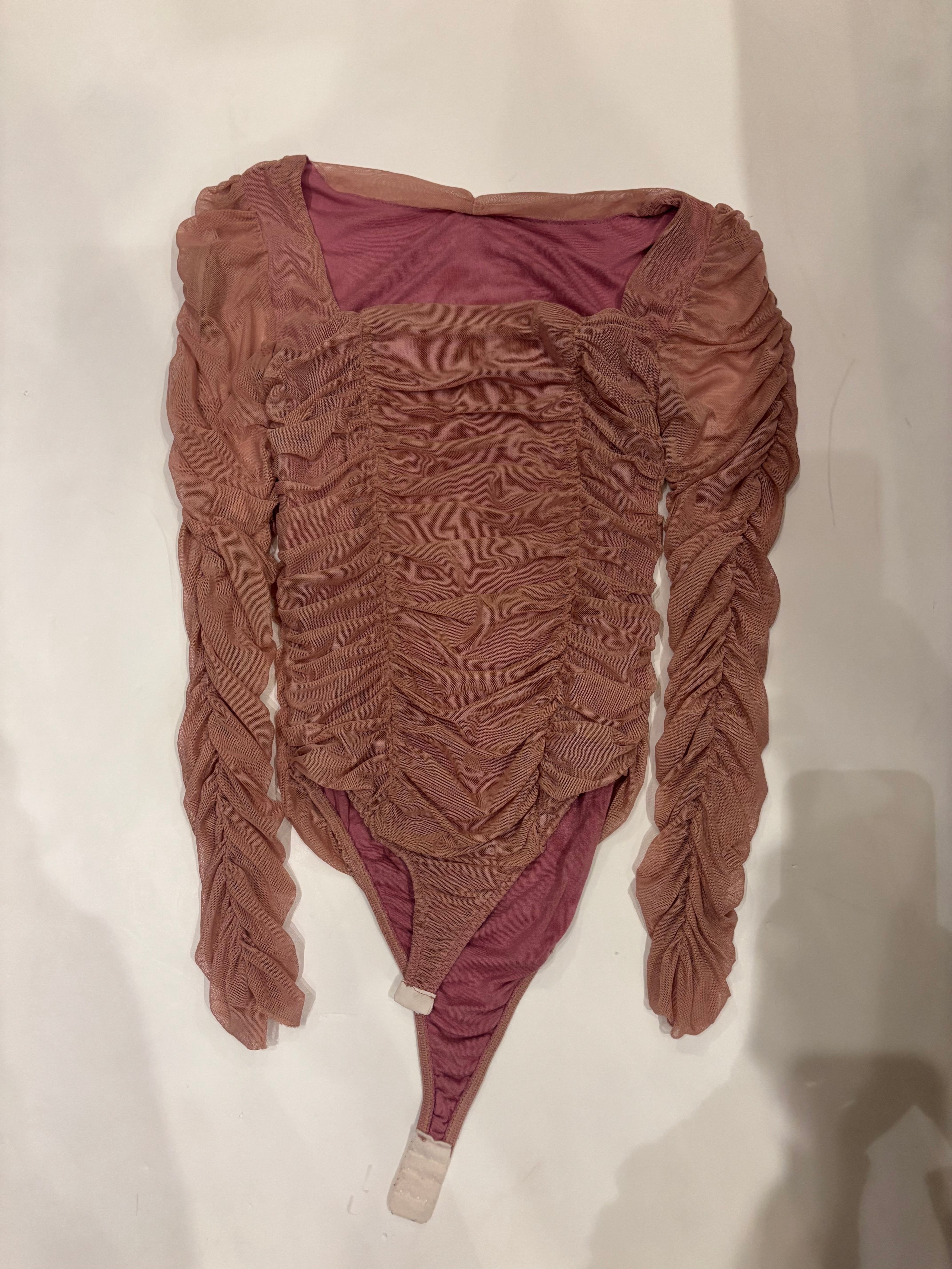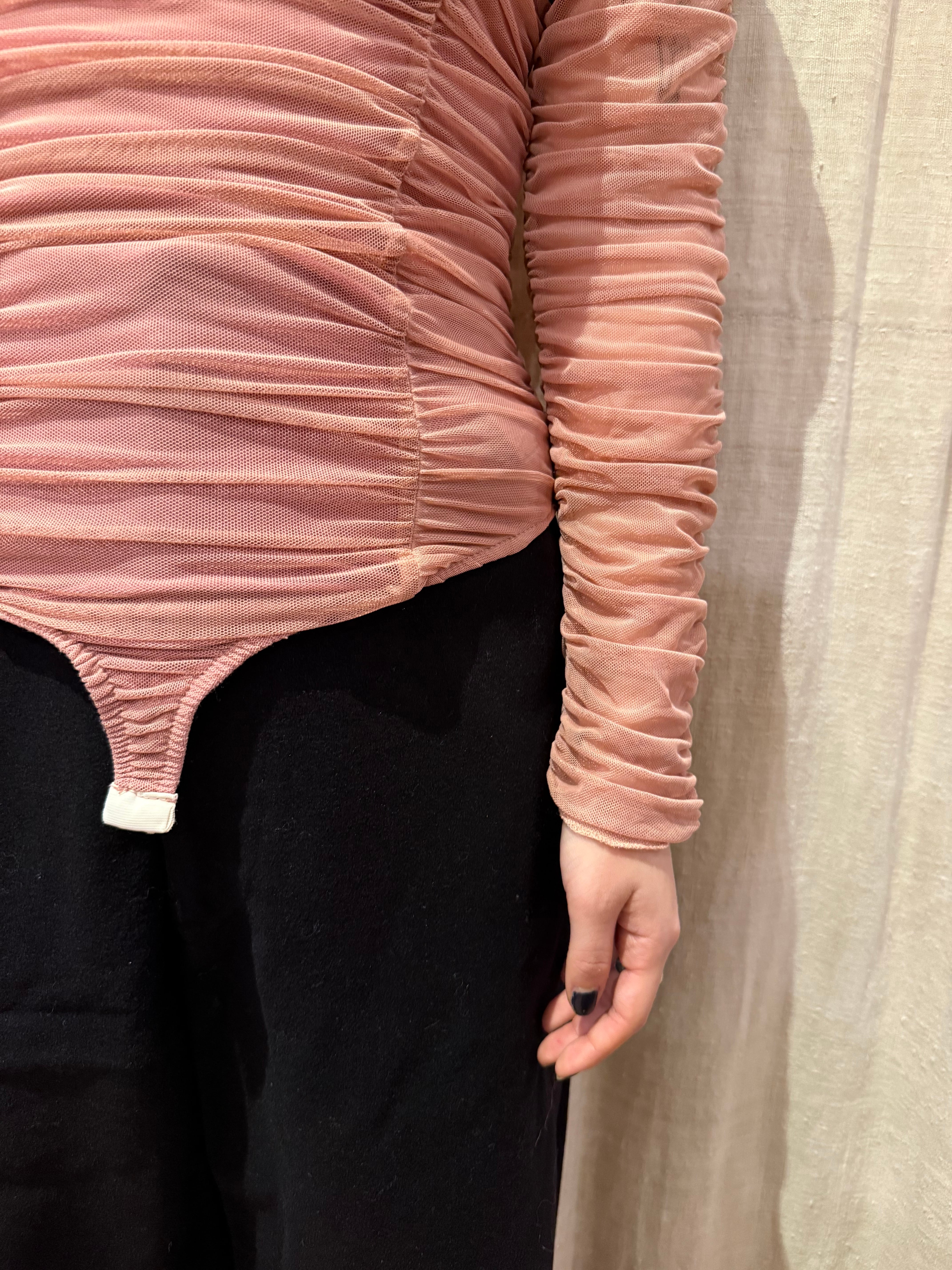 甘めのピンクが可愛らしいボディスーツ。チュールでギャザーがたくさん入ったデザイン。腕は透け感があり、たっぷりと空いたスクエアネックが華やかさを演出してくれます。レイヤードとしてもおすすめです。