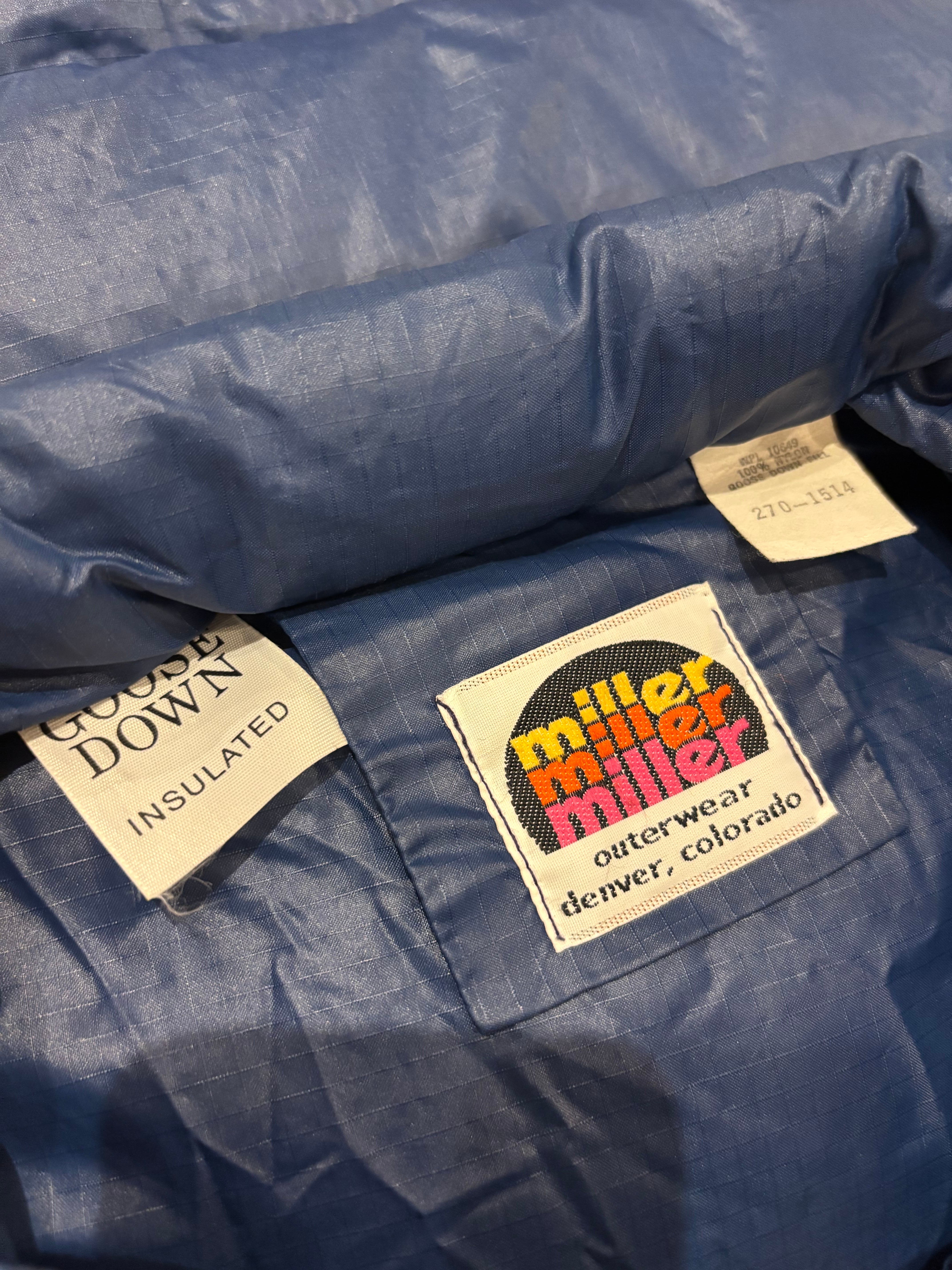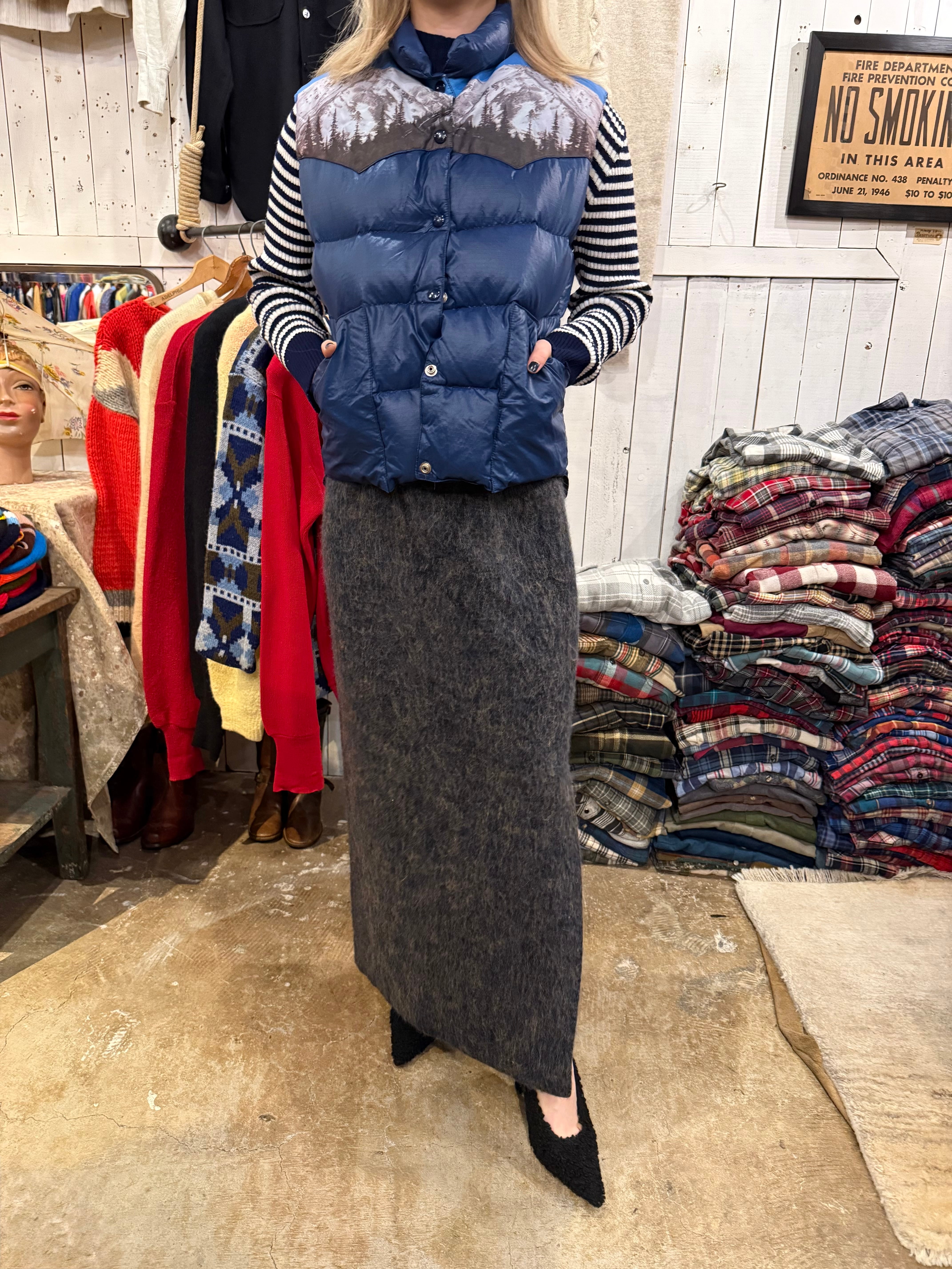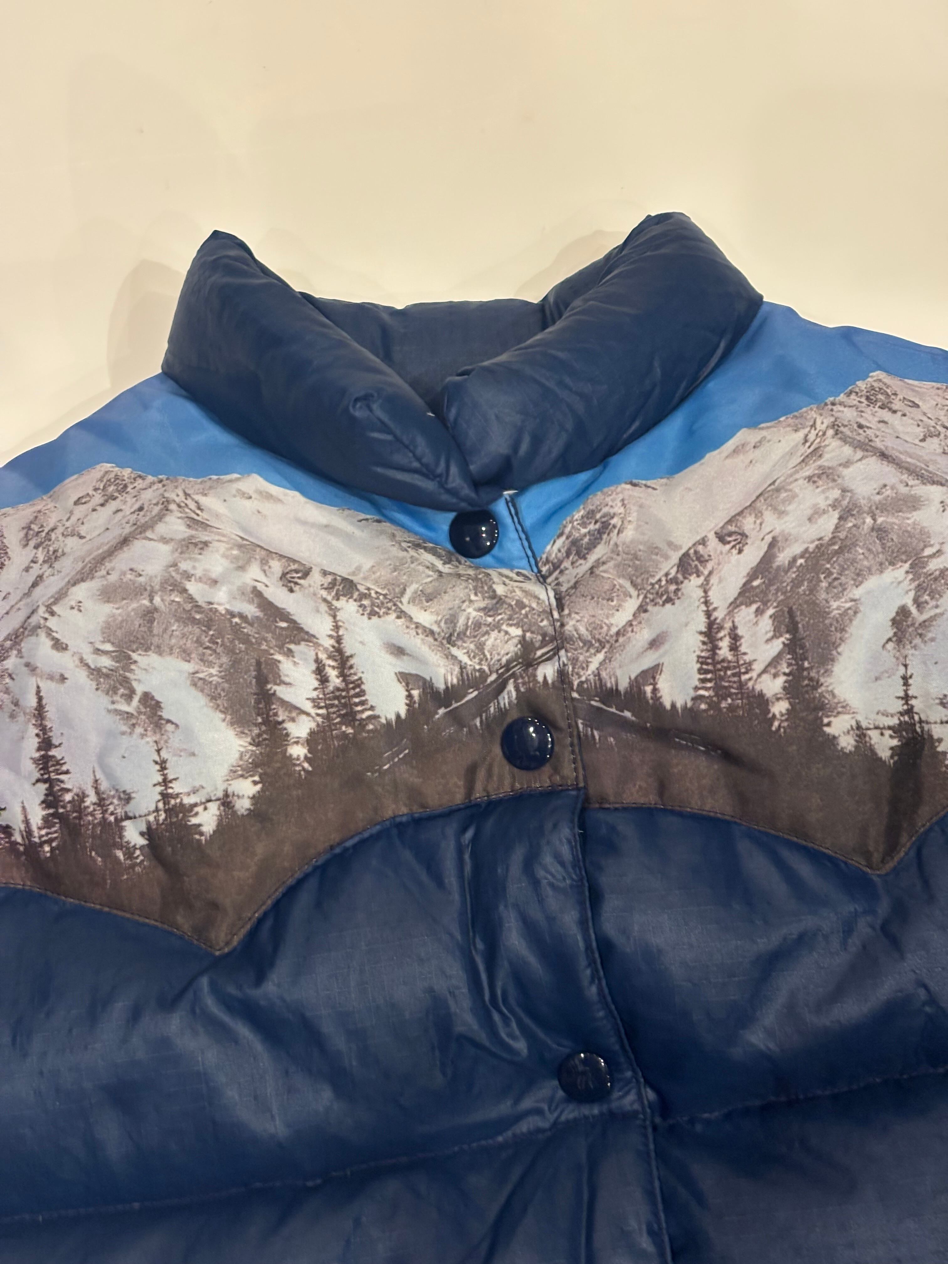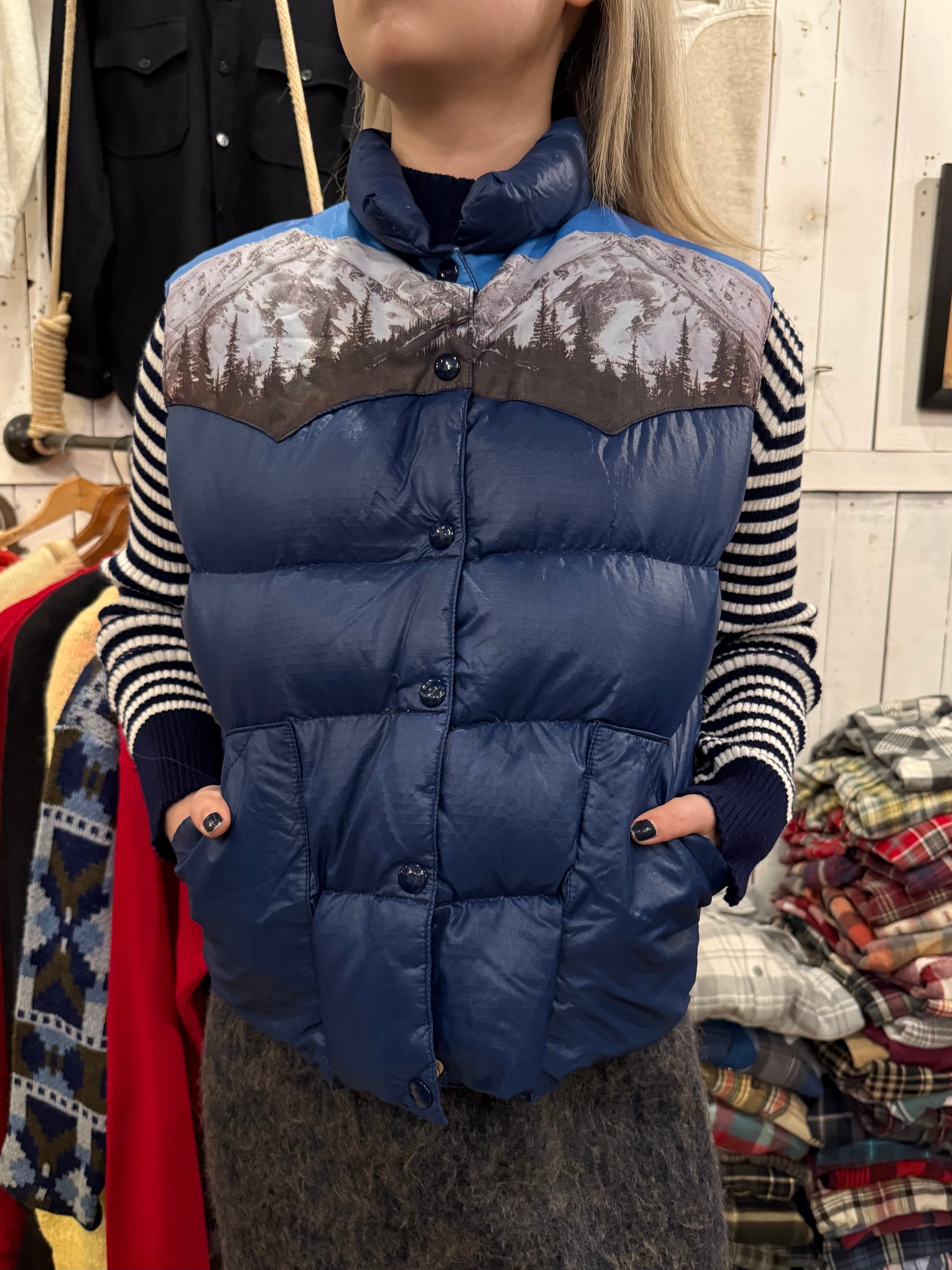 ヨーク部分に山岳プリントの入った珍しいパネル切り替えタイプのダウンベスト。70〜80'sにスキー・アウトドア向けに展開されていたブランドになります。リップストップが入っているので丈夫で裂けにくく、とても軽量で重ね着をしてもラフに着用ができるのでおすすめです。