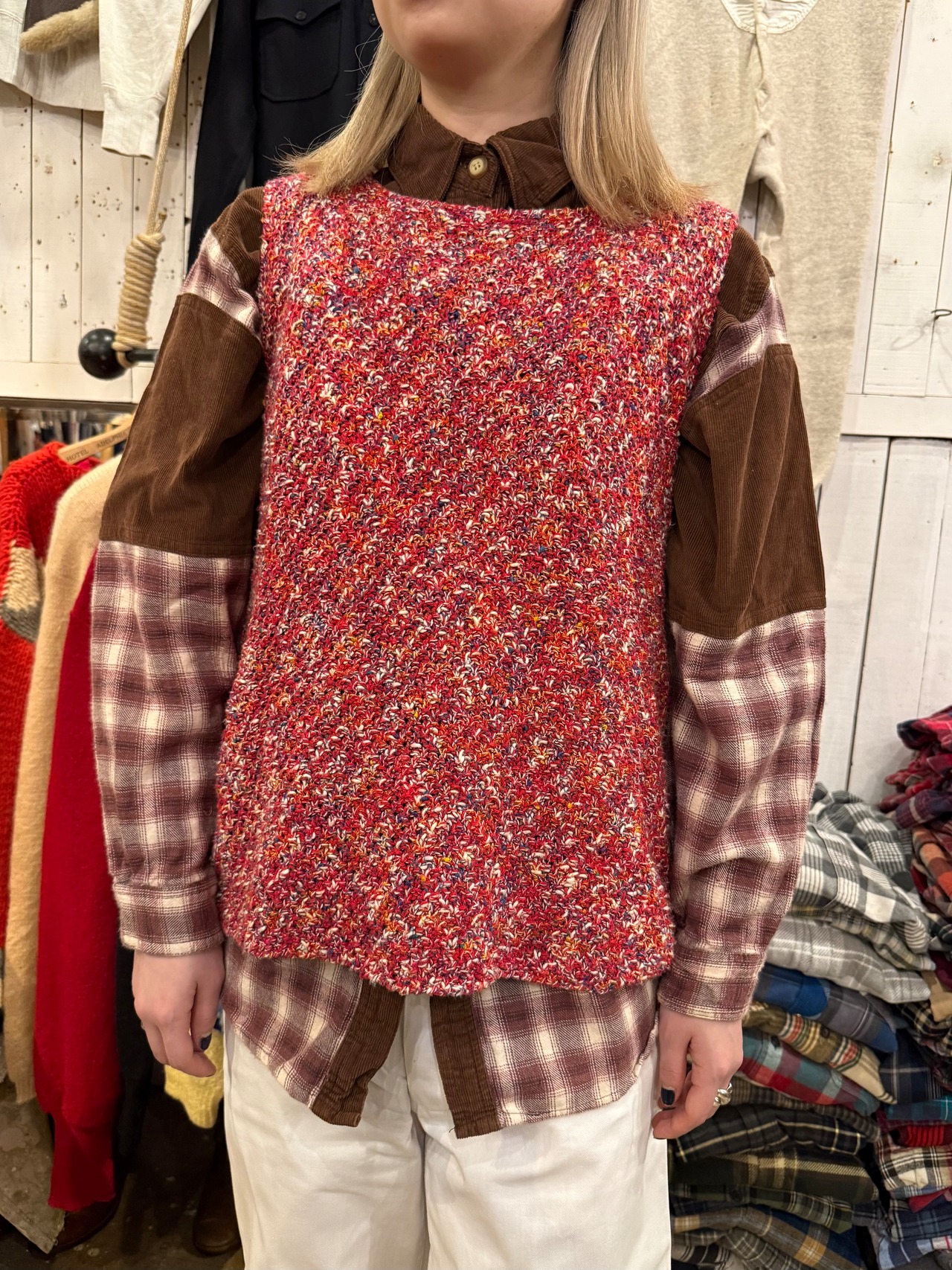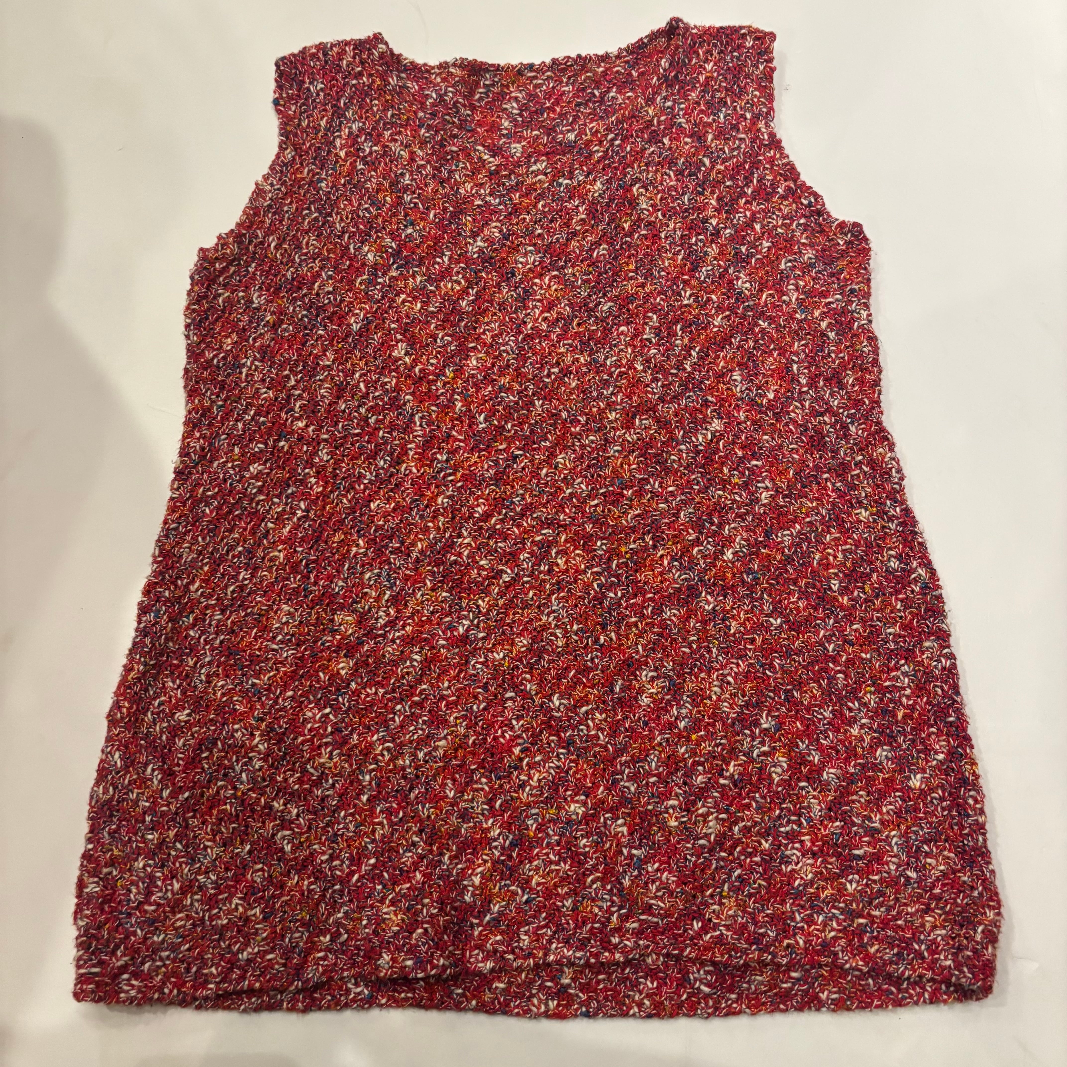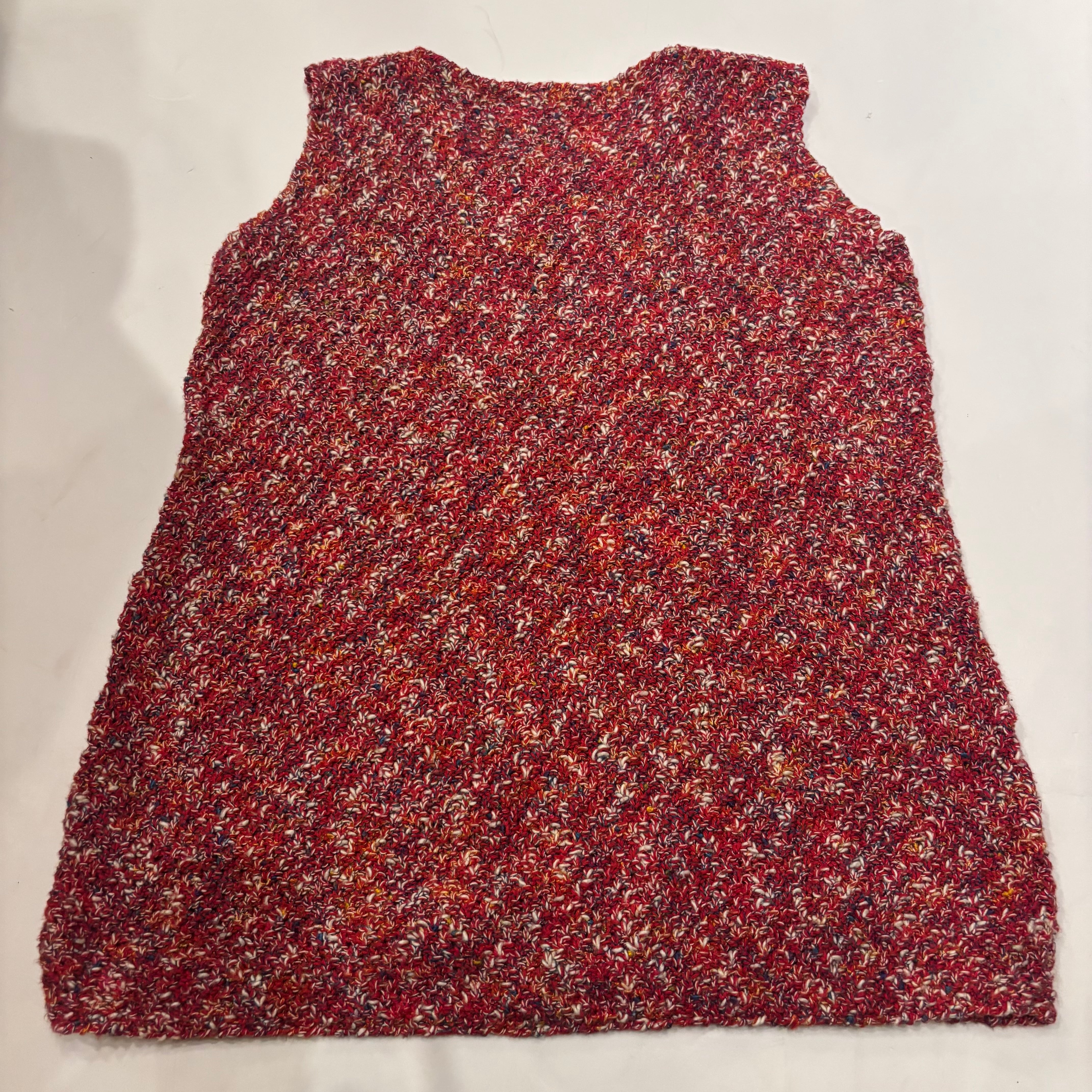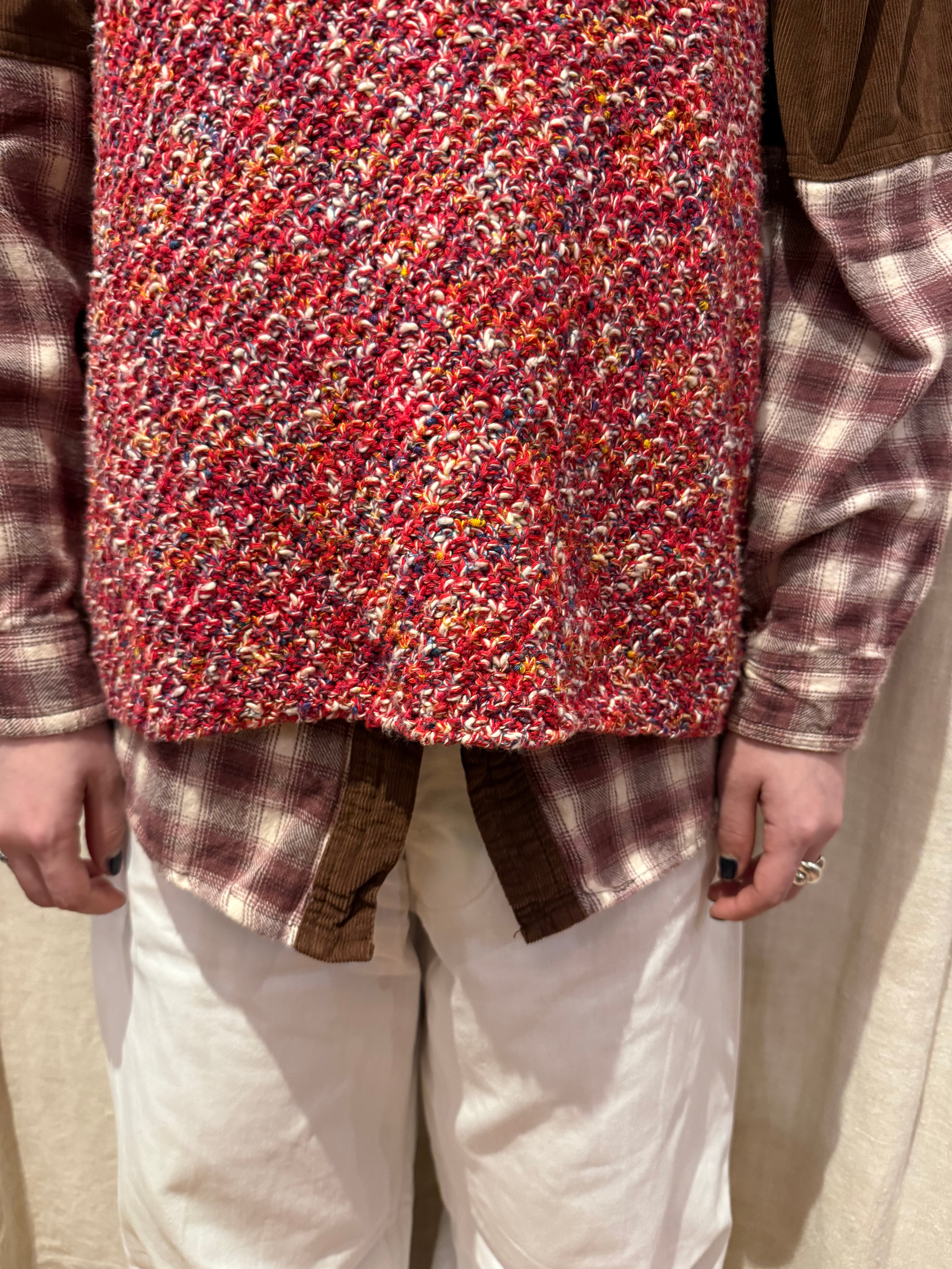 赤ベースに見えますがカラフルなカラーが編み込まれたハンドニットベスト。アームホールはキュッとしていて四角いシルエットです。チクチクしない素材なので気軽に着れるのでおすすめです。