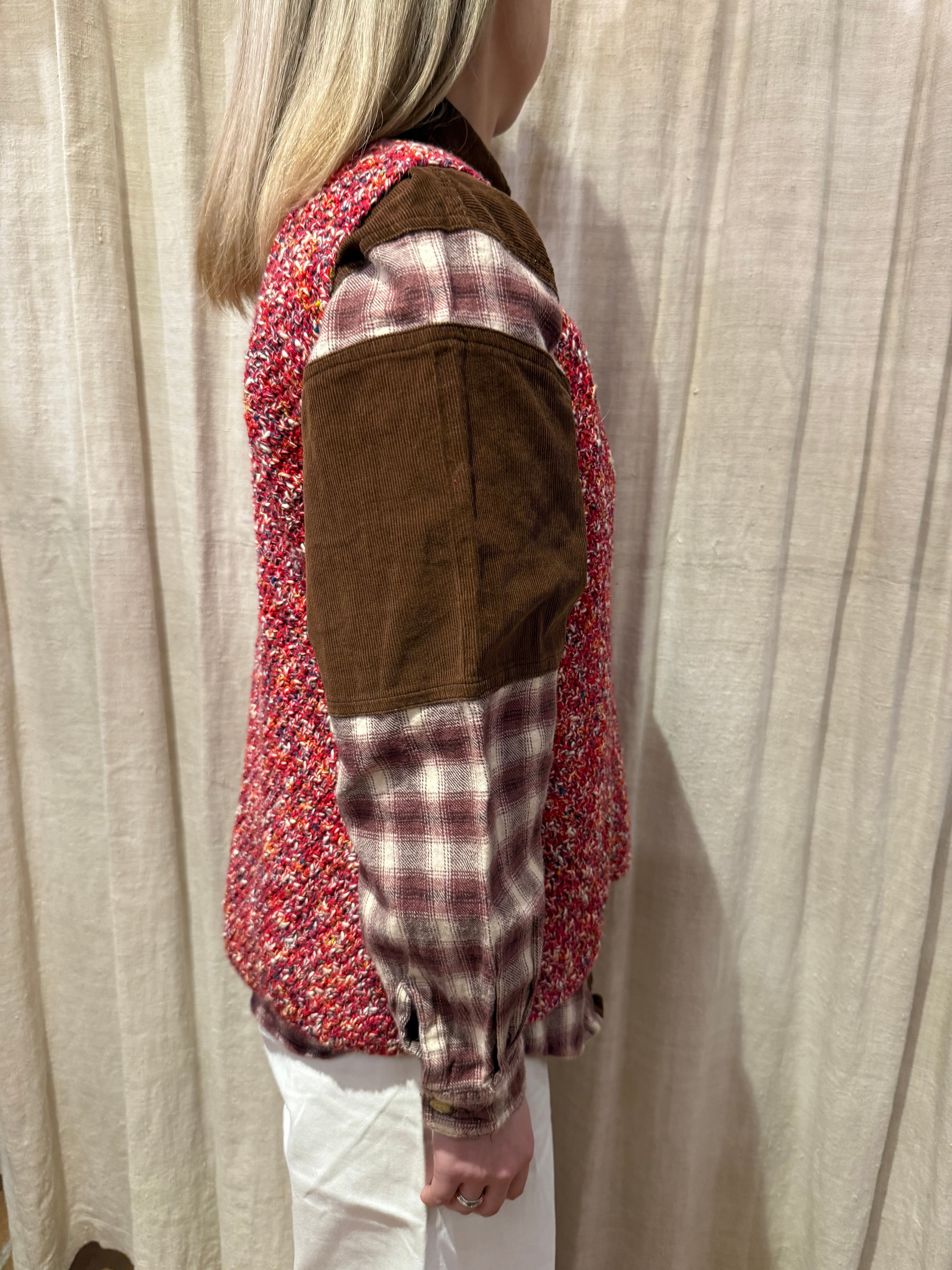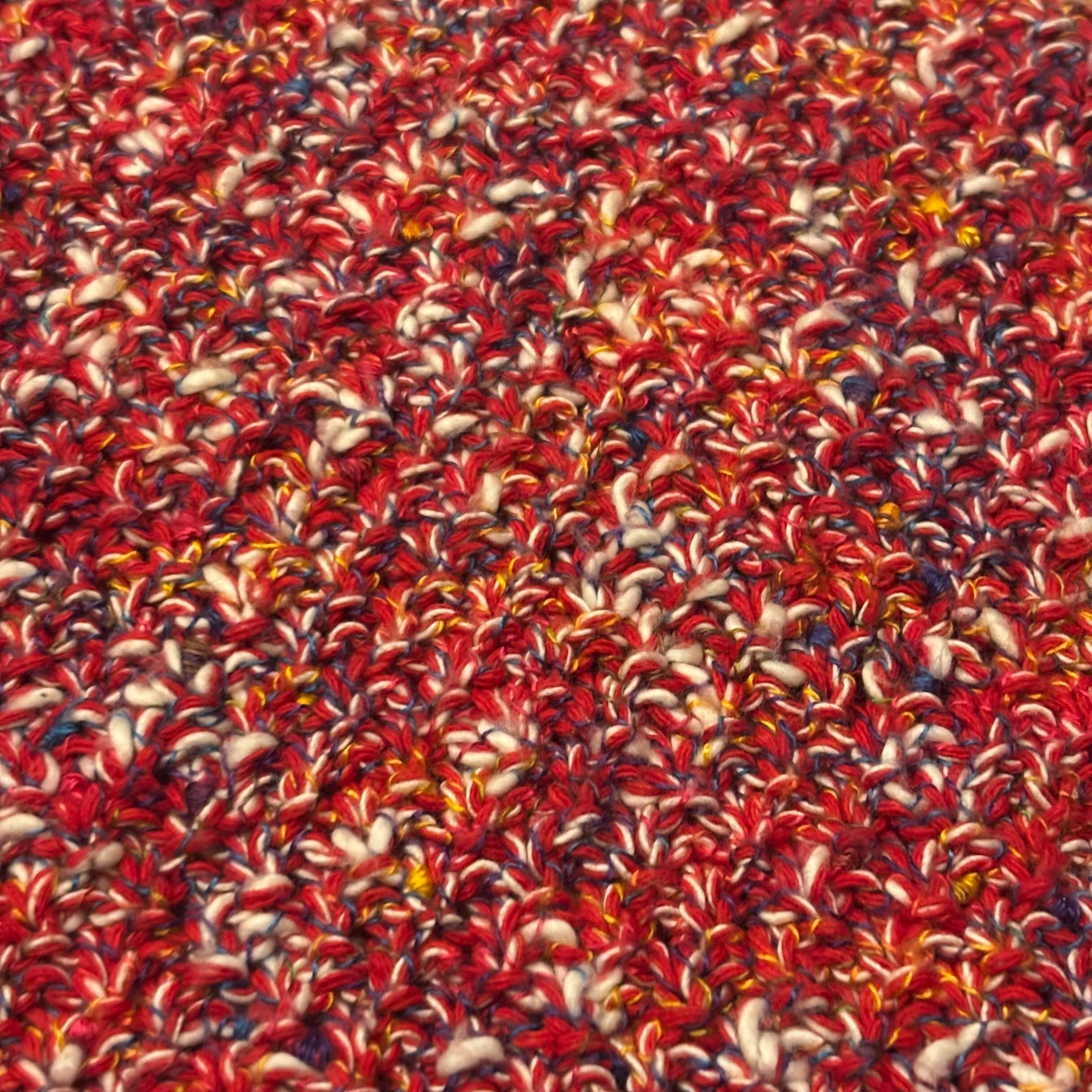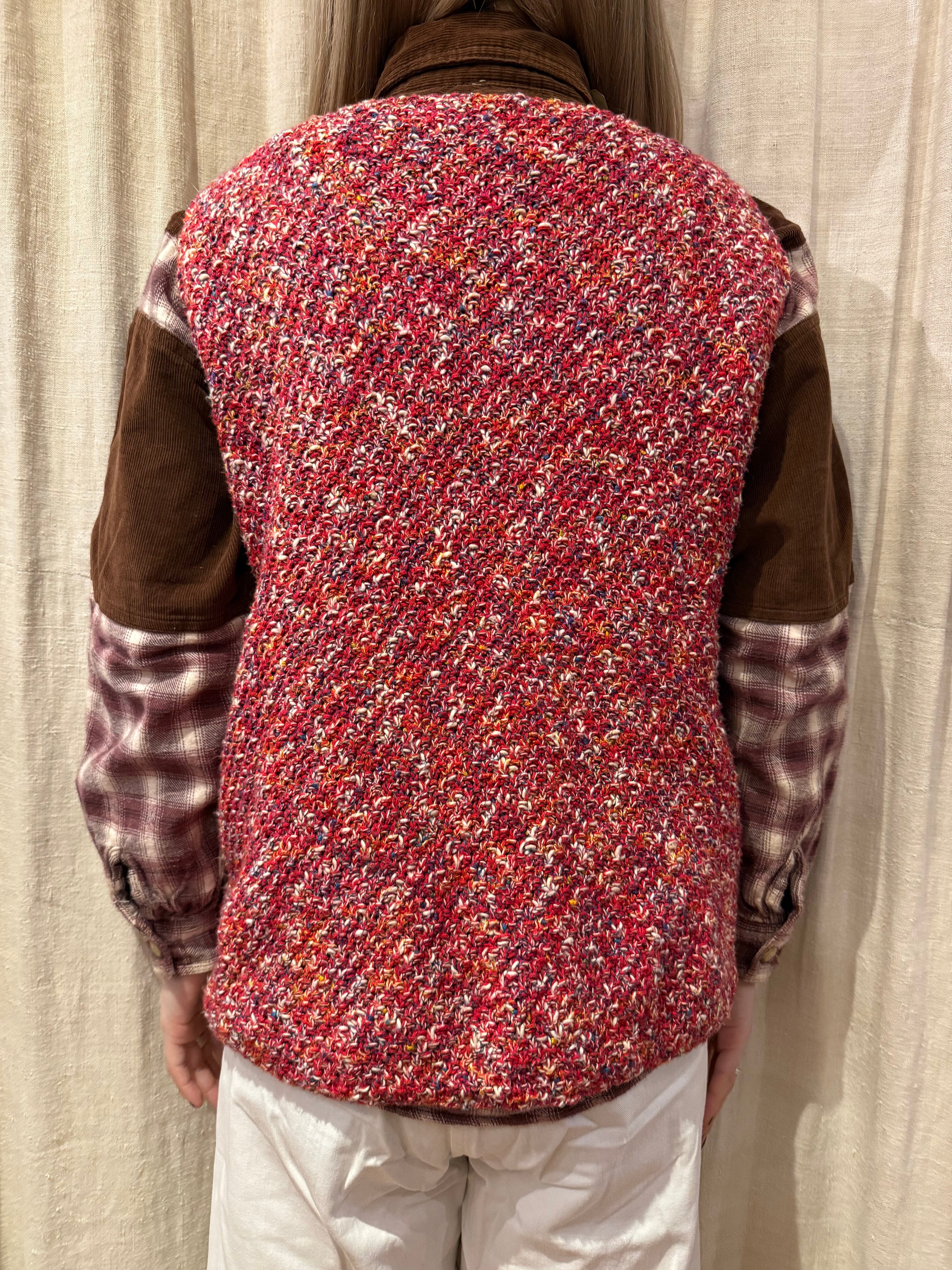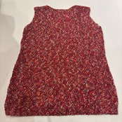 赤ベースに見えますがカラフルなカラーが編み込まれたハンドニットベスト。アームホールはキュッとしていて四角いシルエットです。チクチクしない素材なので気軽に着れるのでおすすめです。