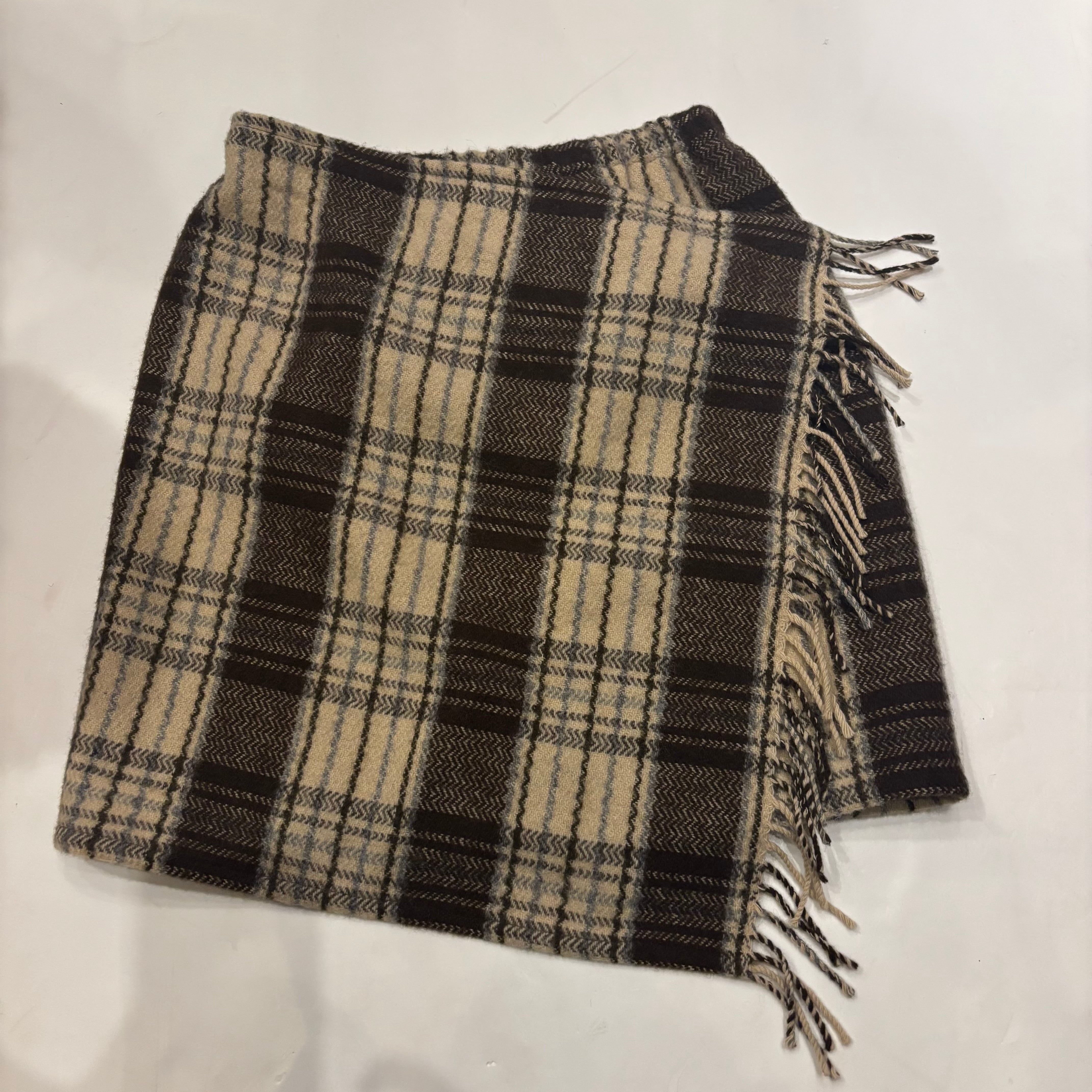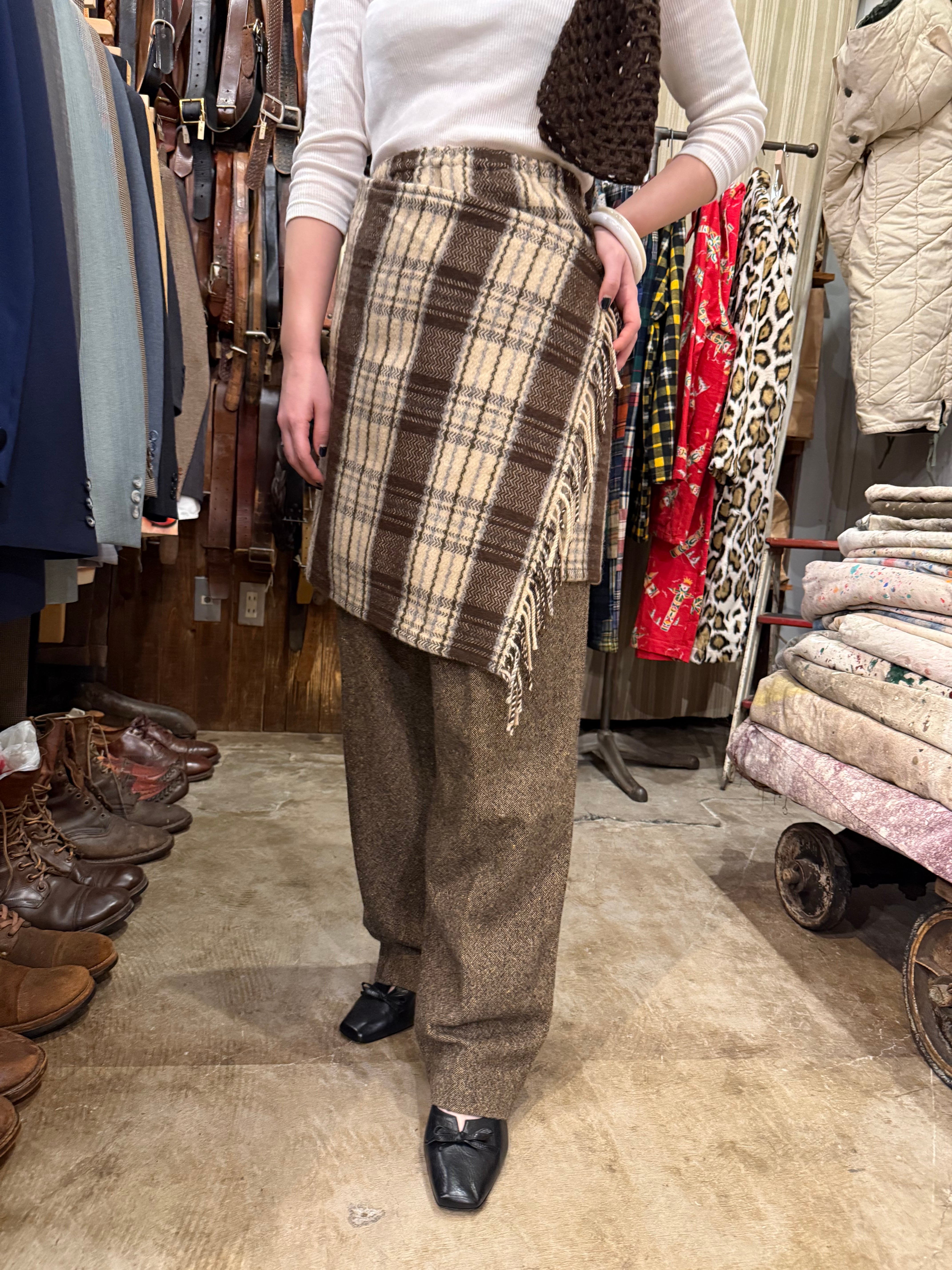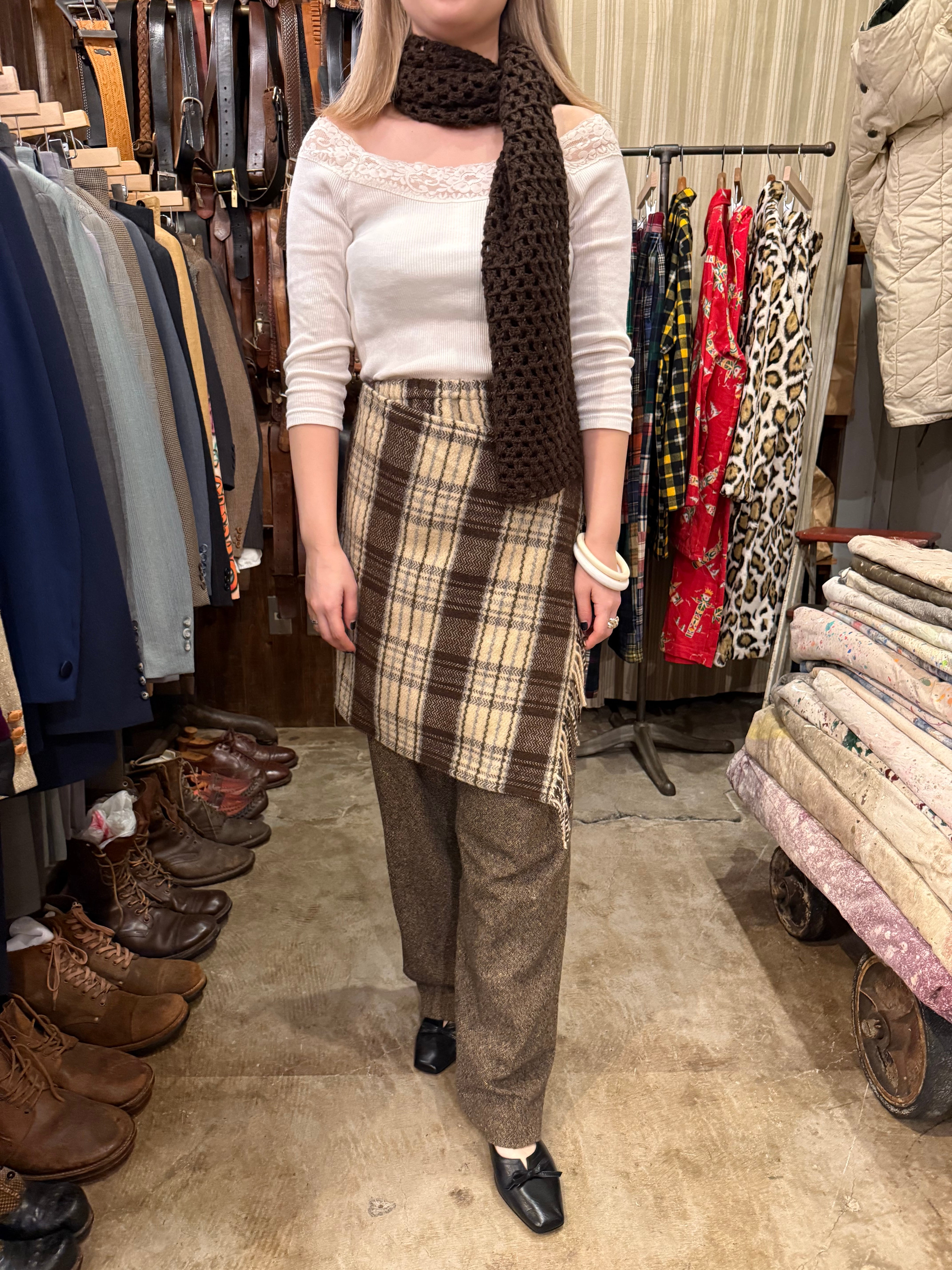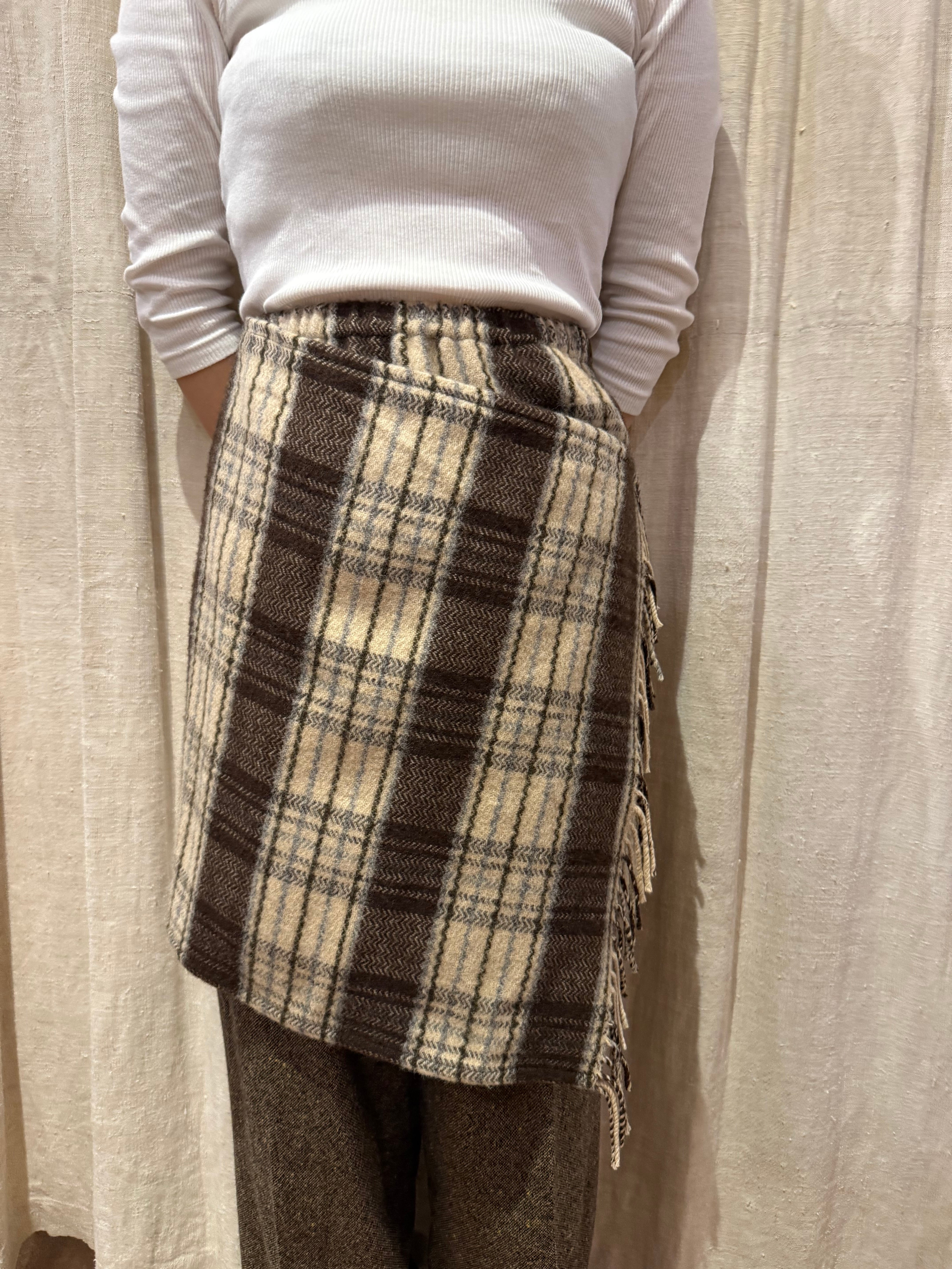 ウール素材で暖かく、ブラウンカラーが可愛らしいスカート。ラップスカートのようになっていて最後の留める部分は斜めになっています。裾はフリンジみたいになっているのでシンプルながらも存在感があります。