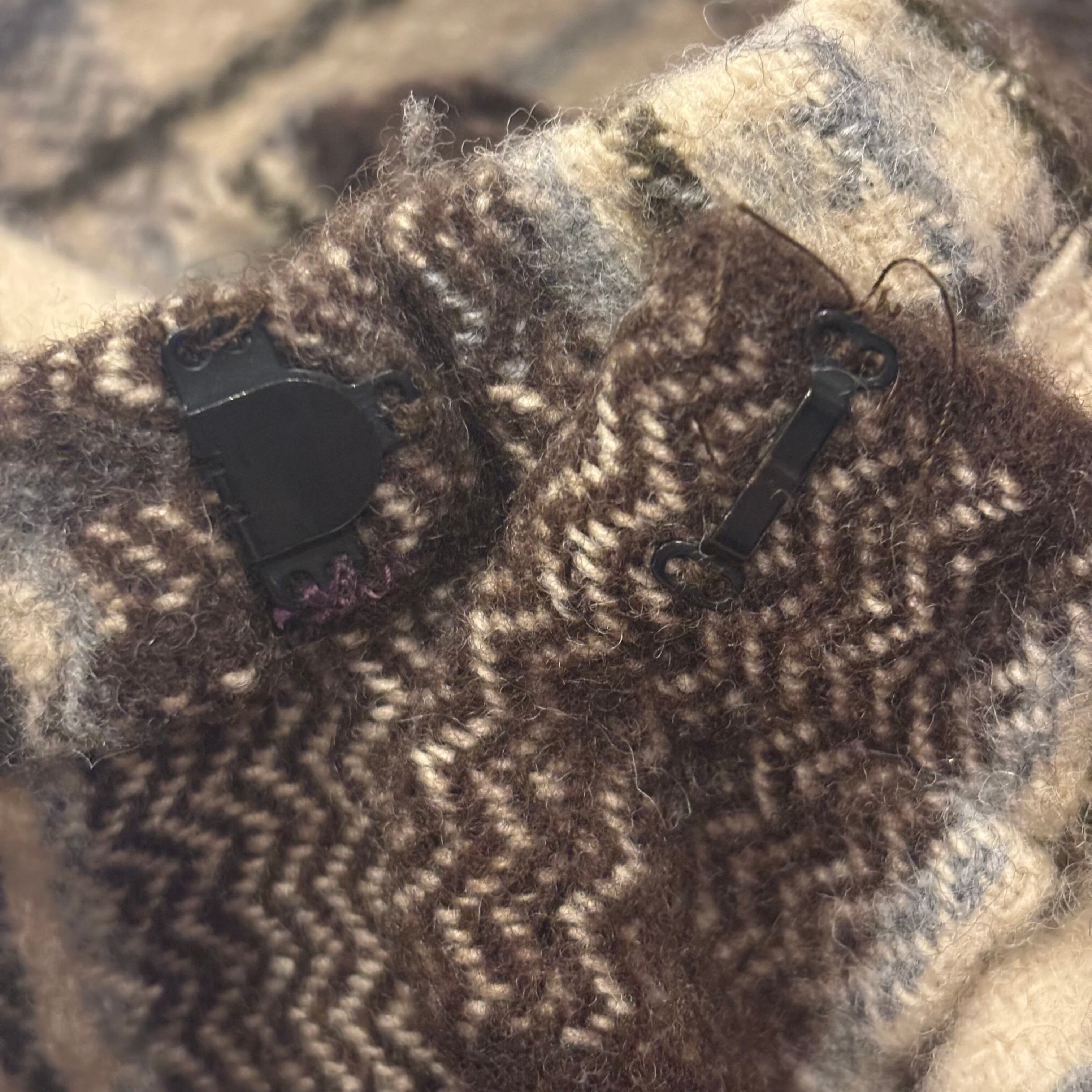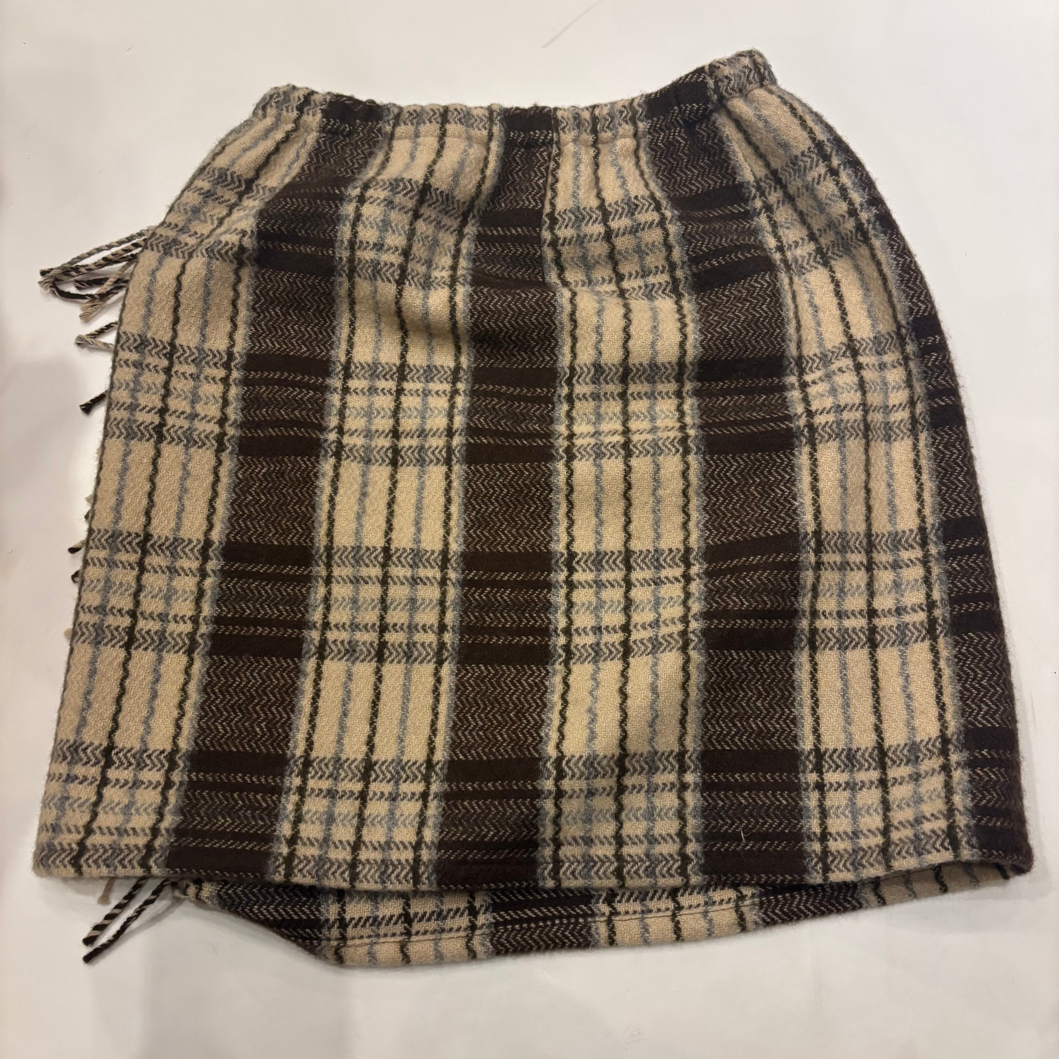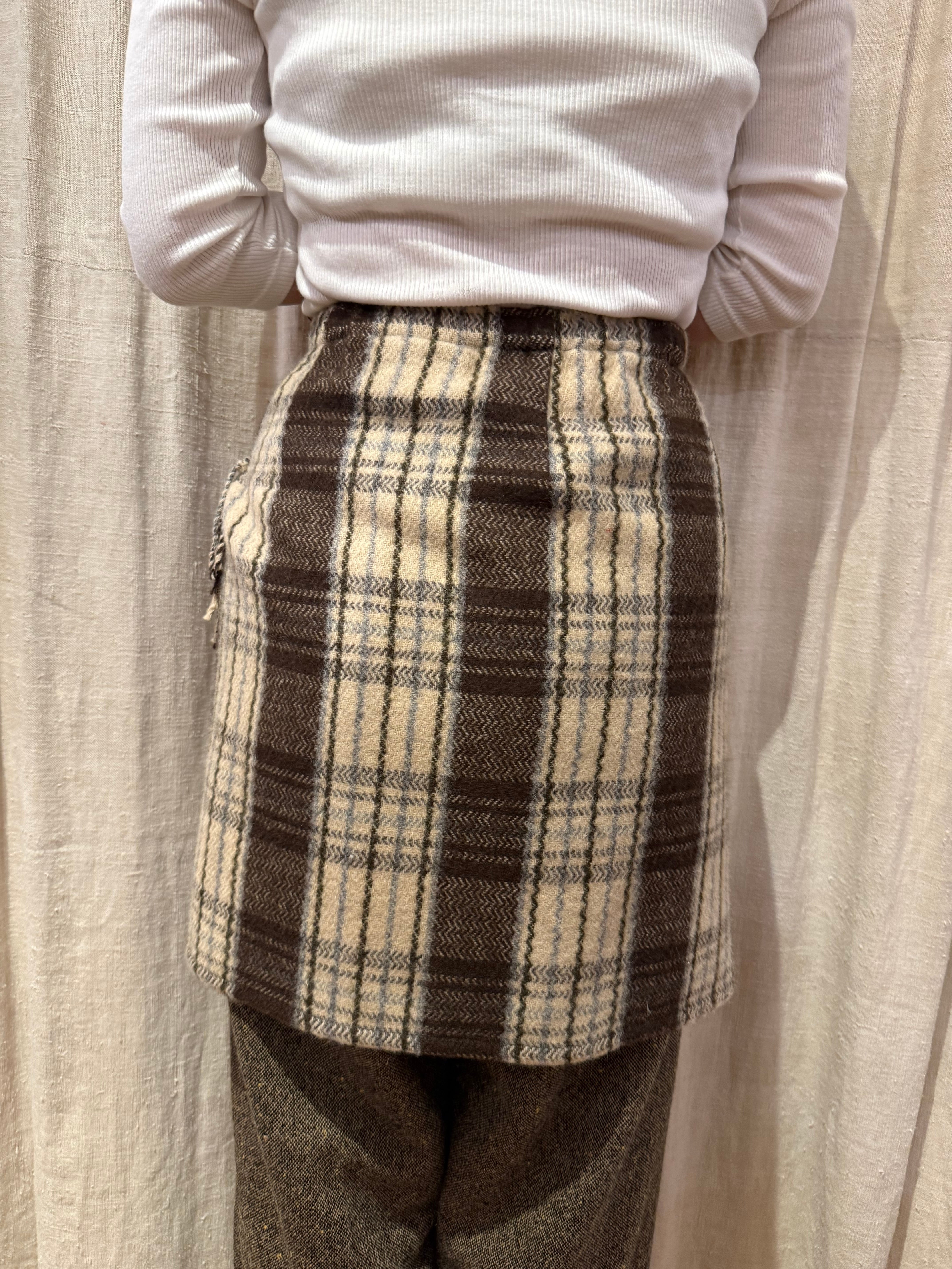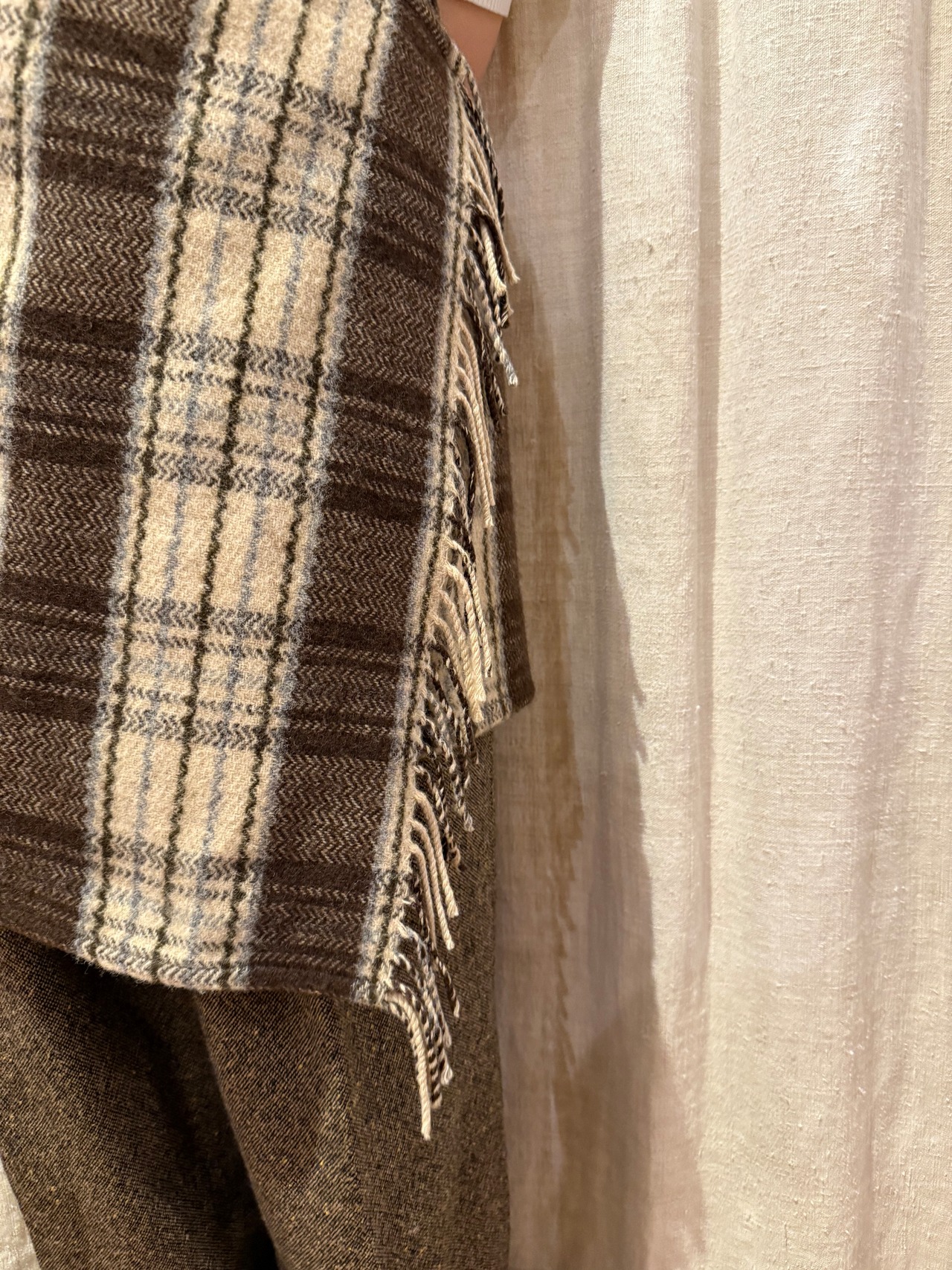 ウール素材で暖かく、ブラウンカラーが可愛らしいスカート。ラップスカートのようになっていて最後の留める部分は斜めになっています。裾はフリンジみたいになっているのでシンプルながらも存在感があります。