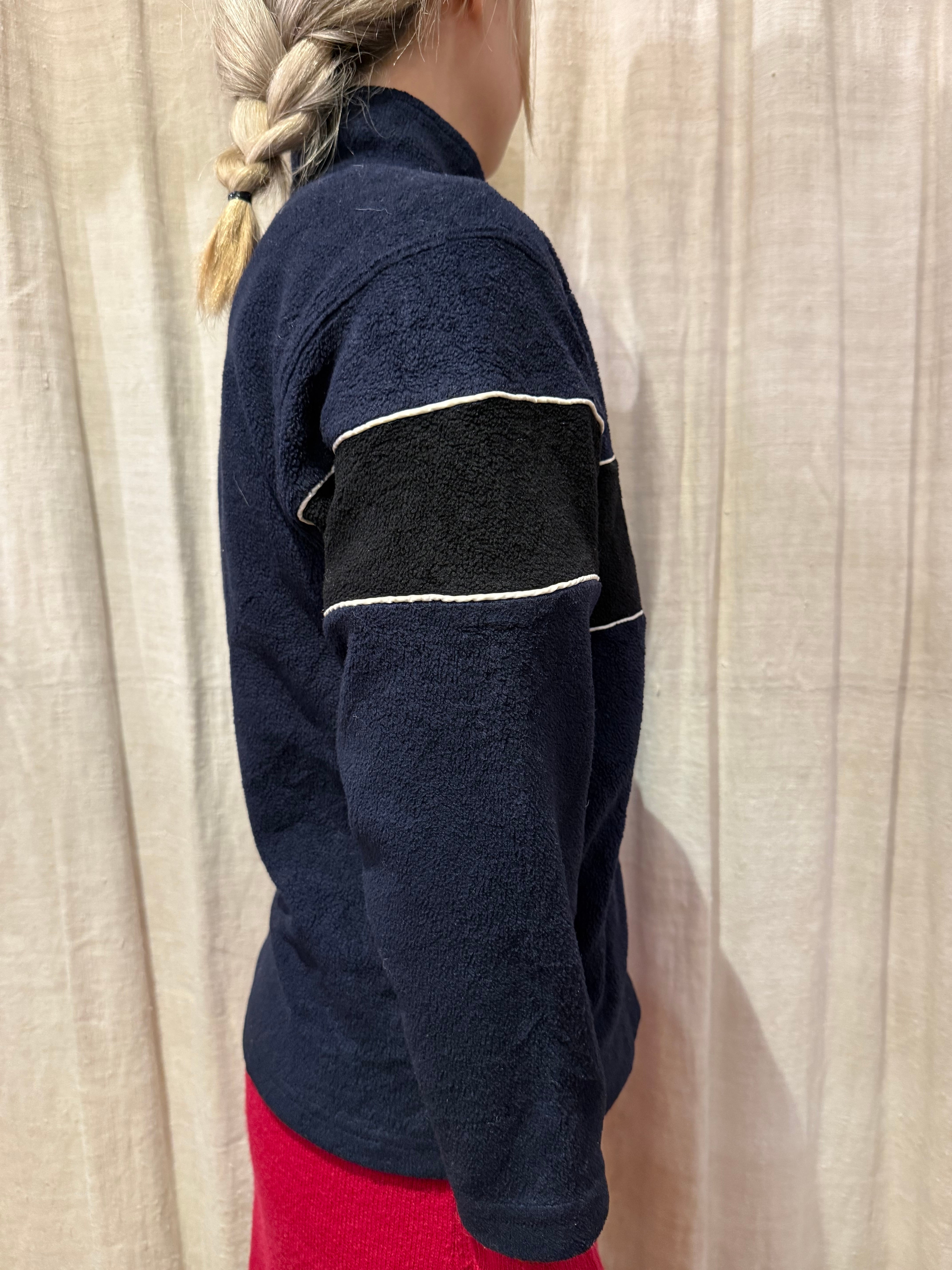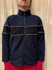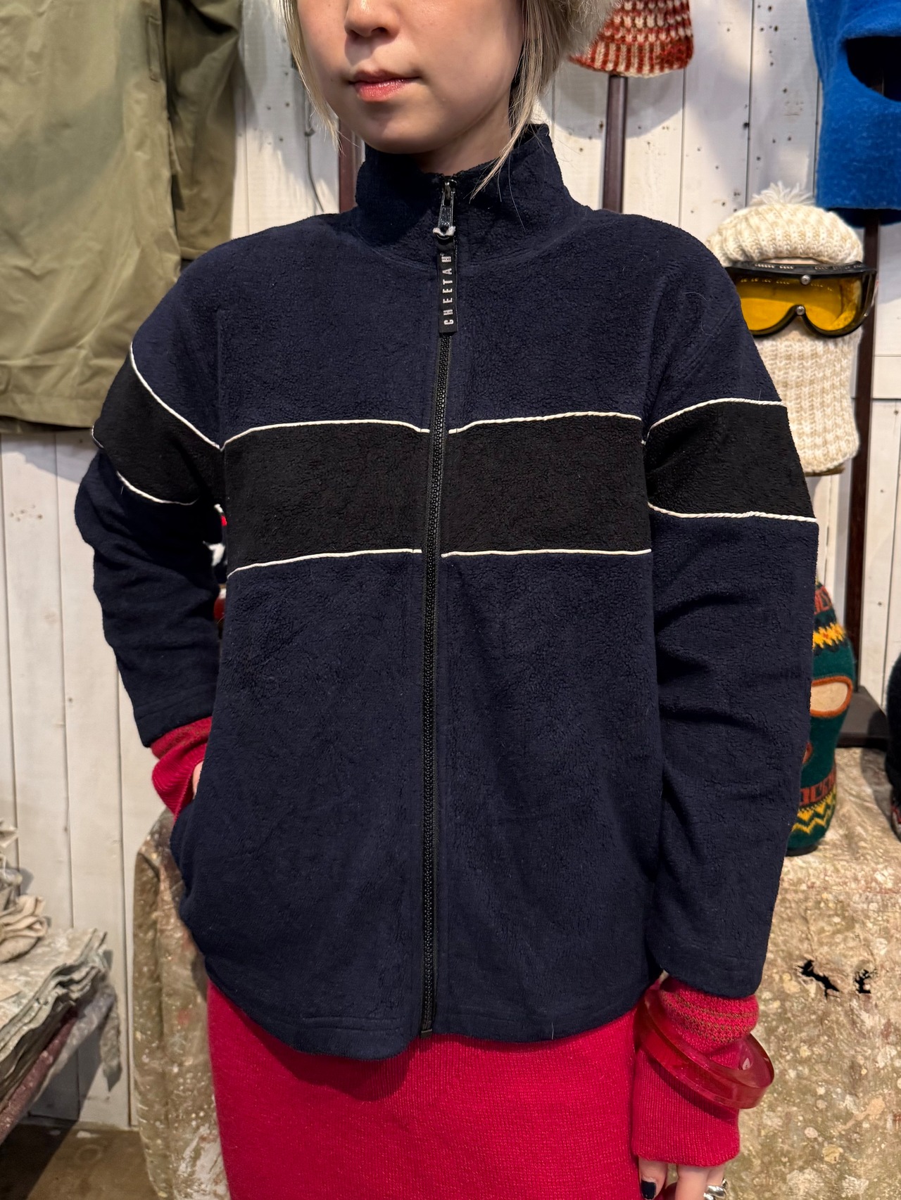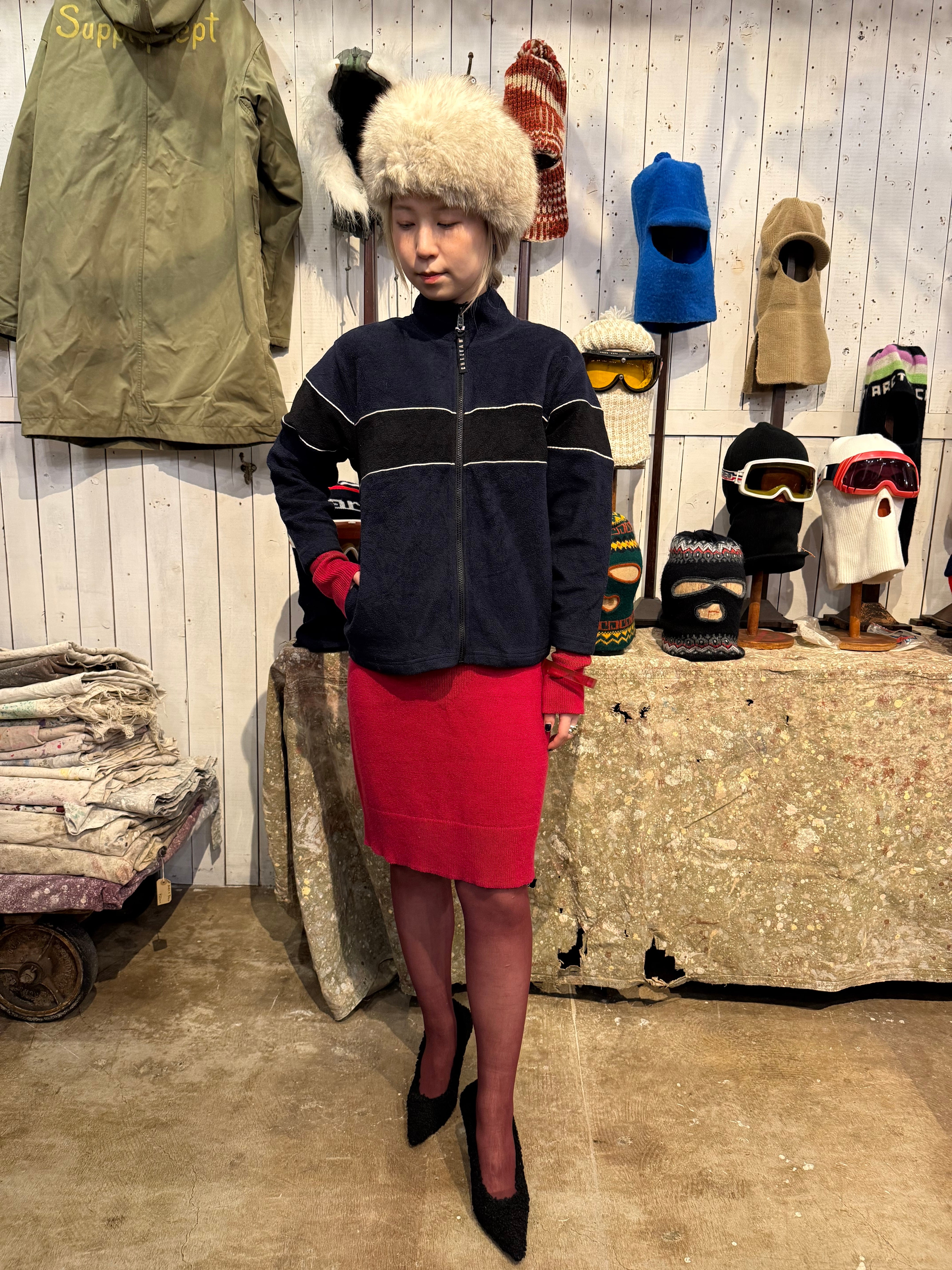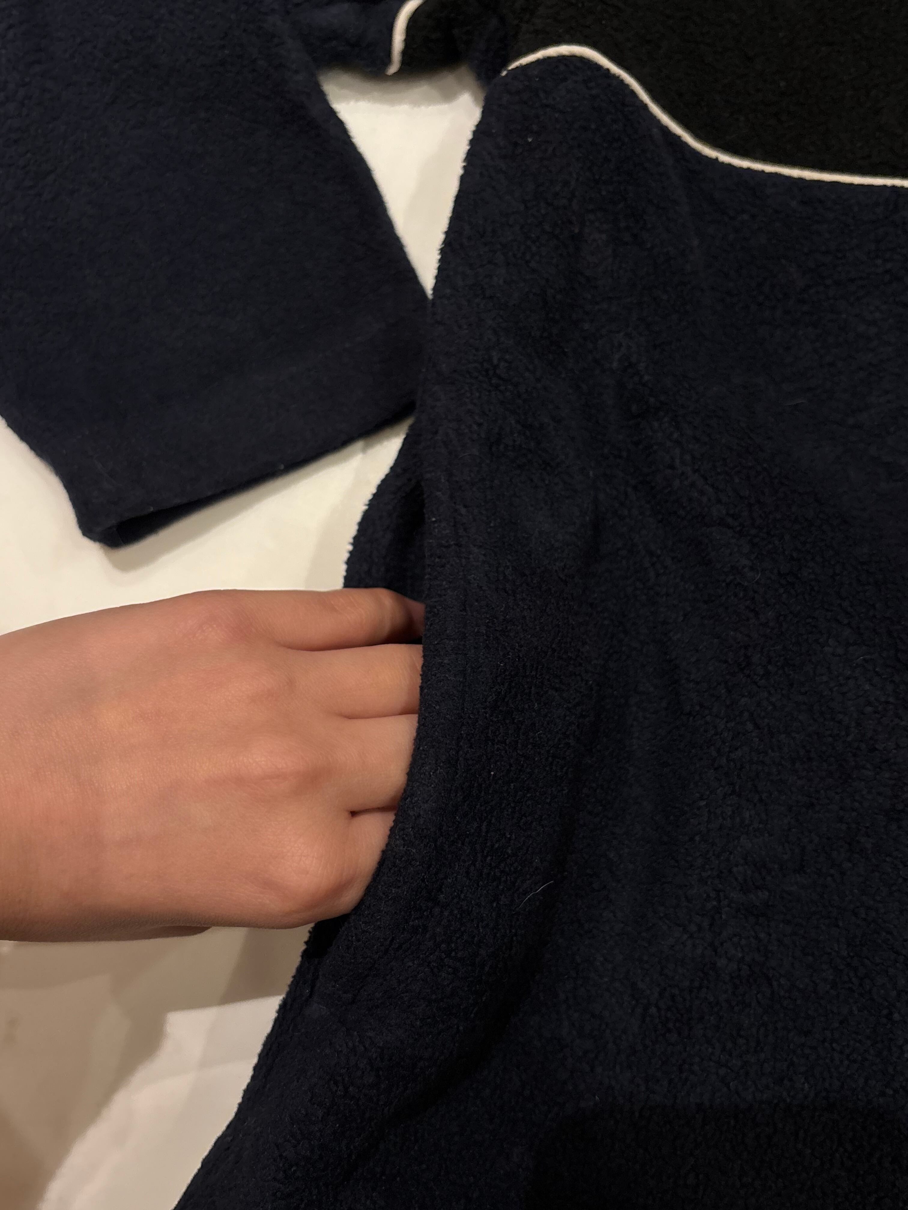 フリース素材なので暖かく程よいサイズ感で、インナーにもアウターにも出来るアイテム。真ん中のラインはよく見るとブラックでツートーンになっていて白くパイピングの様になっています。暗めのカラーで合わせやすくおすすめです。