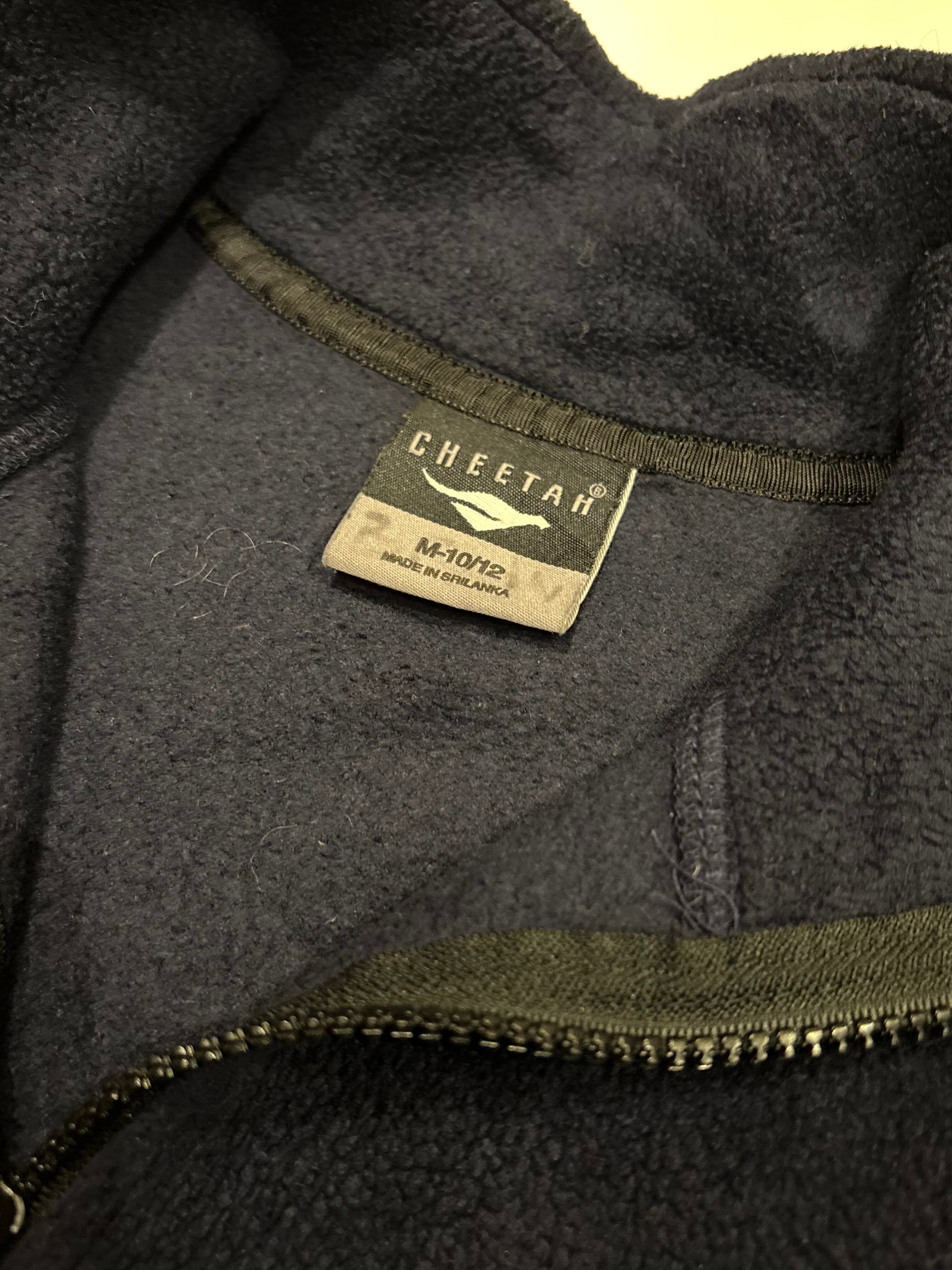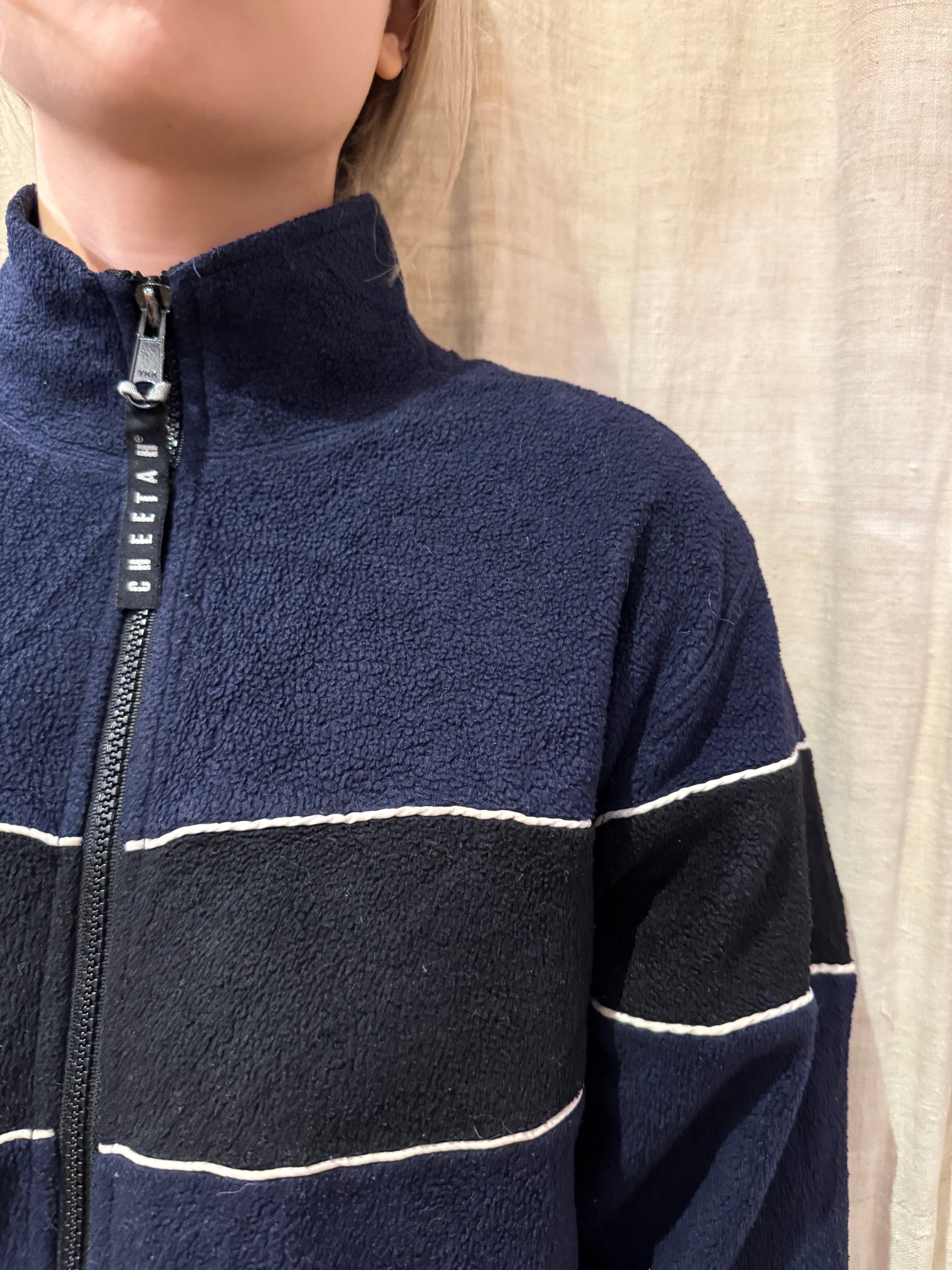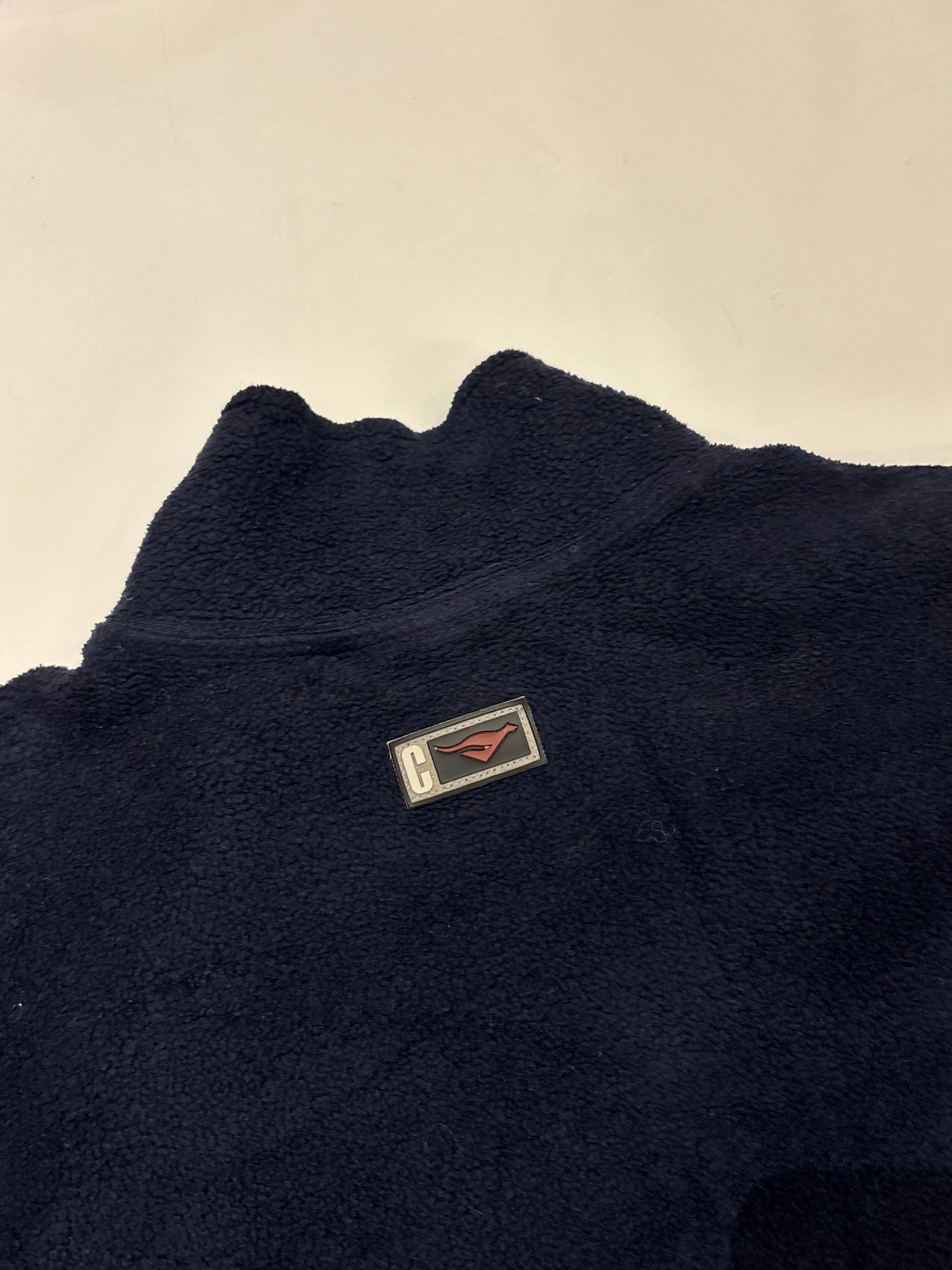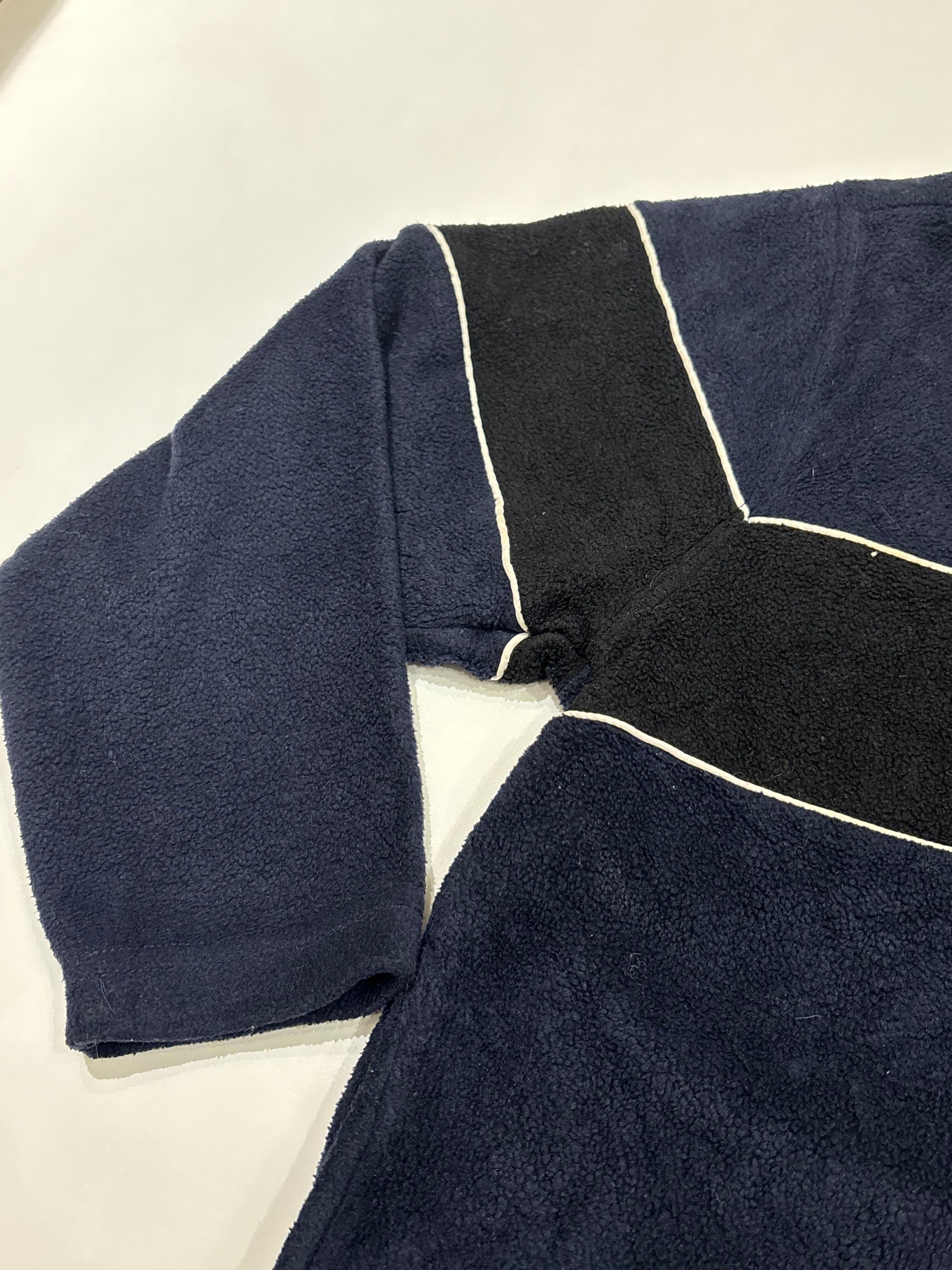 フリース素材なので暖かく程よいサイズ感で、インナーにもアウターにも出来るアイテム。真ん中のラインはよく見るとブラックでツートーンになっていて白くパイピングの様になっています。暗めのカラーで合わせやすくおすすめです。