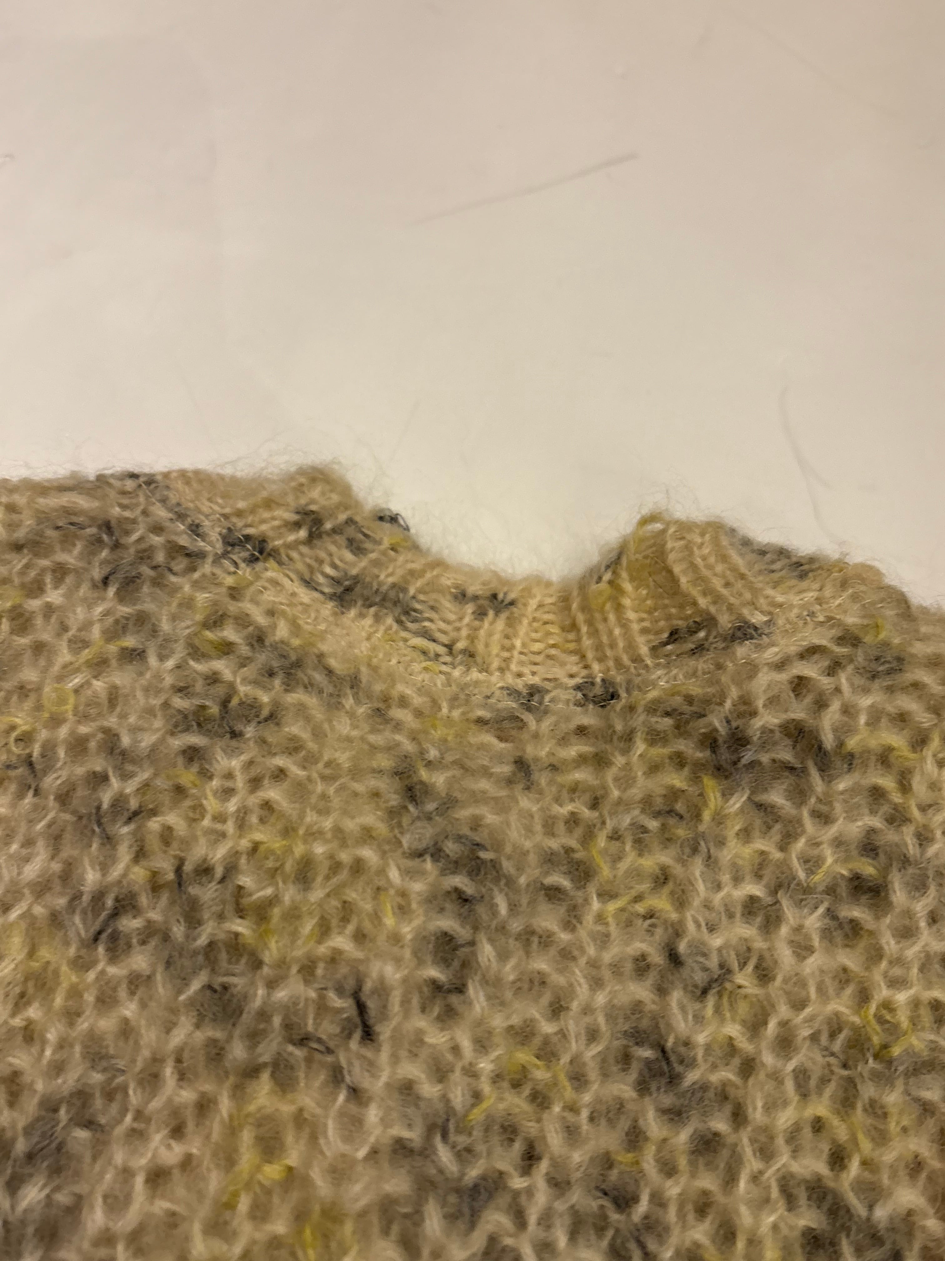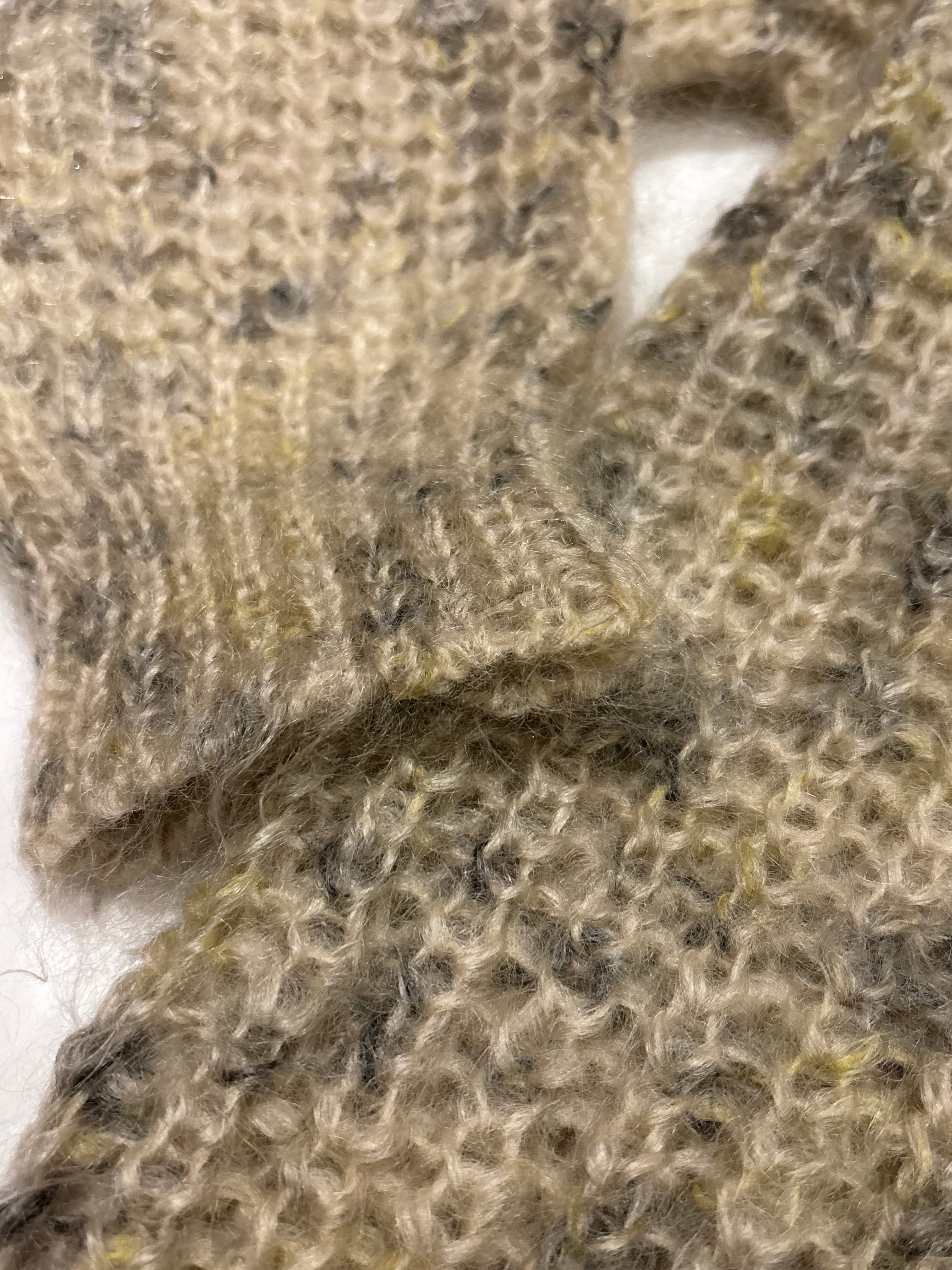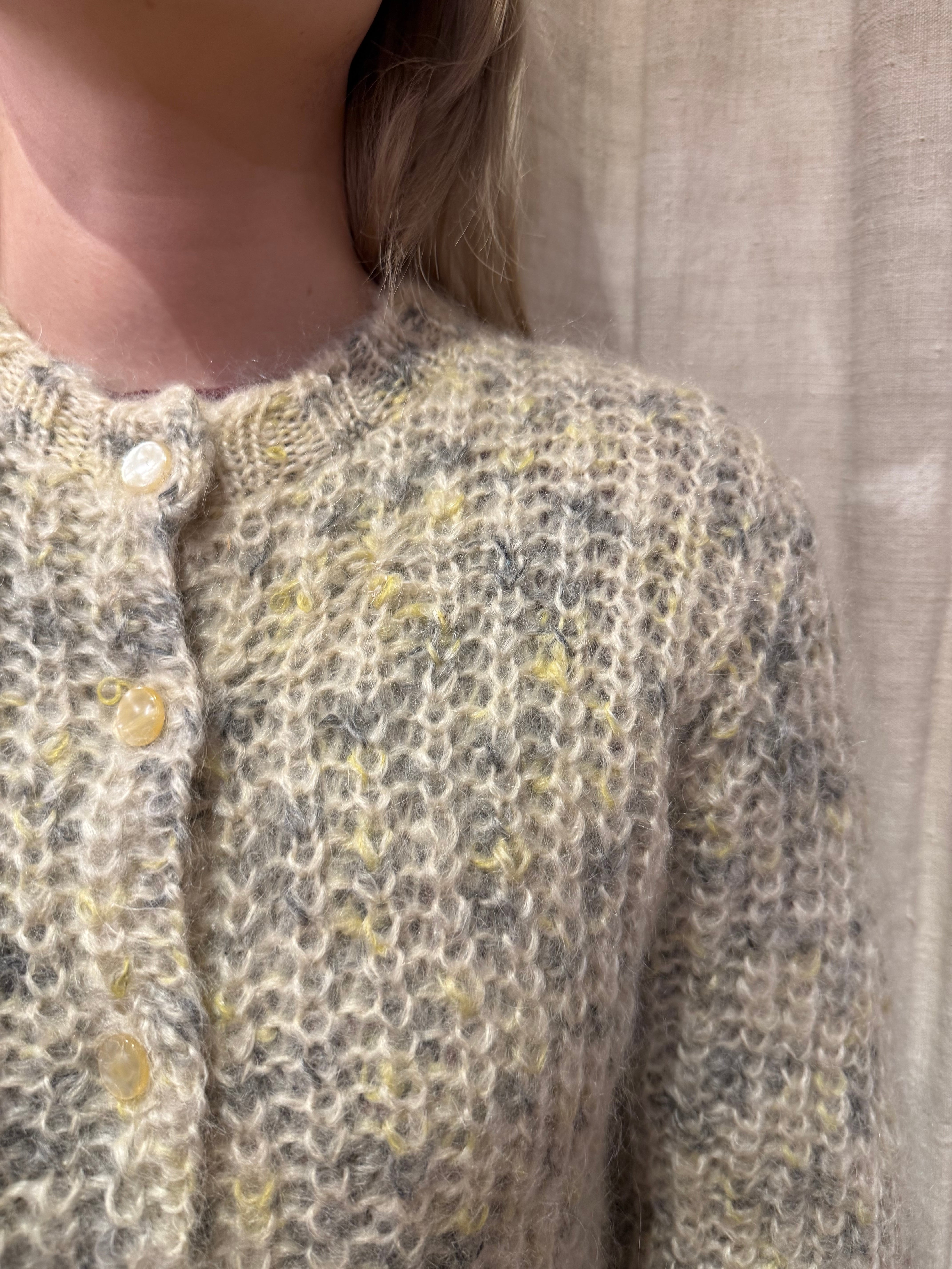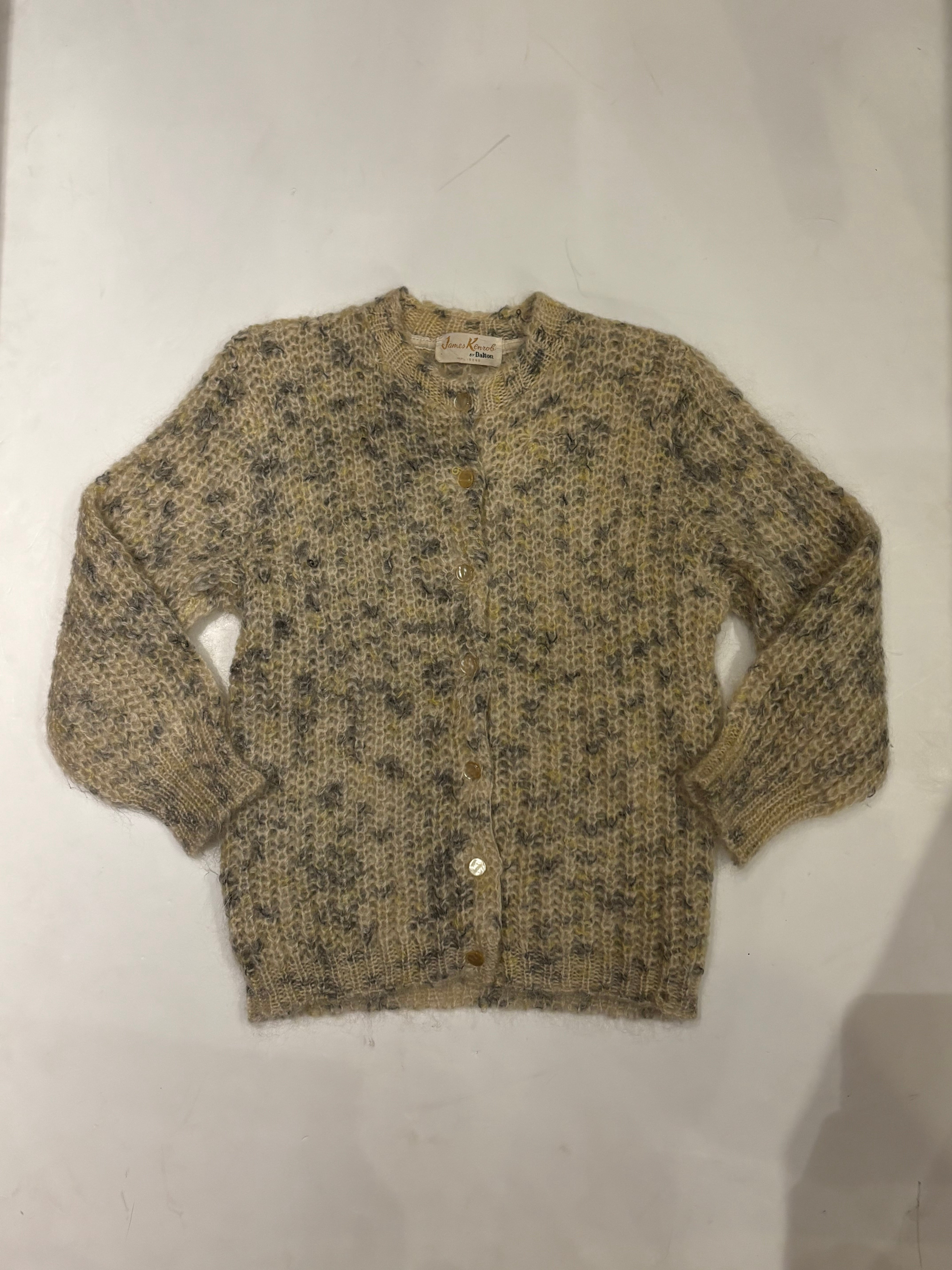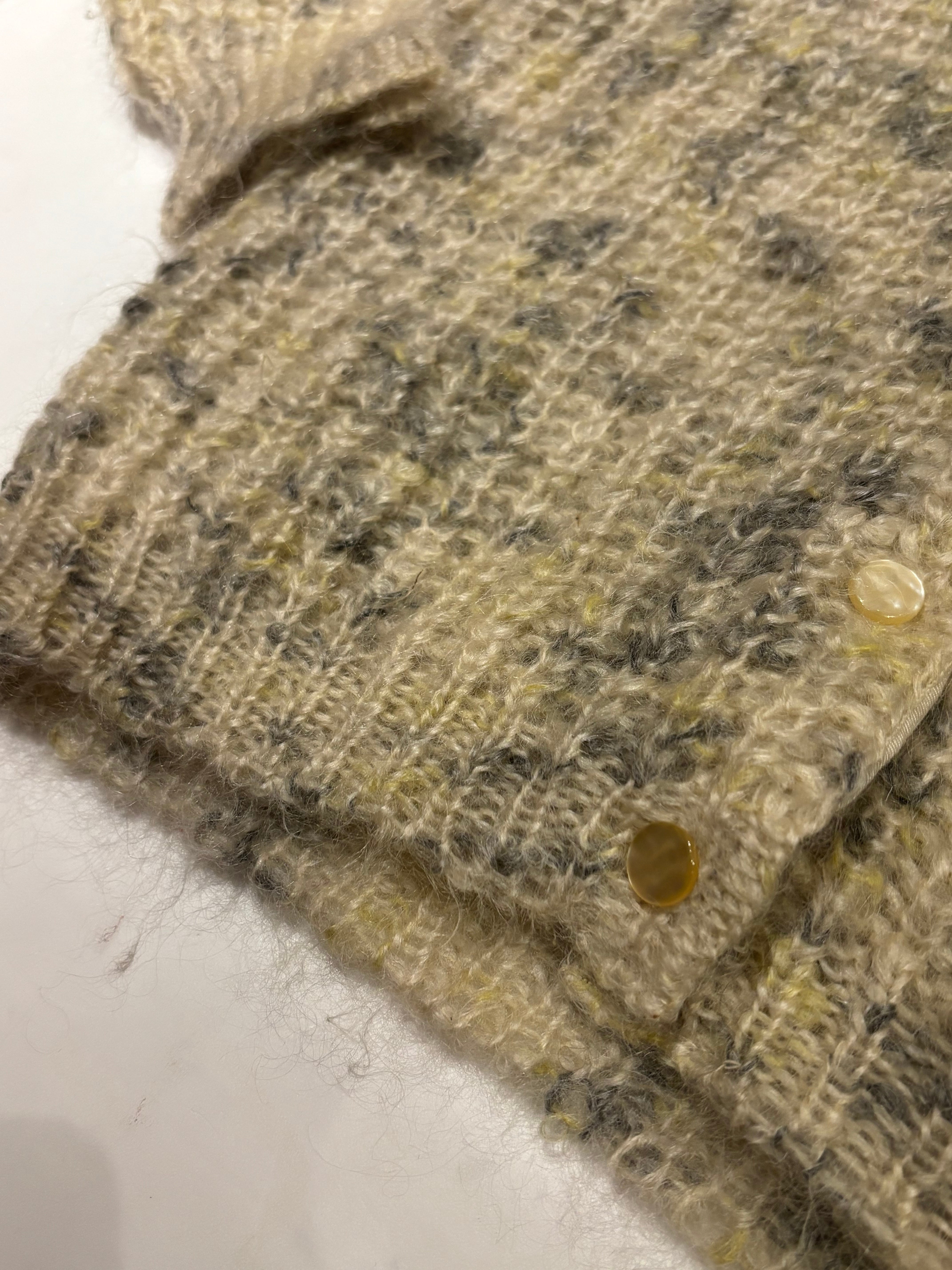 フワフワとした見た目のモヘヤカーディガン。クリーム色に混ざったグレーや黄色のカラーの可愛らしいアイテム。モヘヤなので暖かく、サイズ感も小さめで可愛らしいです。これからの季節にぴったりです。