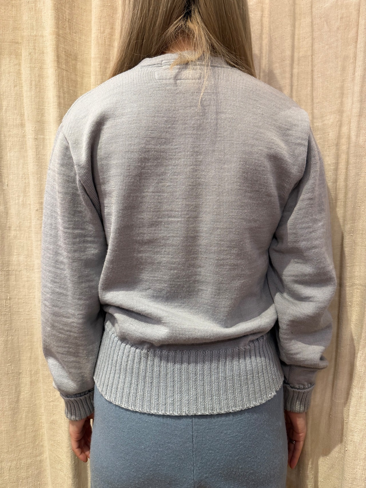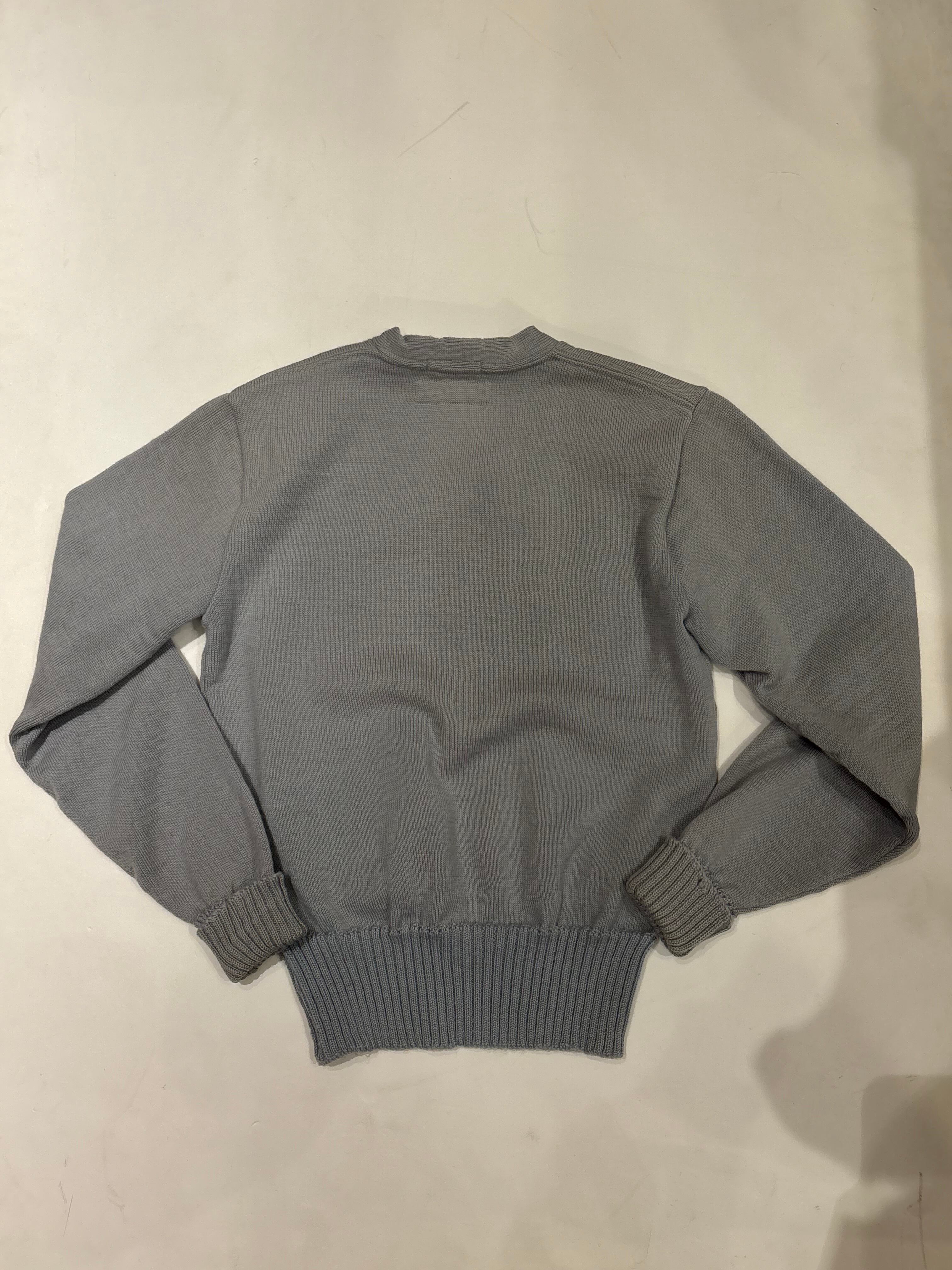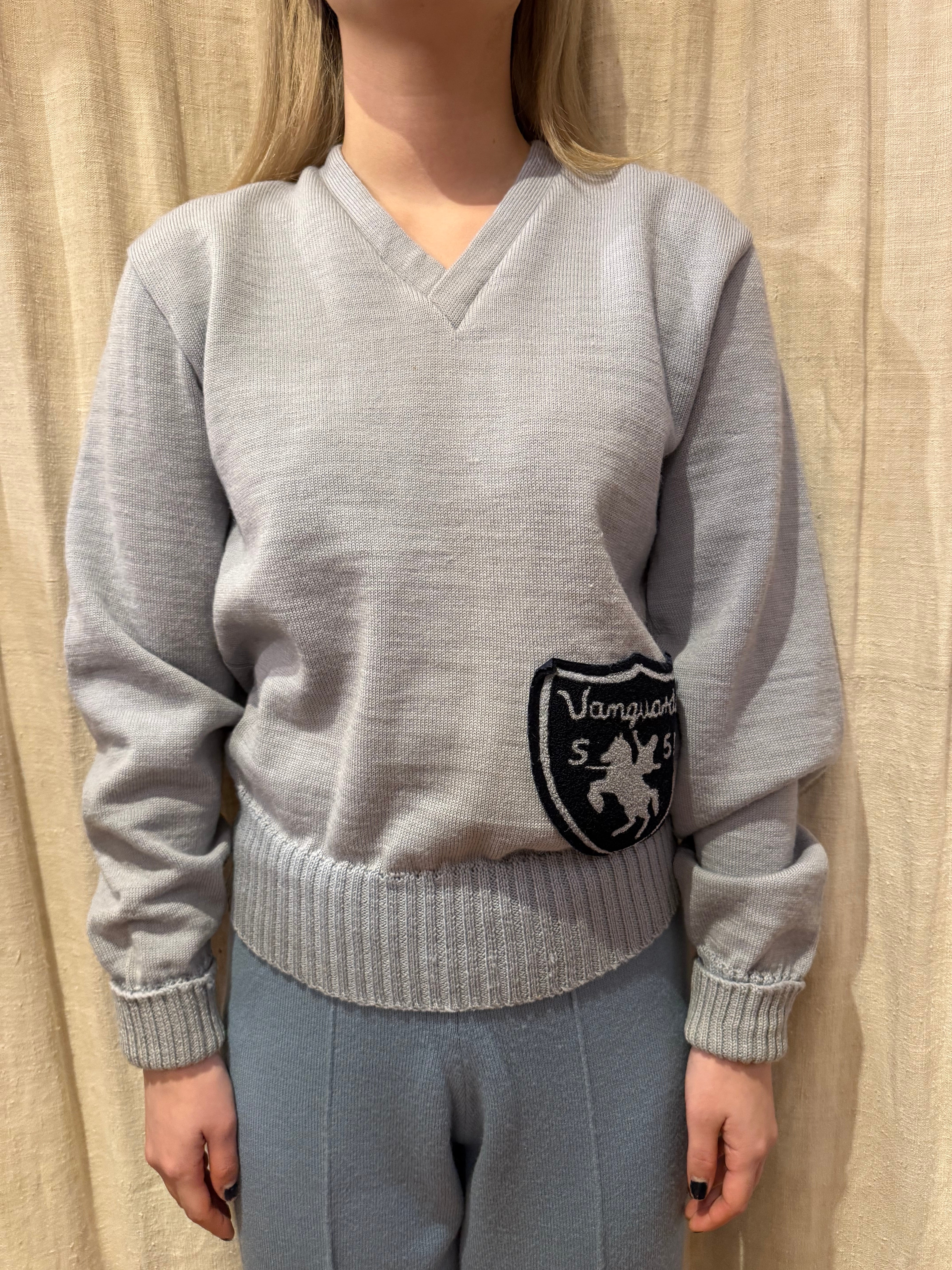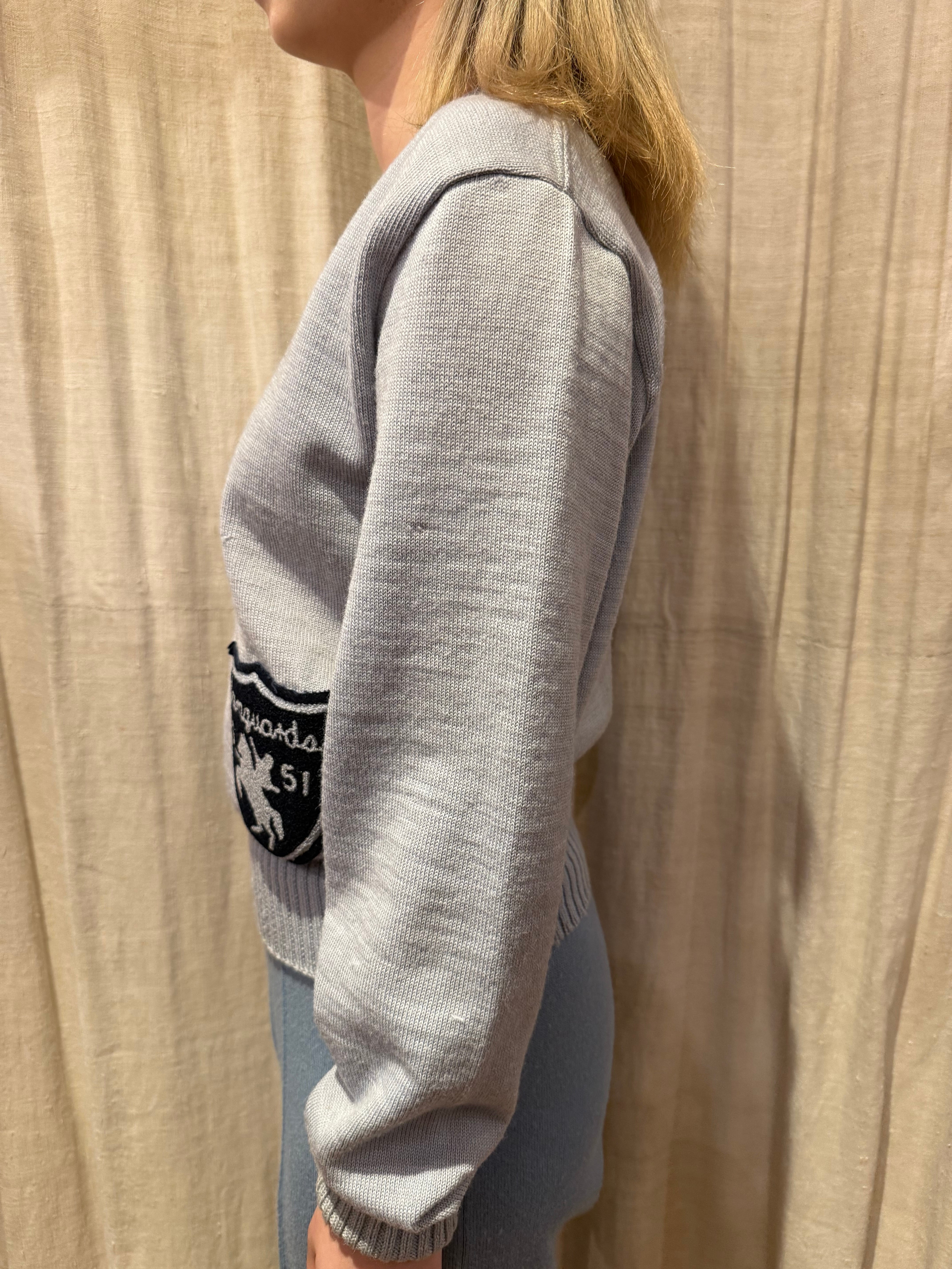 古いレタードニット。グレーの様なくすんだブルーのような絶妙なカラーです。リブがしっかりきいていて、左下にはワッペンがついております。ヴィンテージ好きにはたまらない一着です。