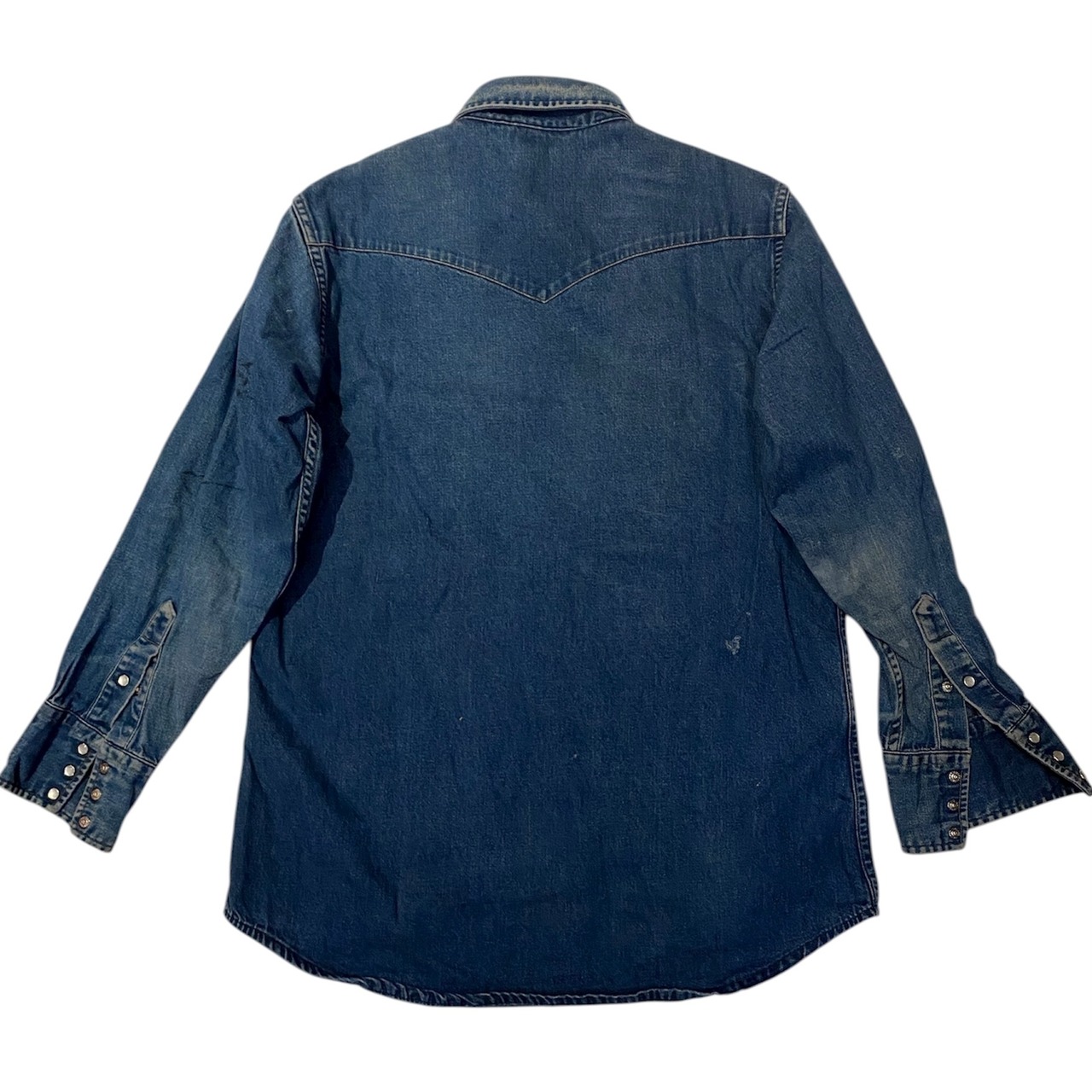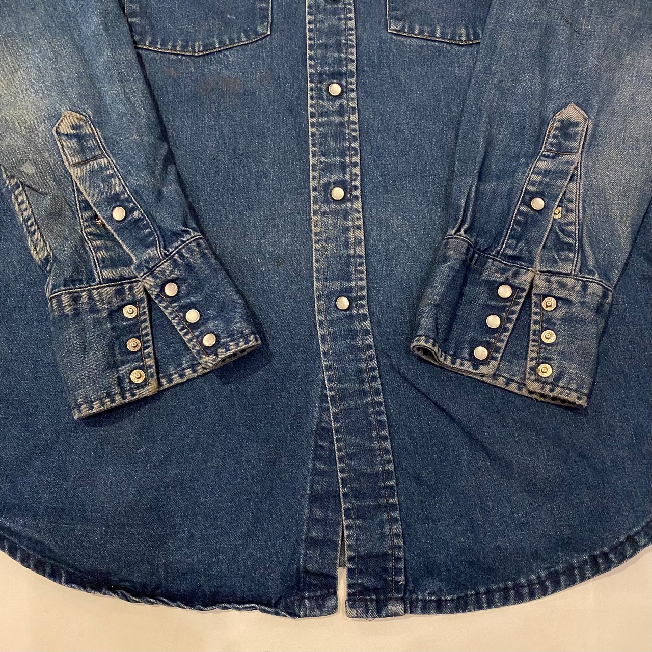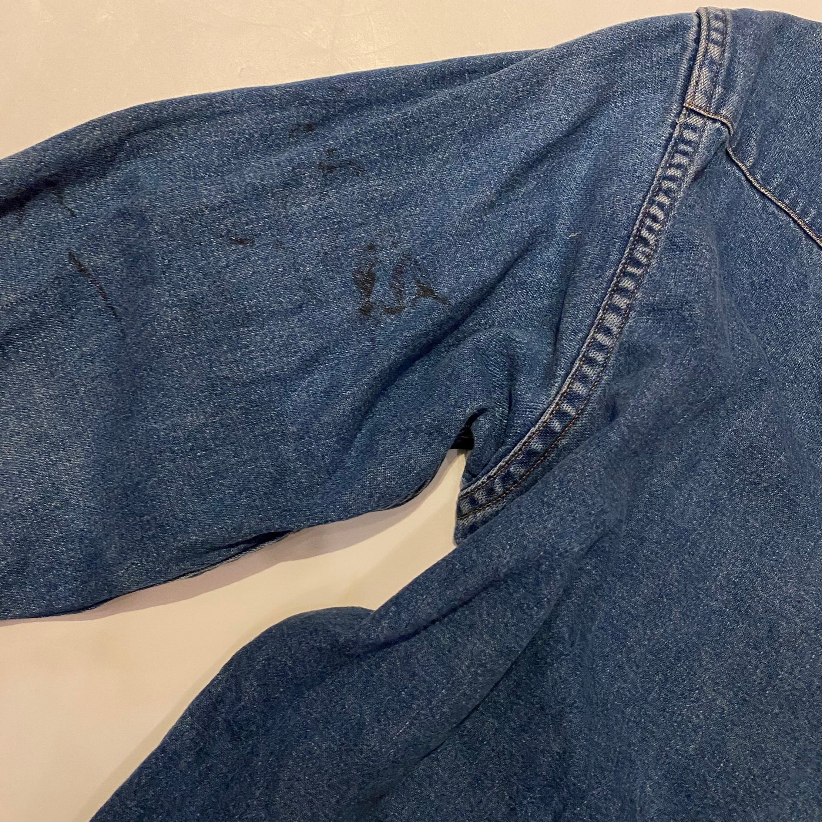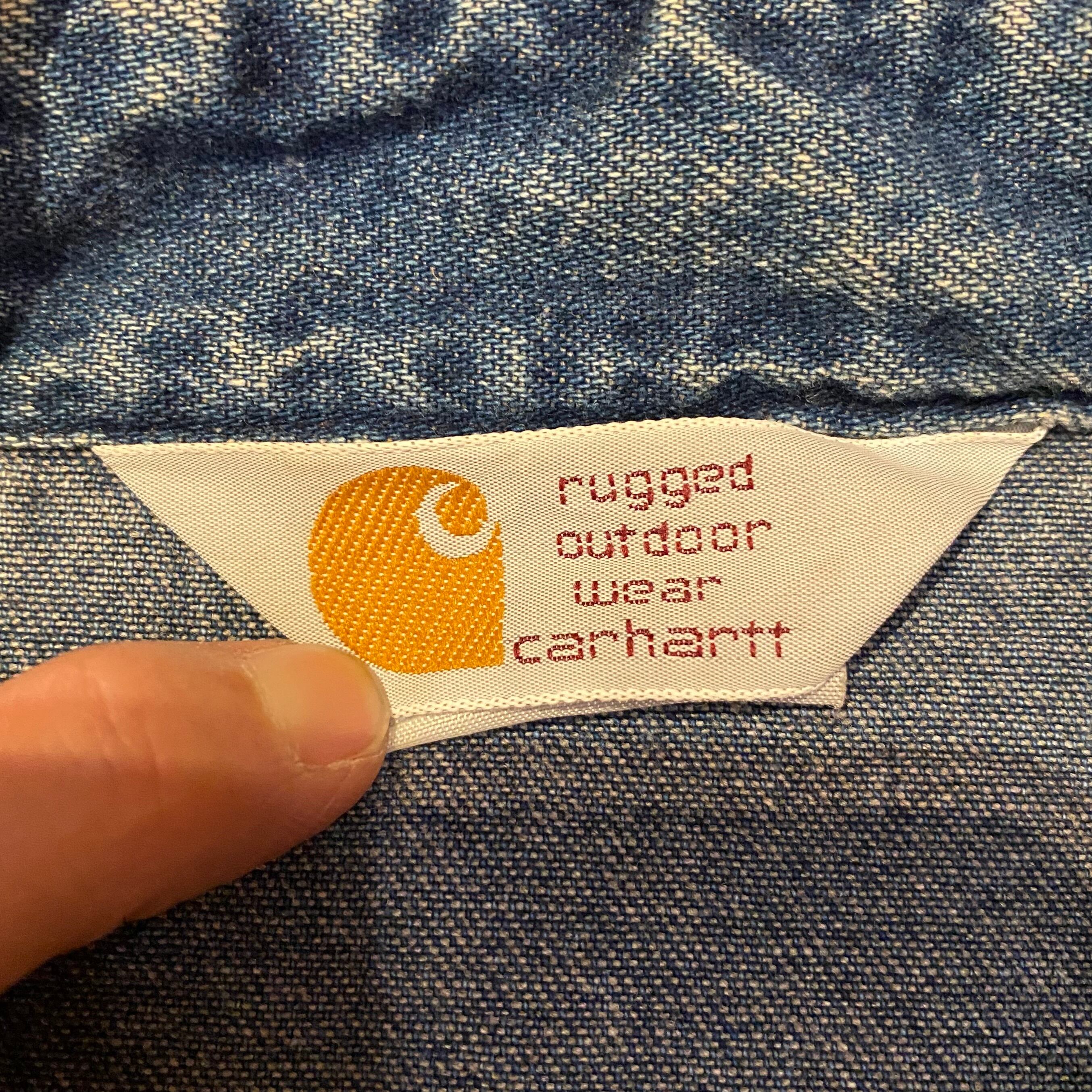 カーハートのデニムシャツになります。フロントスナップボタン仕様です。デニム地がしっかりと厚みがあり身幅が大きめなのが良くがばっと着れるサイズ感になります。デニムの色目も濃いめで、あたりや色落ちも雰囲気があり格好良いです。※後ろ身頃真ん中付近に小さいダメージ有り。右袖ひじ後ろにペンキ汚れ、左袖後ろに黒っぽい汚れ、フロントポケット下うっすら塗料汚れなどあります。