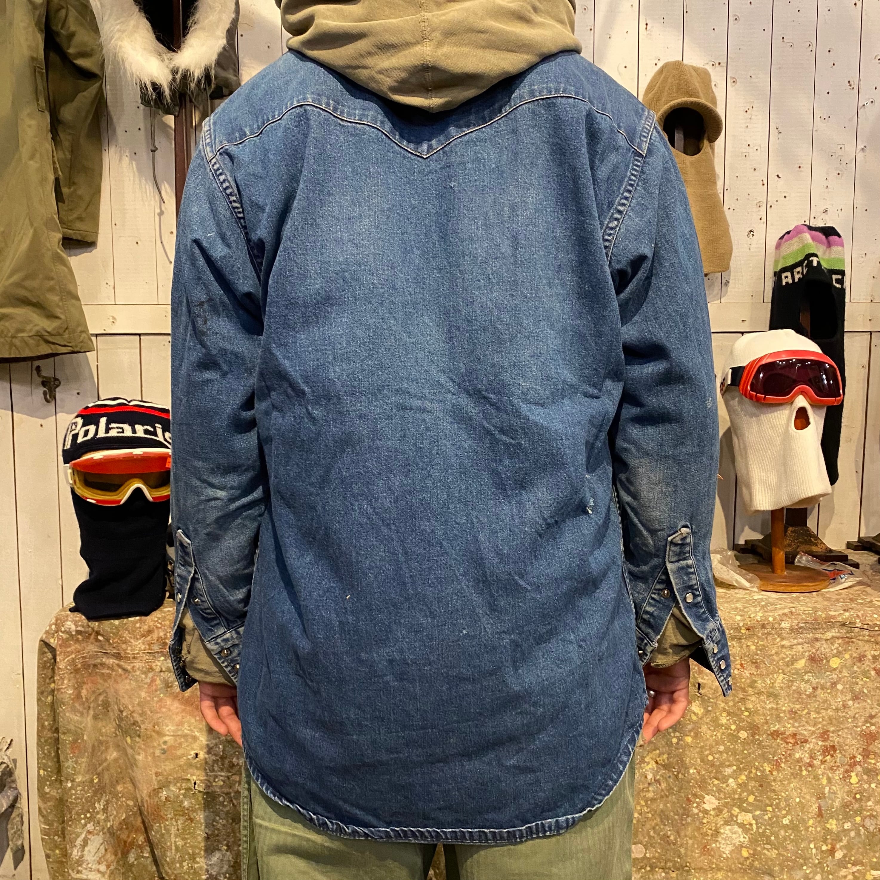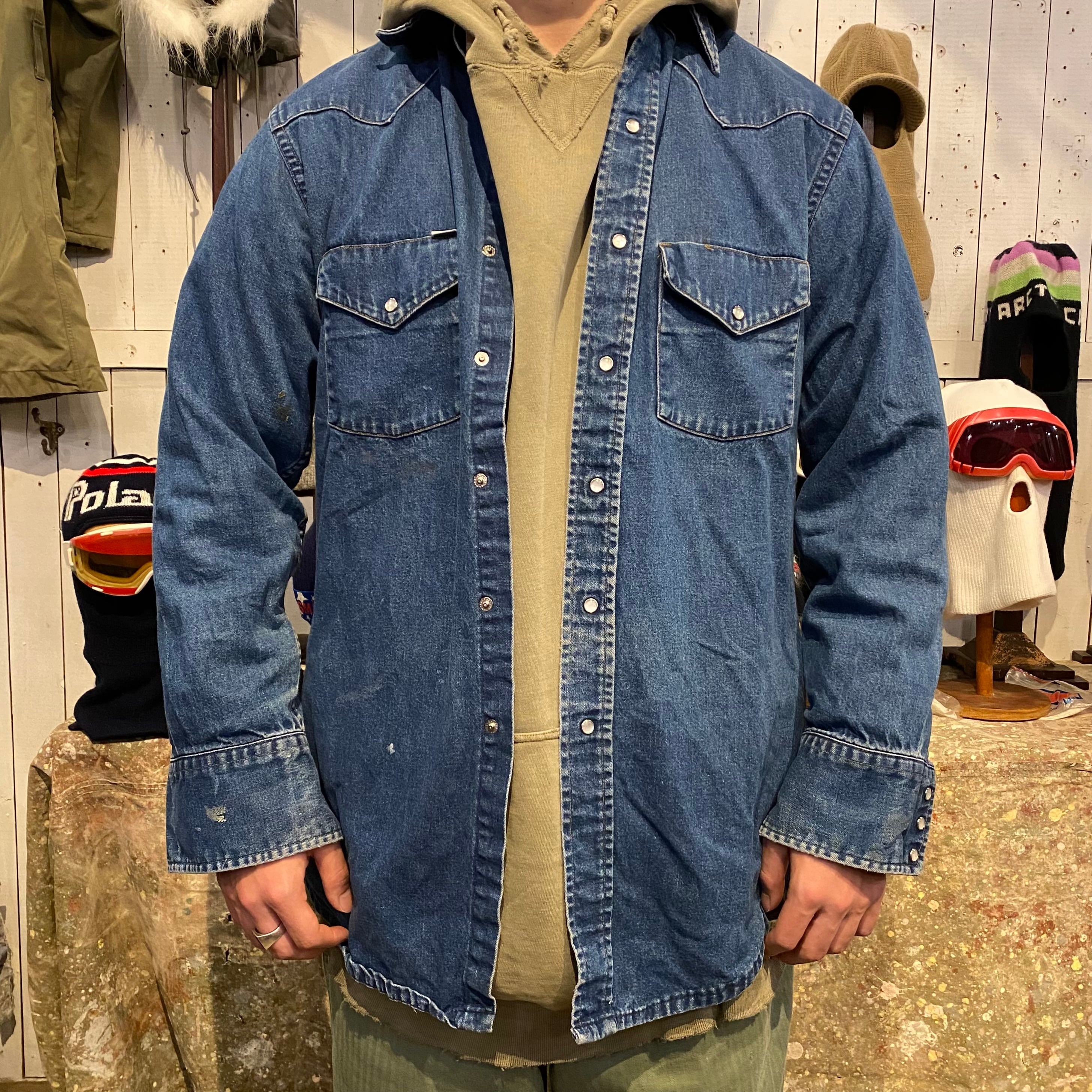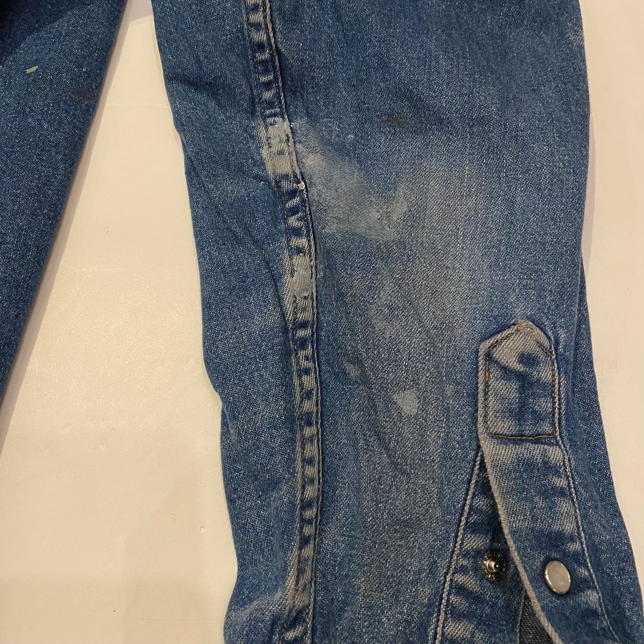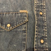 カーハートのデニムシャツになります。フロントスナップボタン仕様です。デニム地がしっかりと厚みがあり身幅が大きめなのが良くがばっと着れるサイズ感になります。デニムの色目も濃いめで、あたりや色落ちも雰囲気があり格好良いです。※後ろ身頃真ん中付近に小さいダメージ有り。右袖ひじ後ろにペンキ汚れ、左袖後ろに黒っぽい汚れ、フロントポケット下うっすら塗料汚れなどあります。