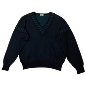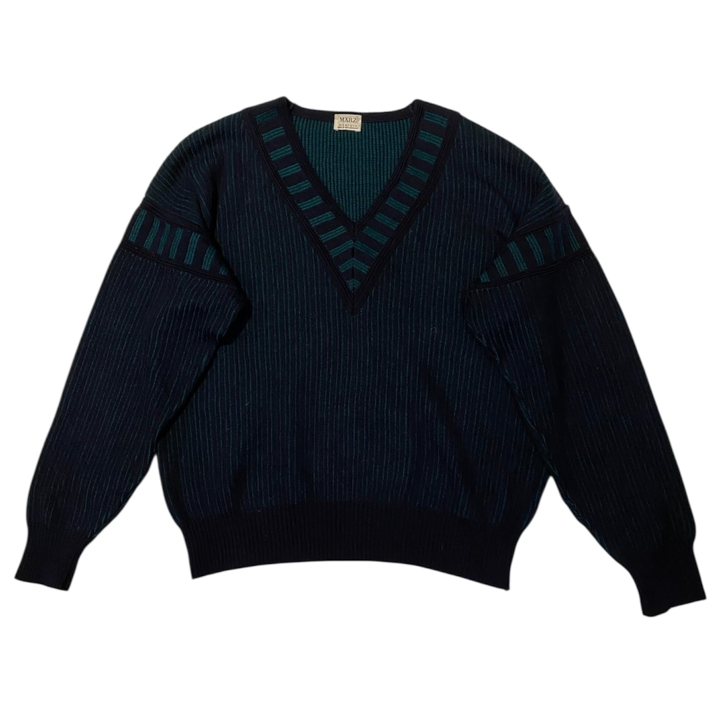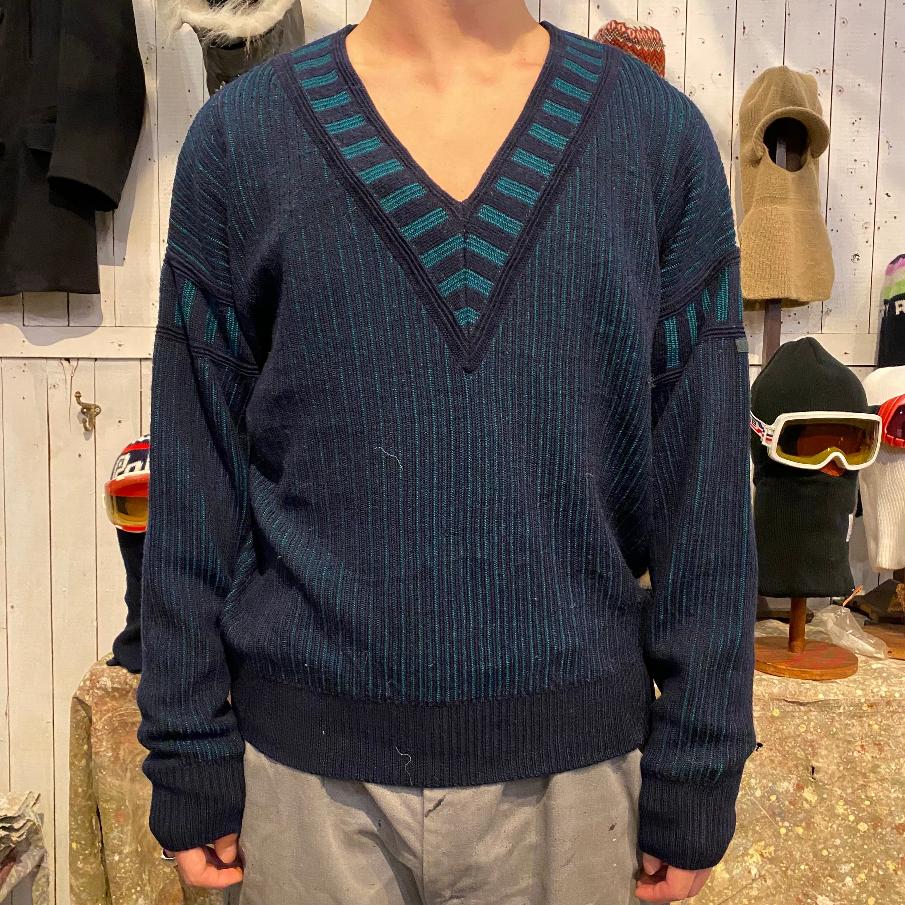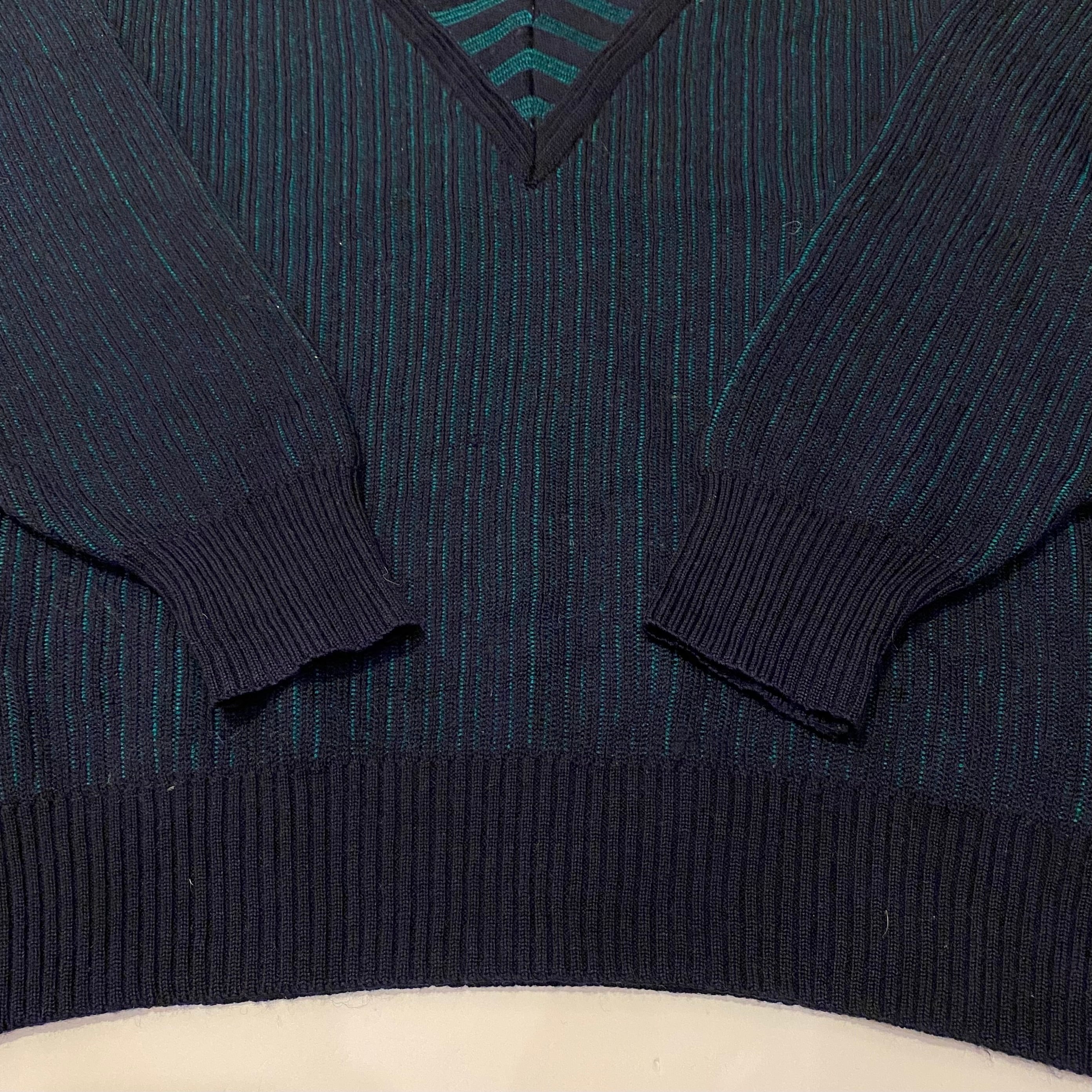 西ドイツ製のVネックニットになります。深めのVネックにストライプ柄が大きく入るデザインが目を惹きます。ヨーロッパらしいブルーグリーン×ダークネイビーの上品な配色です。薄手のリブニット編みなのでジャケットやアウターのインナー使いにもとっても良いと思います。