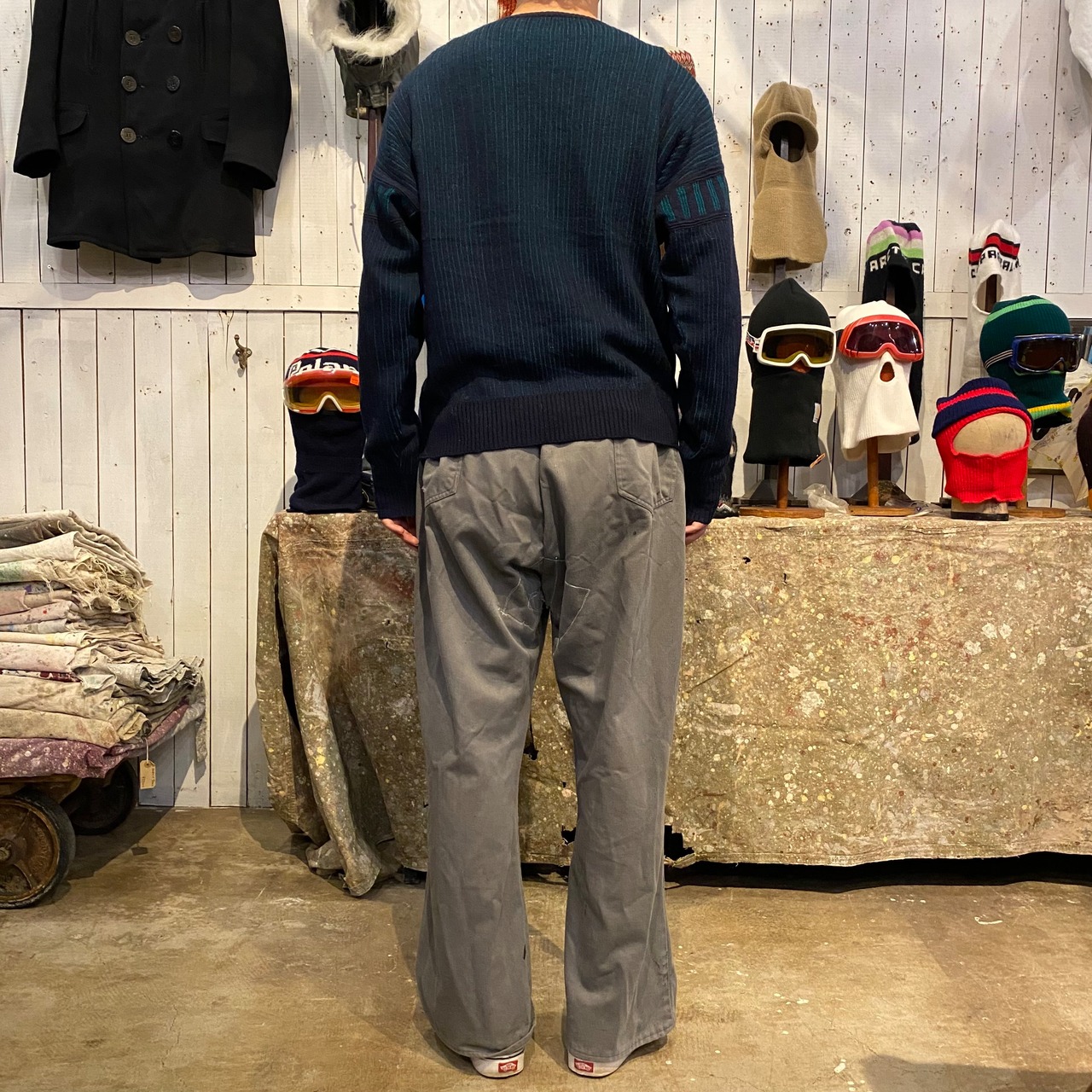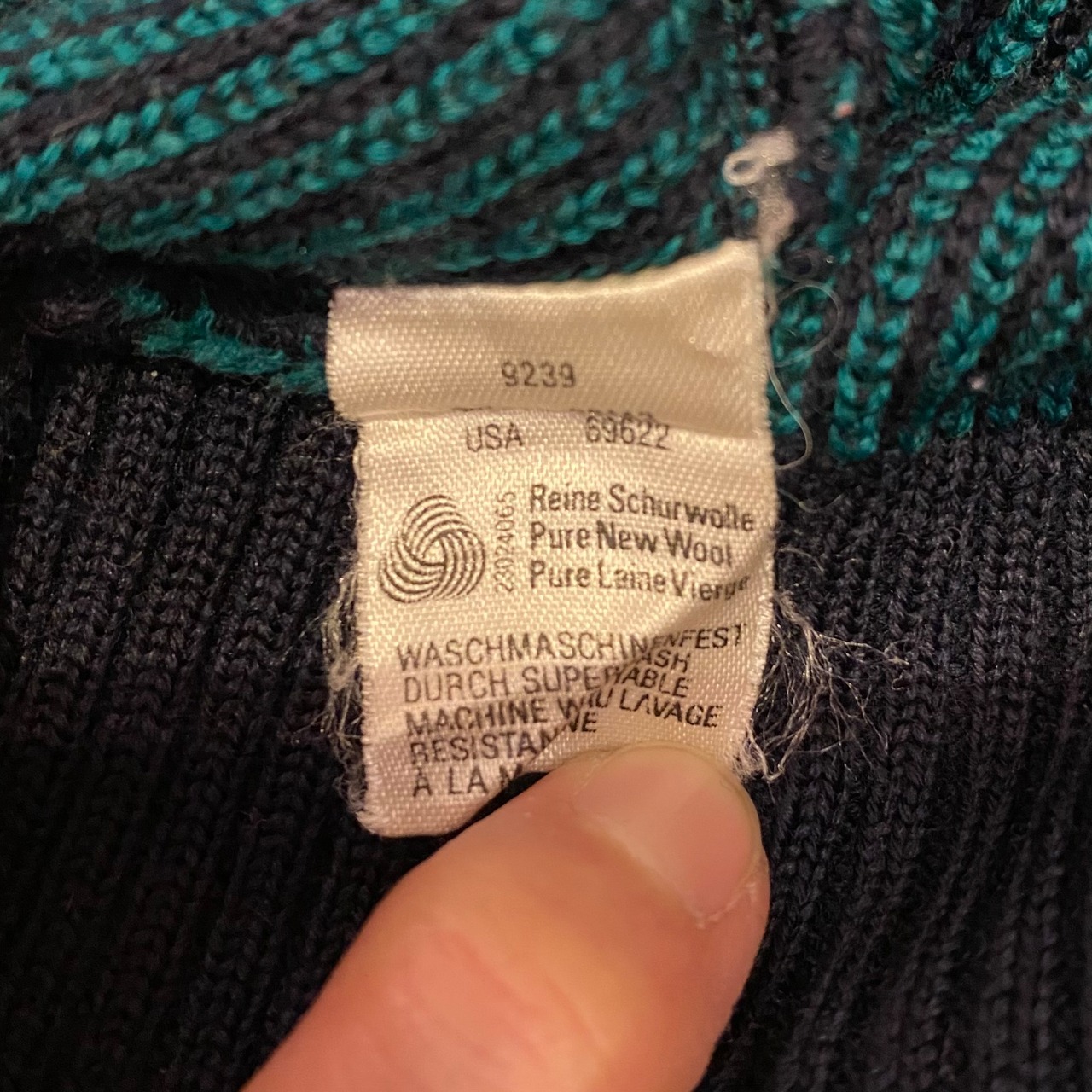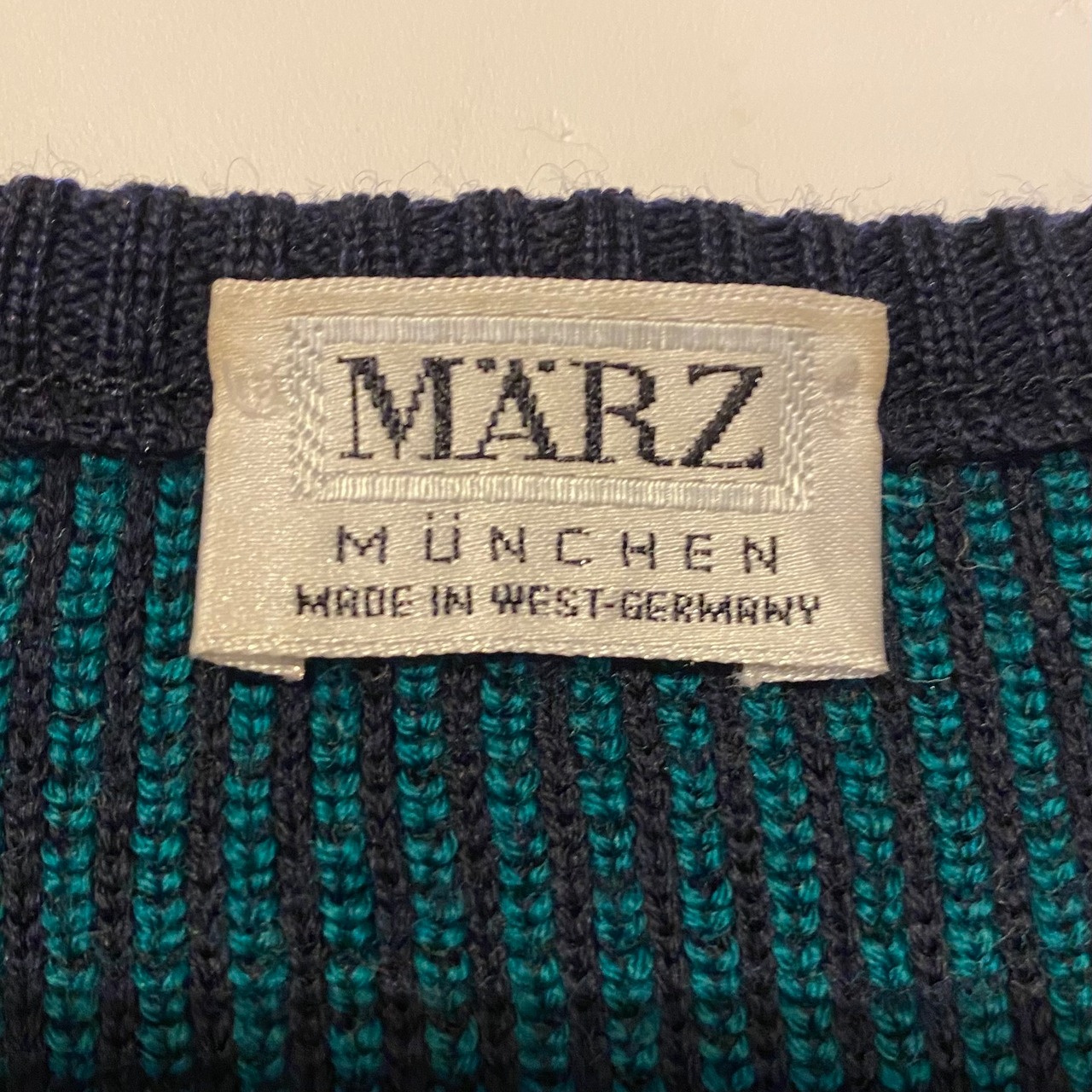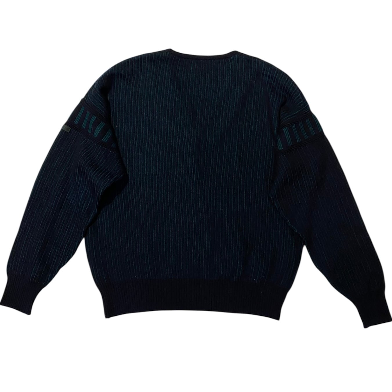 西ドイツ製のVネックニットになります。深めのVネックにストライプ柄が大きく入るデザインが目を惹きます。ヨーロッパらしいブルーグリーン×ダークネイビーの上品な配色です。薄手のリブニット編みなのでジャケットやアウターのインナー使いにもとっても良いと思います。