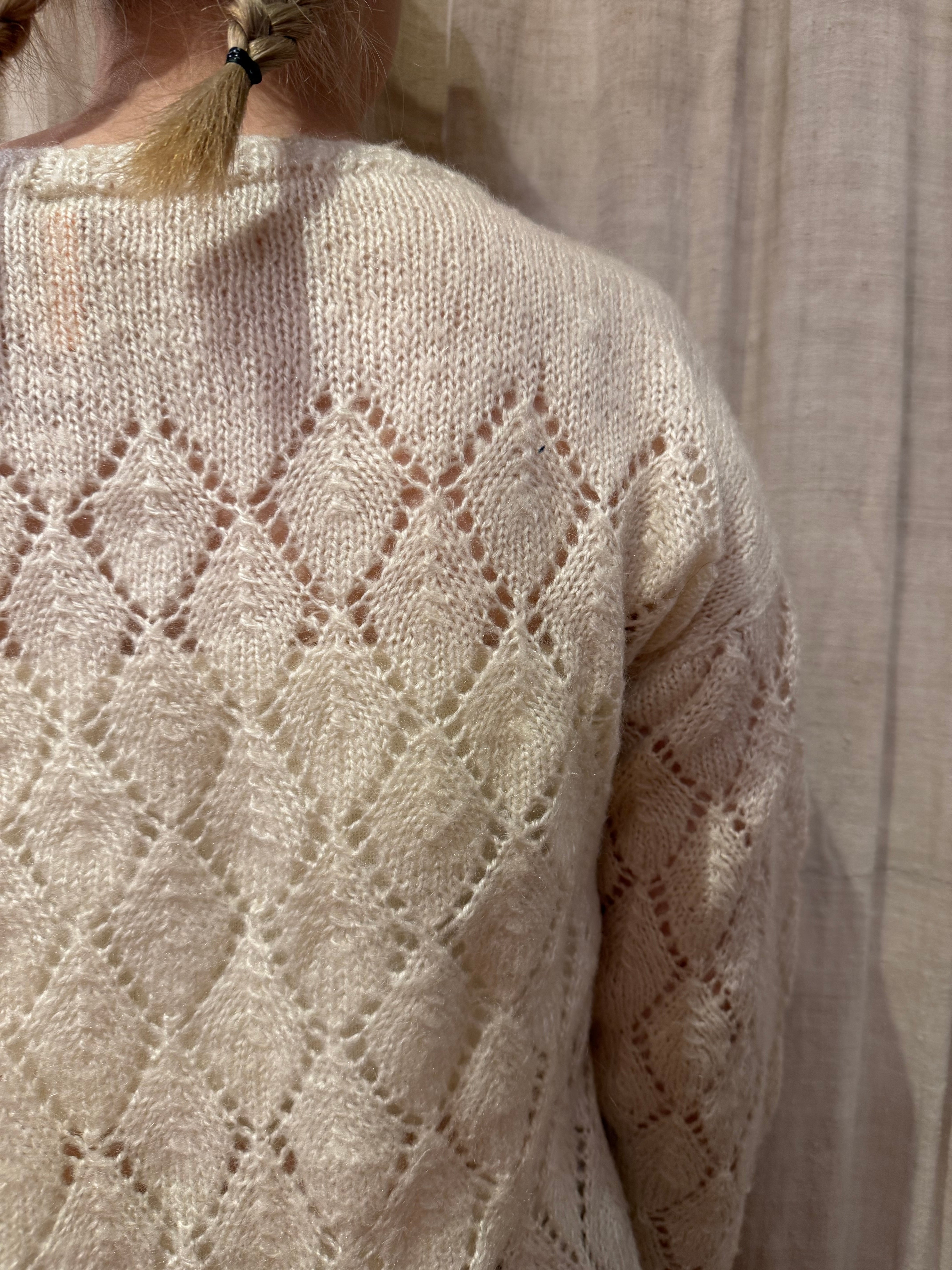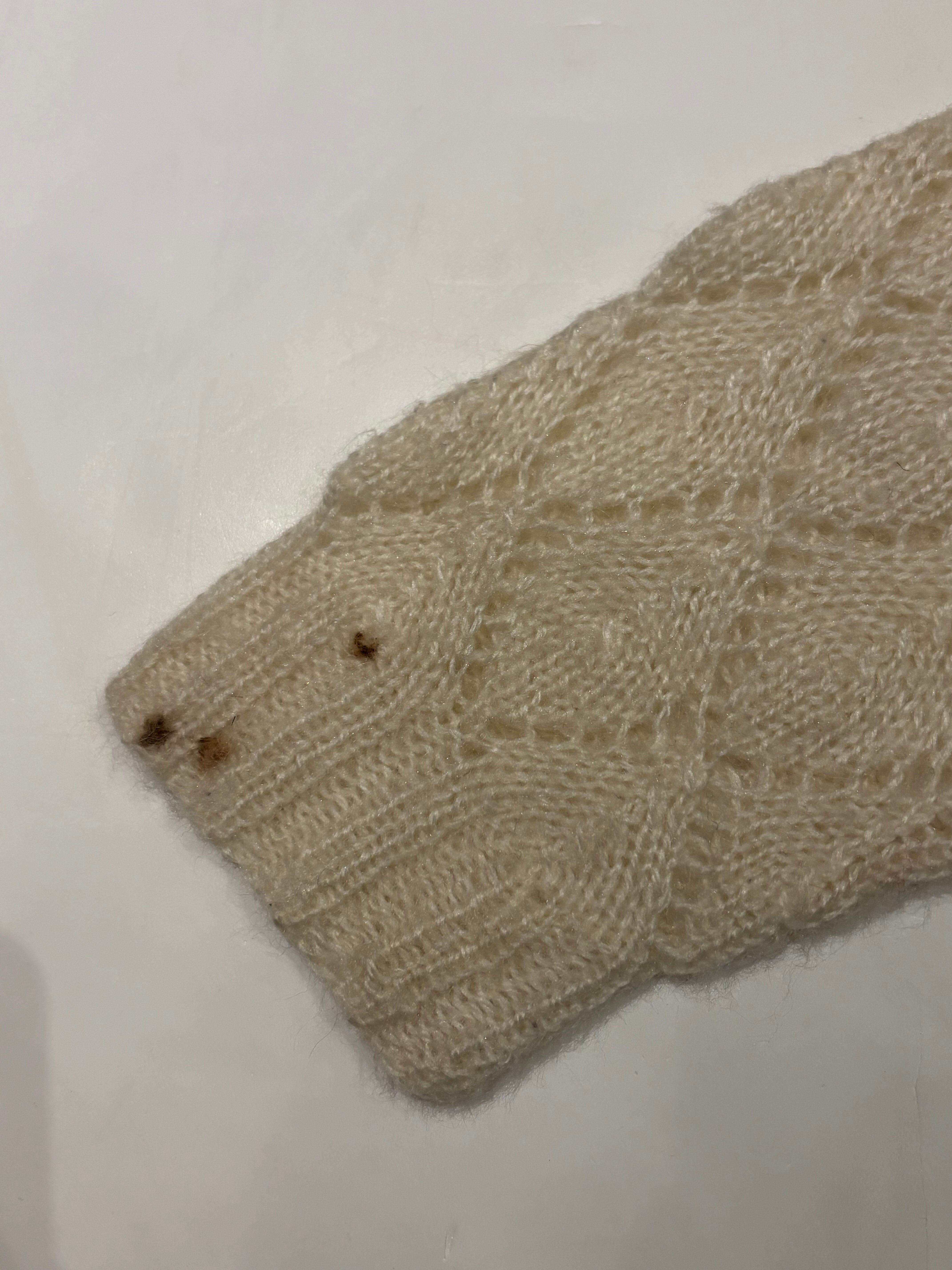 フワッとしてますが薄手のニット。葉っぱのモチーフの編み模様です。網目が透ける様になっているのでインナーが映えるアイテム。今の時期だと中にロンTや薄手のニットを仕込んでもいいと思います。