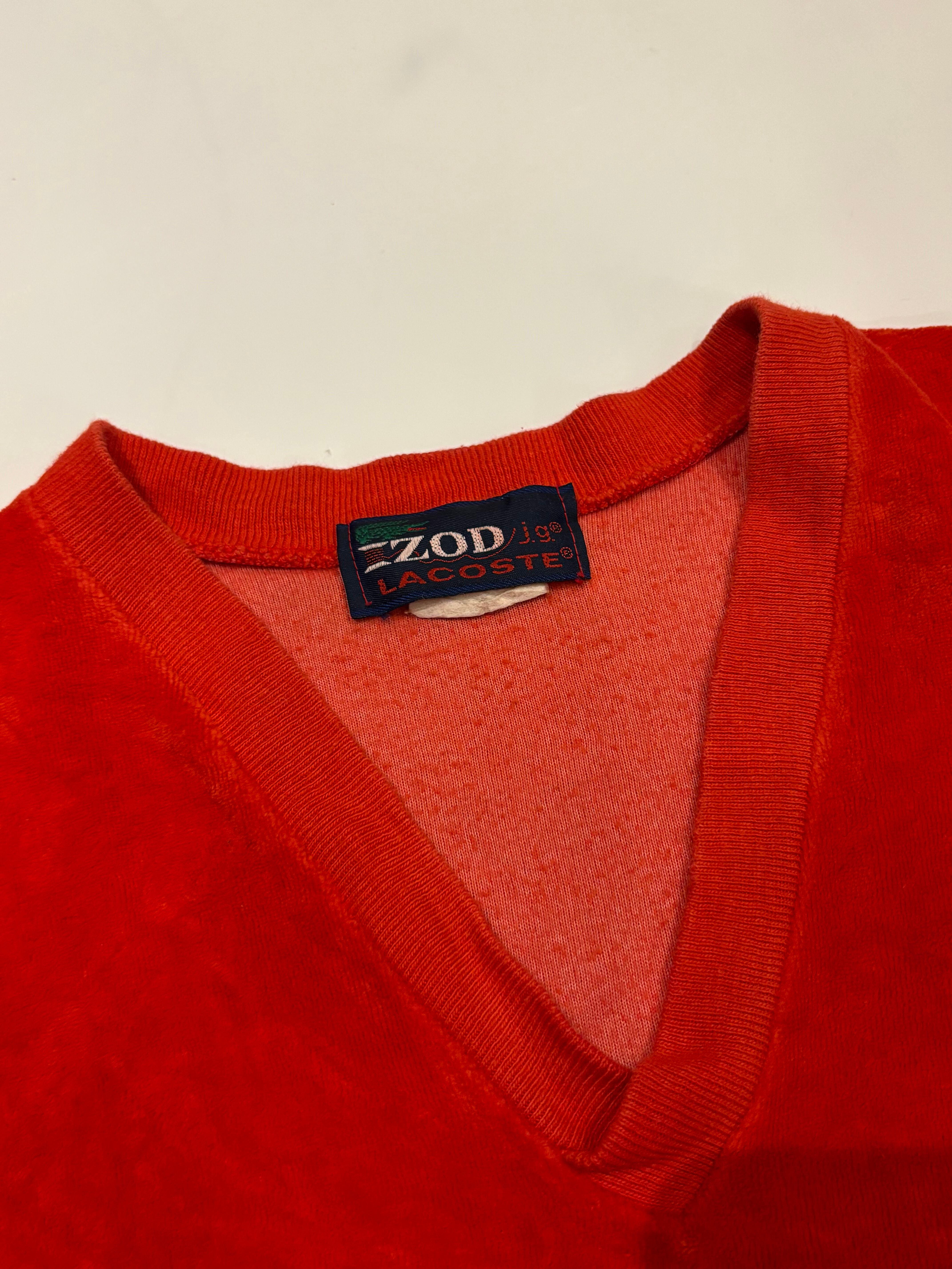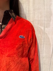 毛足の短いサラッとした質感のベロア素材。テラっとした赤がコーディネートにアクセントを加えてくれます。ただ着るだけでなく、ウエストや肩に巻いても◎胸元に付いたワンポイントも可愛らしいです。
