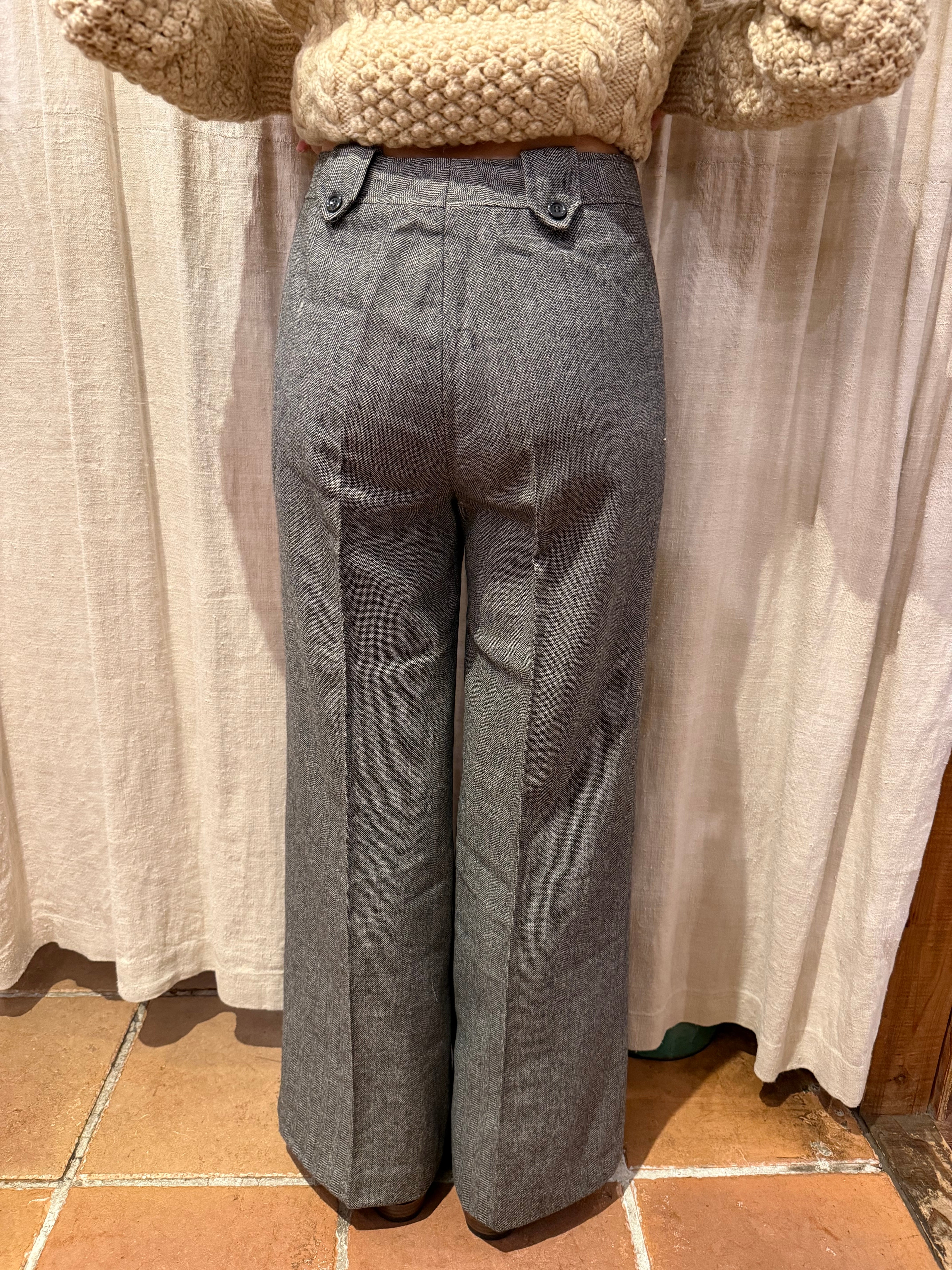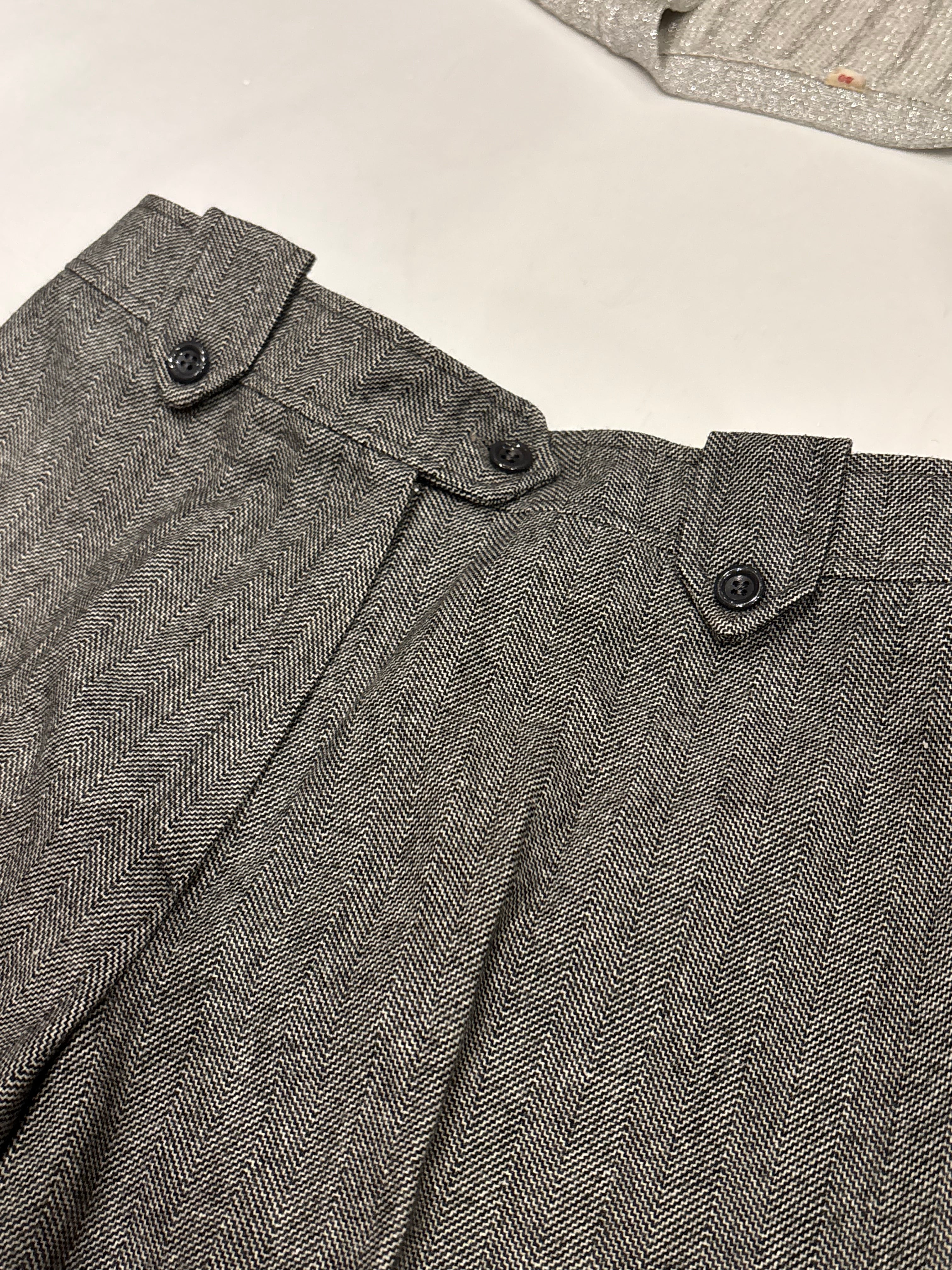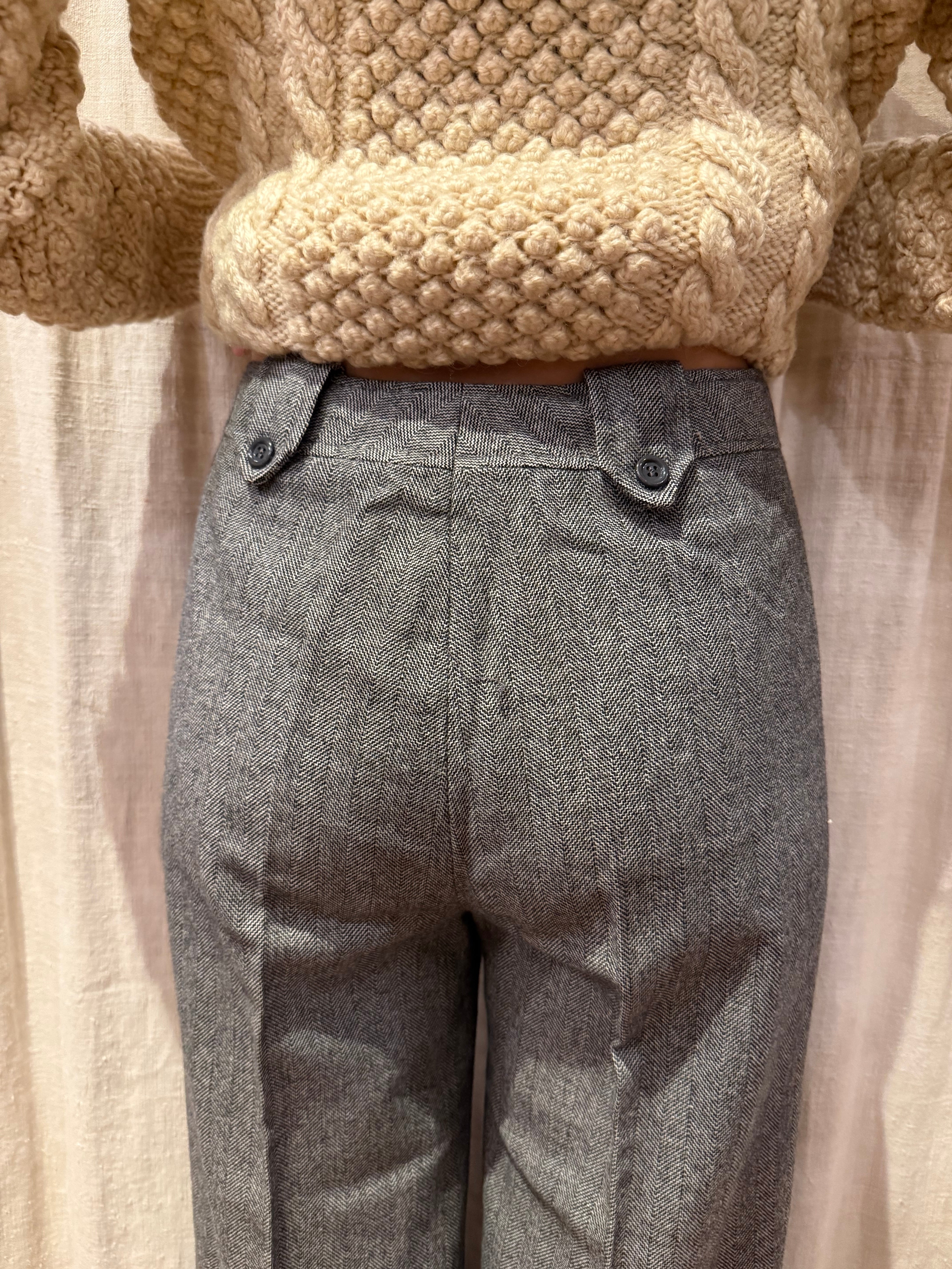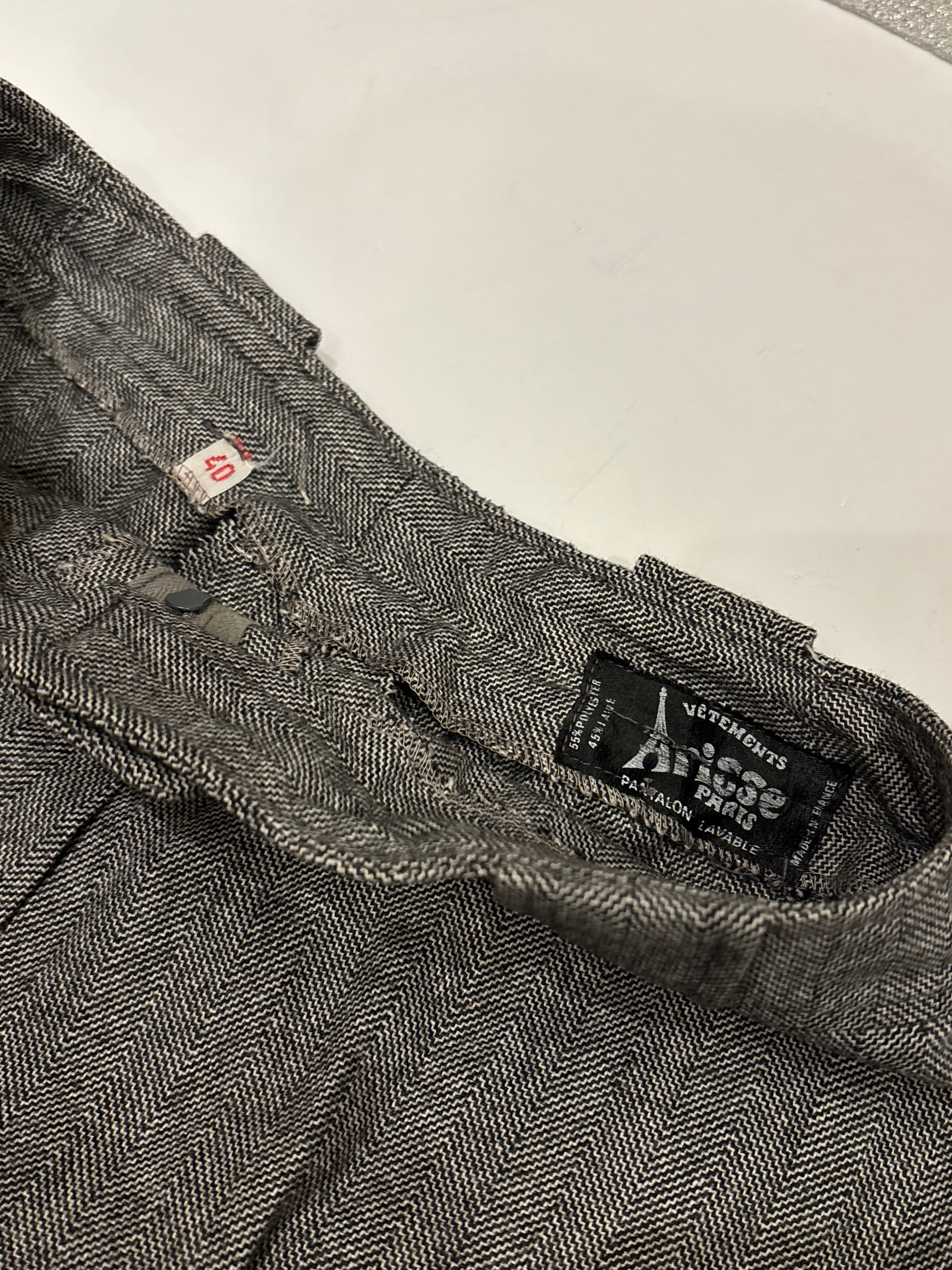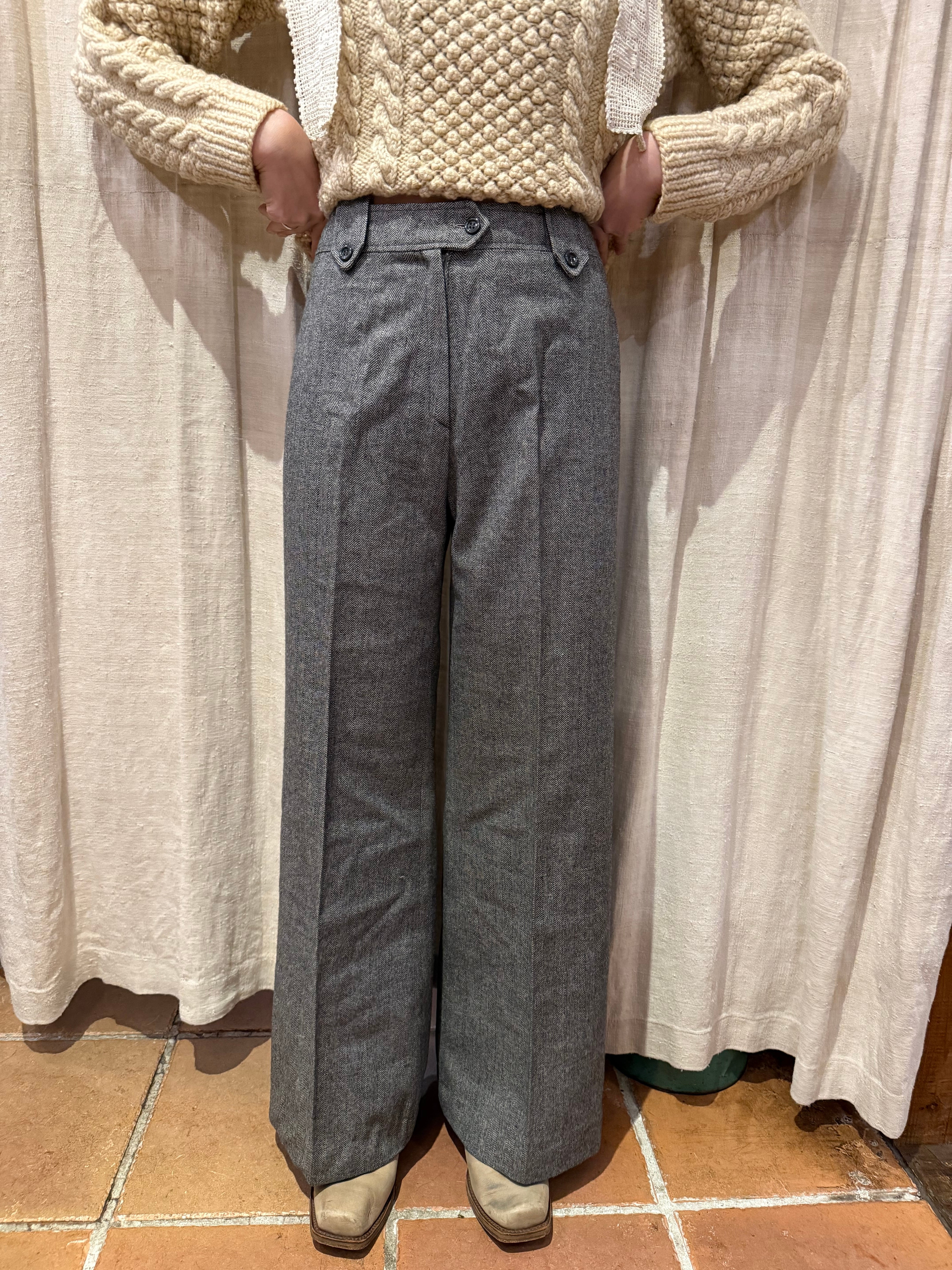 ウール素材のスラックスパンツです。センタープレスがしっかりと施されておりますので、綺麗なシルエットです。スッキリと着用されたい方にオススメです。またウエストのデザインも可愛いので、インスタイルも素敵です。