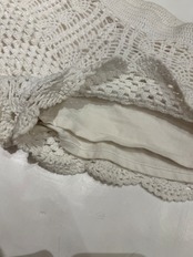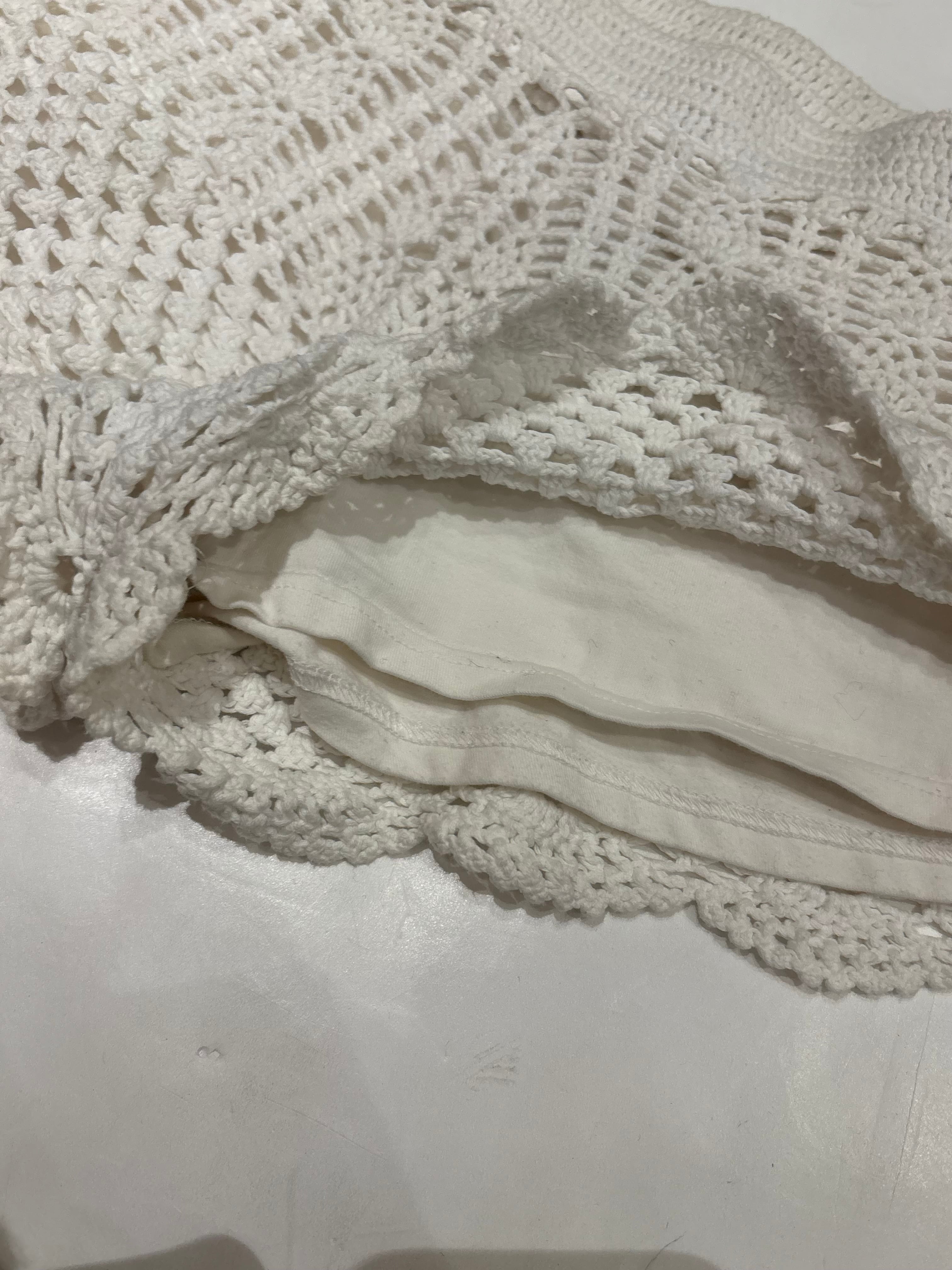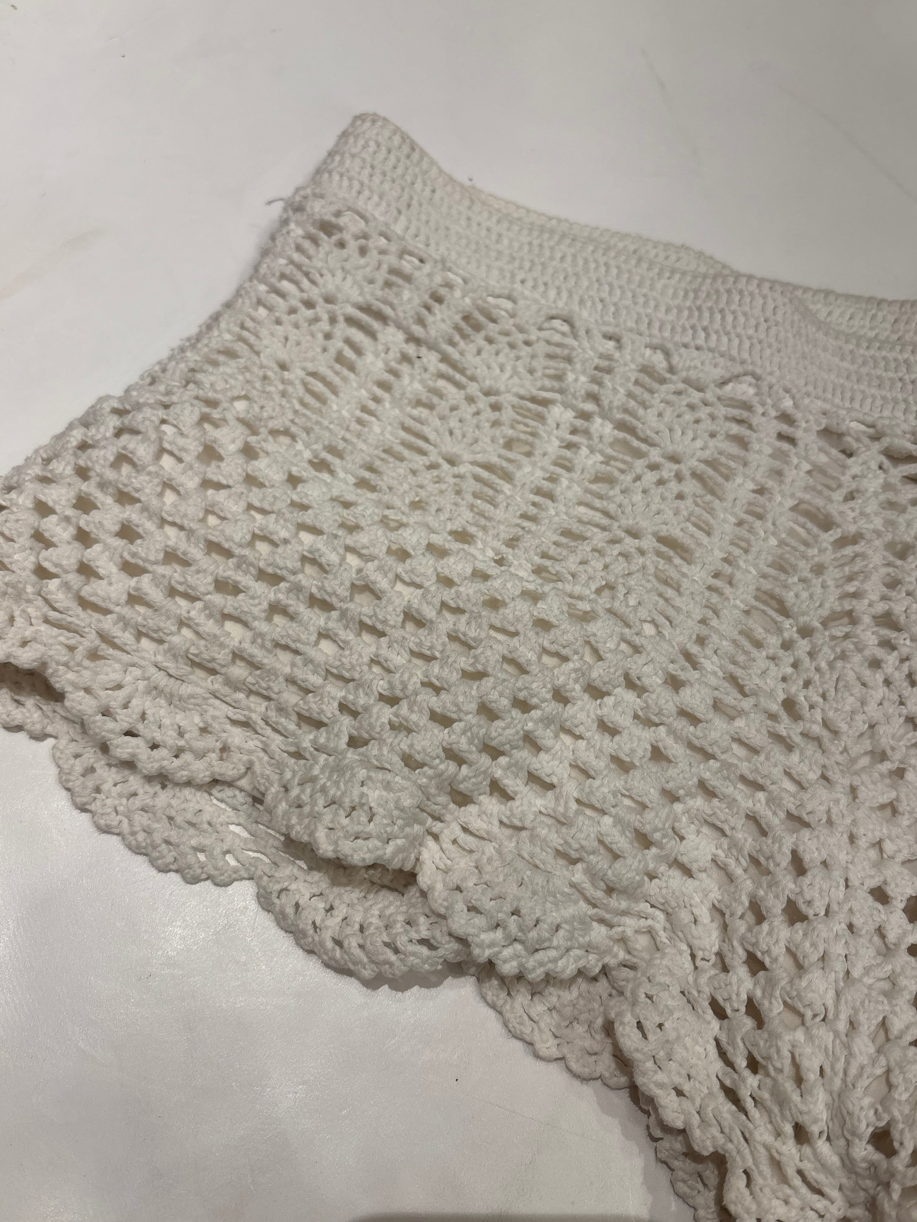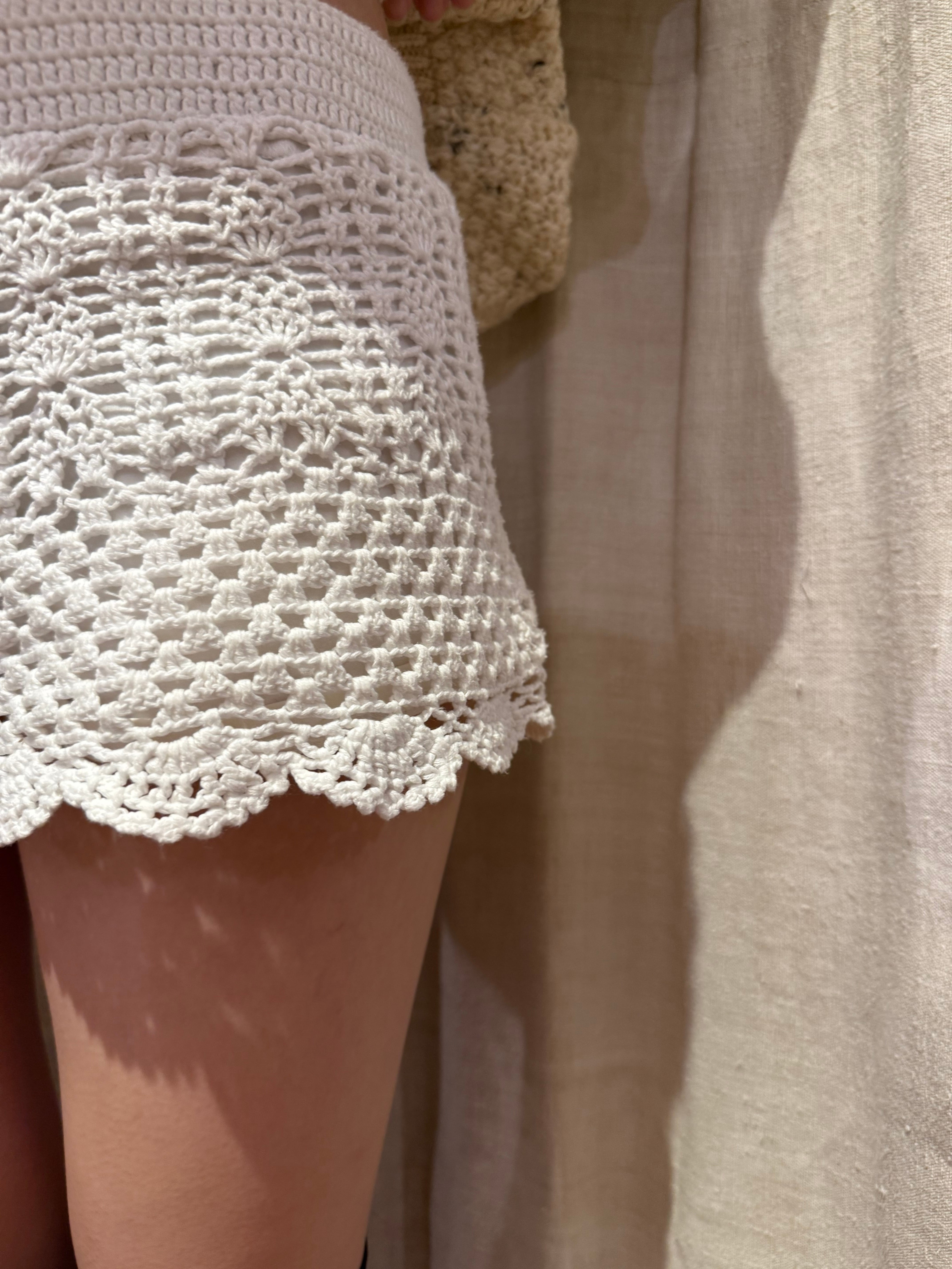 クロシェ編みのショートパンツです。裾はスカラップ仕様で、温かみがあってとても可愛いです。春夏は一枚で着用しても良し、秋冬はカラータイツや細めのパンツとレイヤードしても素敵です。オールシーズンで活躍しそうな1着です。