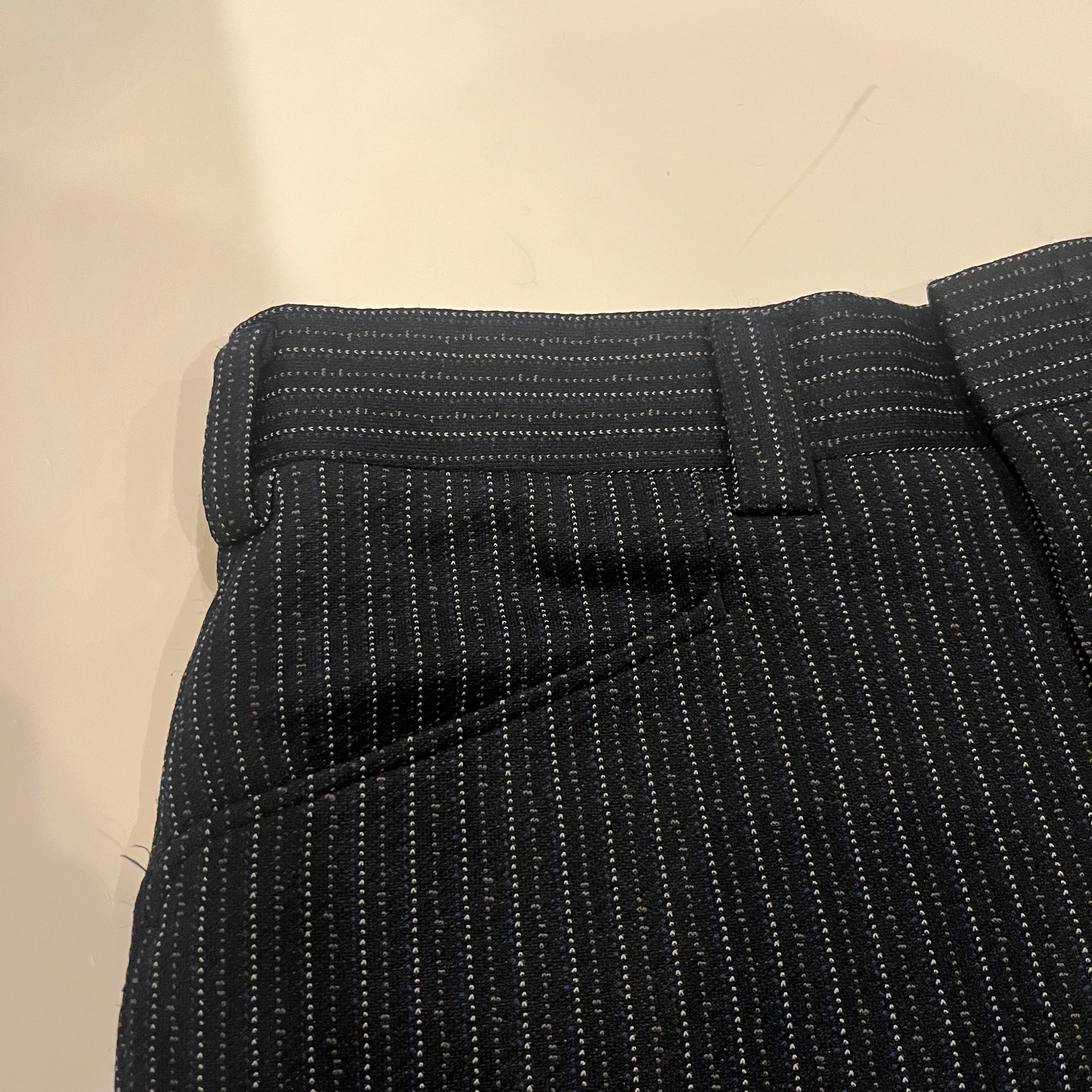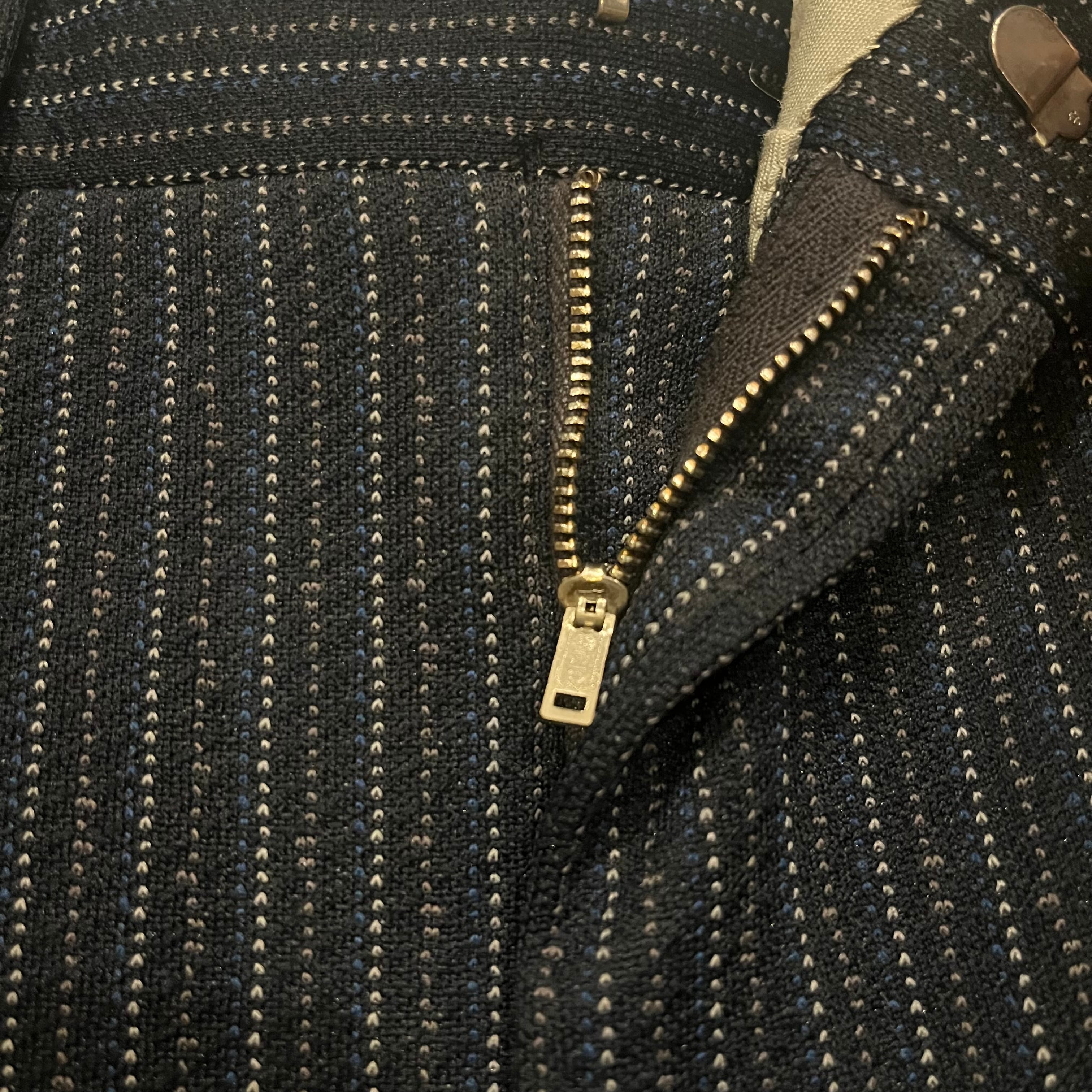 細かいグレー、ブルー、ホワイトがアクセントになっていて普通のストライプのスラックスと格差も付けれる一本ではないでしょうか。