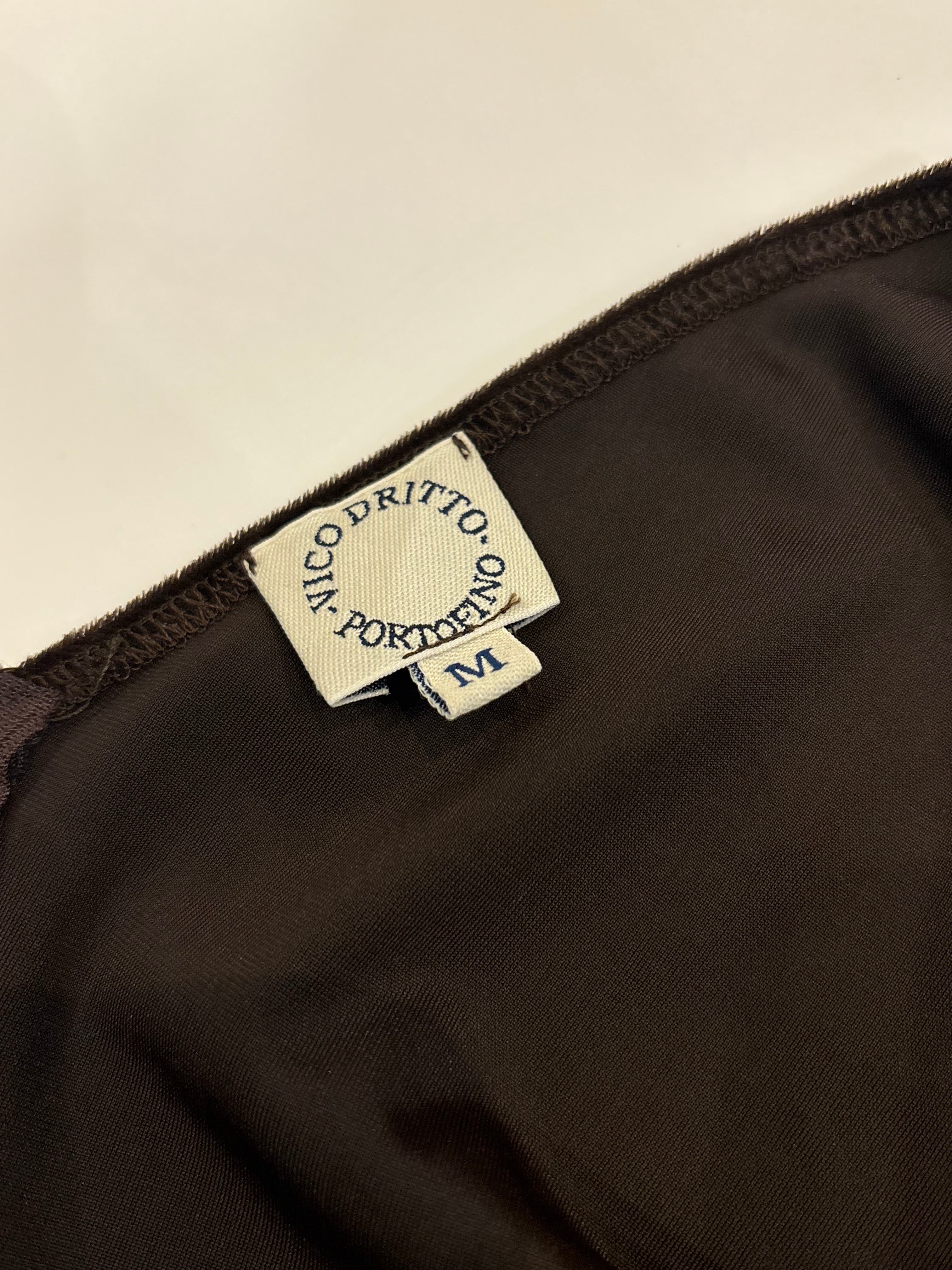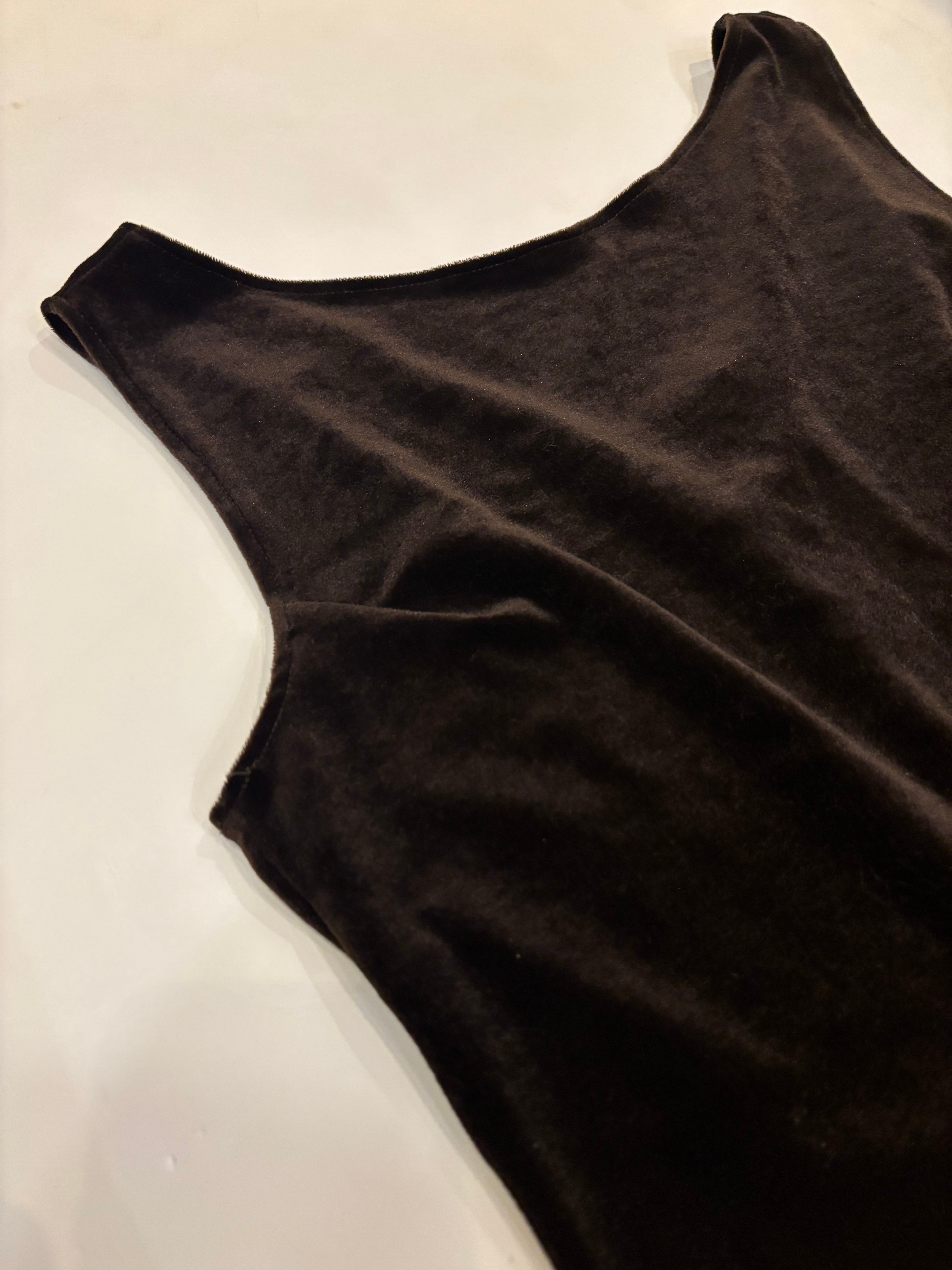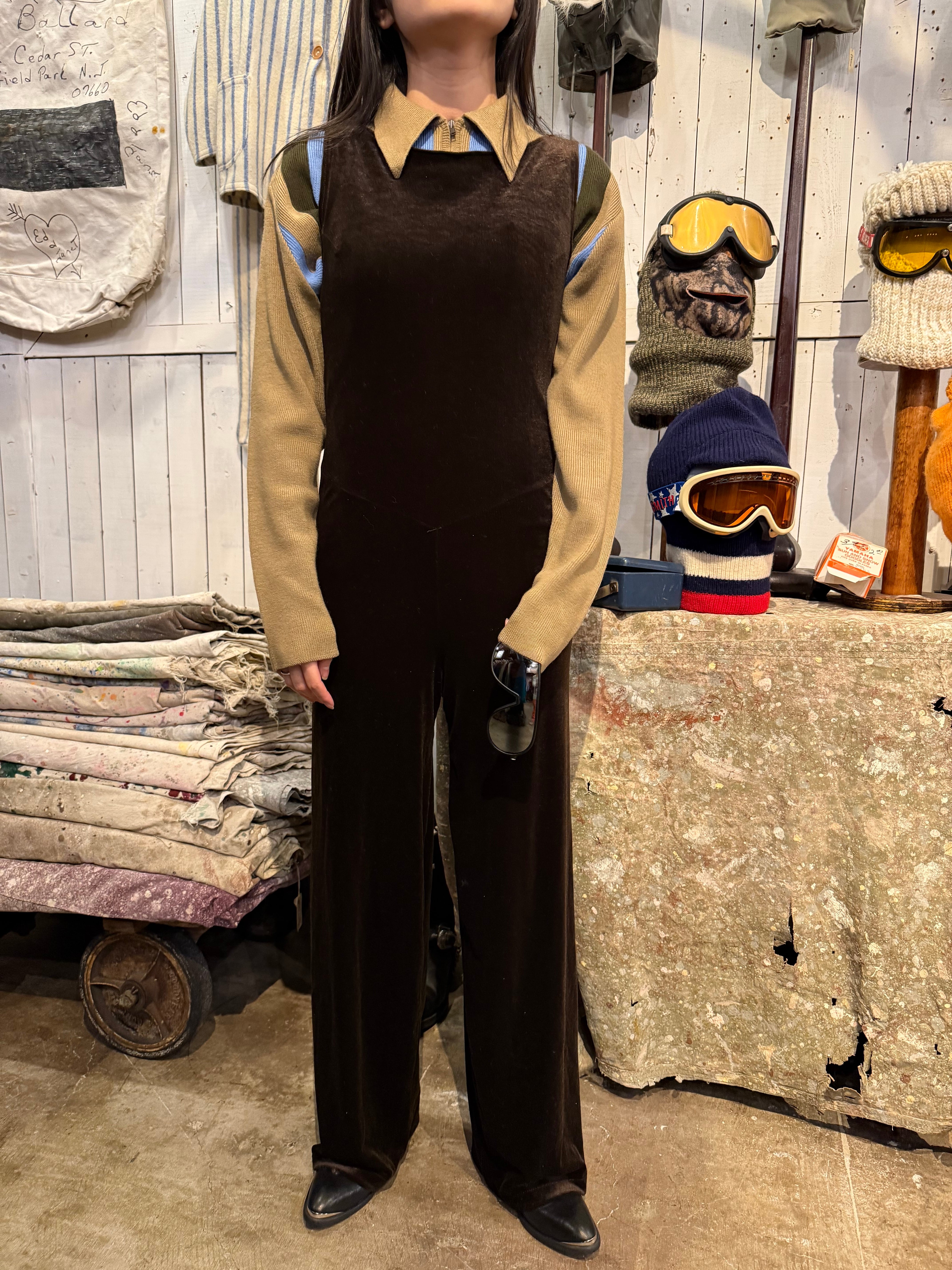 サラサラとしたベロア素材ののオールインワンでございます。焦茶のような深いカラーでシンプルですが大人の雰囲気を演出してくれます。バックが深めのVネックになっていてインナーによってどちらを前に持ってきても◎一枚でも決まるのでおすすめです。