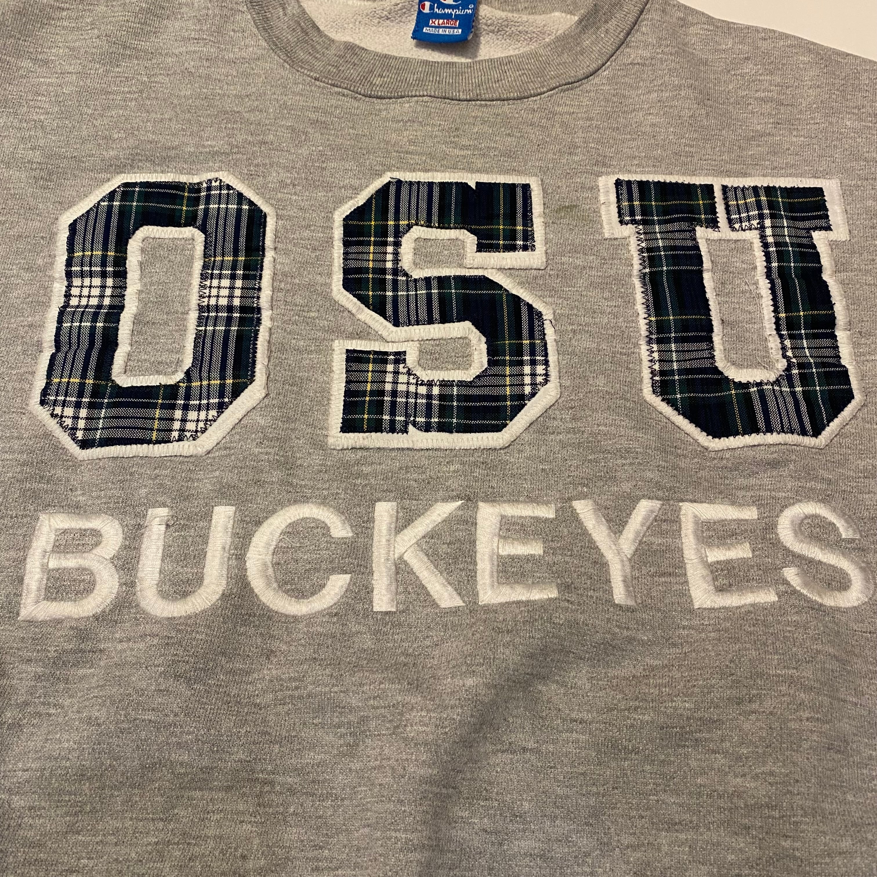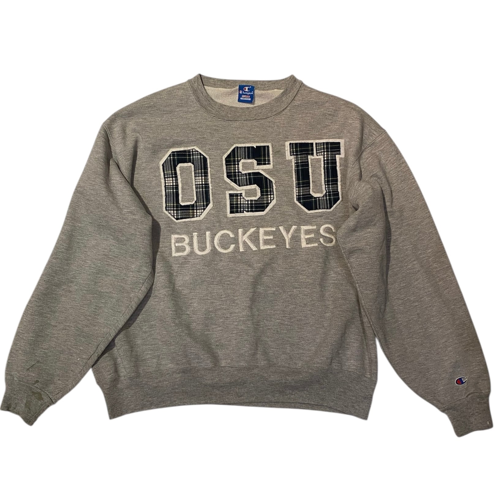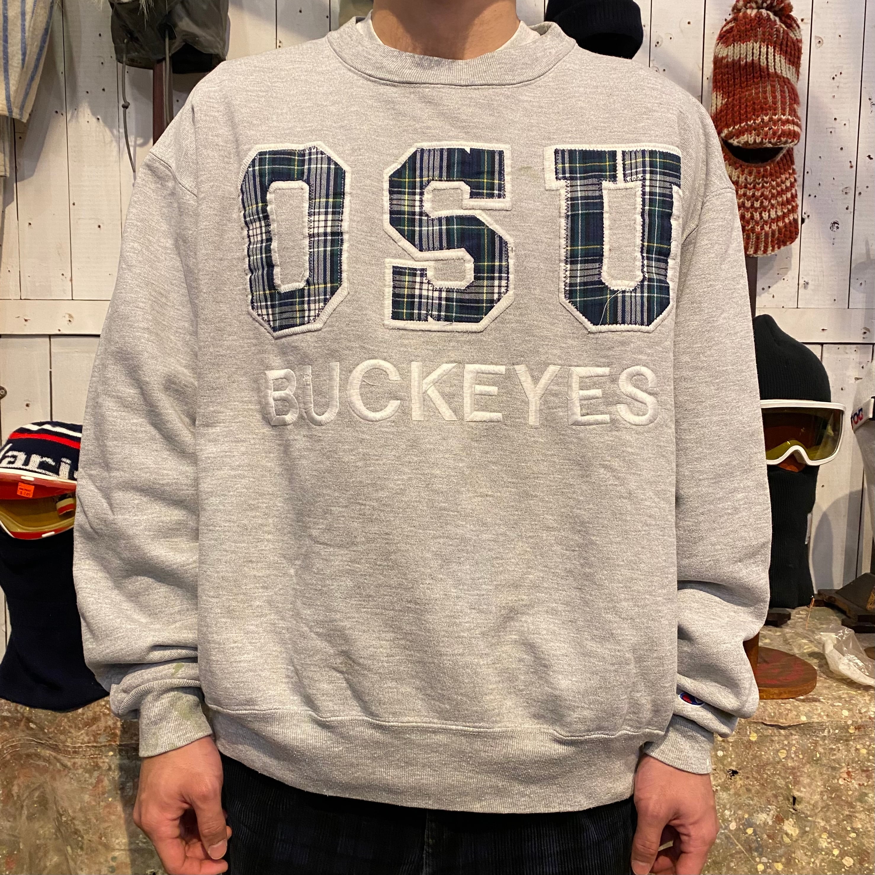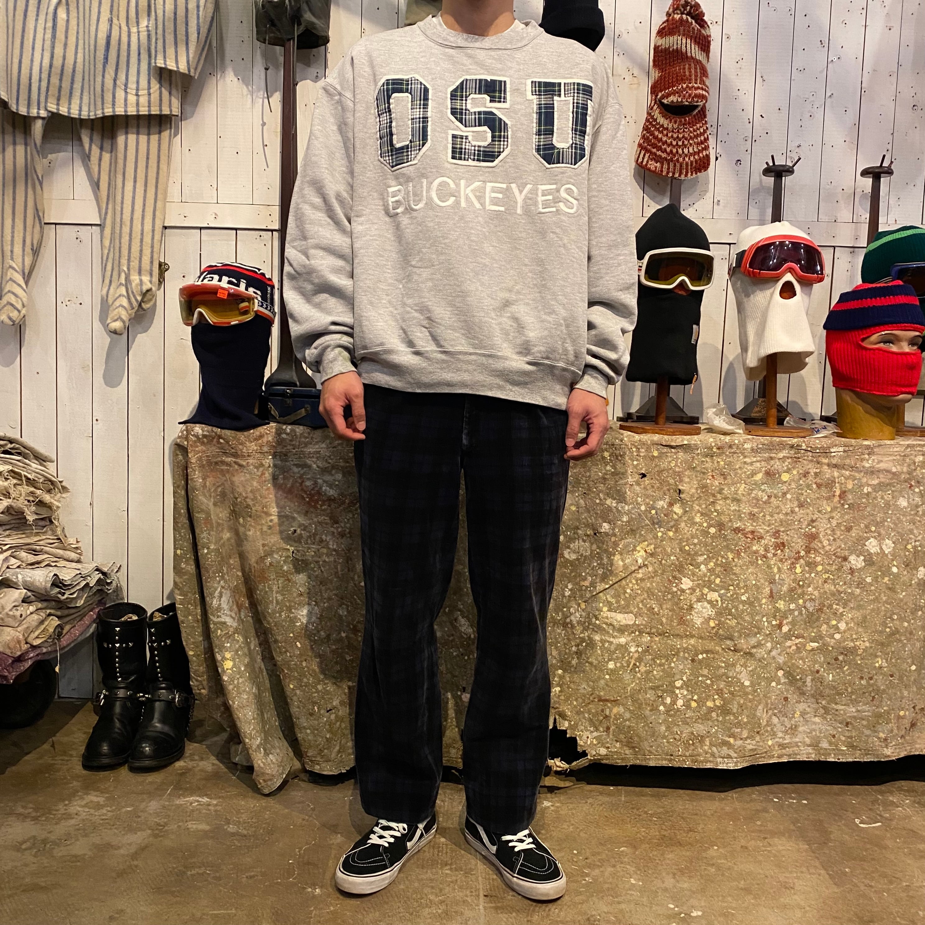 90年代のアメリカ製のチャンピオンのスウェットになります。肉厚なスウェット生地でリバースウィーブではないベーシックな形のタイプでサイズ感、シルエットも良いと思います。ライトグレーのボディにタータンチェックのワッペン、というのがなんともかわいいですね。※両袖先ペンキよごれ、右そでうしろペンキよごれあり。
