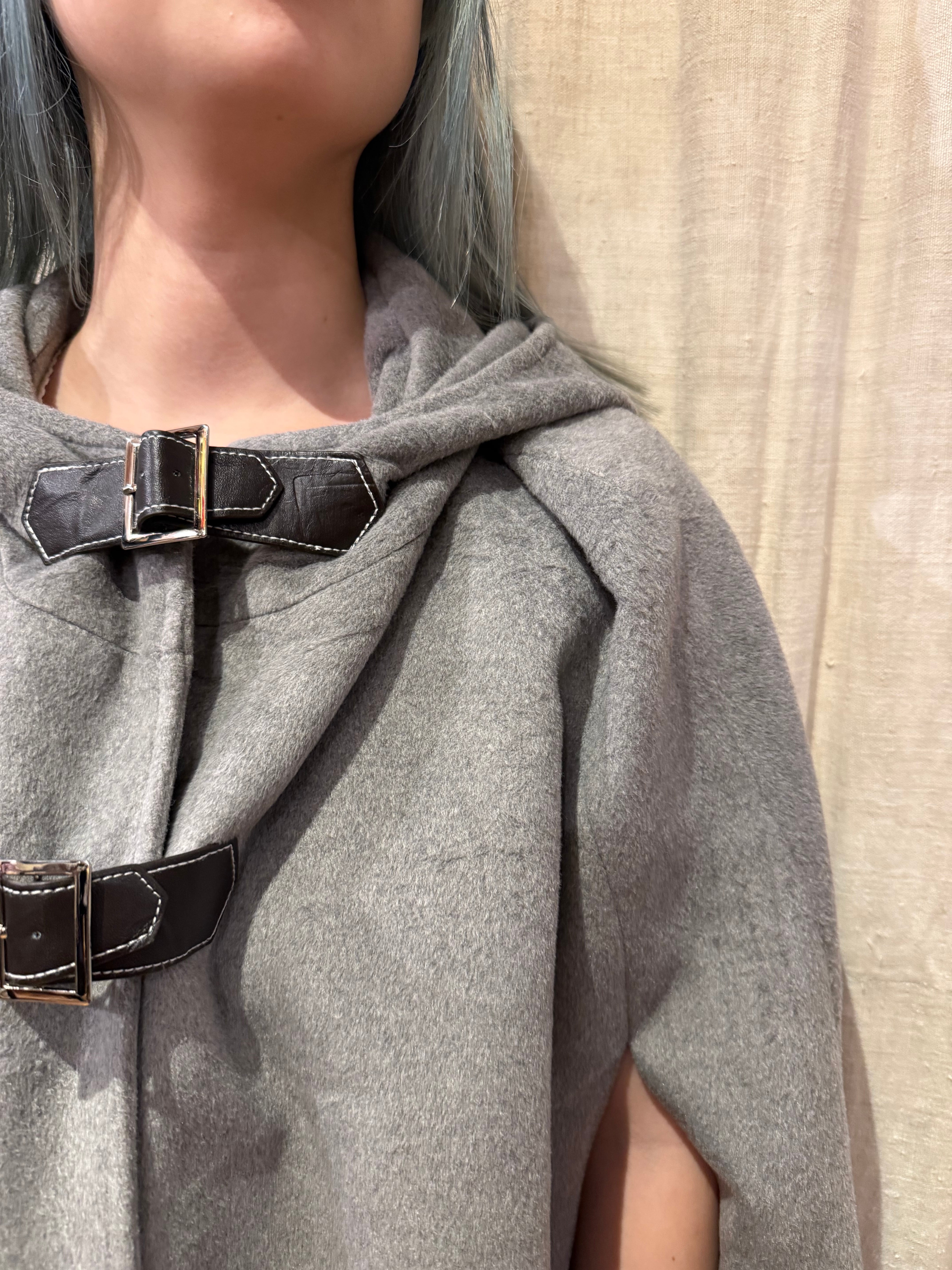 カシミヤのような肌触りの良いジャケット。トップについたベルトや、後ろについたハーフベルトが特徴的です。写真のようにアームウォーマーを重ねても可愛らしく、袖に特徴のあるインナーを重ねても◎ポケットも付いていて機能性もあ流のでオアススメです。