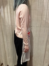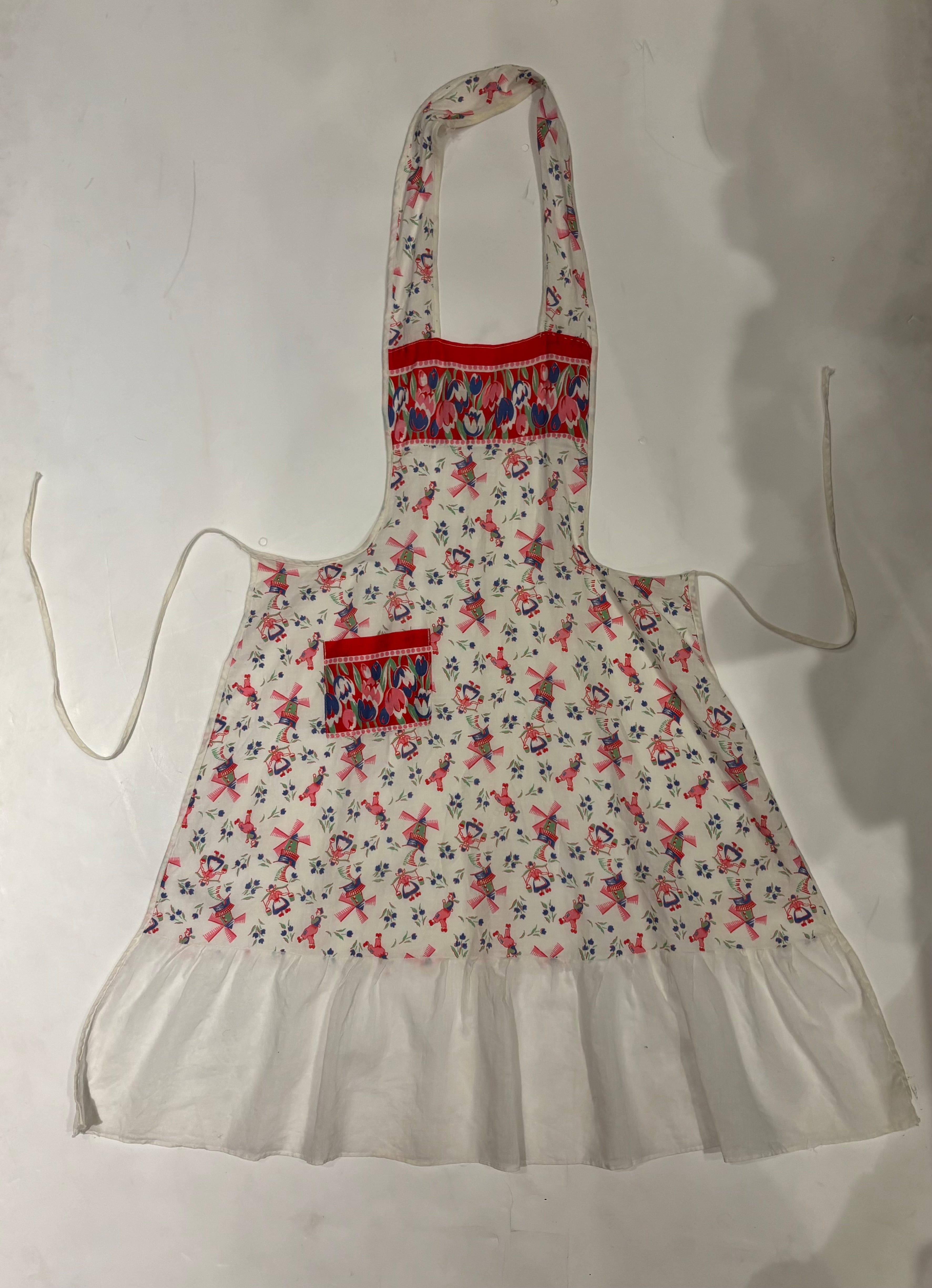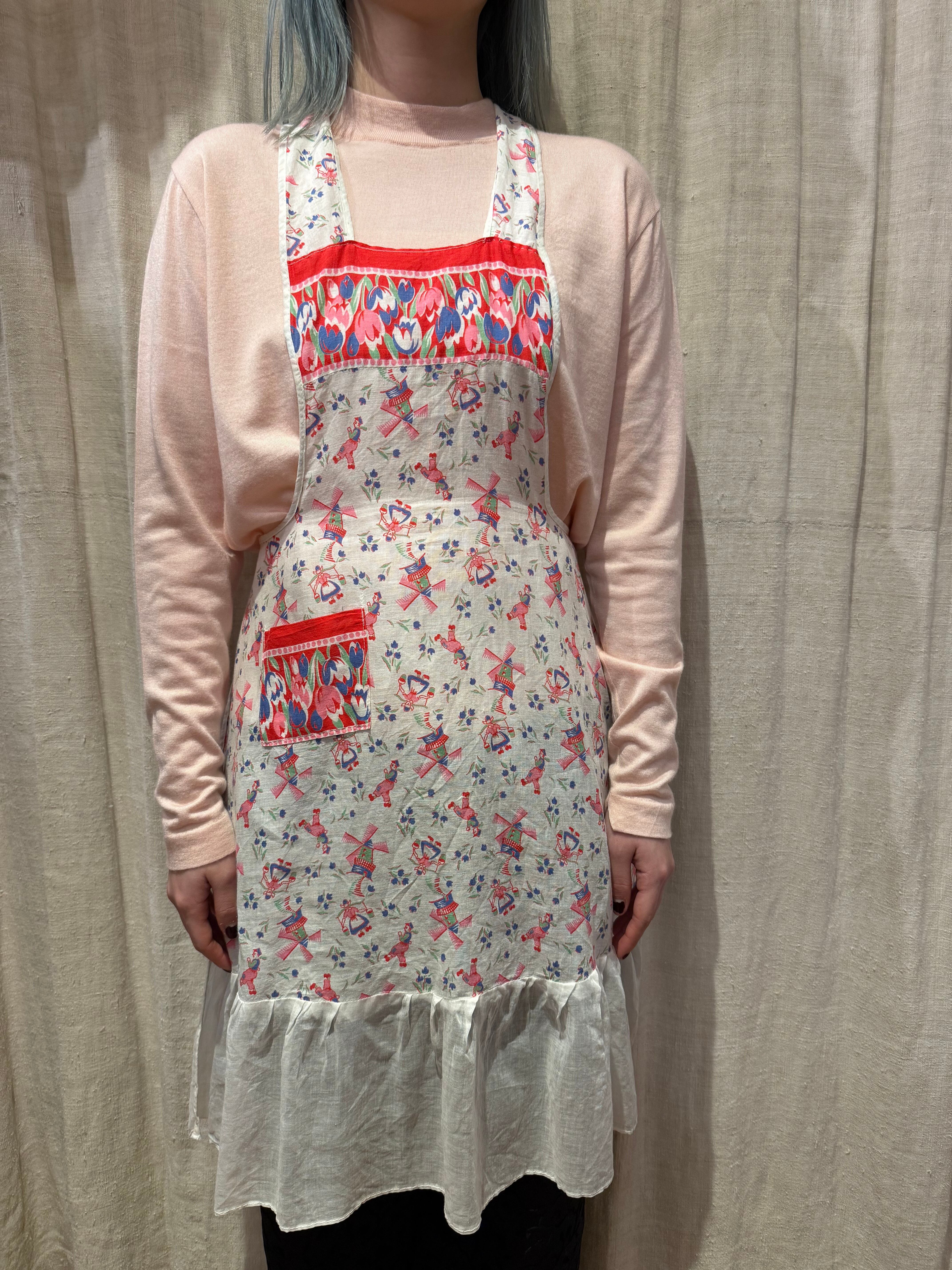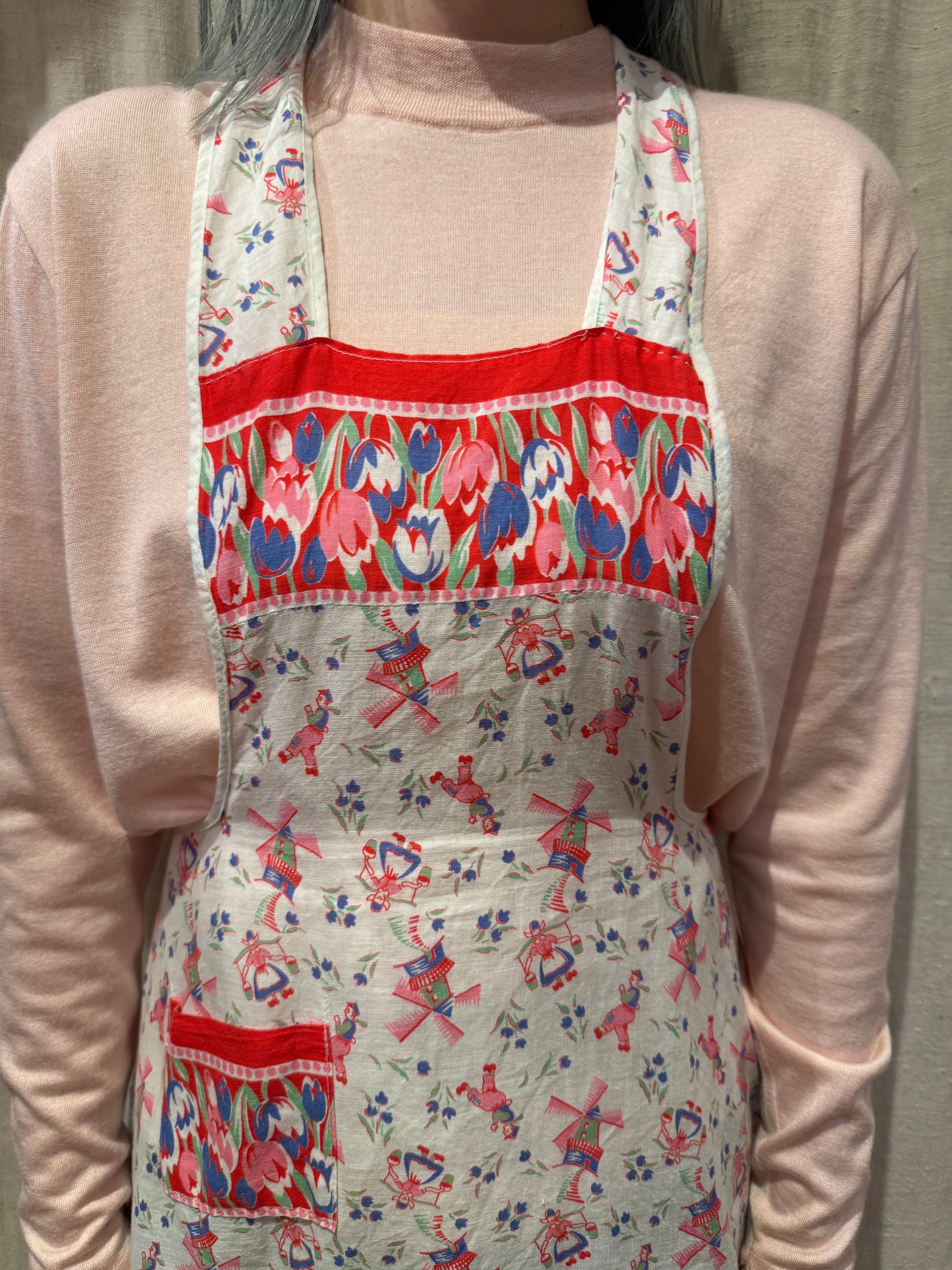 花と人の柄のエプロンです。薄めの生地感で軽く、レイヤードしやすいです。民族衣装を着た男女の柄もユニークでとても可愛いです。カラーリングも民族衣装っぽい温かみがあります。裾は切替でフリルになっており、ワンピースのような雰囲気があり、スタイリングに取り入れやすいです。